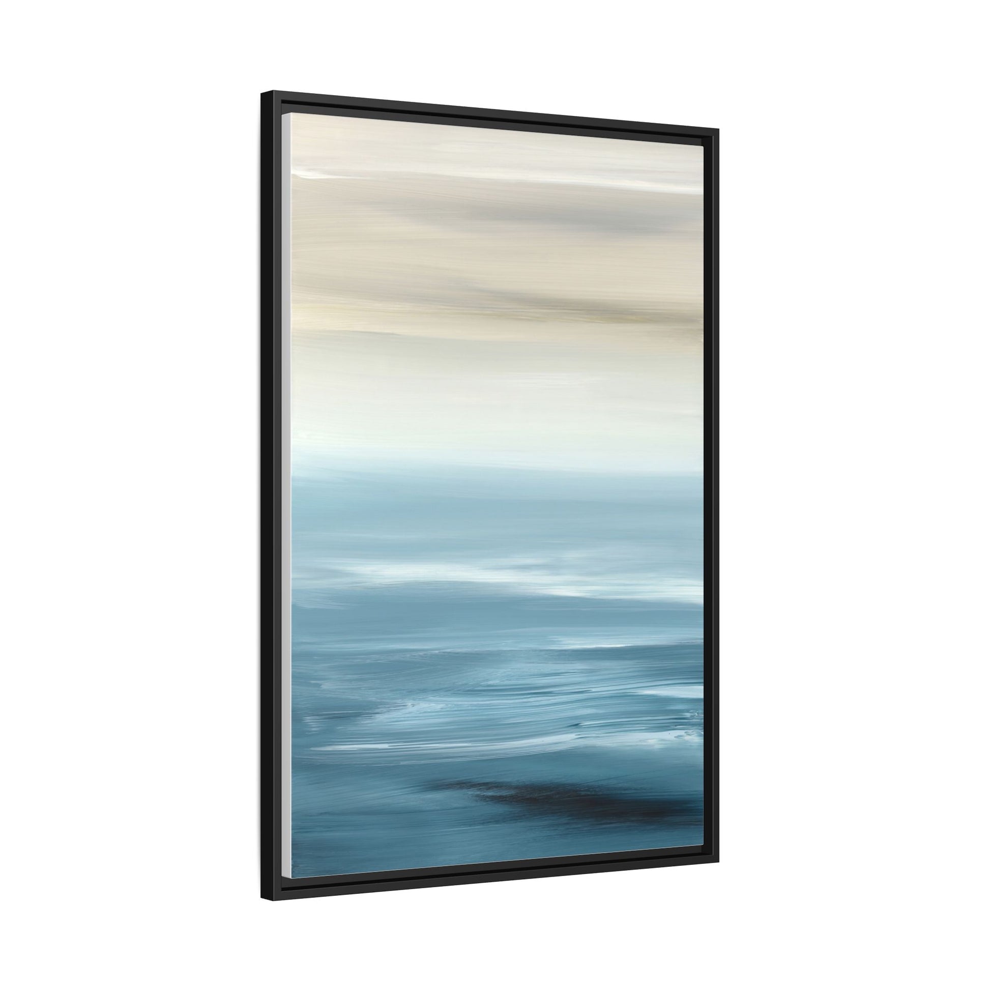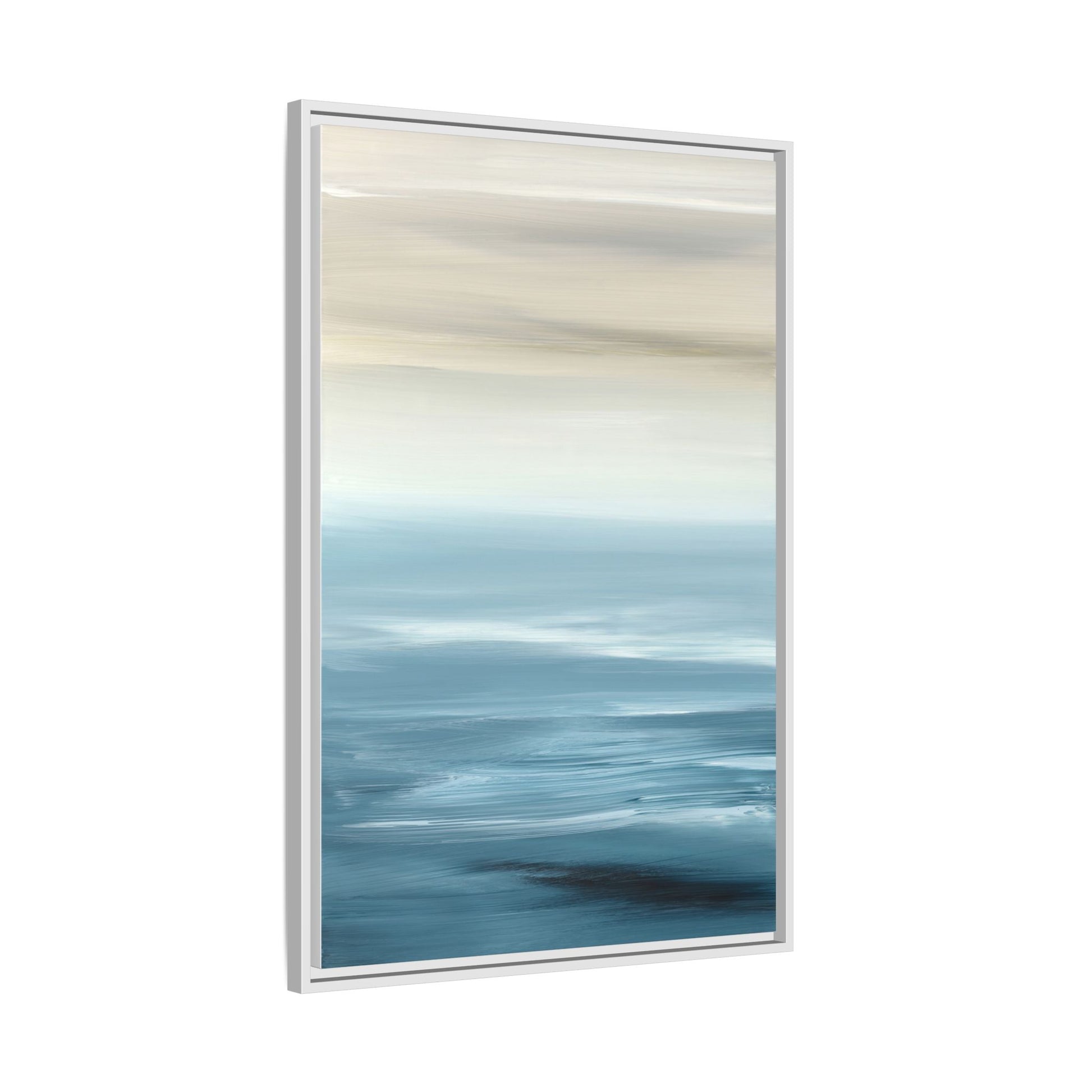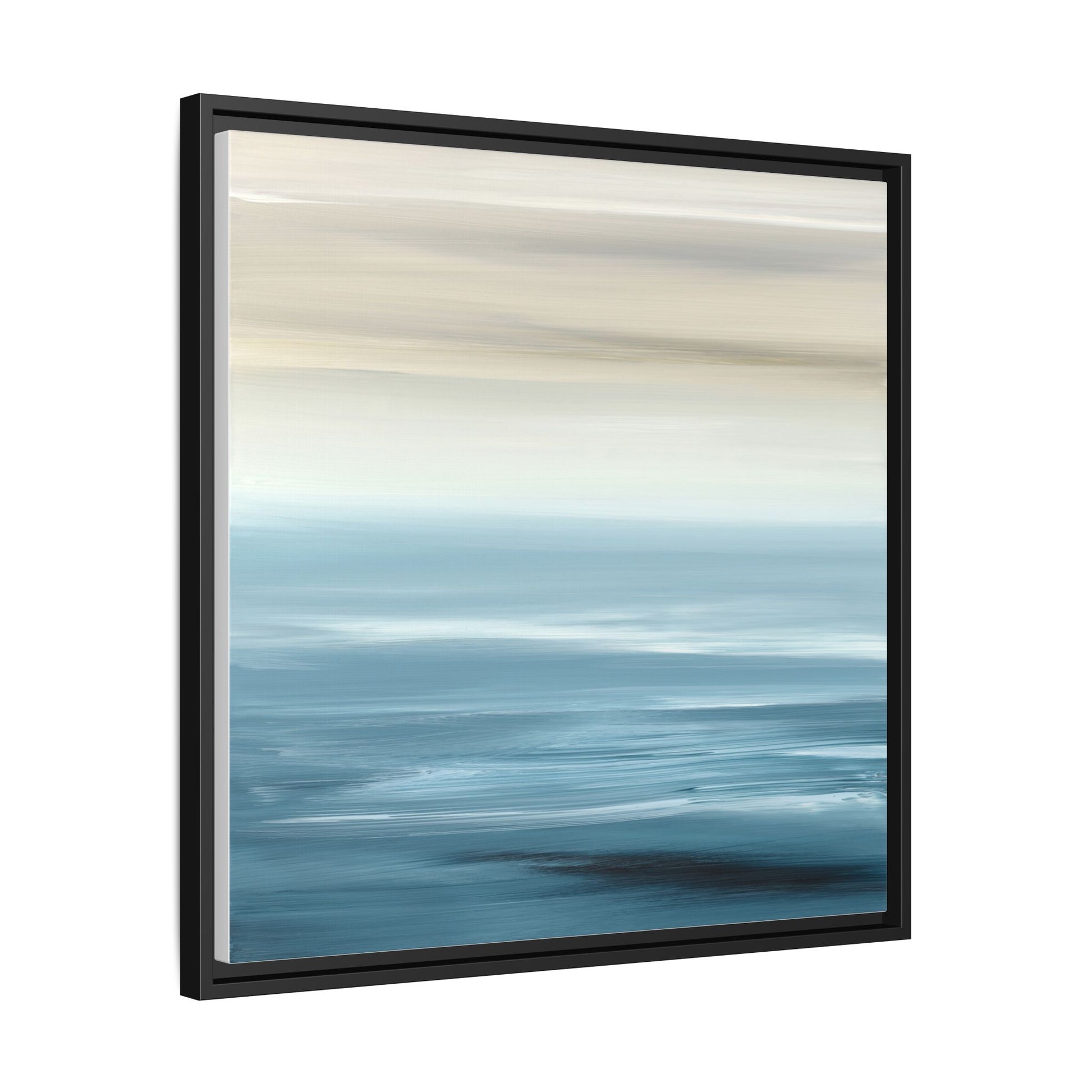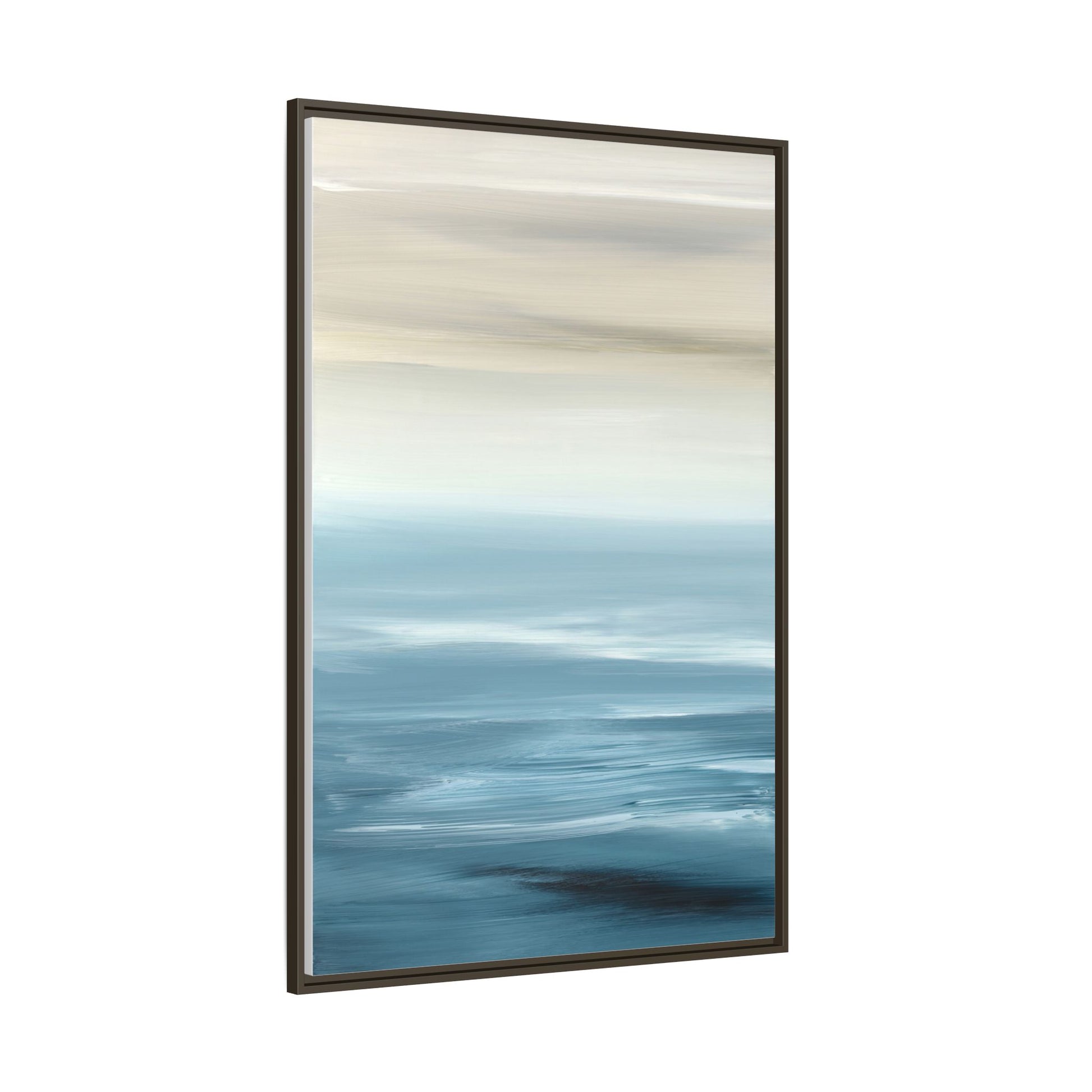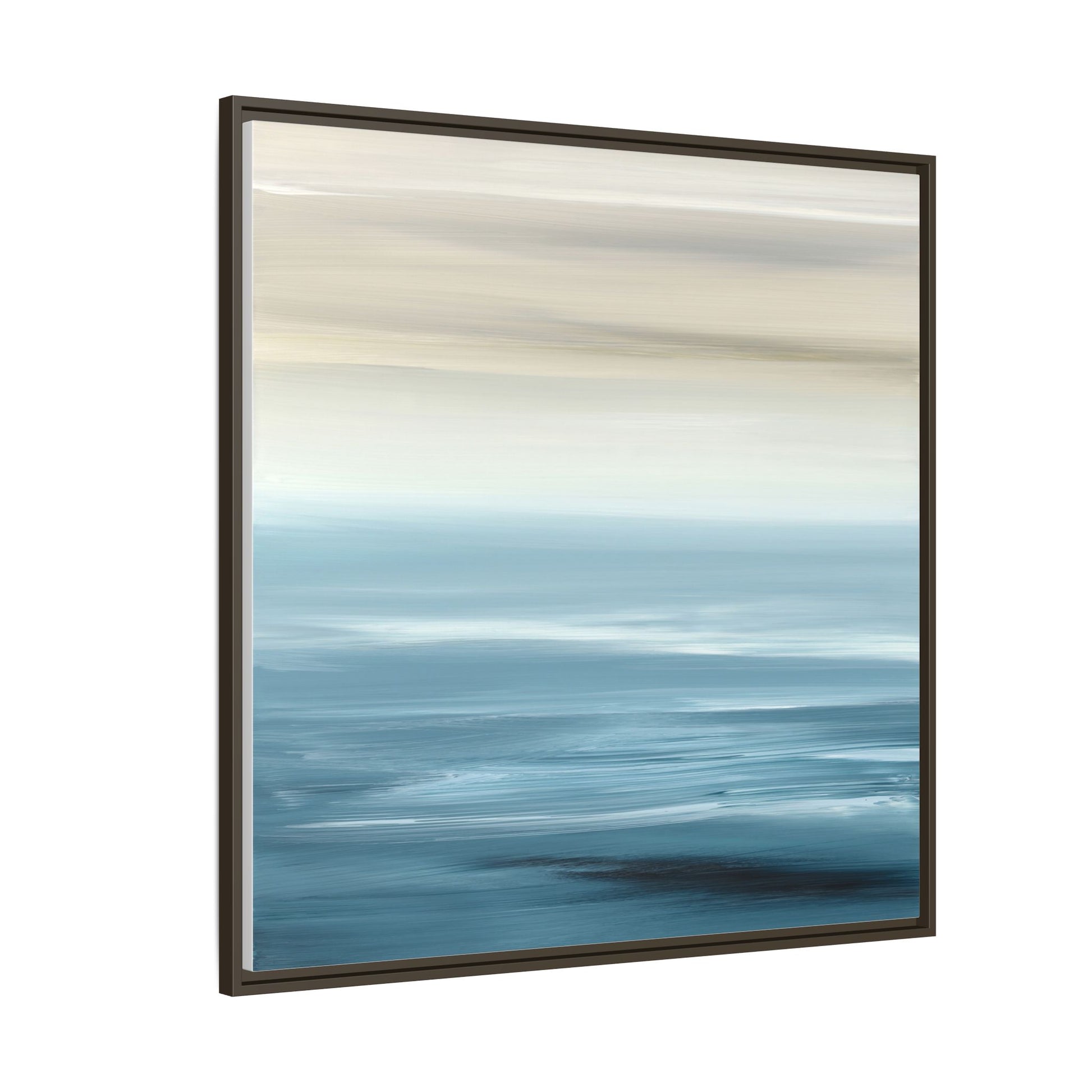 This stunning abstract seascape captures the serene essence of a coastal horizon through a mesmerizing blur of blue and neutral tones. The image employs a motion blur technique that creates soft, horizontal lines reminiscent of water and sky blending seamlessly together. Gradients of pale cream, light blue, and deep teal flow across the composition, suggesting the tranquil transition from shoreline to open water. The horizontal strokes evoke a sense of calm and movement, mimicking the gentle waves and atmospheric haze of a peaceful seascape. The artistic rendering transforms a traditional landscape into a minimalist, almost meditative visual experience that invites contemplation and relaxation.
