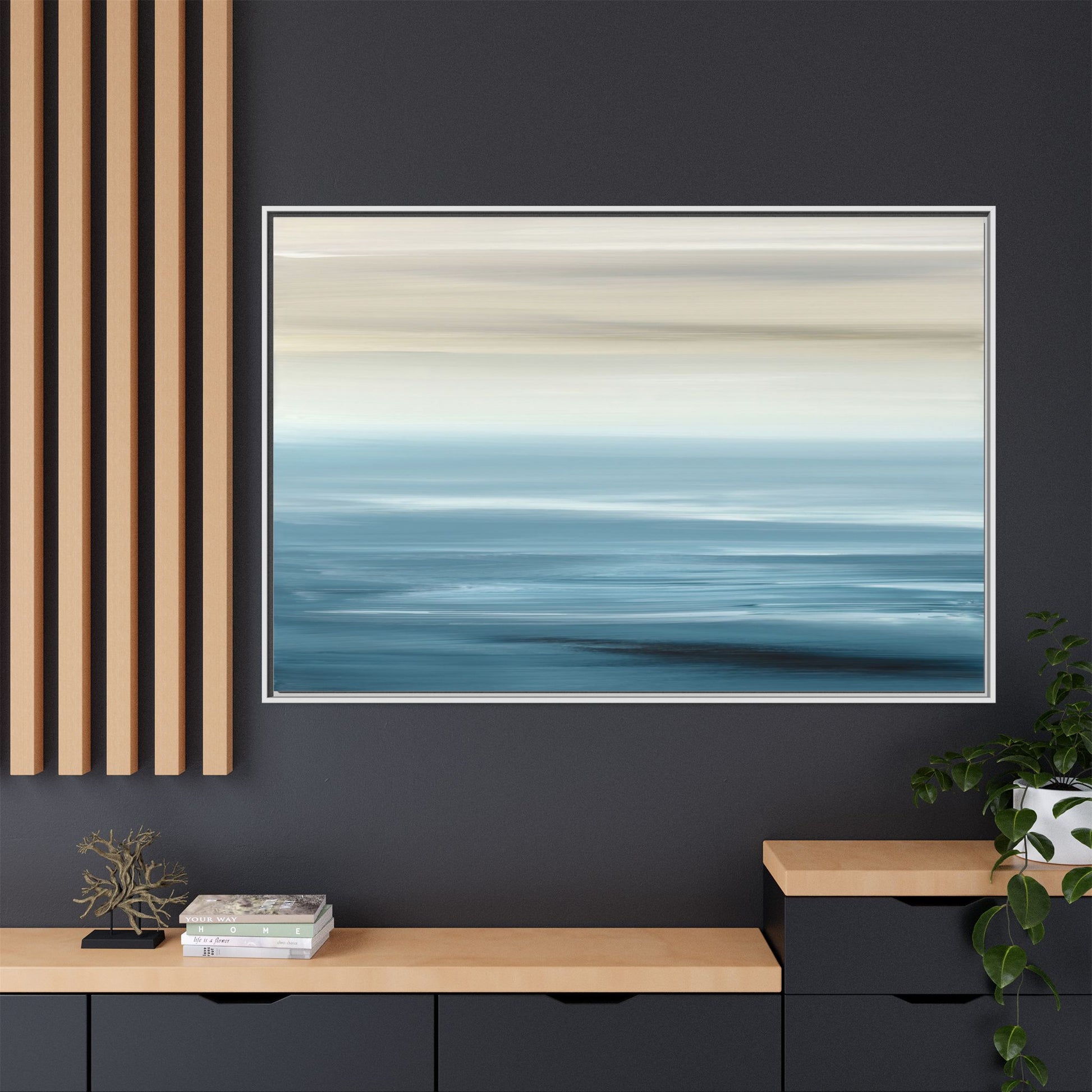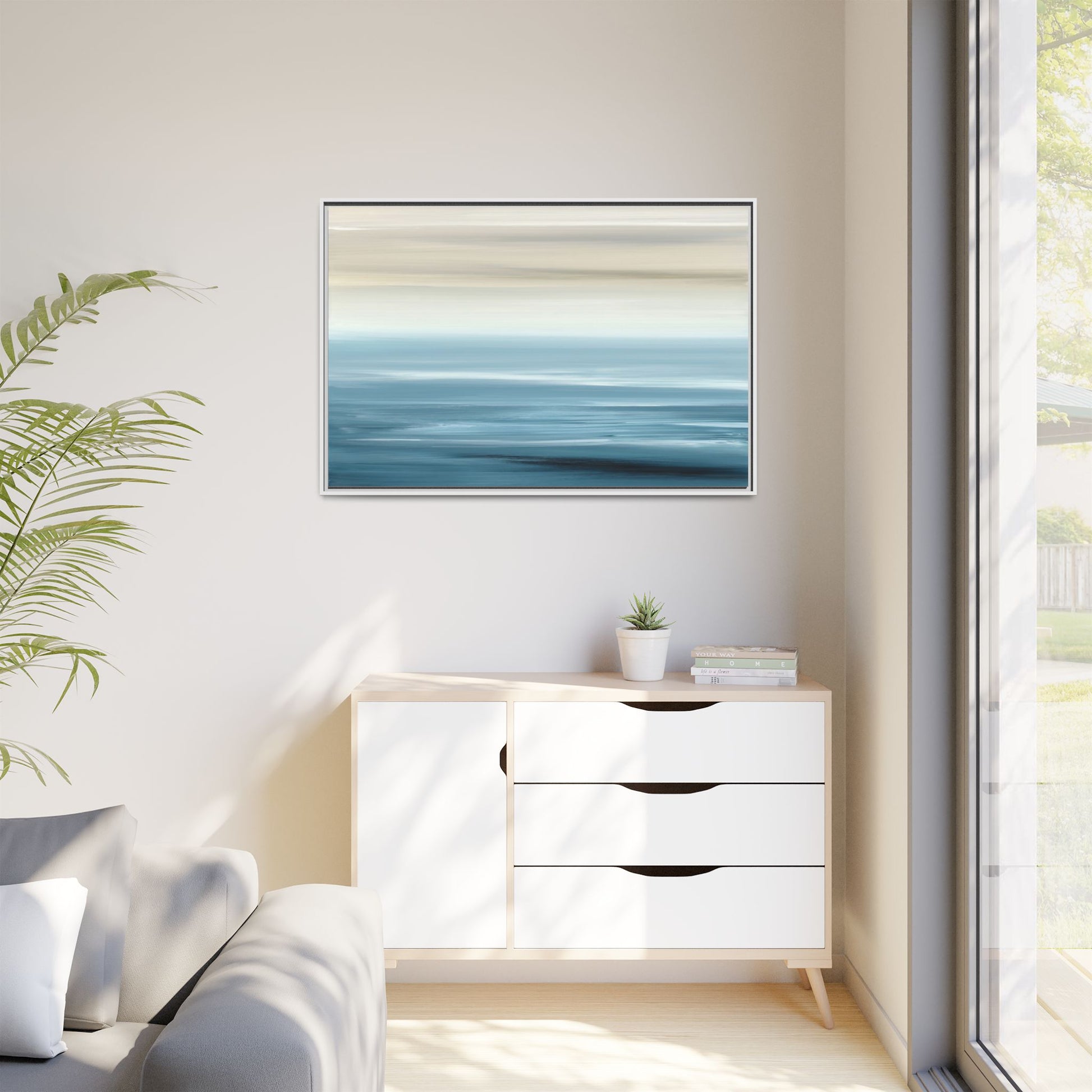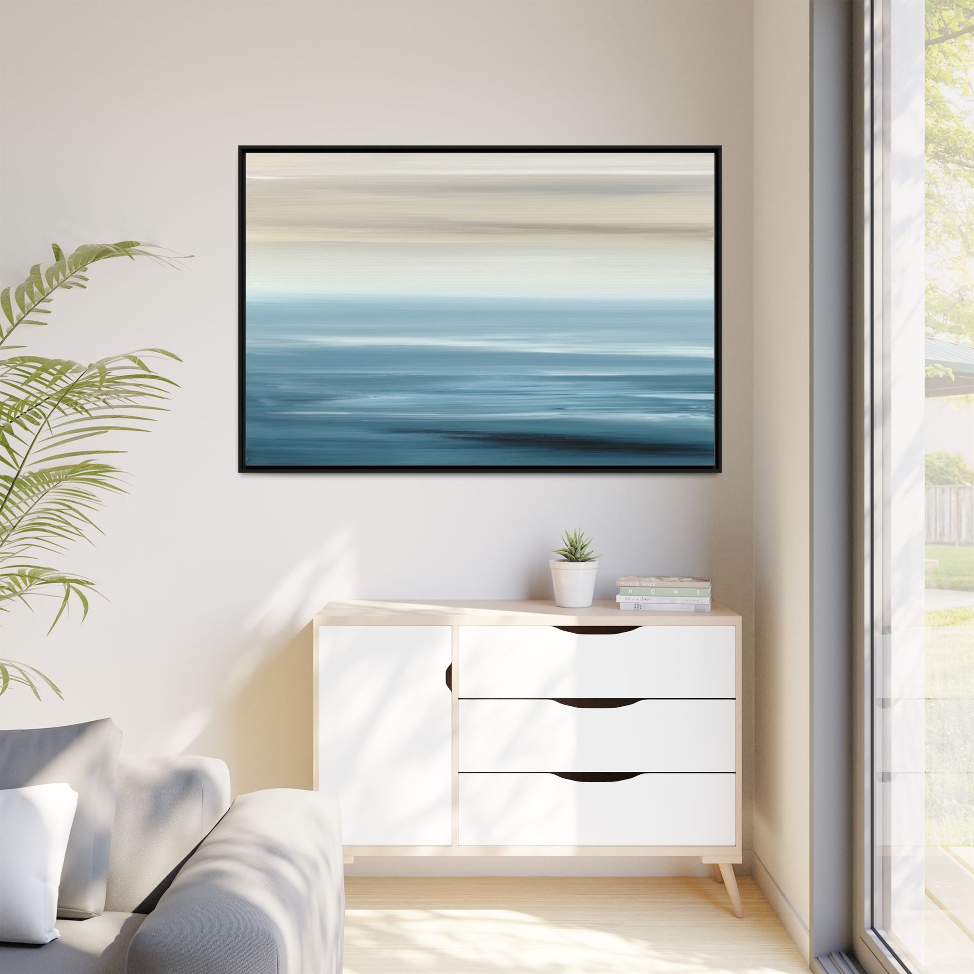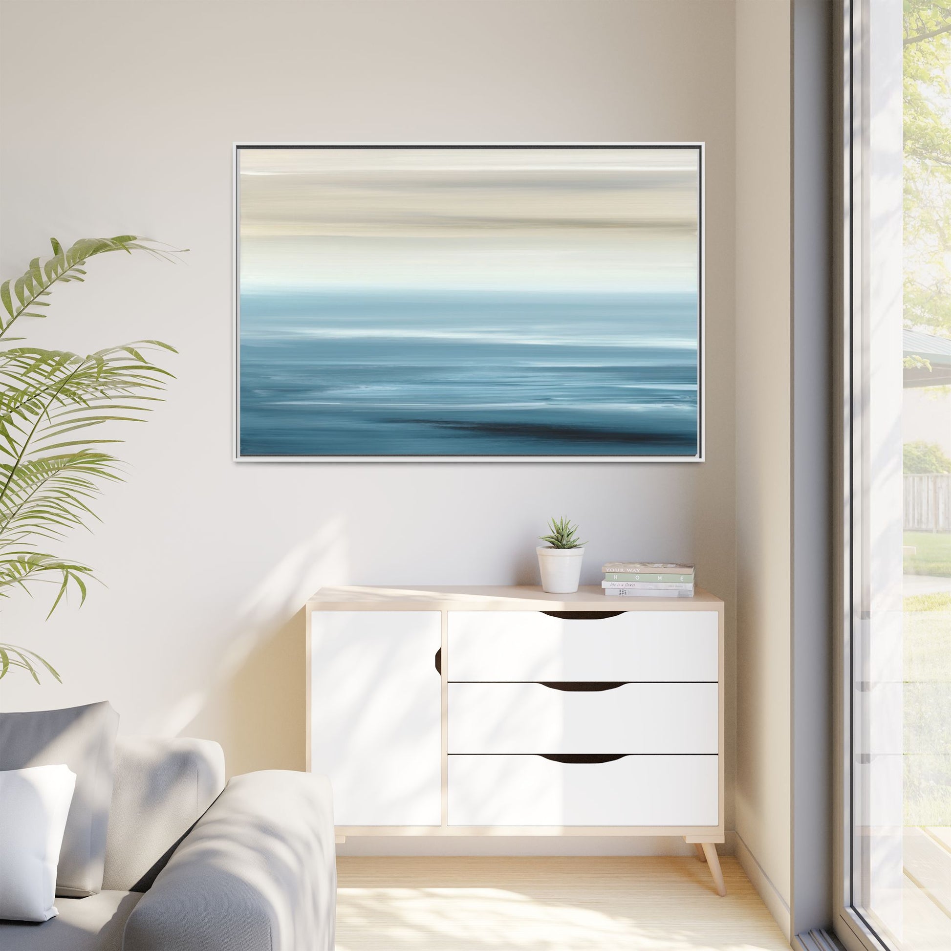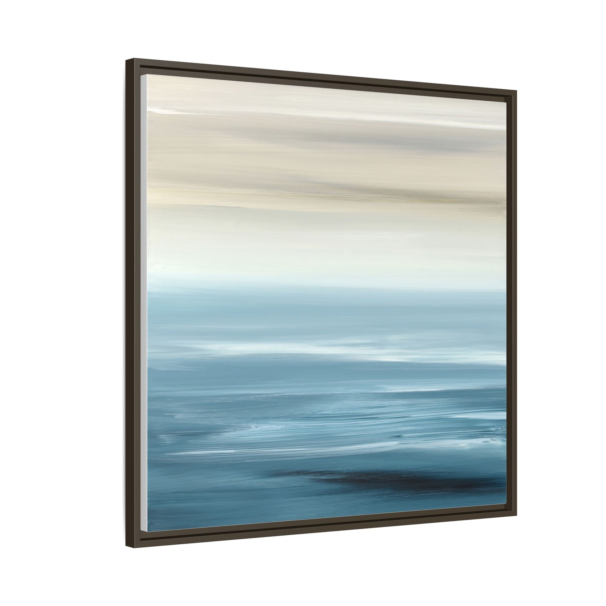 This stunning abstract seascape captures the serene essence of a coastal horizon through a mesmerizing blur of blue and neutral tones. The image employs a motion blur technique that creates soft, horizontal lines reminiscent of water and sky blending seamlessly together. Gradients of pale cream, light blue, and deep teal flow across the composition, suggesting the tranquil transition from shoreline to open water. The horizontal strokes evoke a sense of calm and movement, mimicking the gentle waves and atmospheric haze of a peaceful seascape. The artistic rendering transforms a traditional landscape into a minimalist, almost meditative visual experience that invites contemplation and relaxation.
