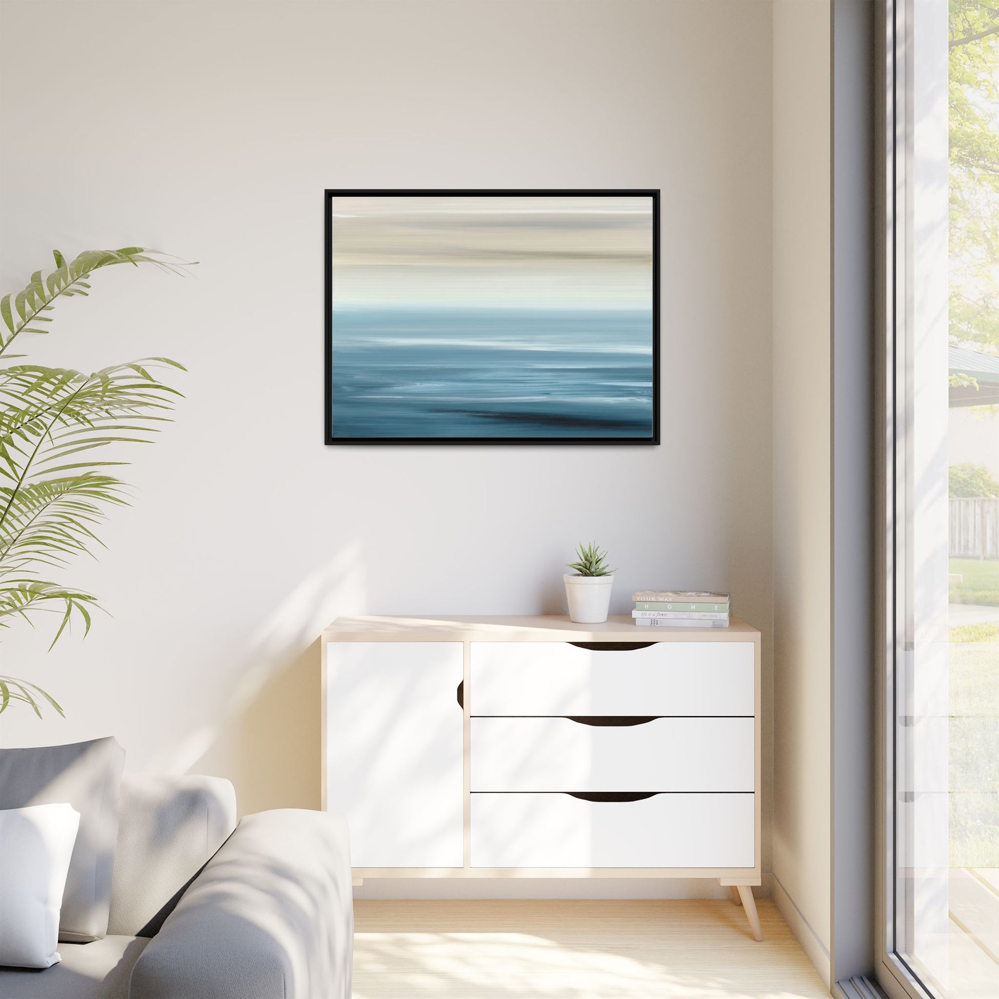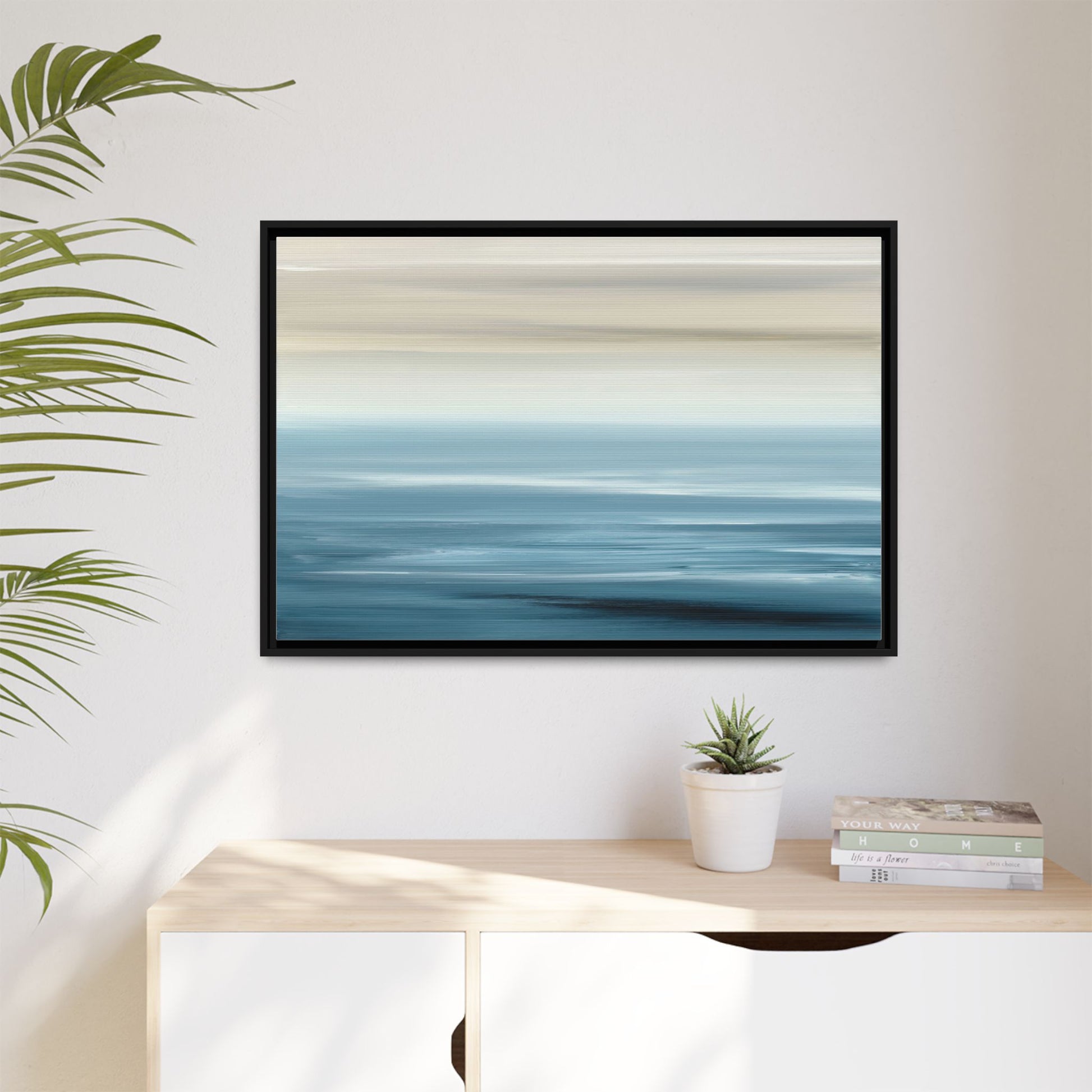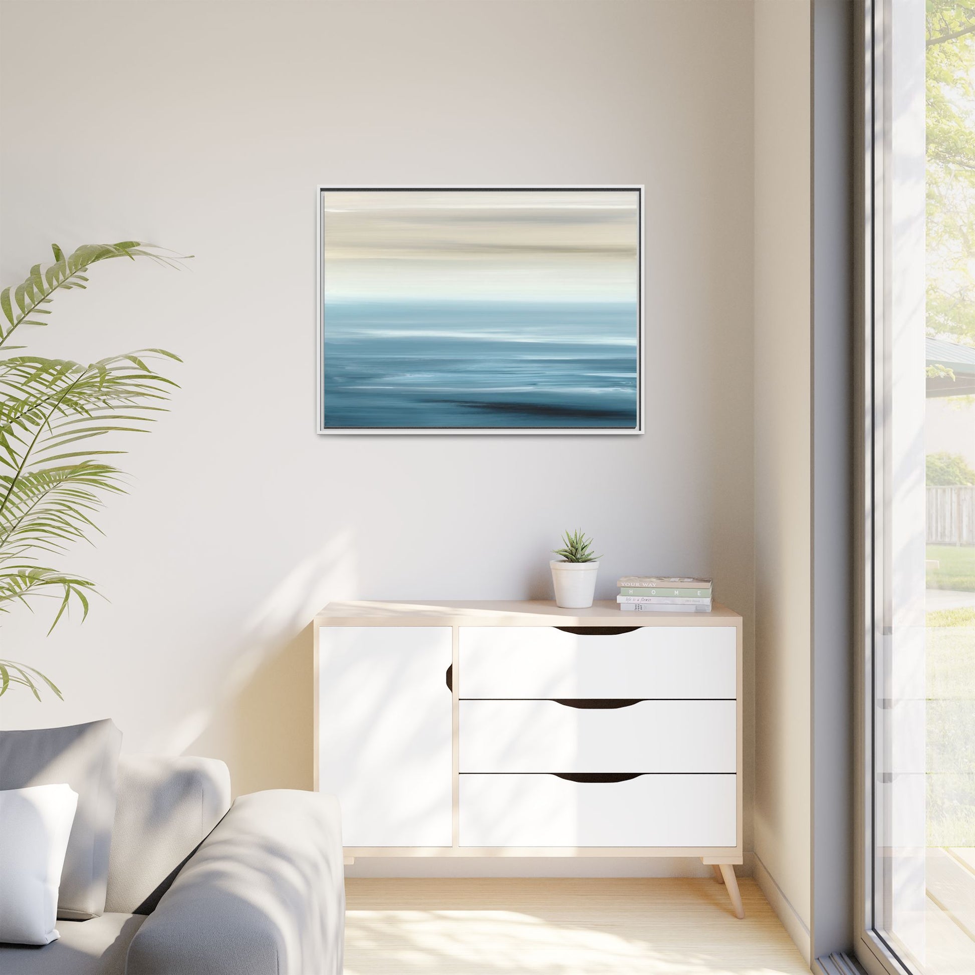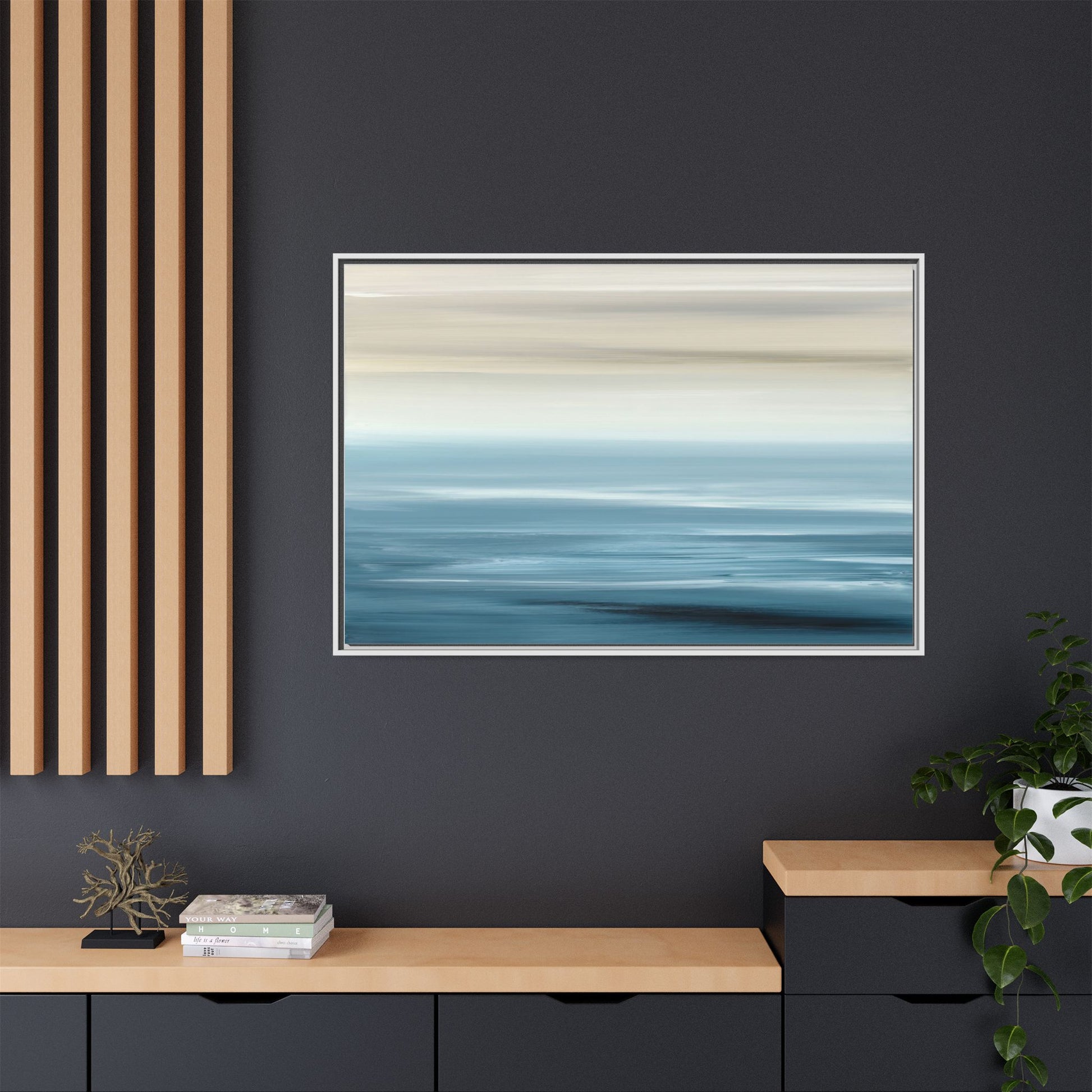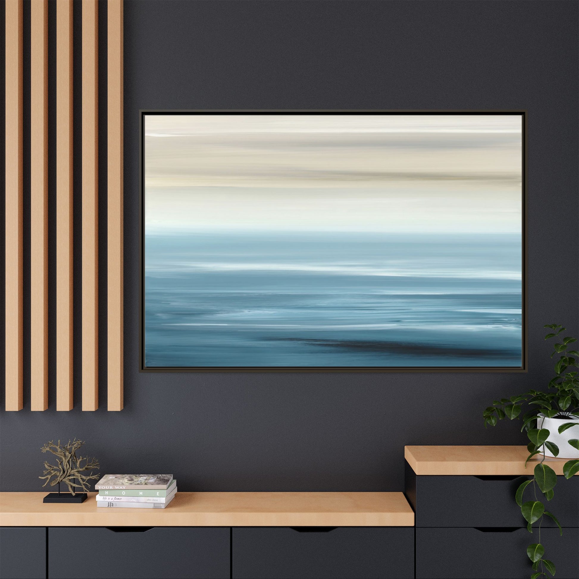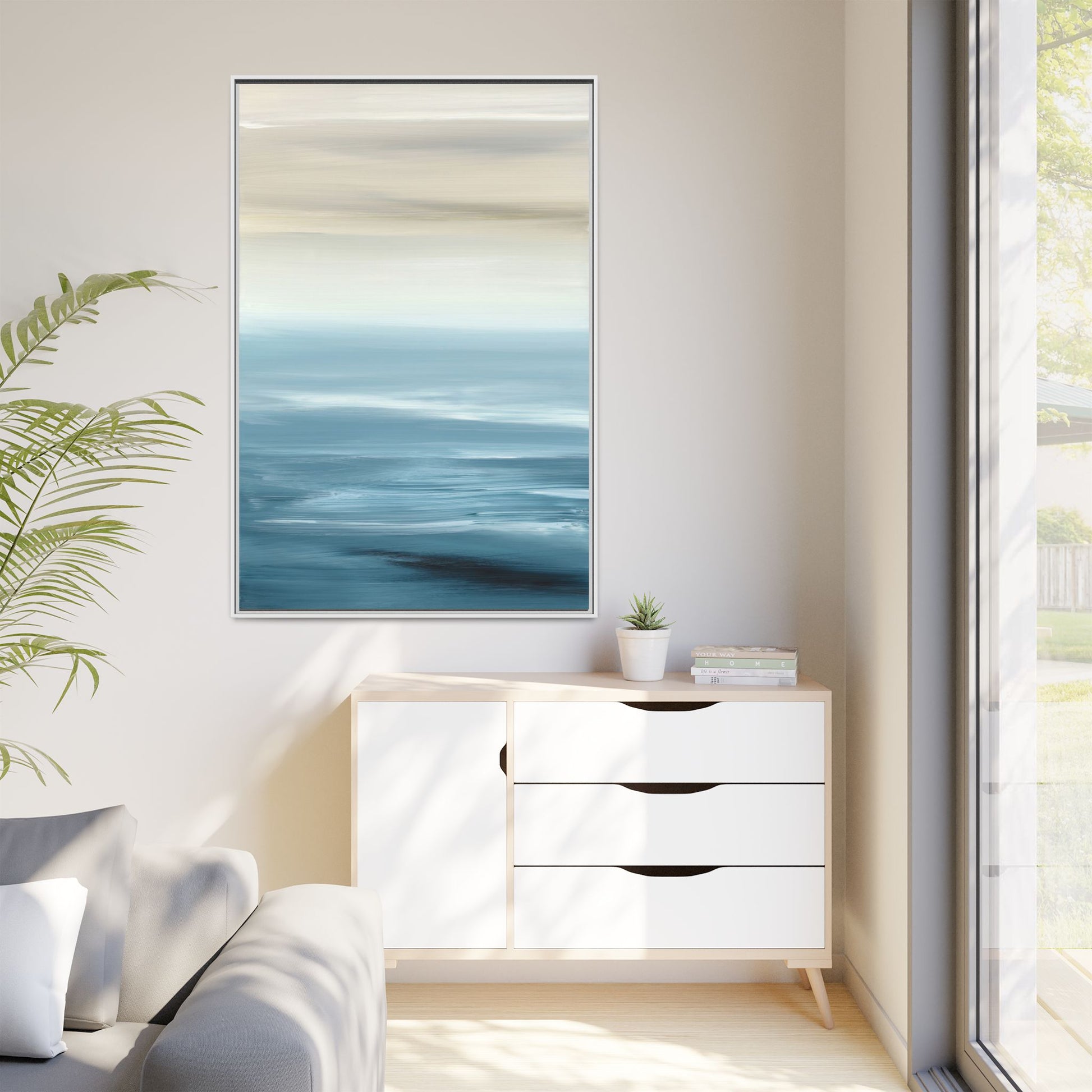 This stunning abstract seascape captures the serene essence of a coastal horizon through a mesmerizing blur of blue and neutral tones. The image employs a motion blur technique that creates soft, horizontal lines reminiscent of water and sky blending seamlessly together. Gradients of pale cream, light blue, and deep teal flow across the composition, suggesting the tranquil transition from shoreline to open water. The horizontal strokes evoke a sense of calm and movement, mimicking the gentle waves and atmospheric haze of a peaceful seascape. The artistic rendering transforms a traditional landscape into a minimalist, almost meditative visual experience that invites contemplation and relaxation.