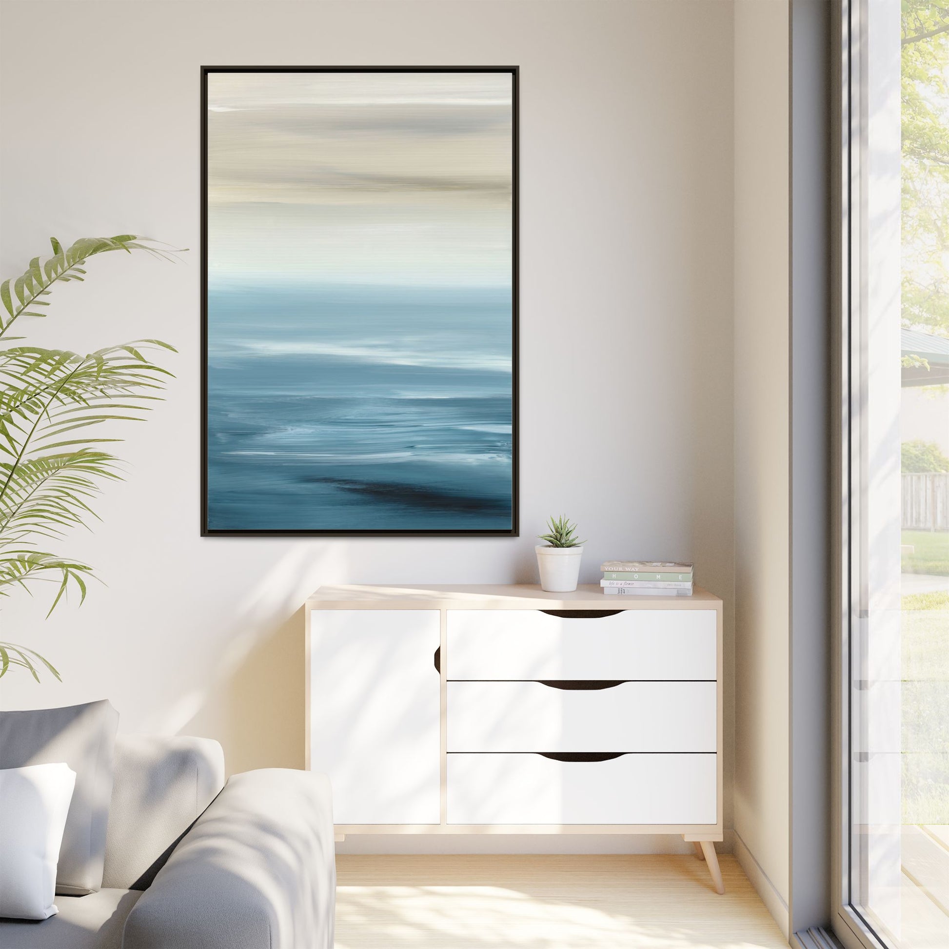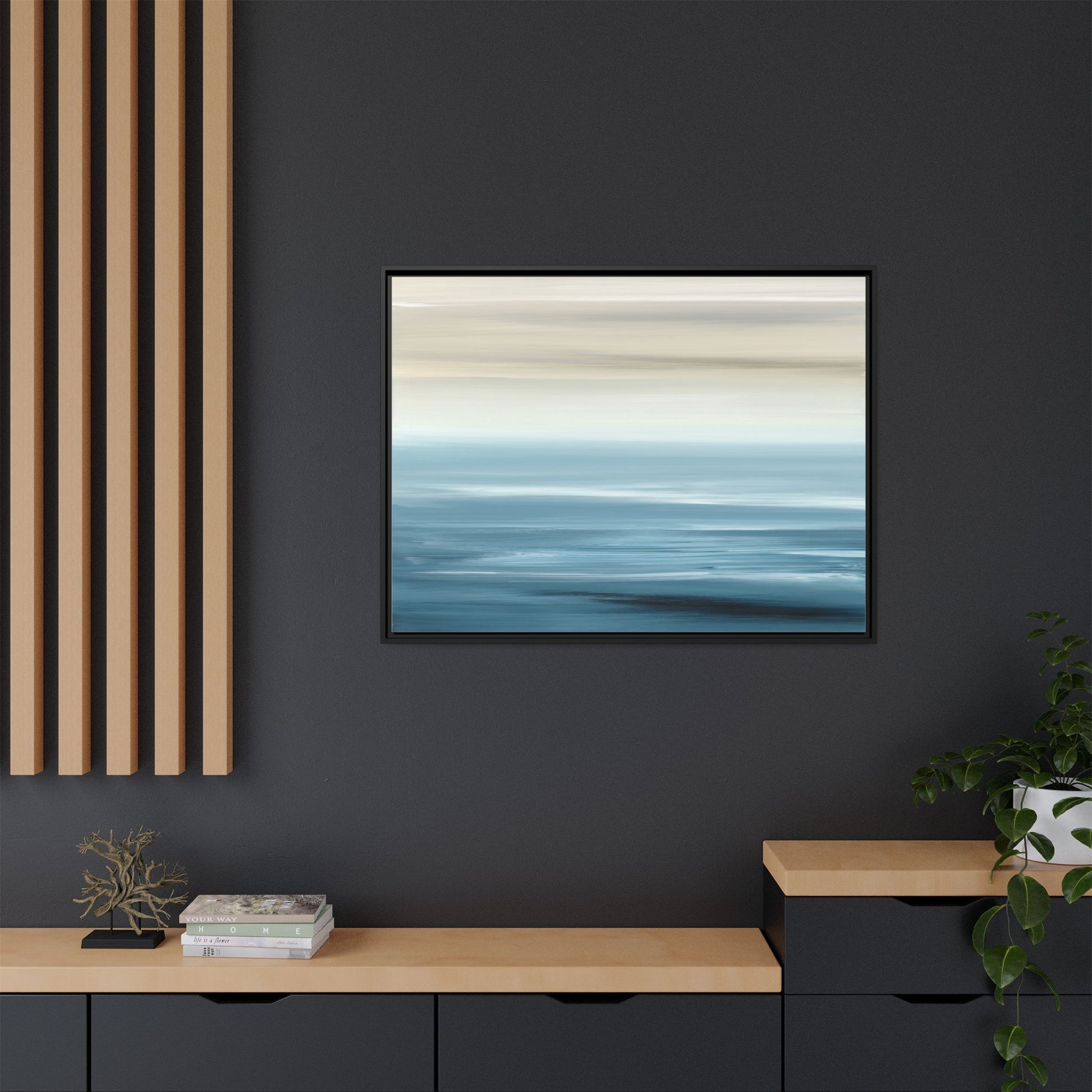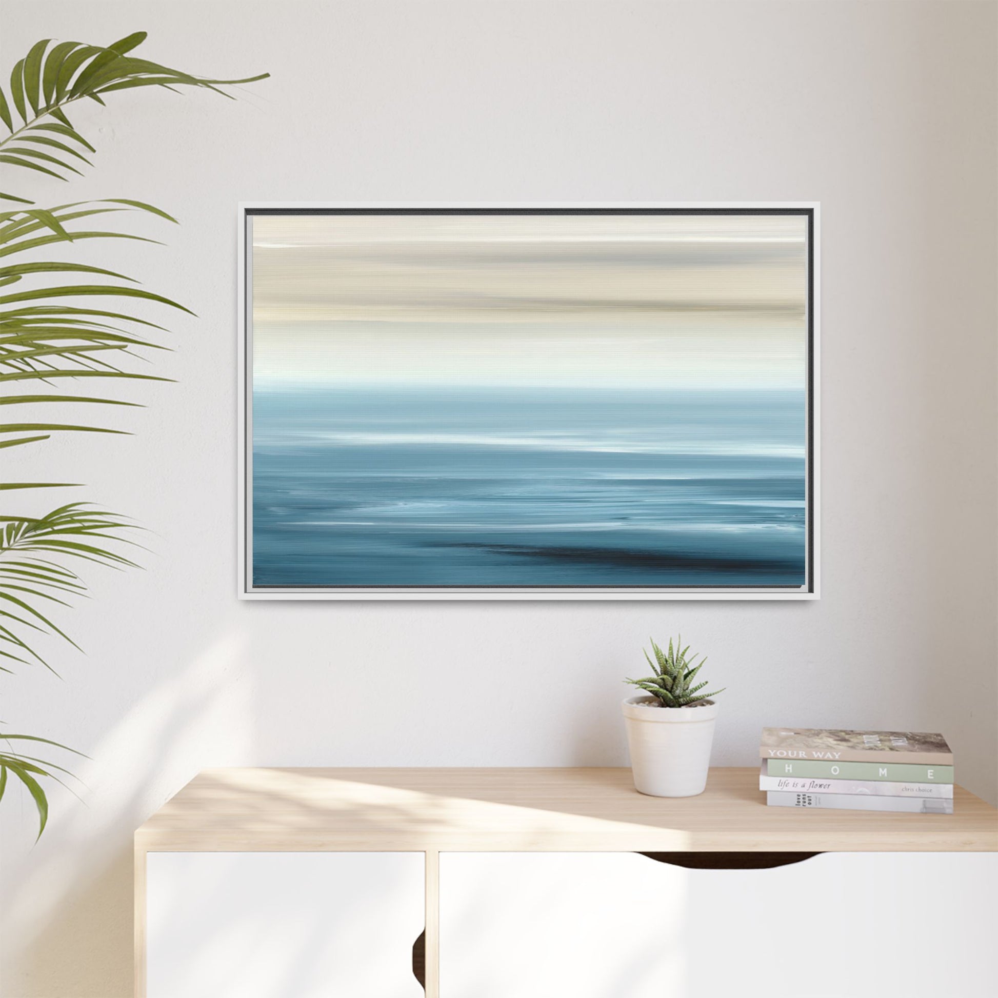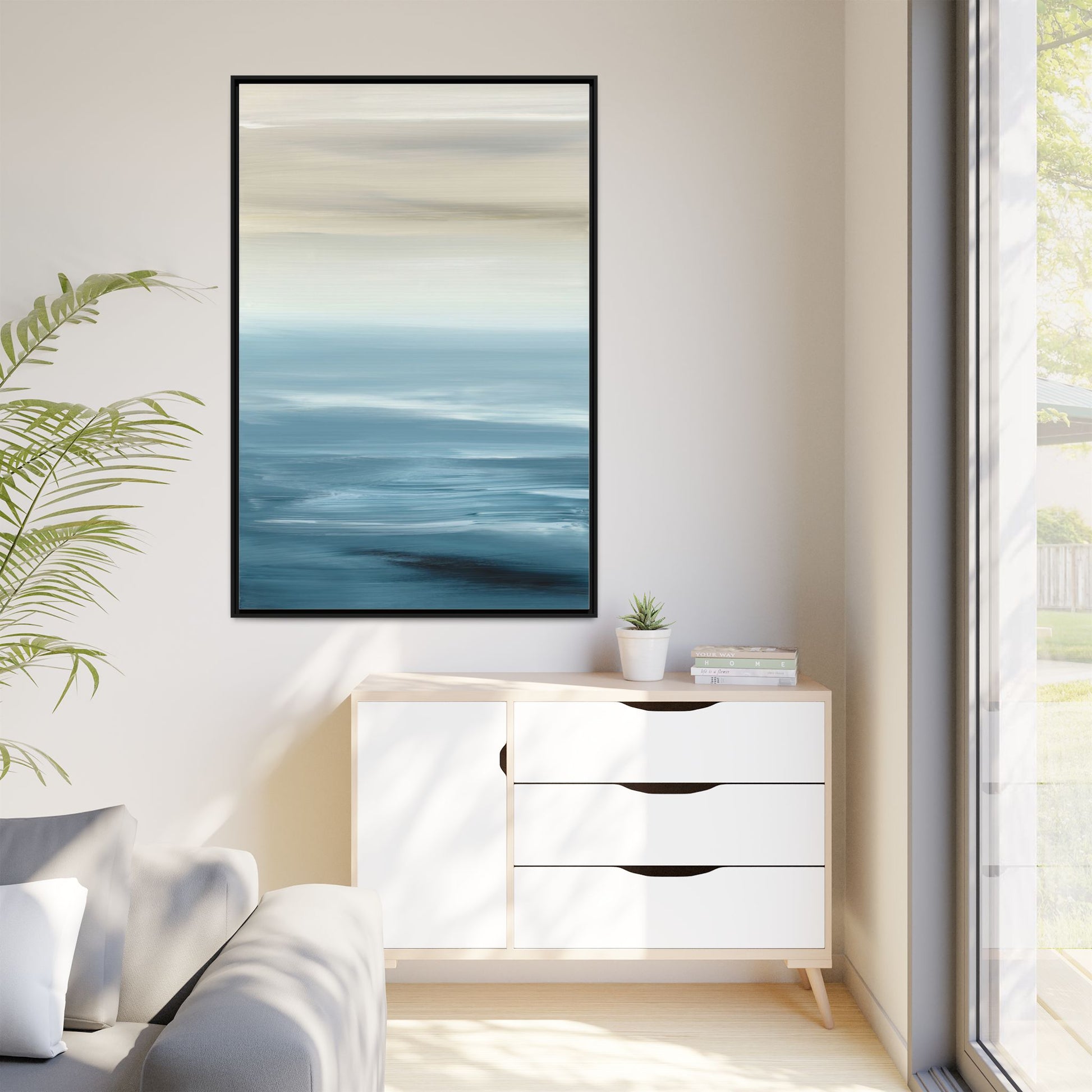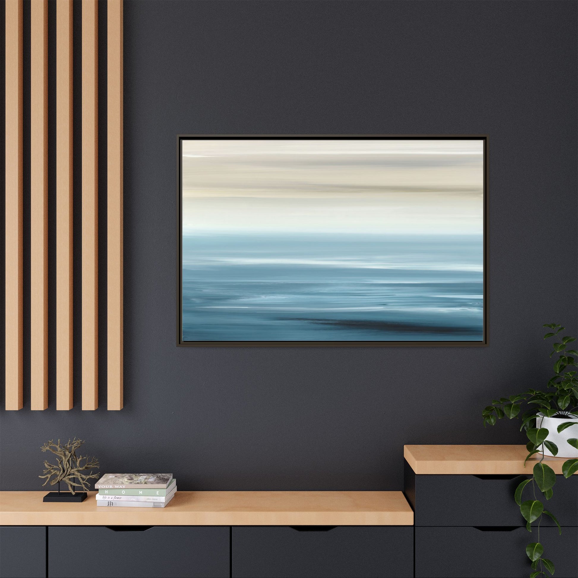 This stunning abstract seascape captures the serene essence of a coastal horizon through a mesmerizing blur of blue and neutral tones. The image employs a motion blur technique that creates soft, horizontal lines reminiscent of water and sky blending seamlessly together. Gradients of pale cream, light blue, and deep teal flow across the composition, suggesting the tranquil transition from shoreline to open water. The horizontal strokes evoke a sense of calm and movement, mimicking the gentle waves and atmospheric haze of a peaceful seascape. The artistic rendering transforms a traditional landscape into a minimalist, almost meditative visual experience that invites contemplation and relaxation.
