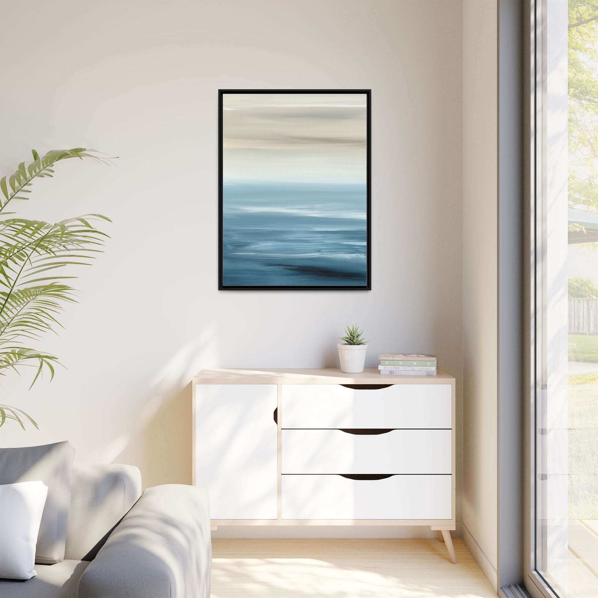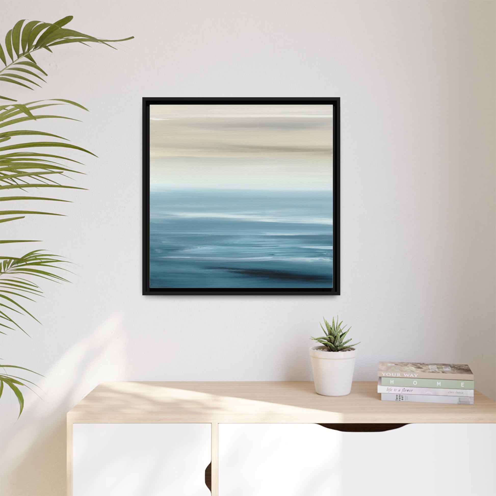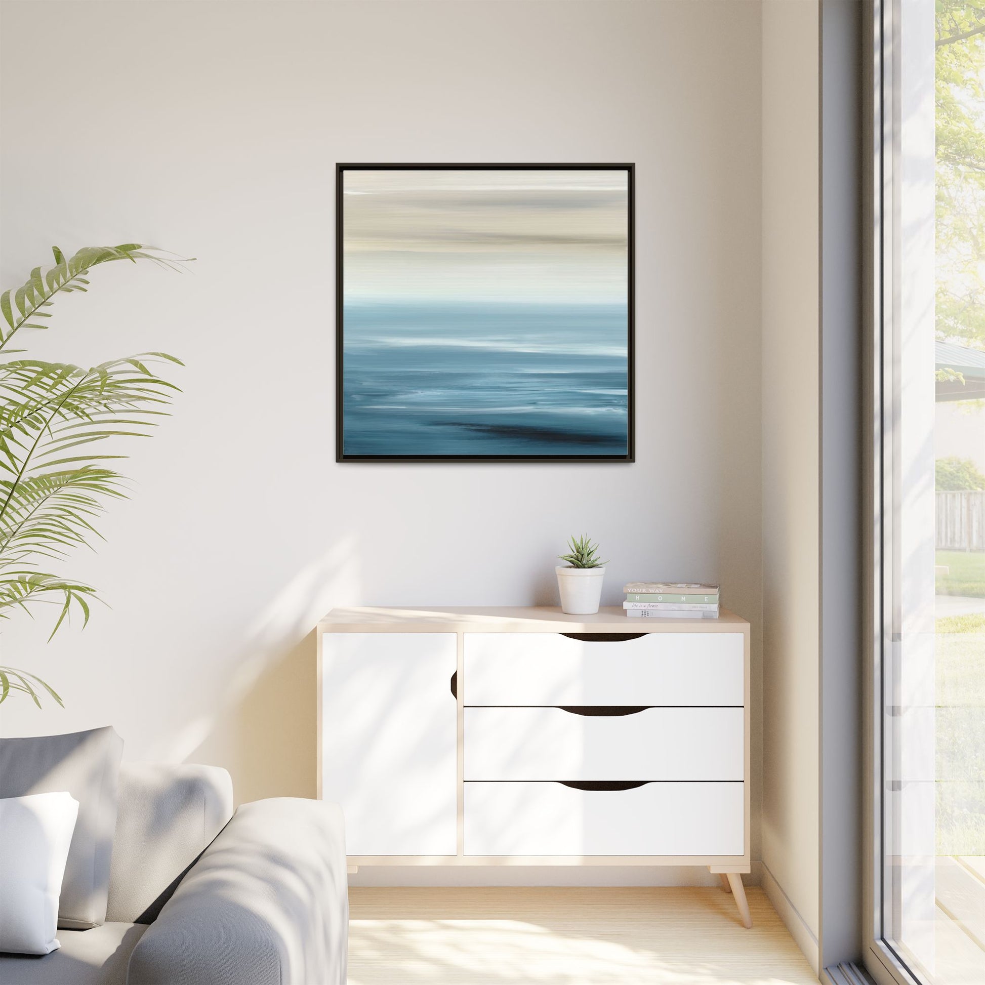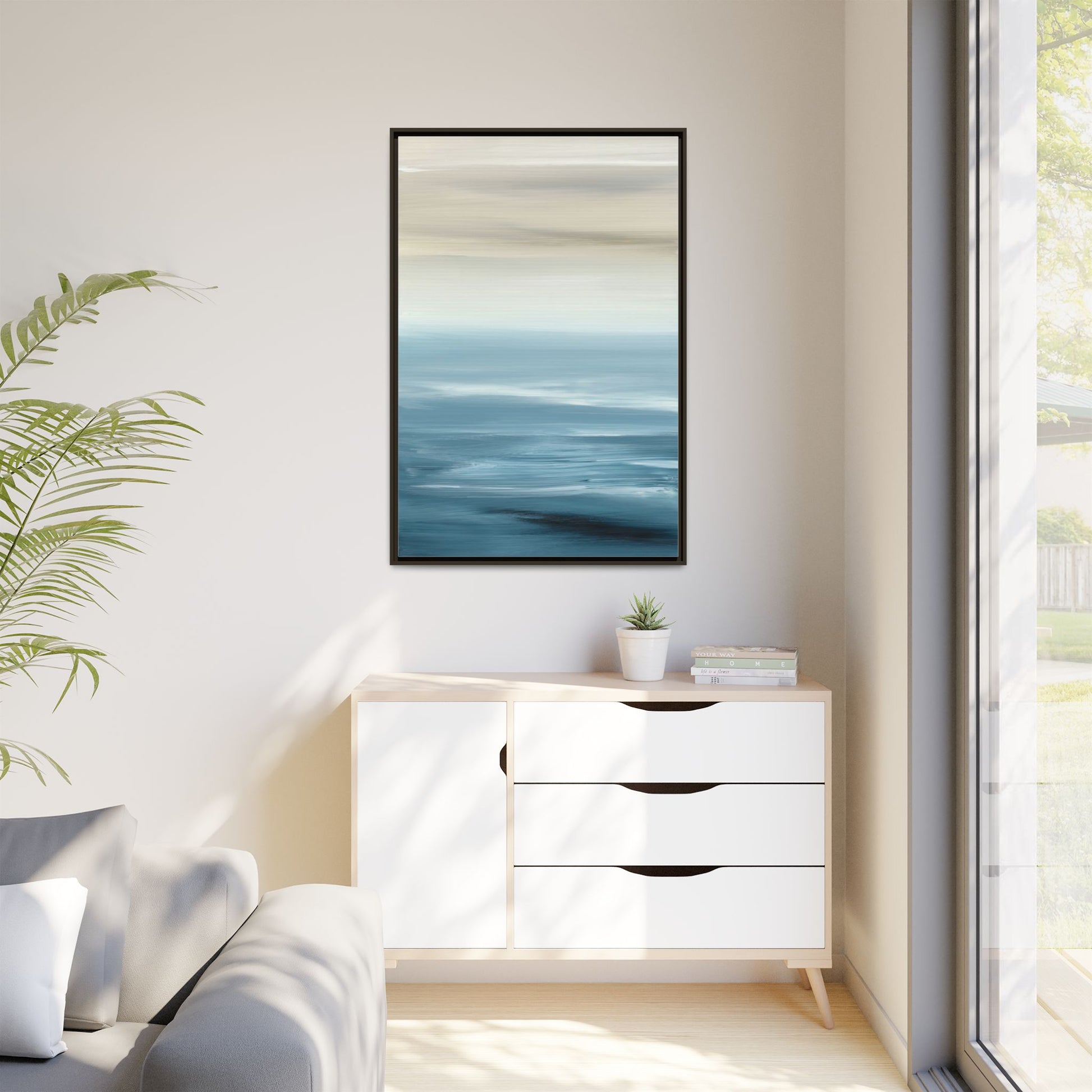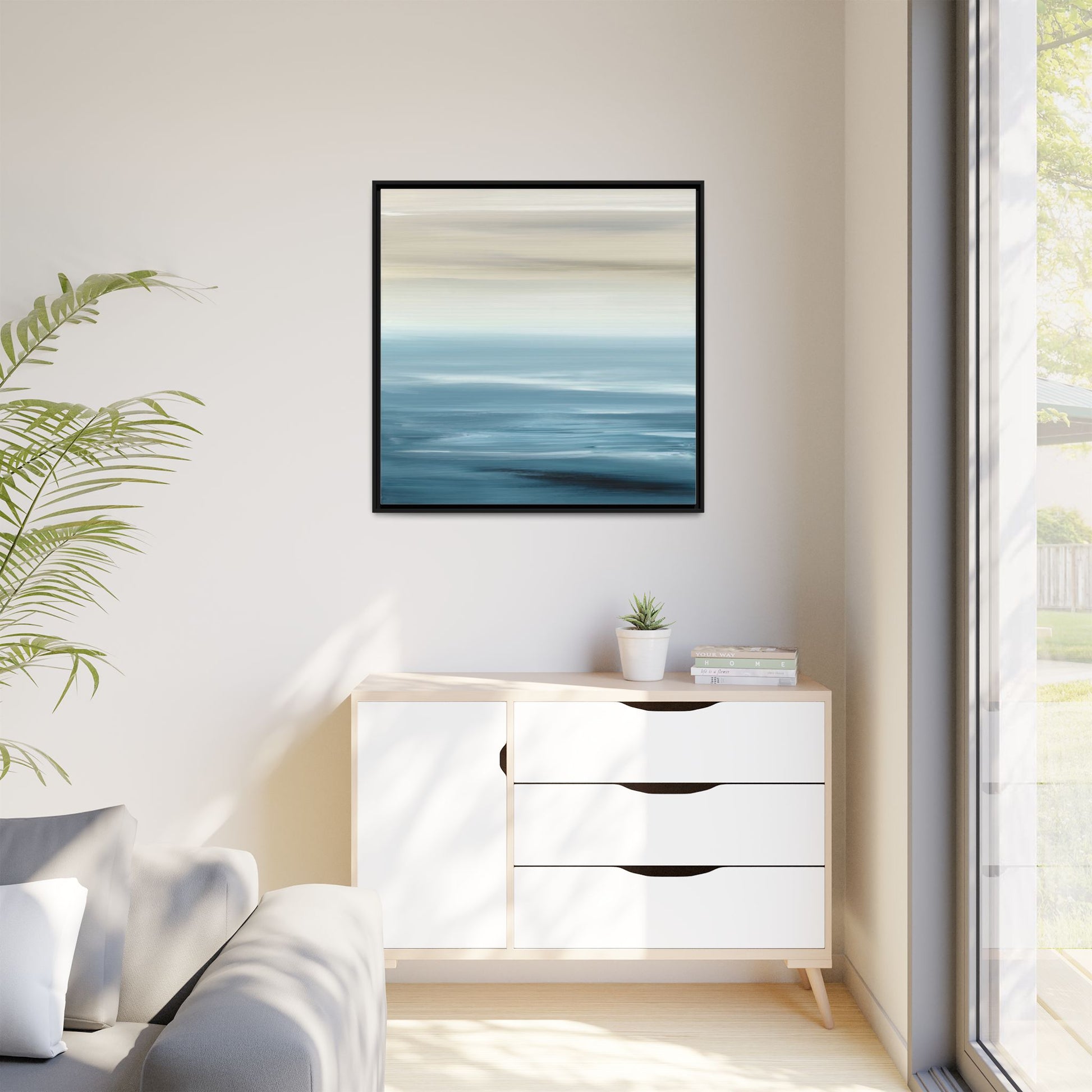 This stunning abstract seascape captures the serene essence of a coastal horizon through a mesmerizing blur of blue and neutral tones. The image employs a motion blur technique that creates soft, horizontal lines reminiscent of water and sky blending seamlessly together. Gradients of pale cream, light blue, and deep teal flow across the composition, suggesting the tranquil transition from shoreline to open water. The horizontal strokes evoke a sense of calm and movement, mimicking the gentle waves and atmospheric haze of a peaceful seascape. The artistic rendering transforms a traditional landscape into a minimalist, almost meditative visual experience that invites contemplation and relaxation.