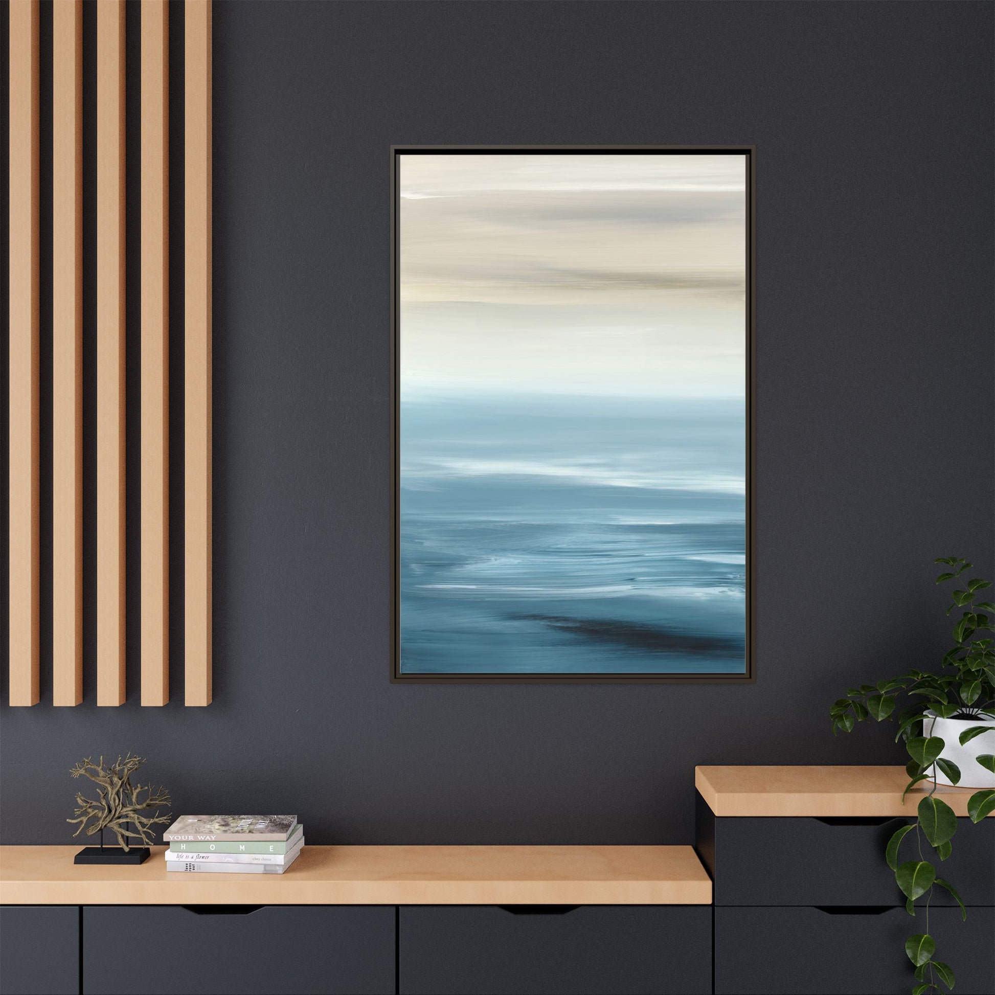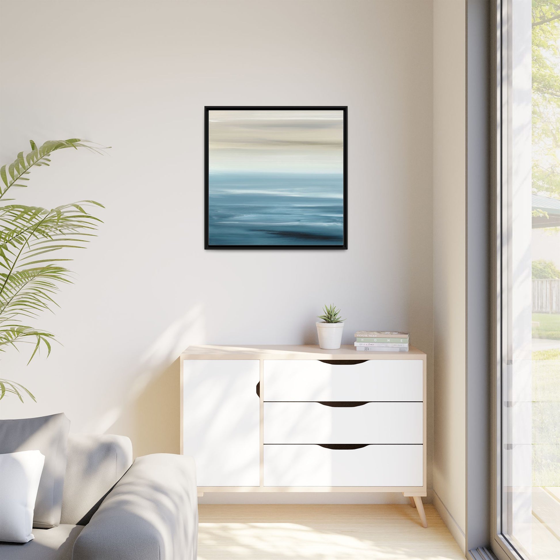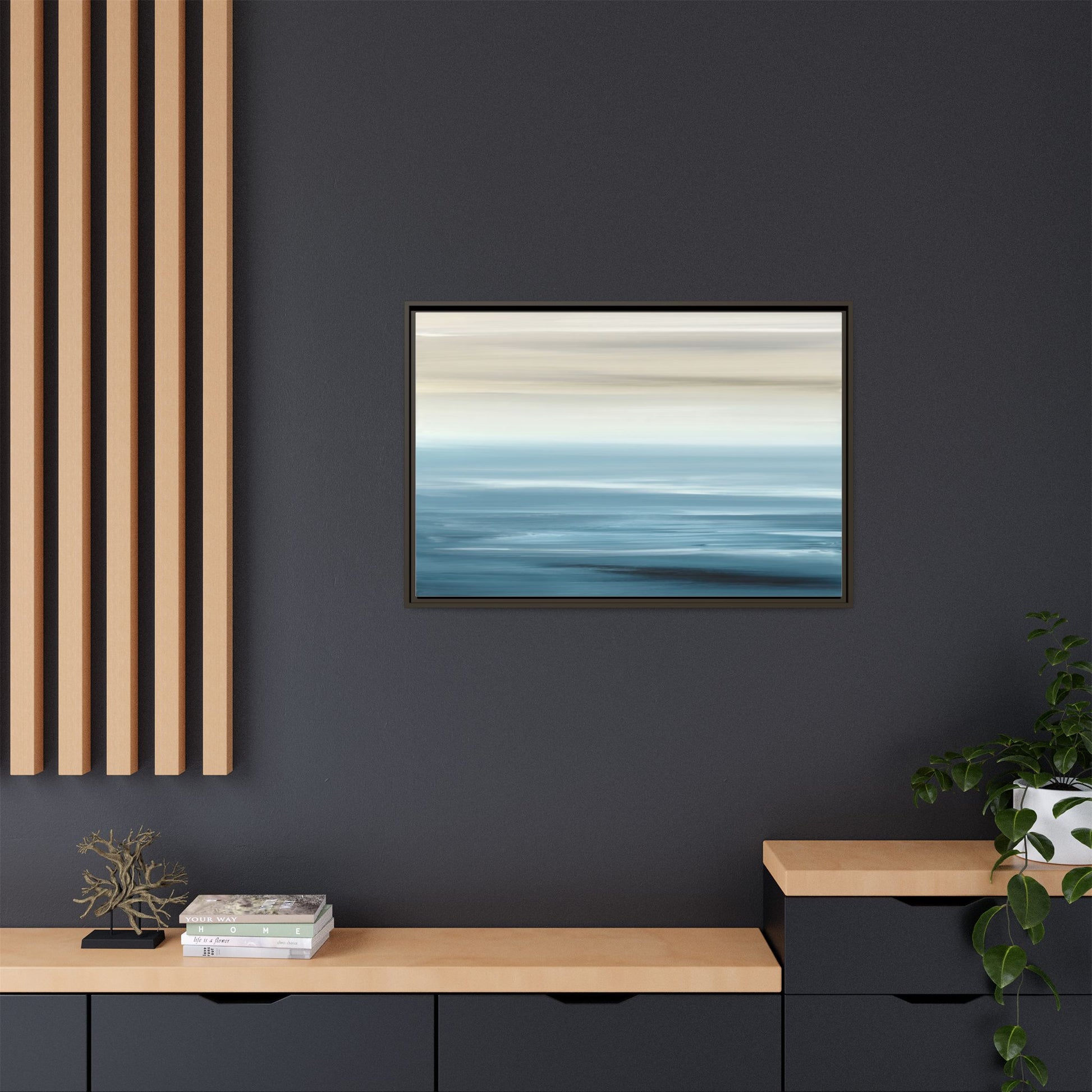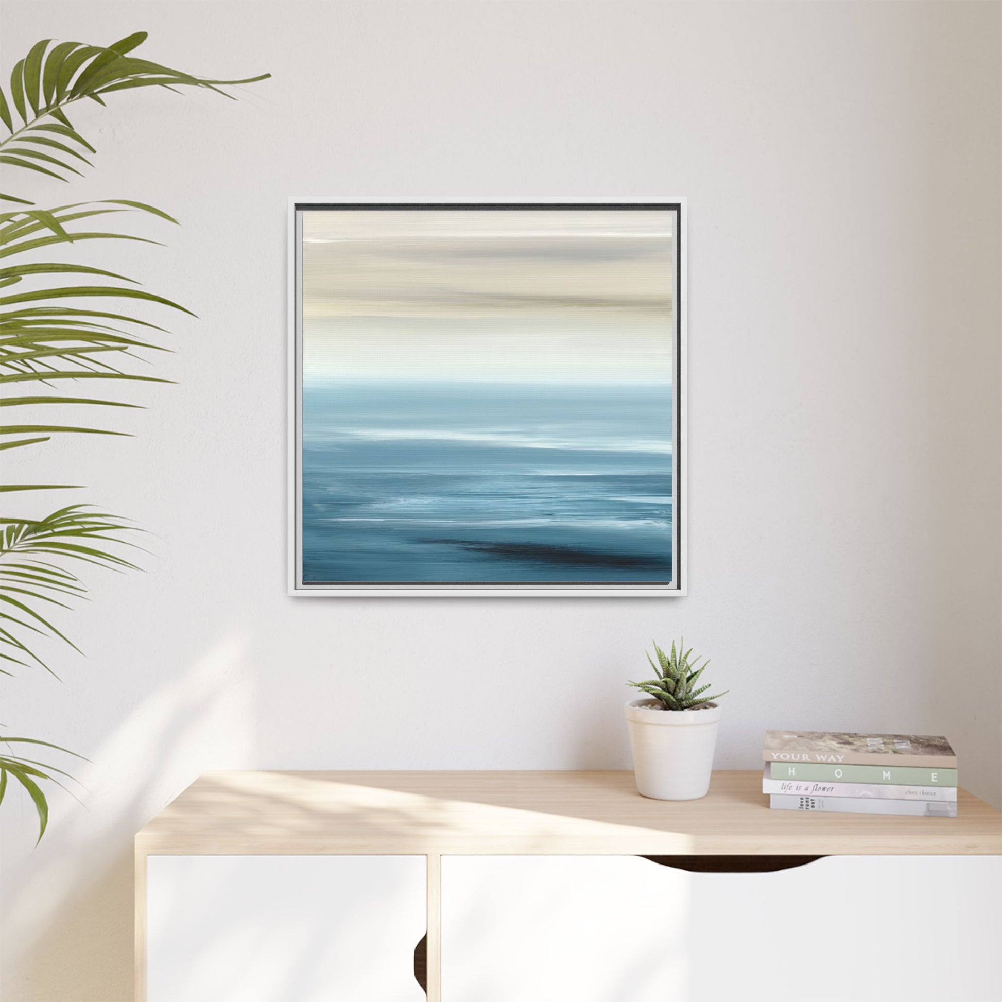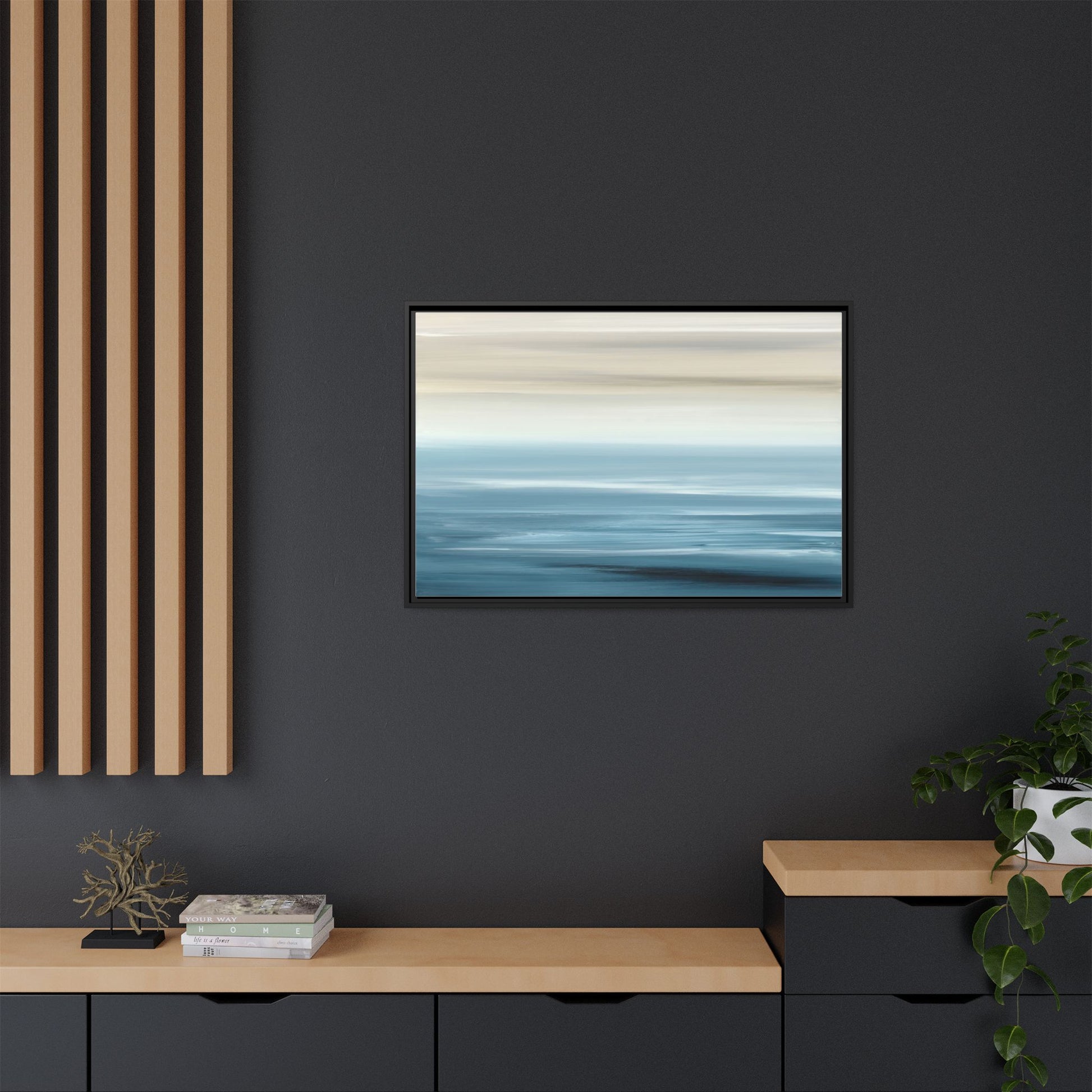 This stunning abstract seascape captures the serene essence of a coastal horizon through a mesmerizing blur of blue and neutral tones. The image employs a motion blur technique that creates soft, horizontal lines reminiscent of water and sky blending seamlessly together. Gradients of pale cream, light blue, and deep teal flow across the composition, suggesting the tranquil transition from shoreline to open water. The horizontal strokes evoke a sense of calm and movement, mimicking the gentle waves and atmospheric haze of a peaceful seascape. The artistic rendering transforms a traditional landscape into a minimalist, almost meditative visual experience that invites contemplation and relaxation.