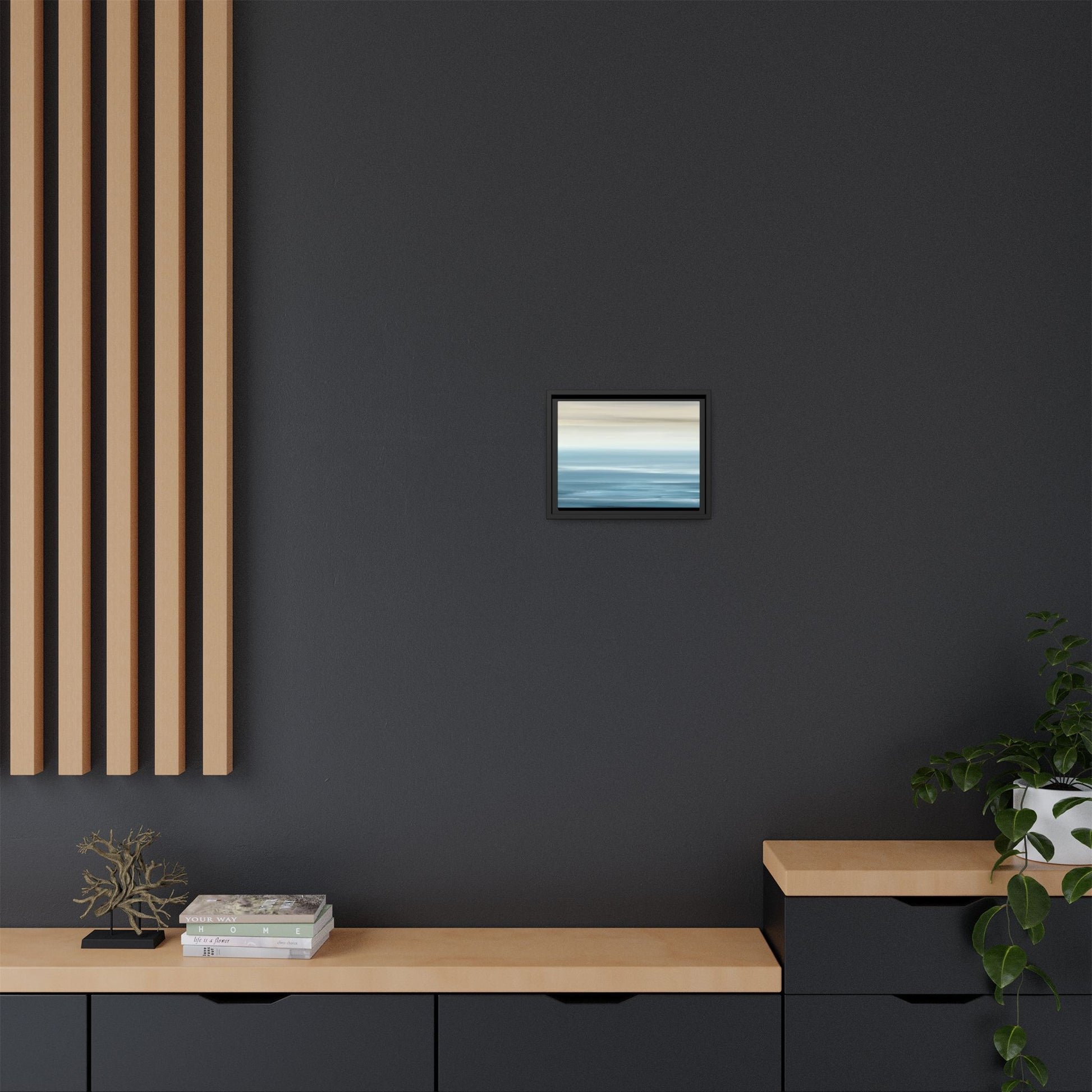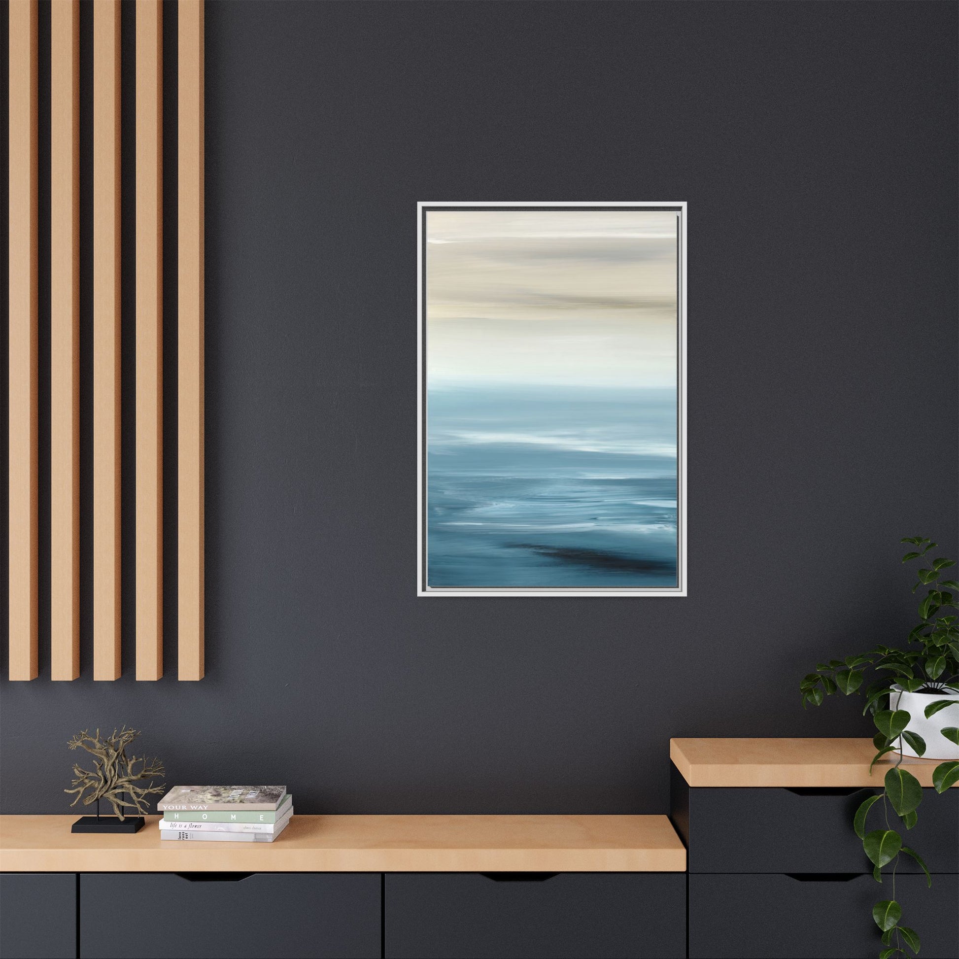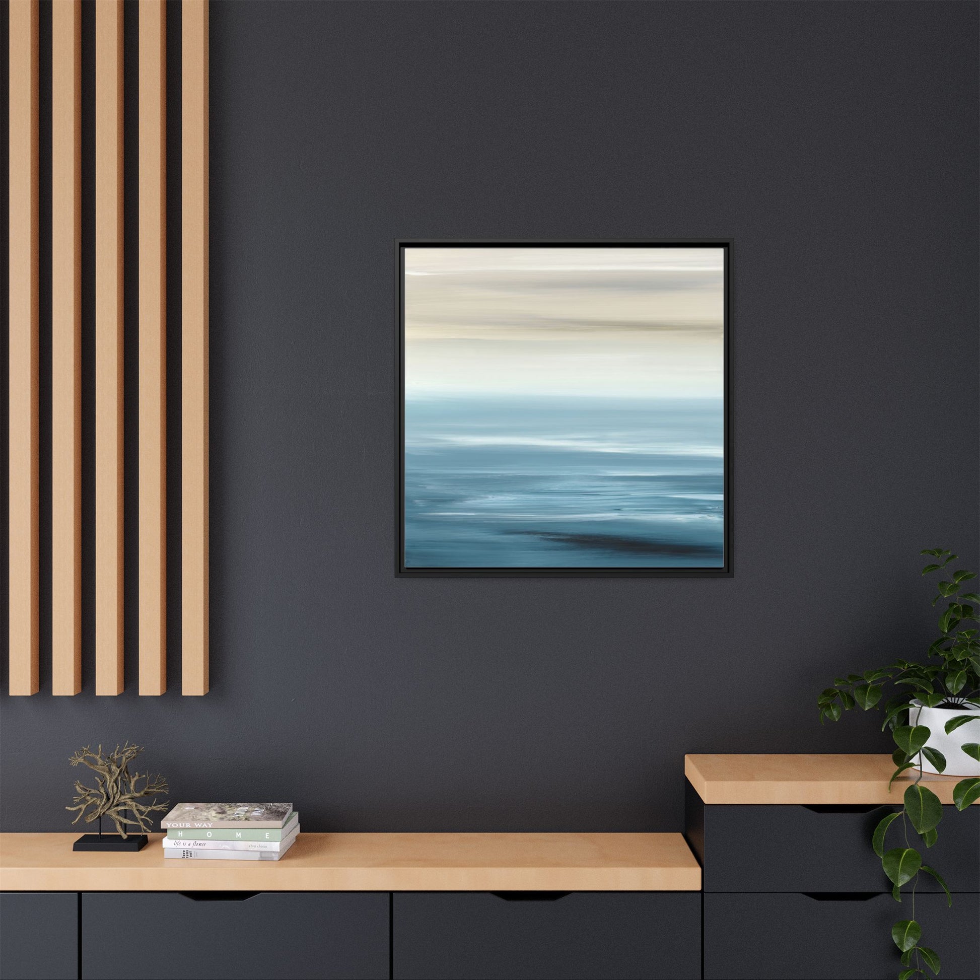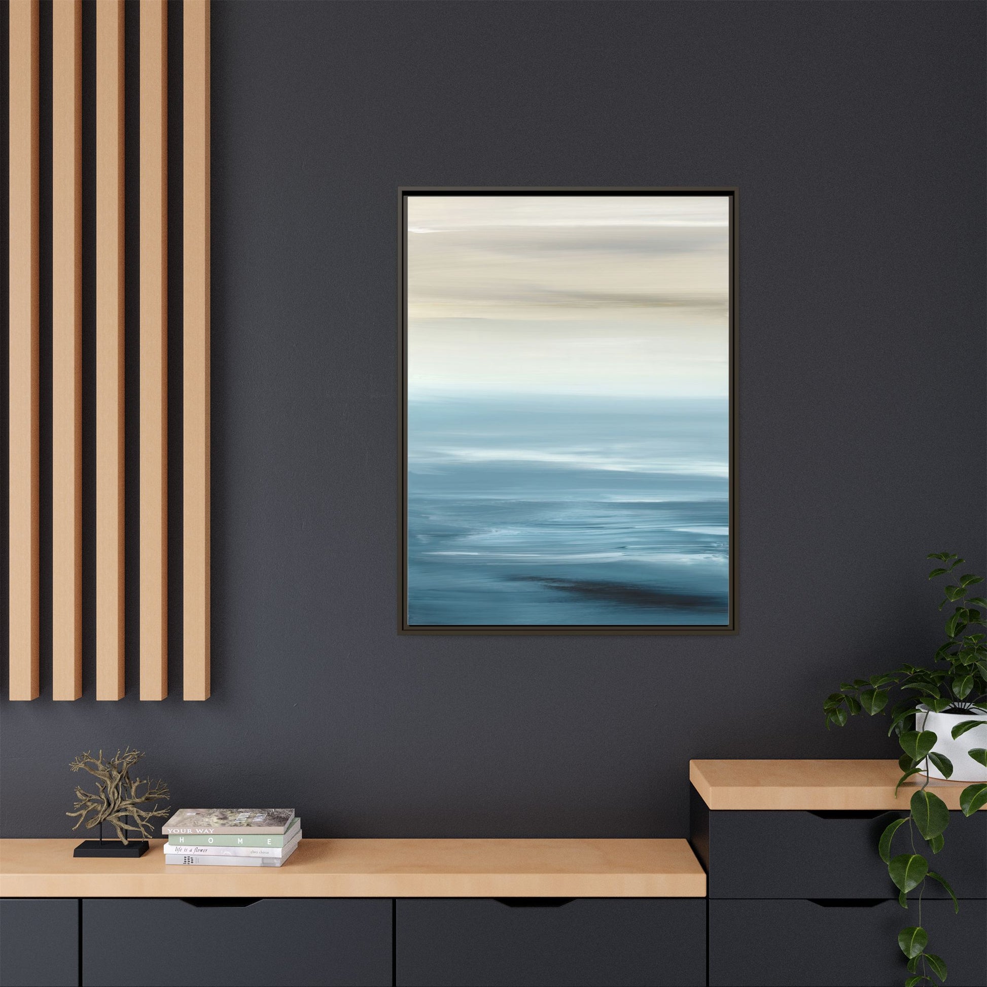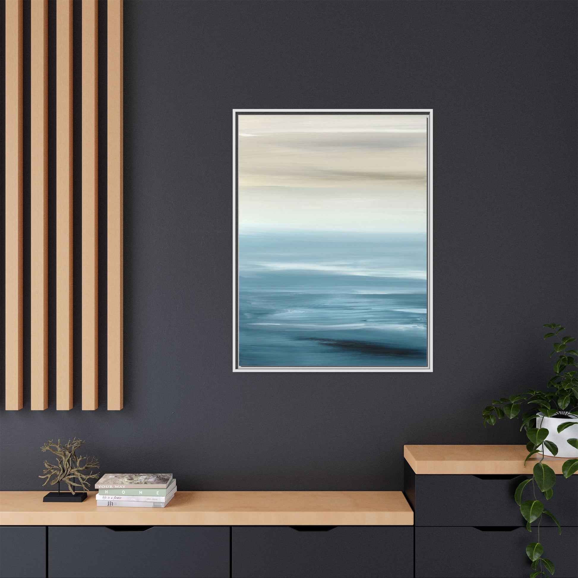 This stunning abstract seascape captures the serene essence of a coastal horizon through a mesmerizing blur of blue and neutral tones. The image employs a motion blur technique that creates soft, horizontal lines reminiscent of water and sky blending seamlessly together. Gradients of pale cream, light blue, and deep teal flow across the composition, suggesting the tranquil transition from shoreline to open water. The horizontal strokes evoke a sense of calm and movement, mimicking the gentle waves and atmospheric haze of a peaceful seascape. The artistic rendering transforms a traditional landscape into a minimalist, almost meditative visual experience that invites contemplation and relaxation.