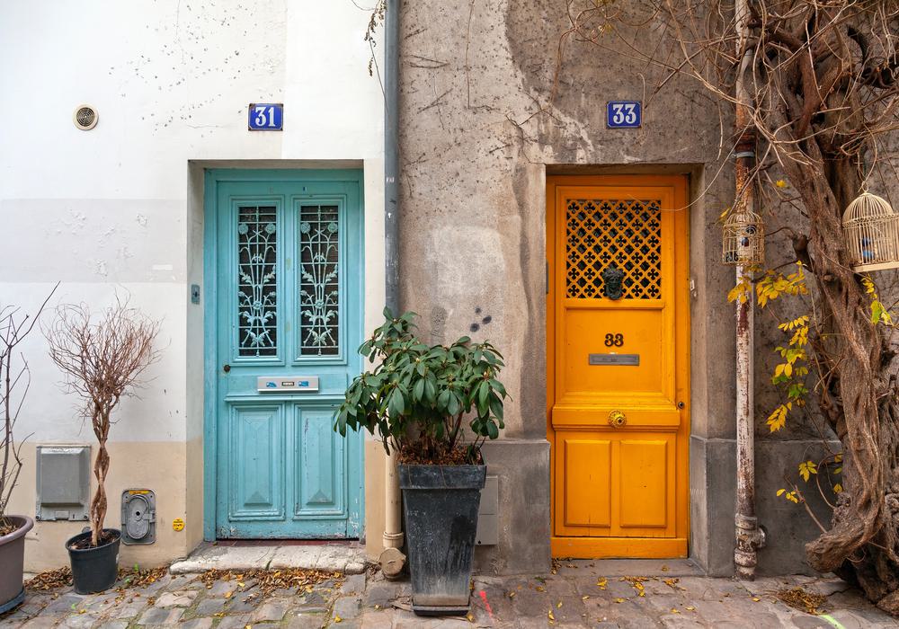 An exploration of duality, where vibrant turquoise and warm saffron doors stand side by side, separated by only a wall, each telling its own story of mystery and contrast amidst gentle growth.