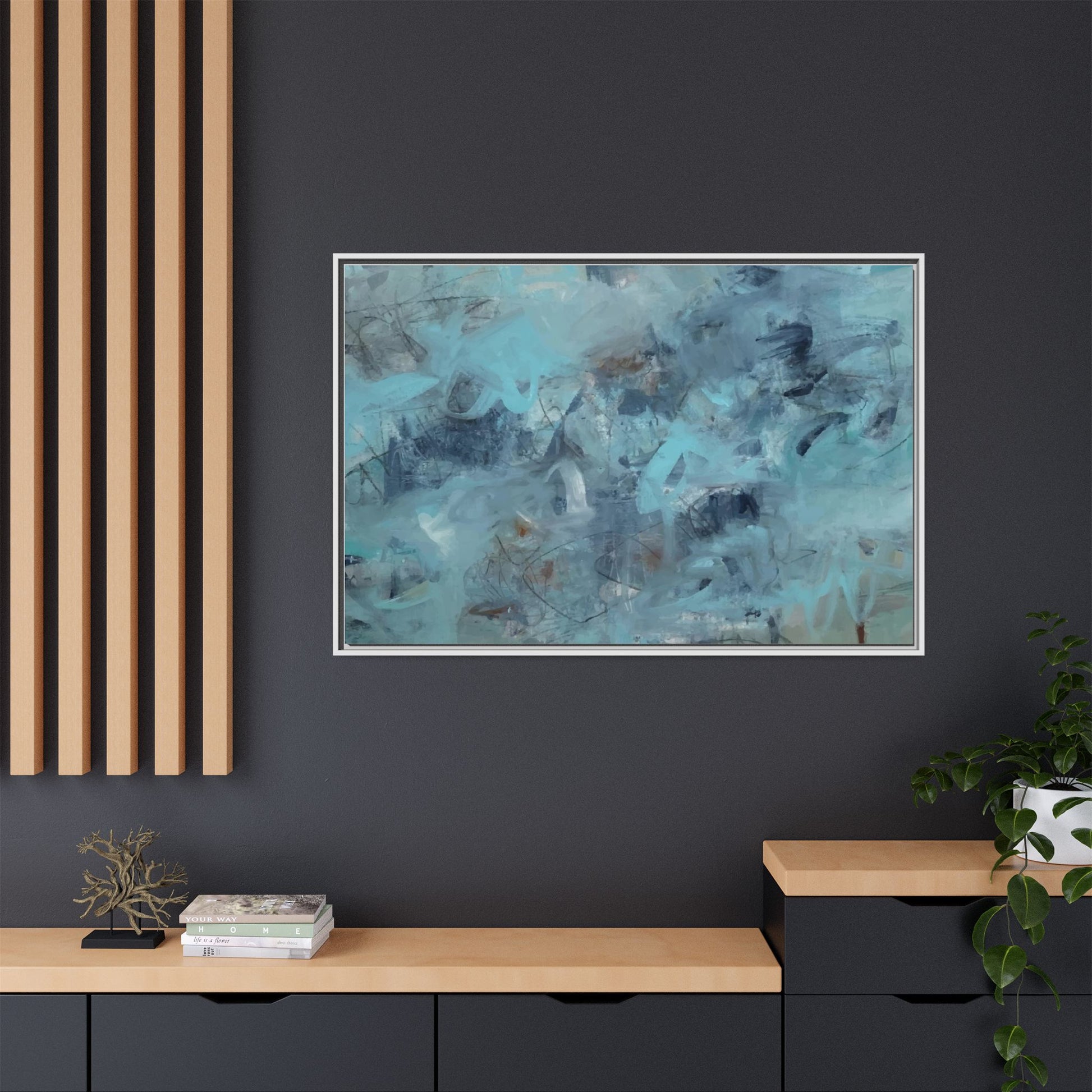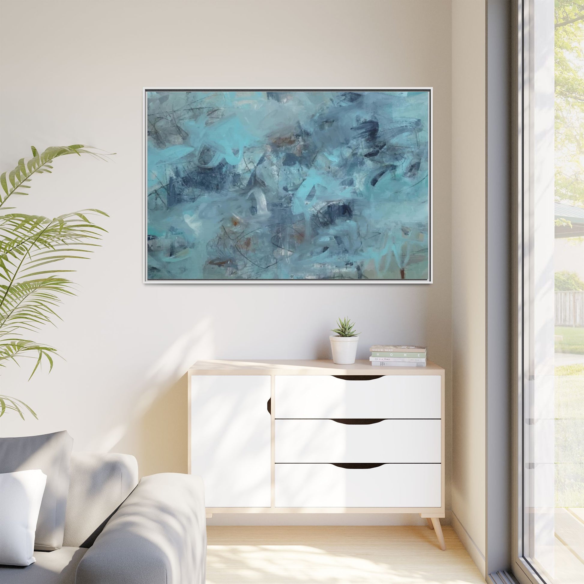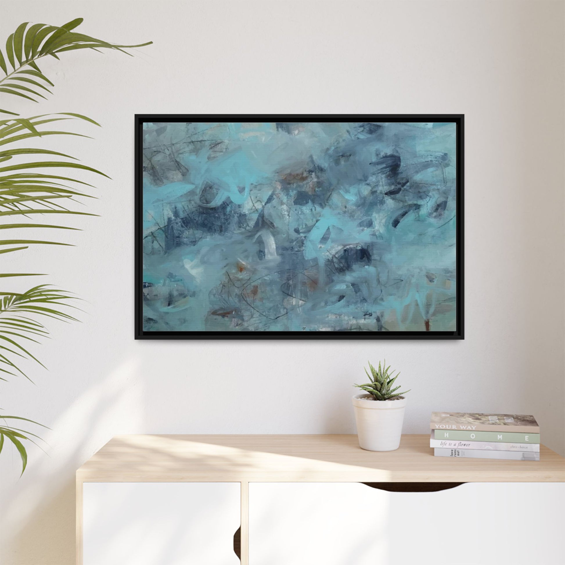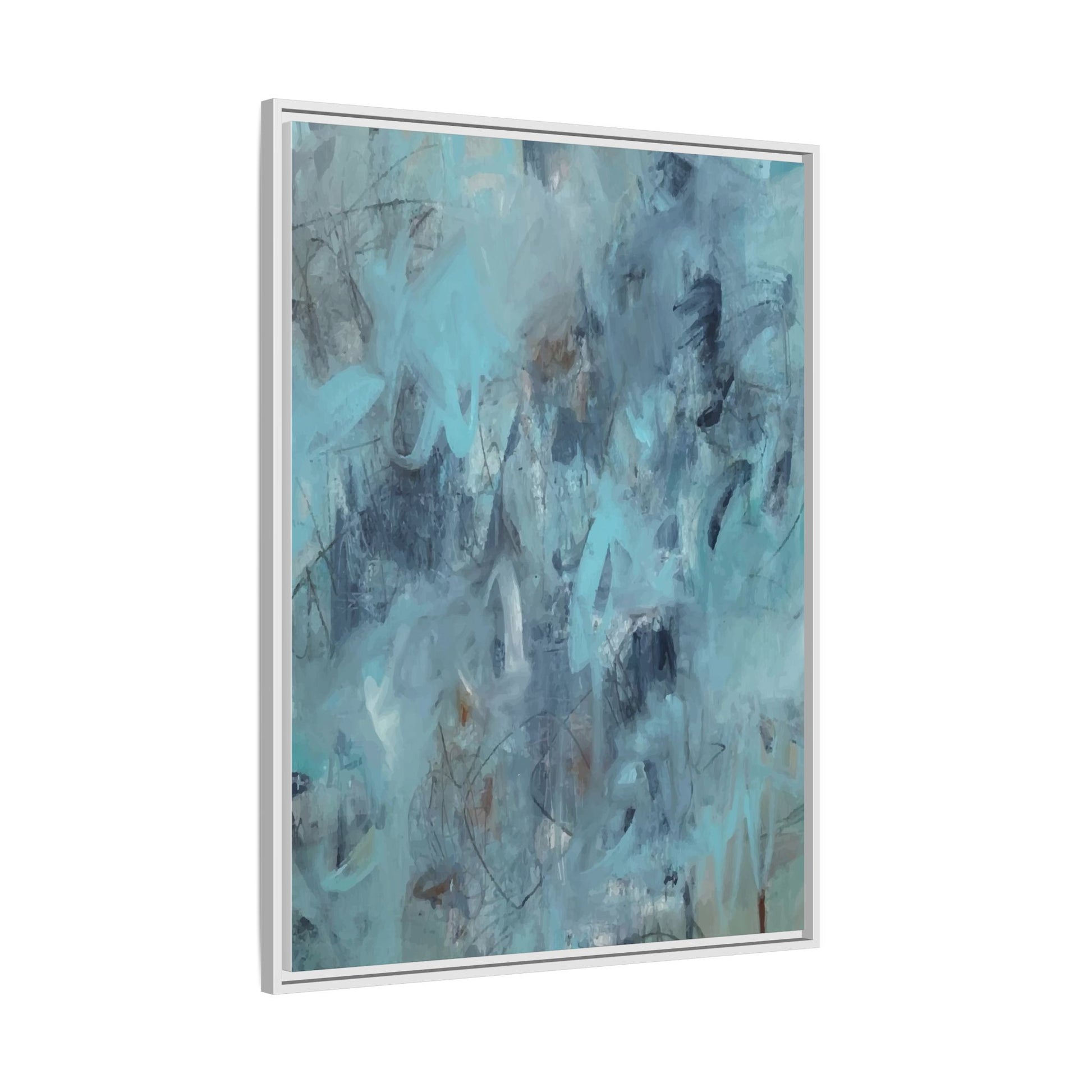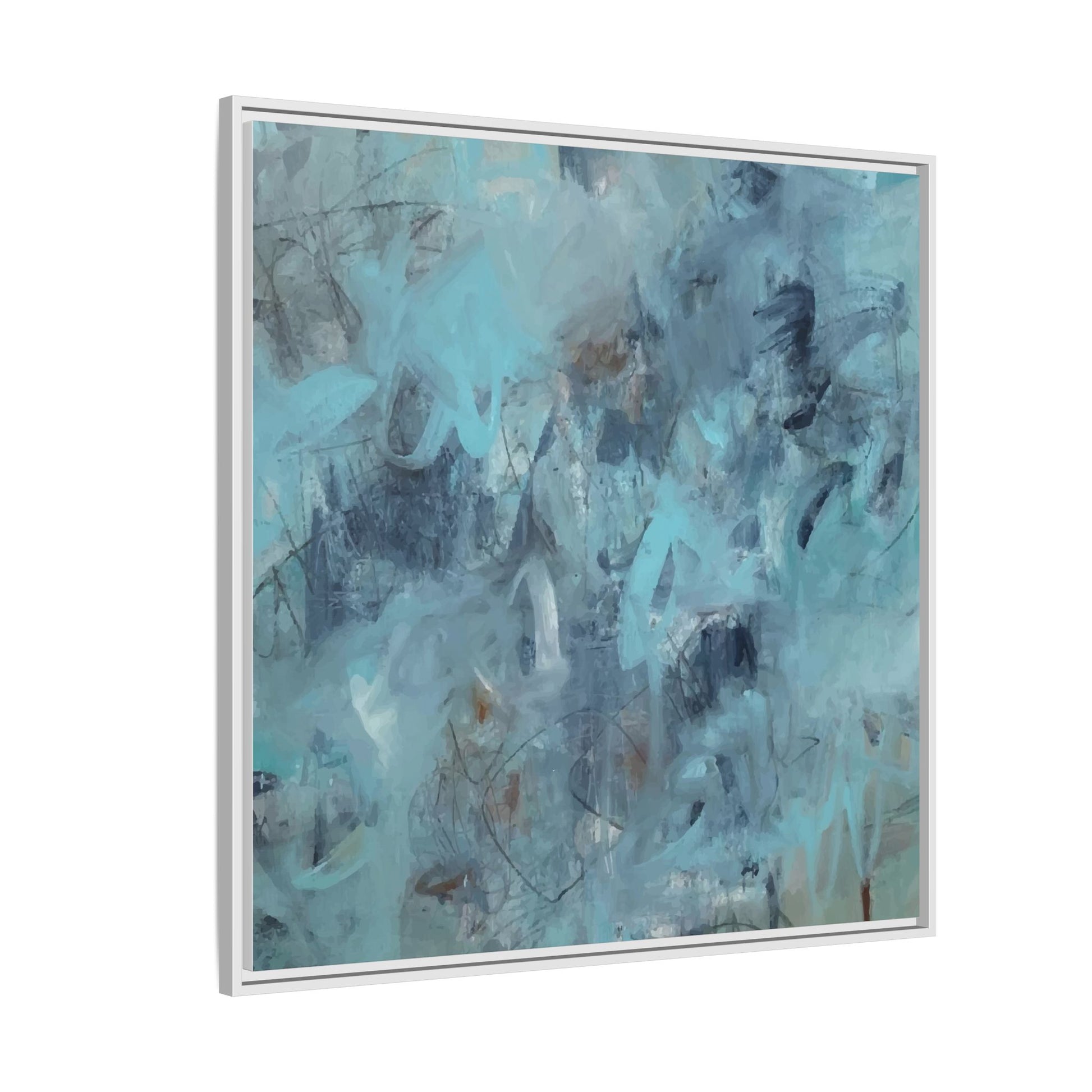 This abstract art piece is a mesmerizing composition in shades of blue, teal, and gray, creating a dreamlike and ethereal landscape. The painting features fluid, organic shapes and textured brushstrokes that overlap and intertwine, generating a sense of movement and depth. Soft, translucent layers of paint create a sense of atmosphere, with darker navy and slate blue tones contrasting against lighter aquamarine and white highlights. Gestural marks and linear elements weave through the composition, adding dynamic energy and visual complexity to the artwork. The overall effect is contemplative and reminiscent of a misty seascape or an abstract interpretation of natural phenomena like clouds, water, or geological formations.