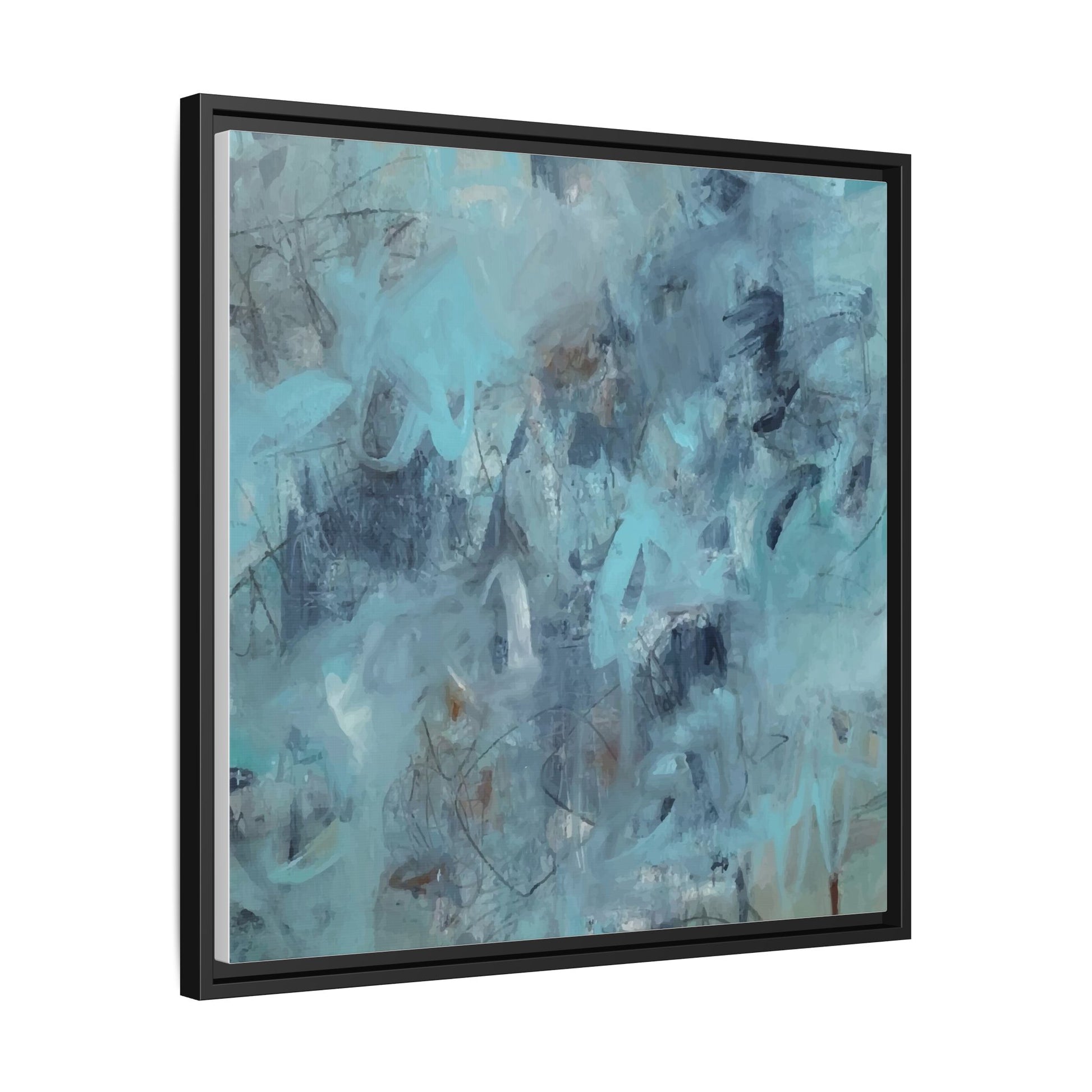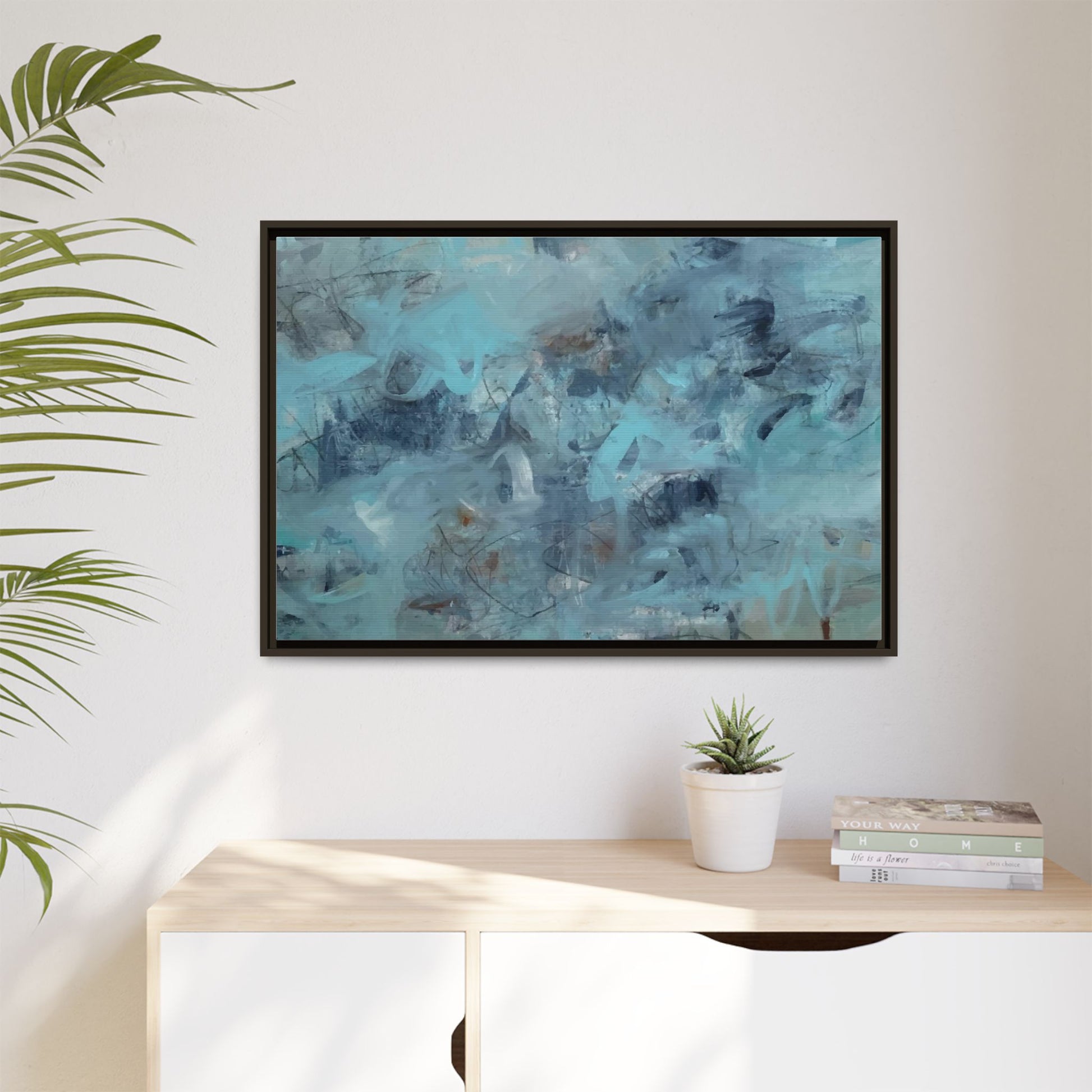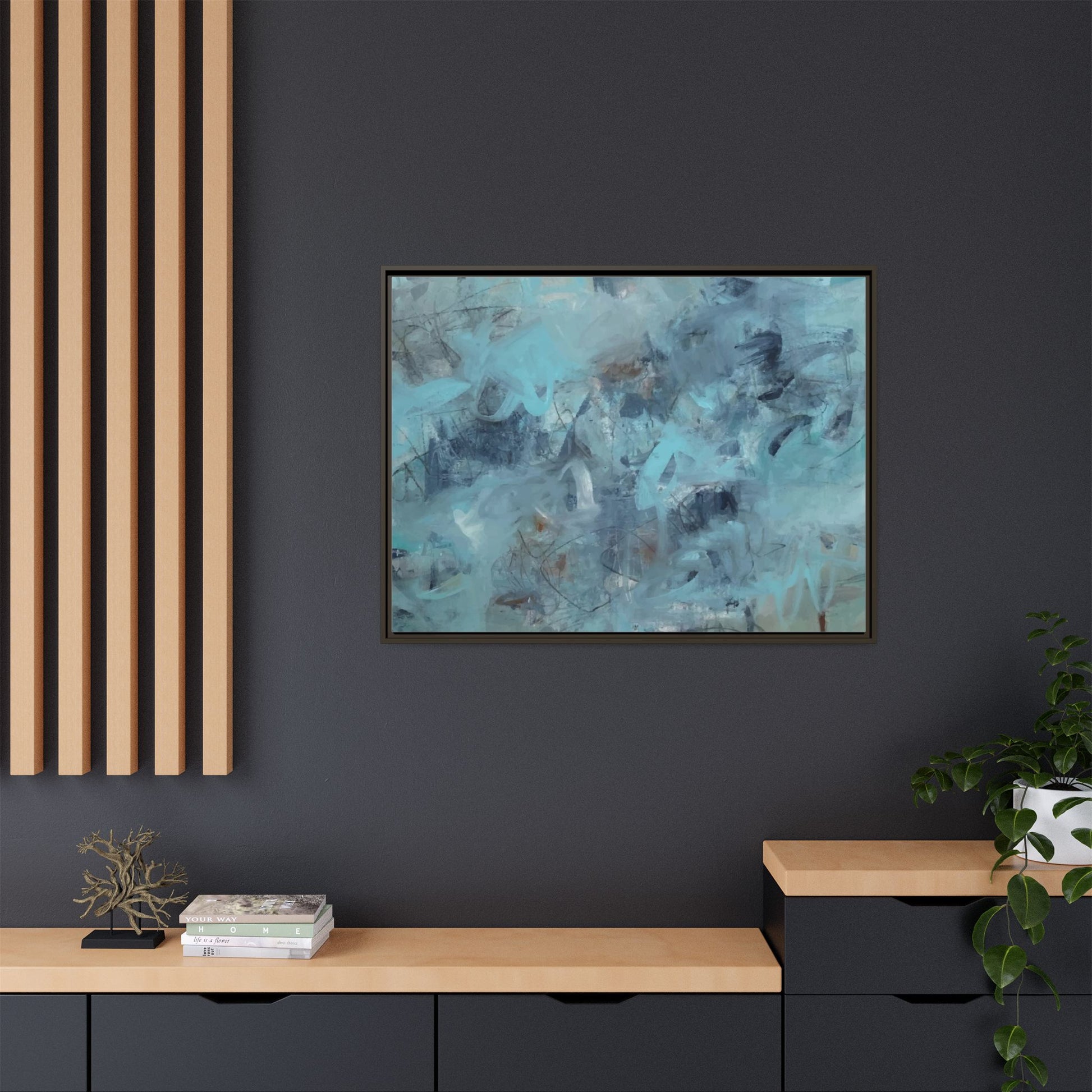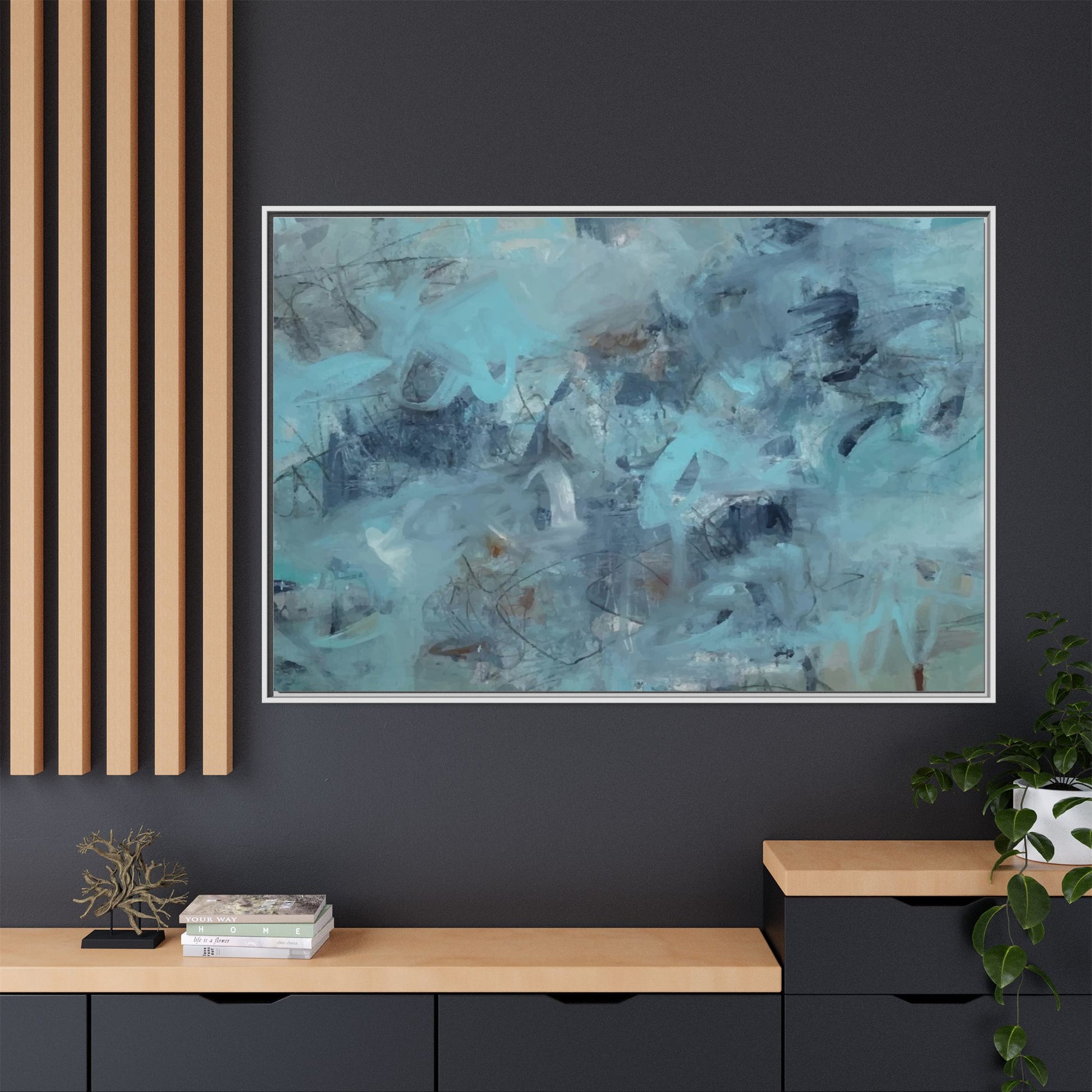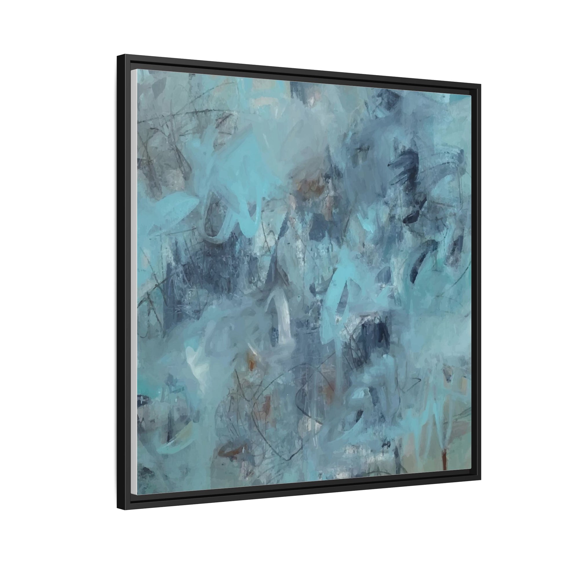 This abstract art piece is a mesmerizing composition in shades of blue, teal, and gray, creating a dreamlike and ethereal landscape. The painting features fluid, organic shapes and textured brushstrokes that overlap and intertwine, generating a sense of movement and depth. Soft, translucent layers of paint create a sense of atmosphere, with darker navy and slate blue tones contrasting against lighter aquamarine and white highlights. Gestural marks and linear elements weave through the composition, adding dynamic energy and visual complexity to the artwork. The overall effect is contemplative and reminiscent of a misty seascape or an abstract interpretation of natural phenomena like clouds, water, or geological formations.