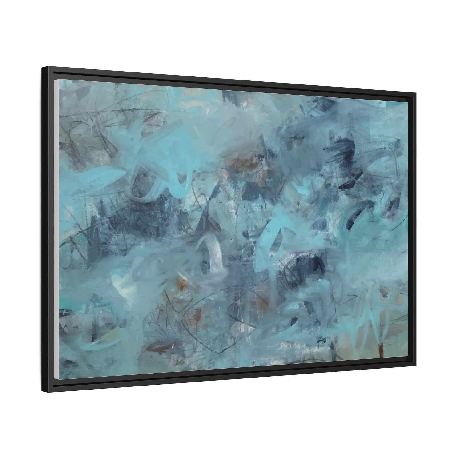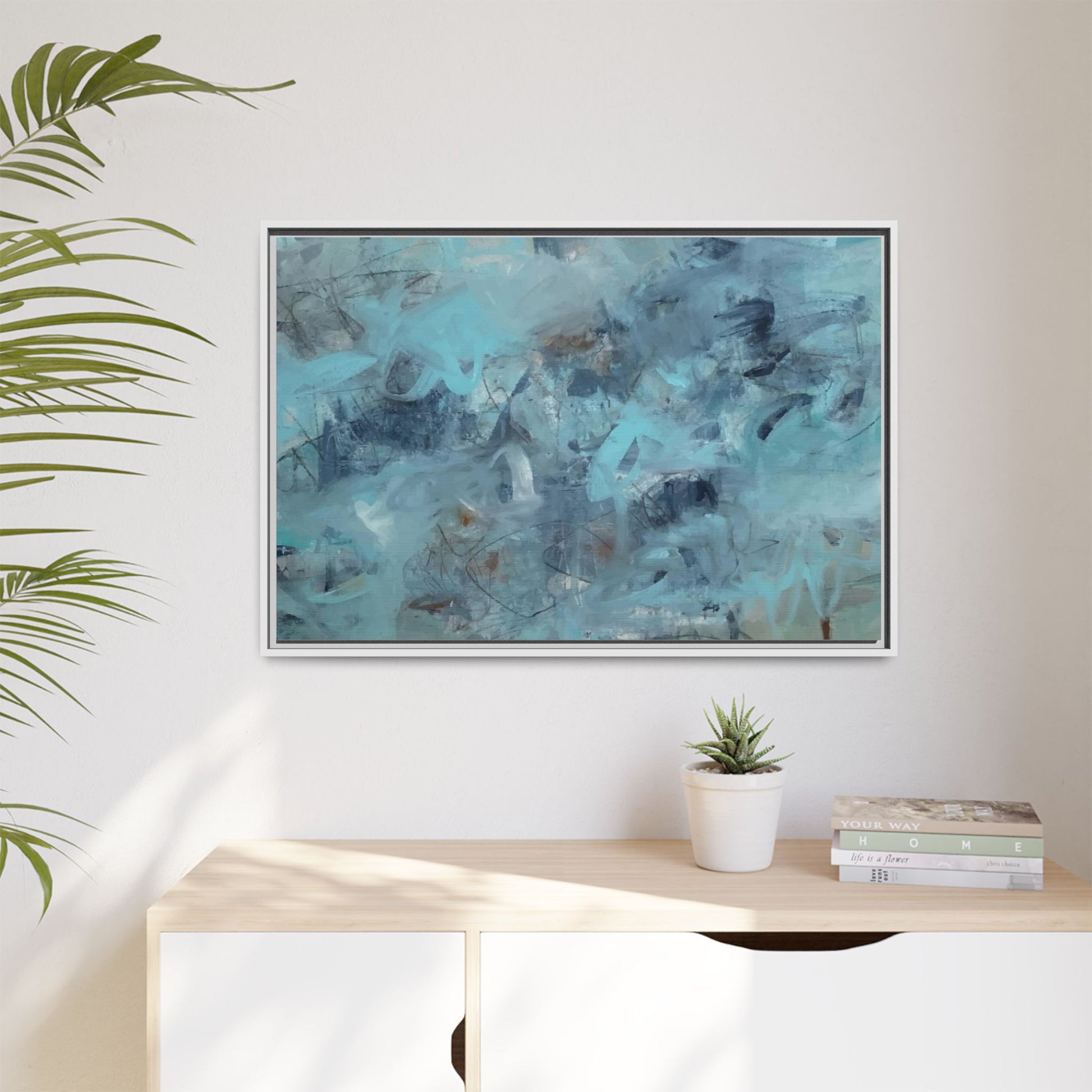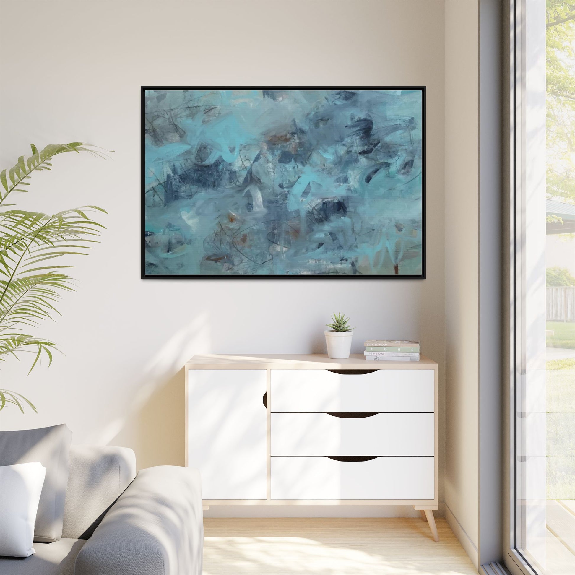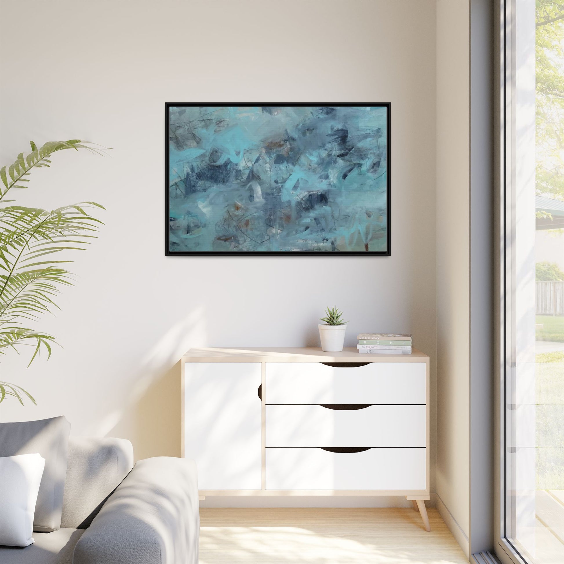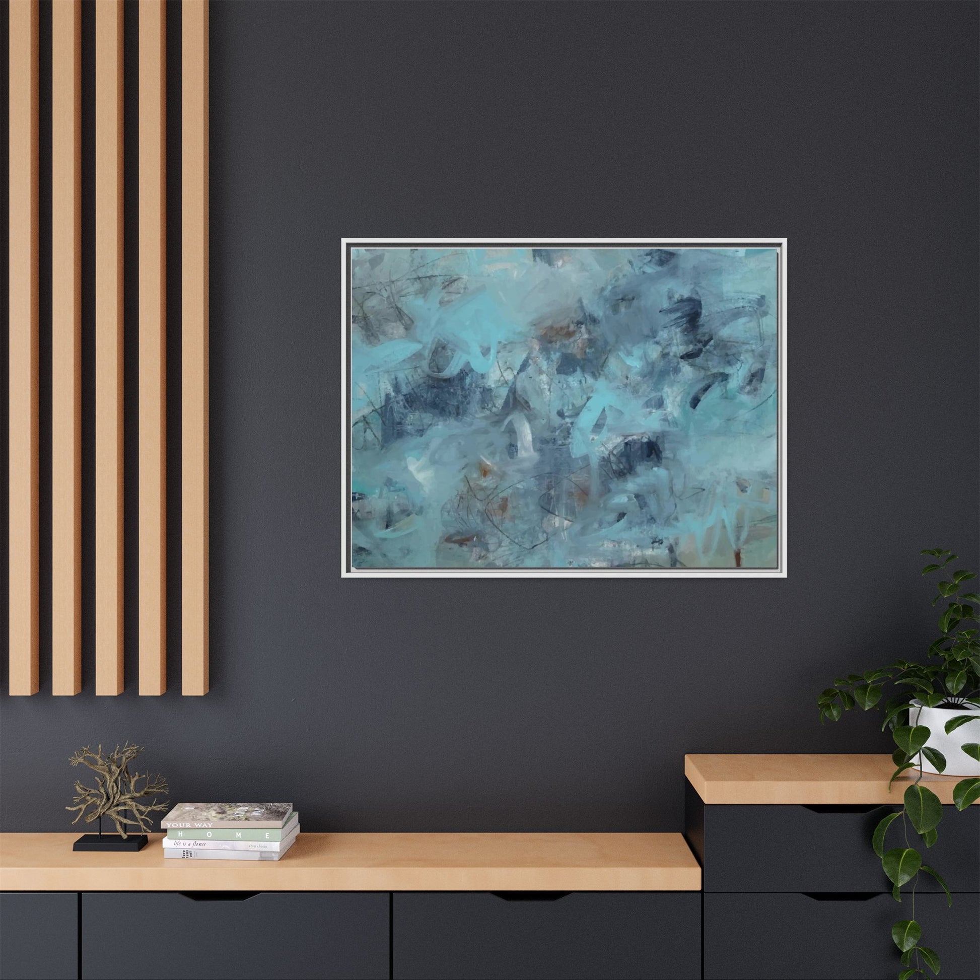 This abstract art piece is a mesmerizing composition in shades of blue, teal, and gray, creating a dreamlike and ethereal landscape. The painting features fluid, organic shapes and textured brushstrokes that overlap and intertwine, generating a sense of movement and depth. Soft, translucent layers of paint create a sense of atmosphere, with darker navy and slate blue tones contrasting against lighter aquamarine and white highlights. Gestural marks and linear elements weave through the composition, adding dynamic energy and visual complexity to the artwork. The overall effect is contemplative and reminiscent of a misty seascape or an abstract interpretation of natural phenomena like clouds, water, or geological formations.
