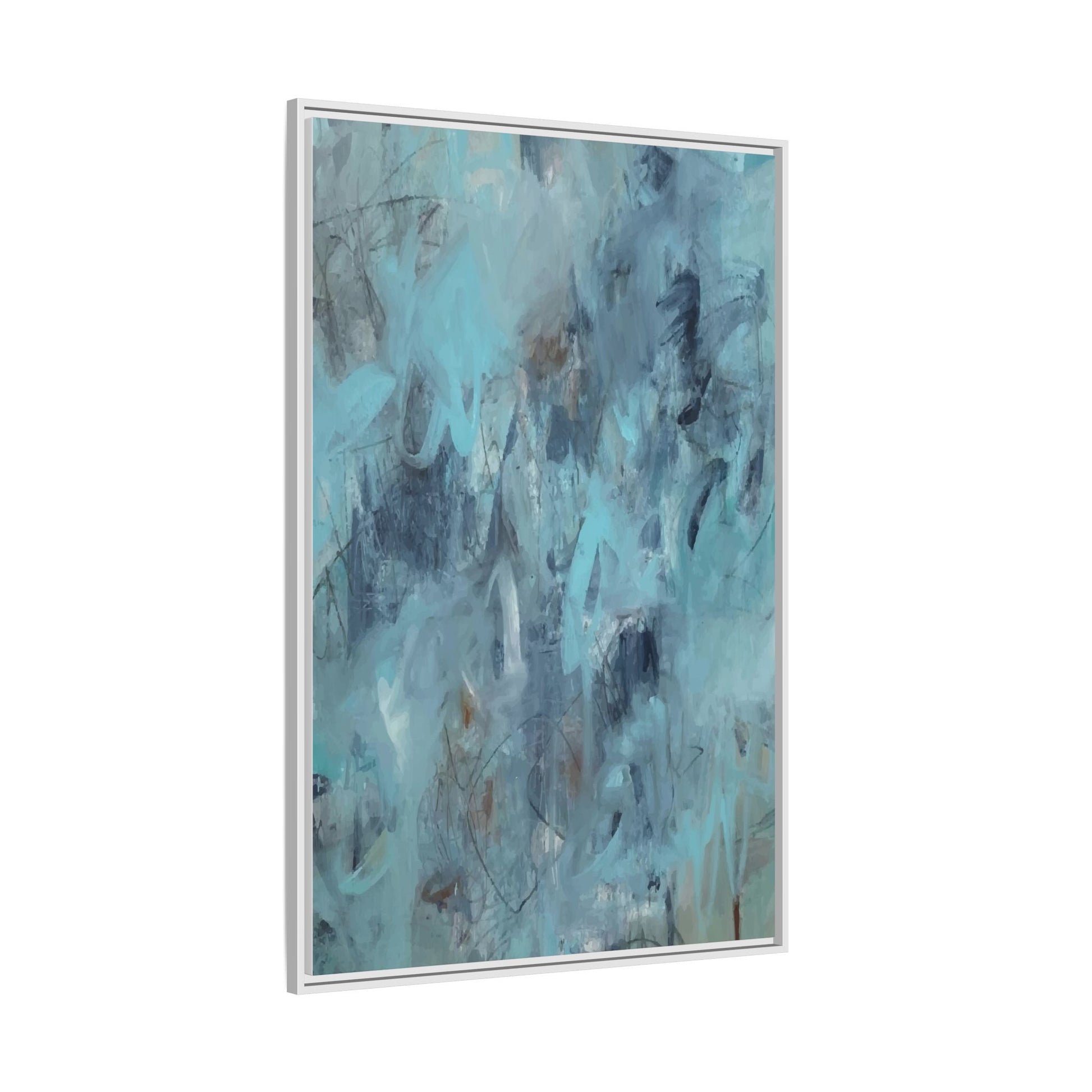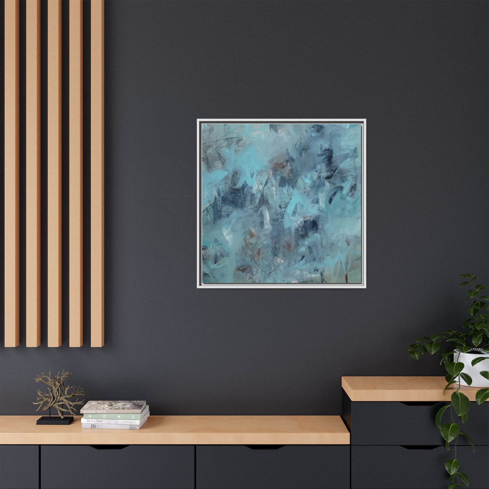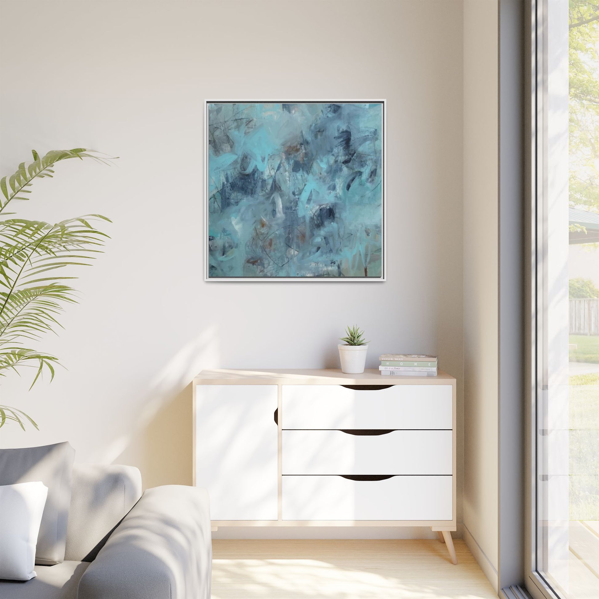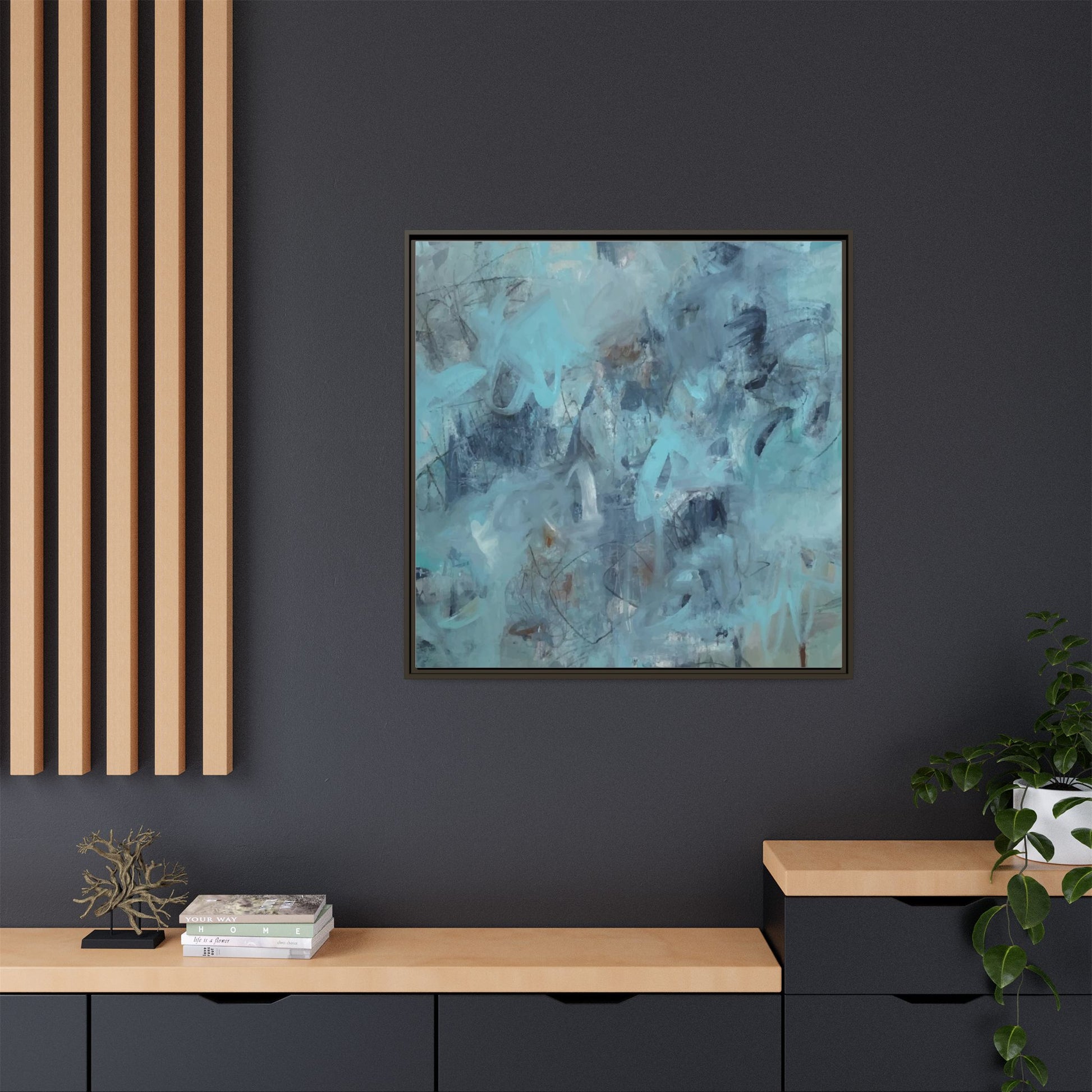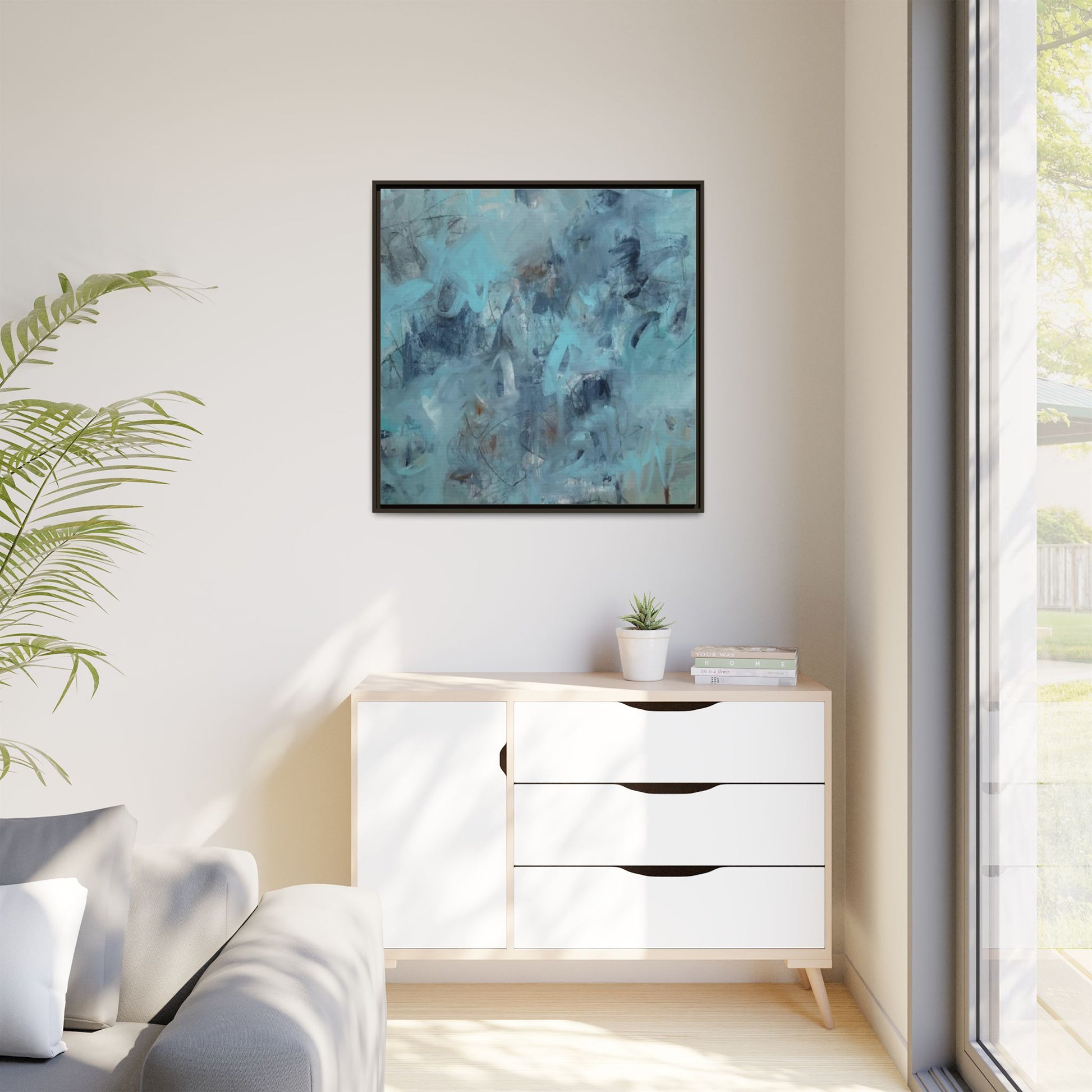 This abstract art piece is a mesmerizing composition in shades of blue, teal, and gray, creating a dreamlike and ethereal landscape. The painting features fluid, organic shapes and textured brushstrokes that overlap and intertwine, generating a sense of movement and depth. Soft, translucent layers of paint create a sense of atmosphere, with darker navy and slate blue tones contrasting against lighter aquamarine and white highlights. Gestural marks and linear elements weave through the composition, adding dynamic energy and visual complexity to the artwork. The overall effect is contemplative and reminiscent of a misty seascape or an abstract interpretation of natural phenomena like clouds, water, or geological formations.