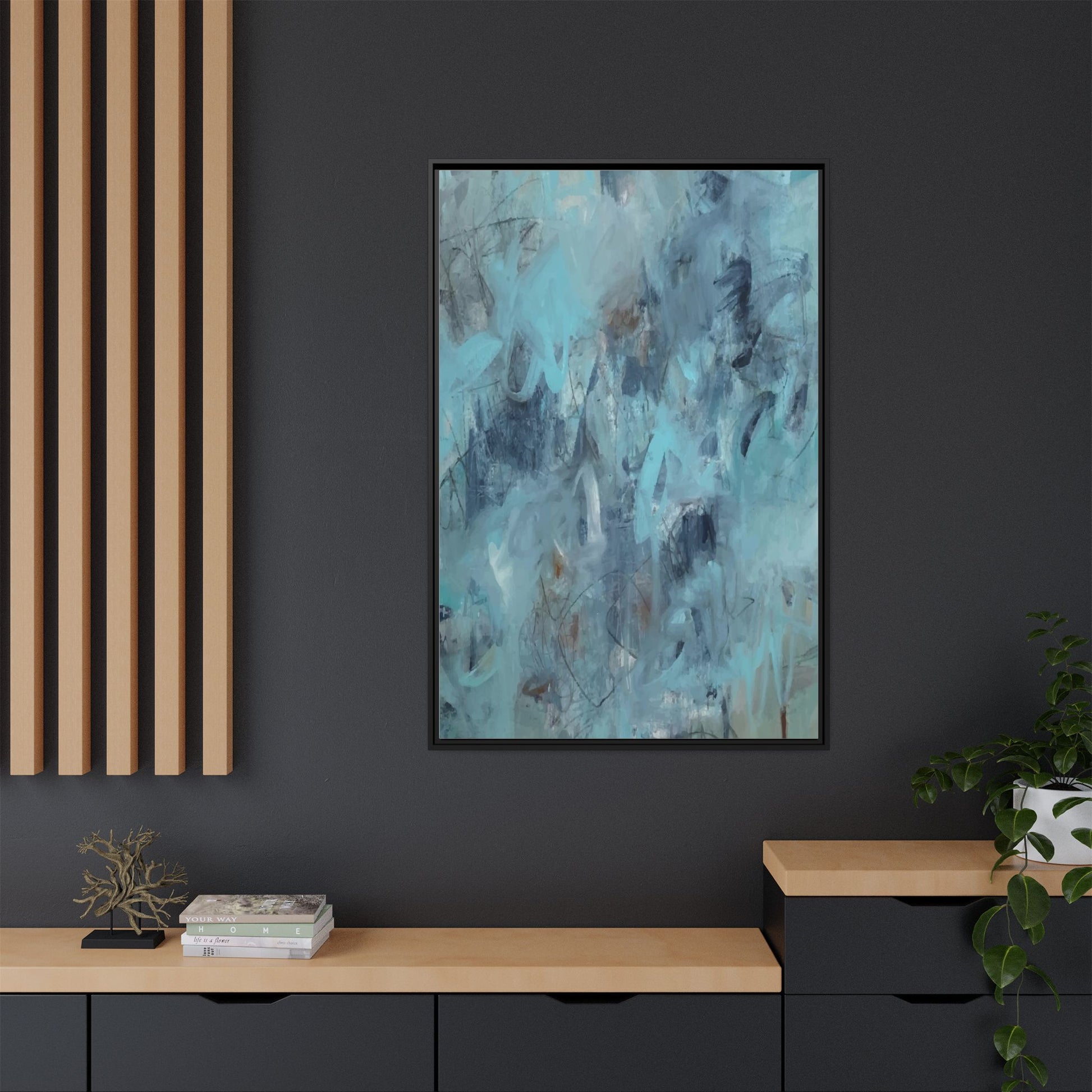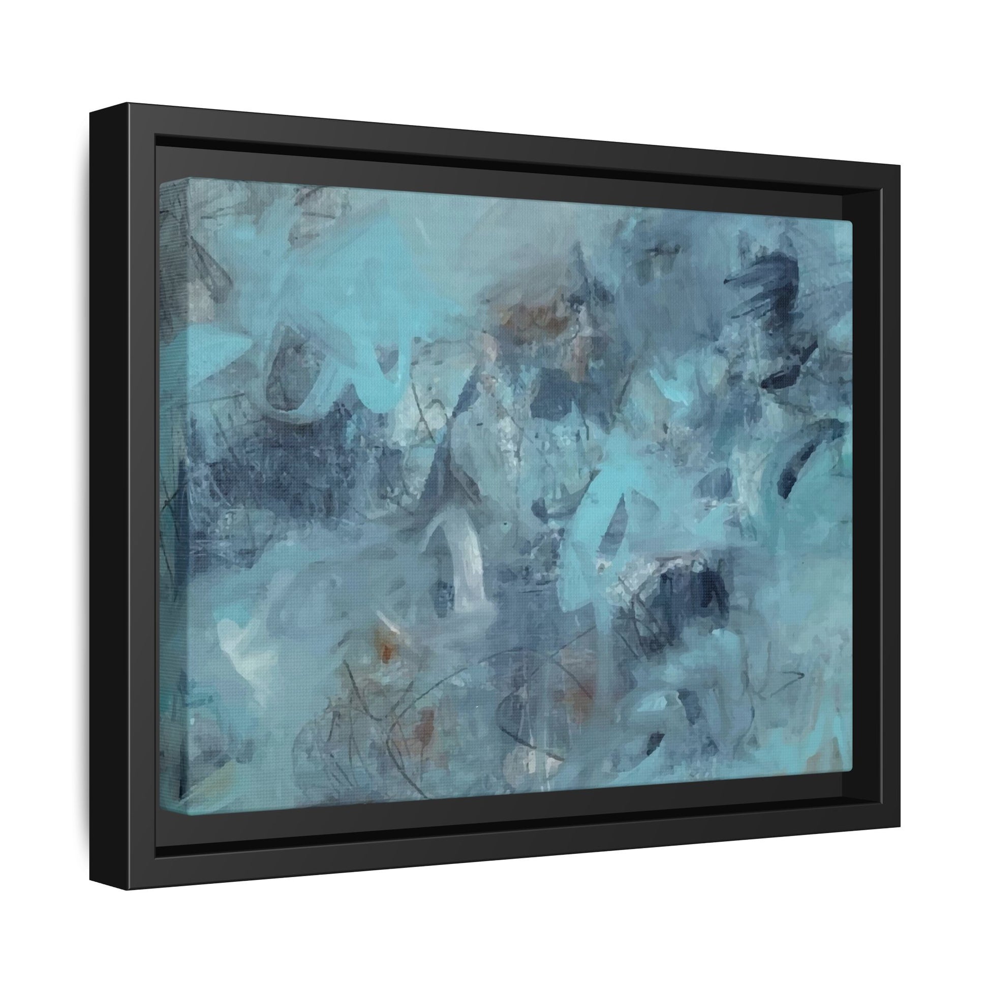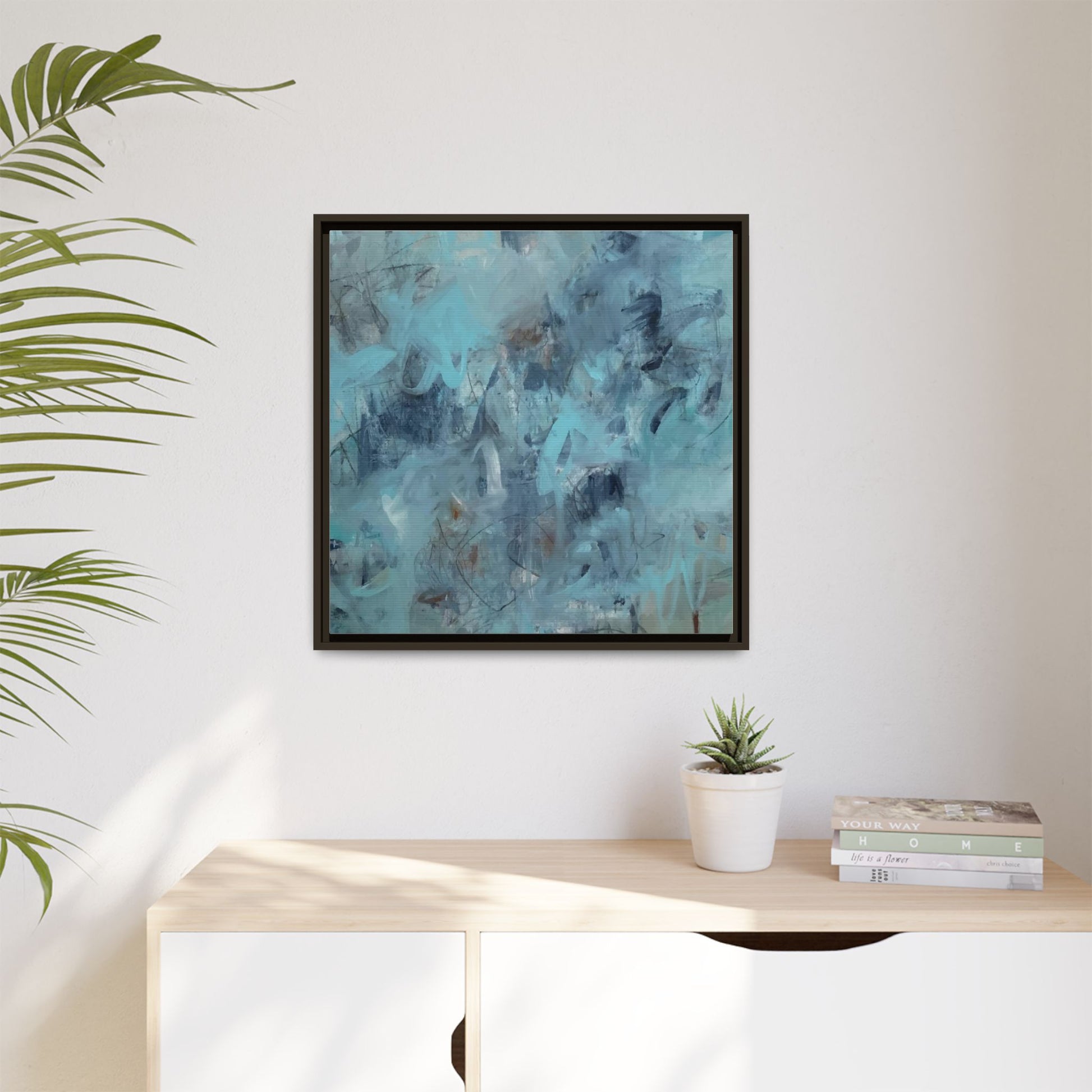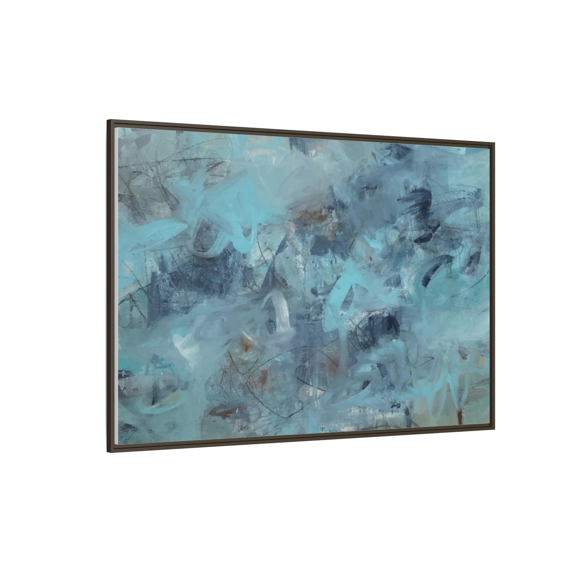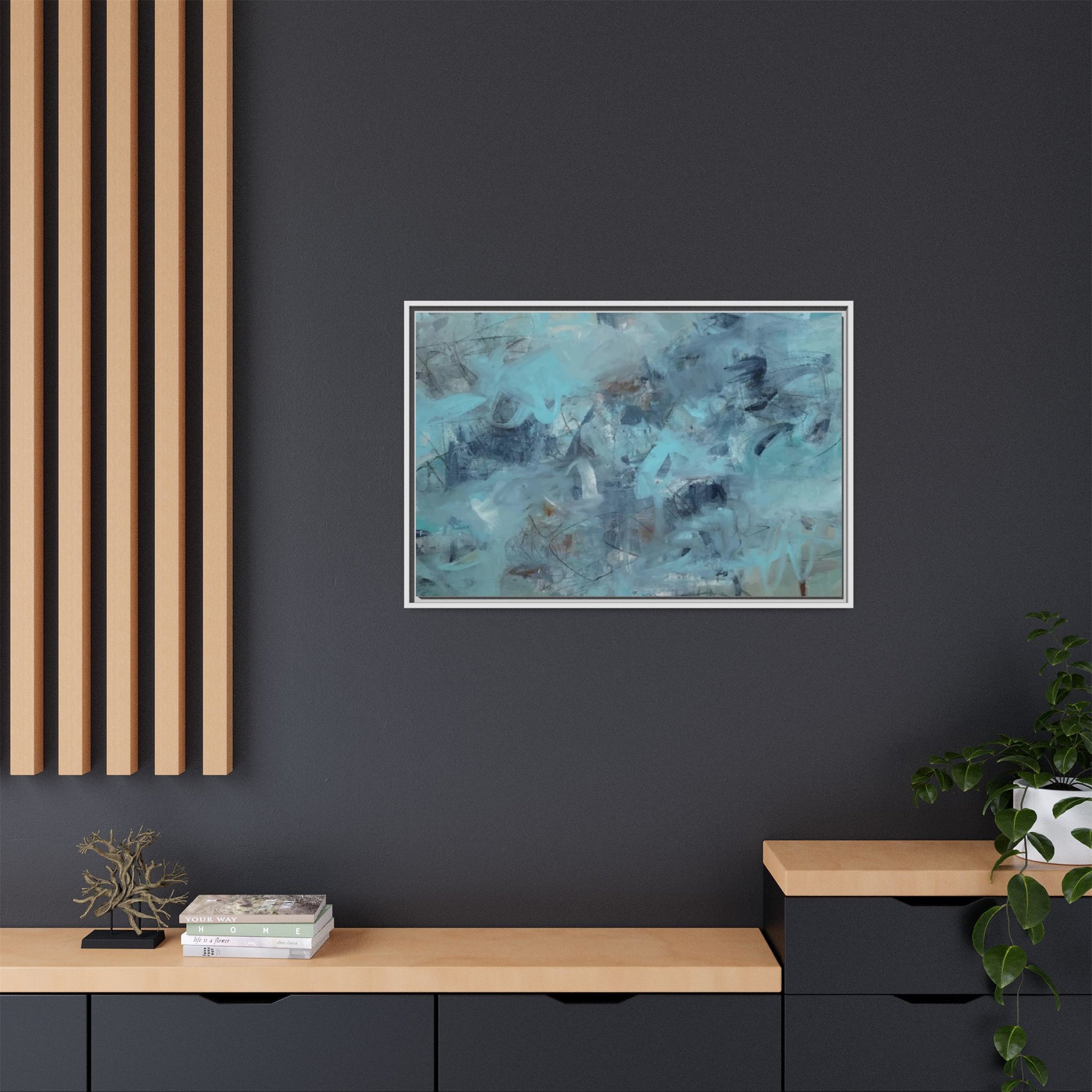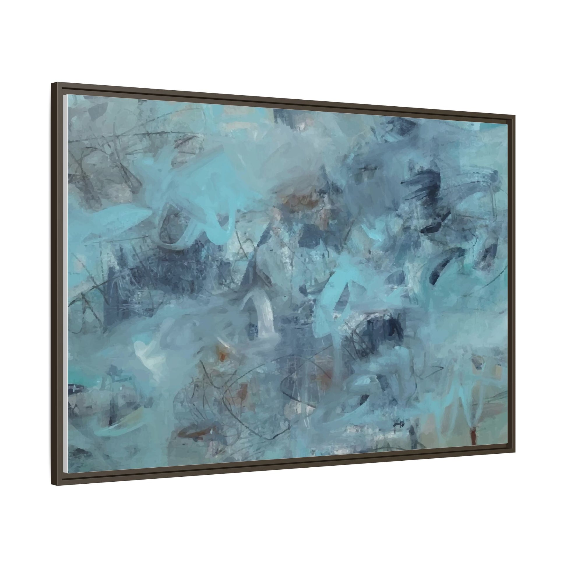 This abstract art piece is a mesmerizing composition in shades of blue, teal, and gray, creating a dreamlike and ethereal landscape. The painting features fluid, organic shapes and textured brushstrokes that overlap and intertwine, generating a sense of movement and depth. Soft, translucent layers of paint create a sense of atmosphere, with darker navy and slate blue tones contrasting against lighter aquamarine and white highlights. Gestural marks and linear elements weave through the composition, adding dynamic energy and visual complexity to the artwork. The overall effect is contemplative and reminiscent of a misty seascape or an abstract interpretation of natural phenomena like clouds, water, or geological formations.