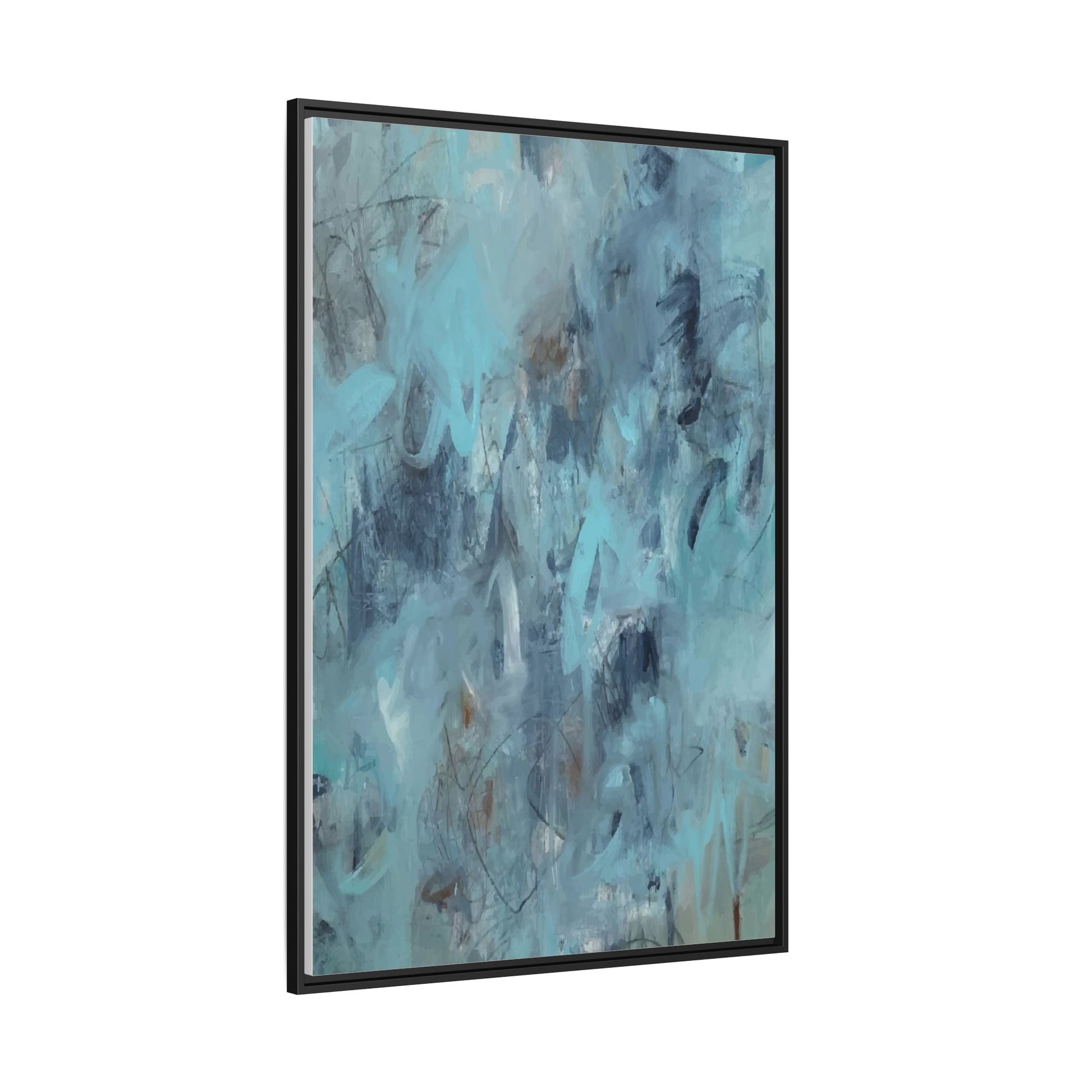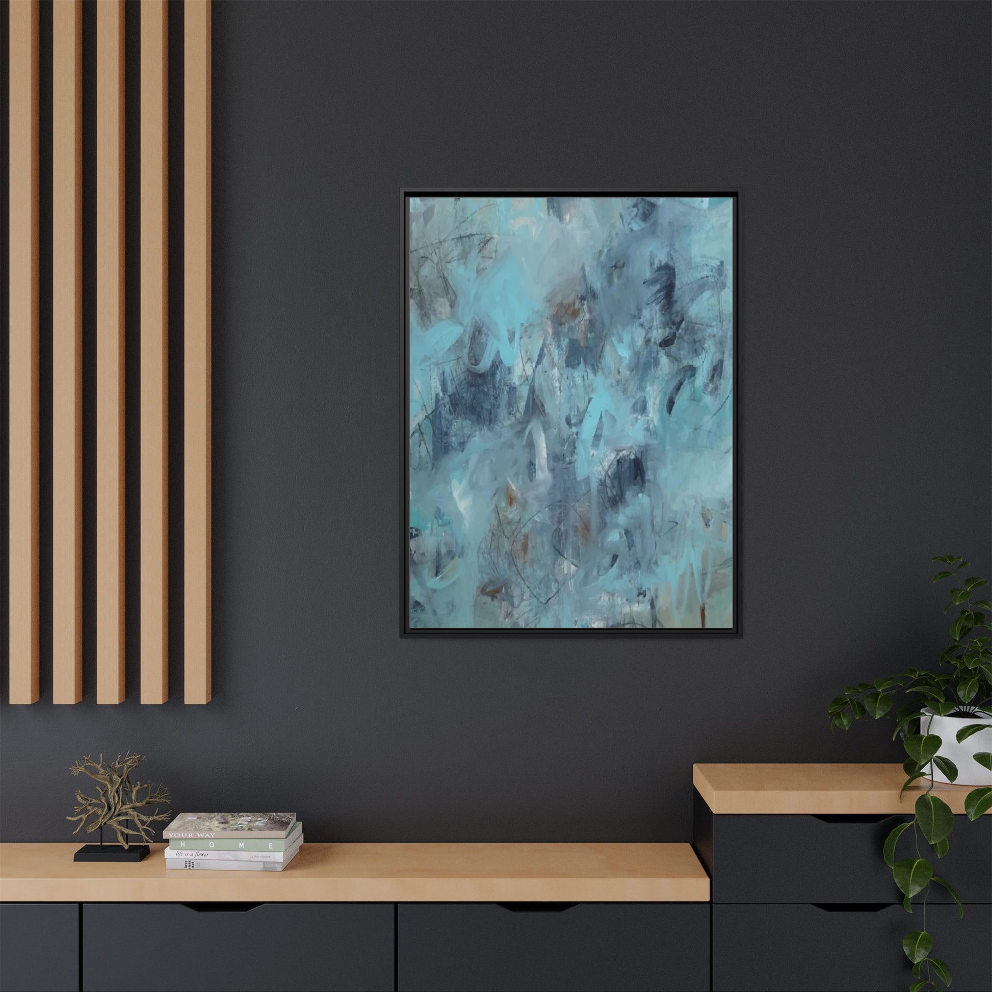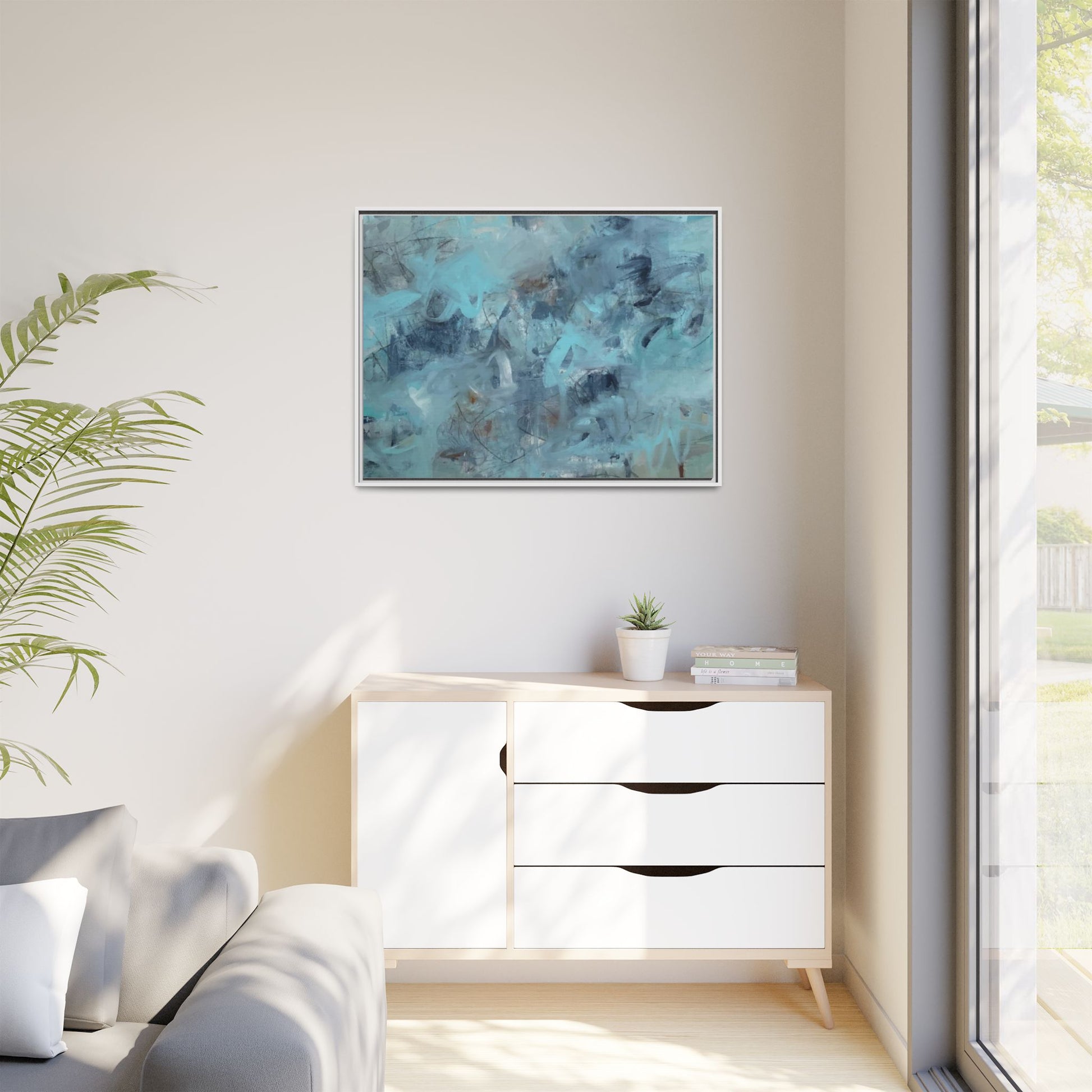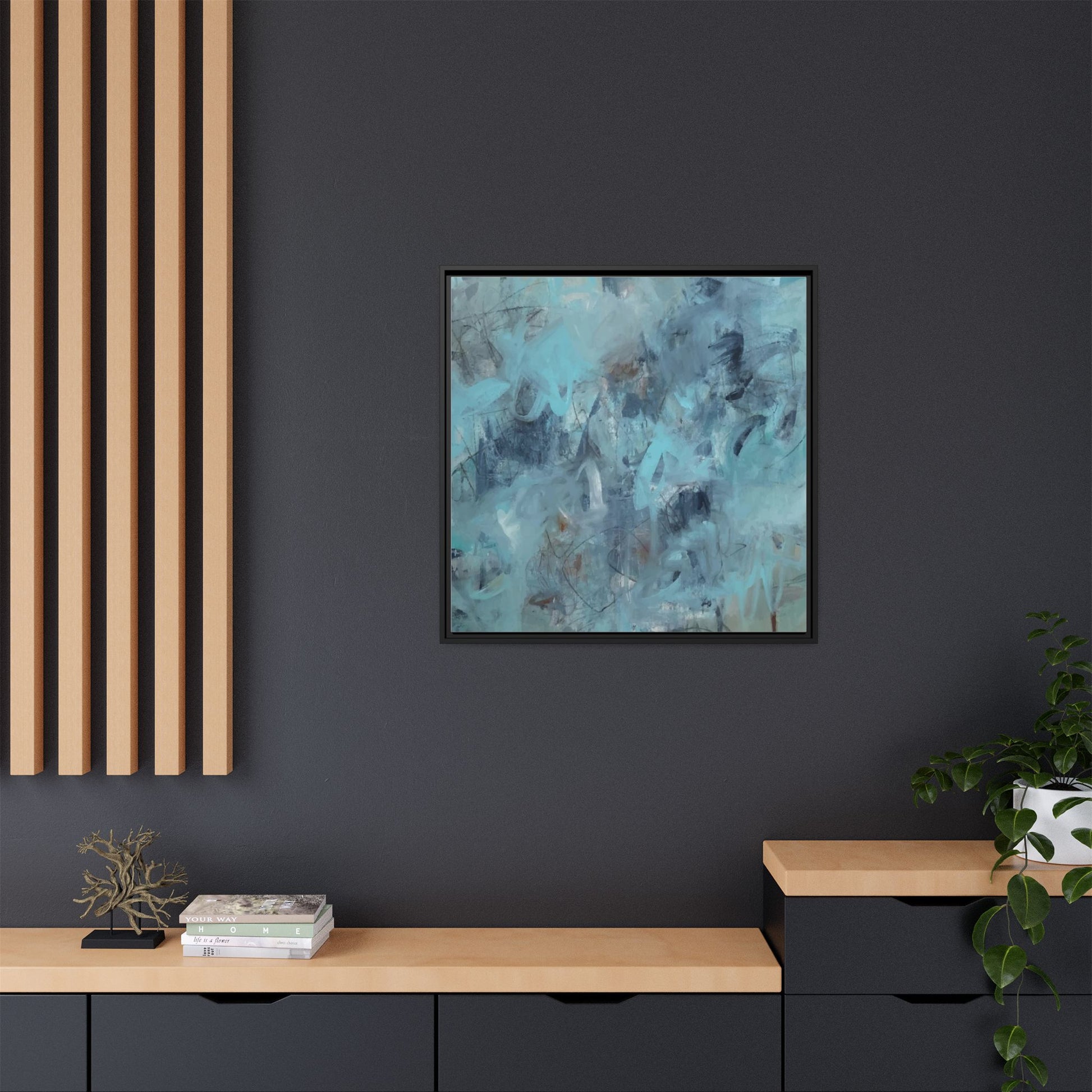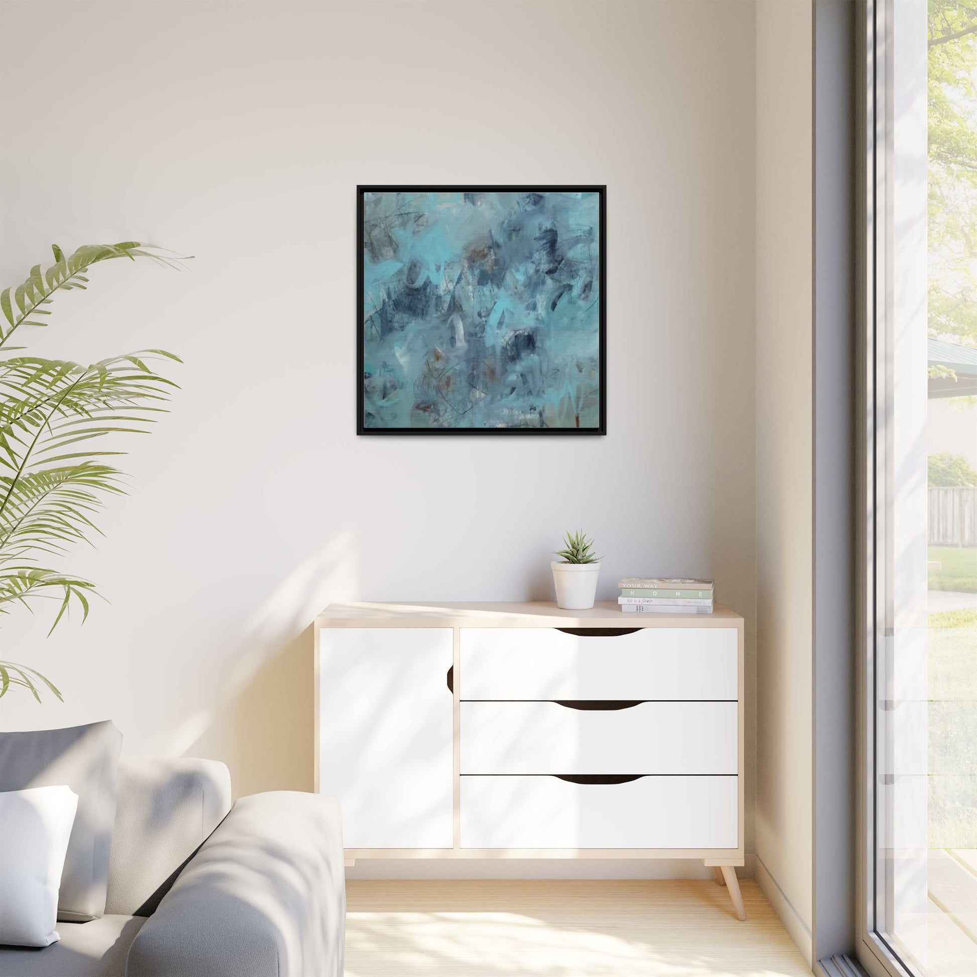 This abstract art piece is a mesmerizing composition in shades of blue, teal, and gray, creating a dreamlike and ethereal landscape. The painting features fluid, organic shapes and textured brushstrokes that overlap and intertwine, generating a sense of movement and depth. Soft, translucent layers of paint create a sense of atmosphere, with darker navy and slate blue tones contrasting against lighter aquamarine and white highlights. Gestural marks and linear elements weave through the composition, adding dynamic energy and visual complexity to the artwork. The overall effect is contemplative and reminiscent of a misty seascape or an abstract interpretation of natural phenomena like clouds, water, or geological formations.
