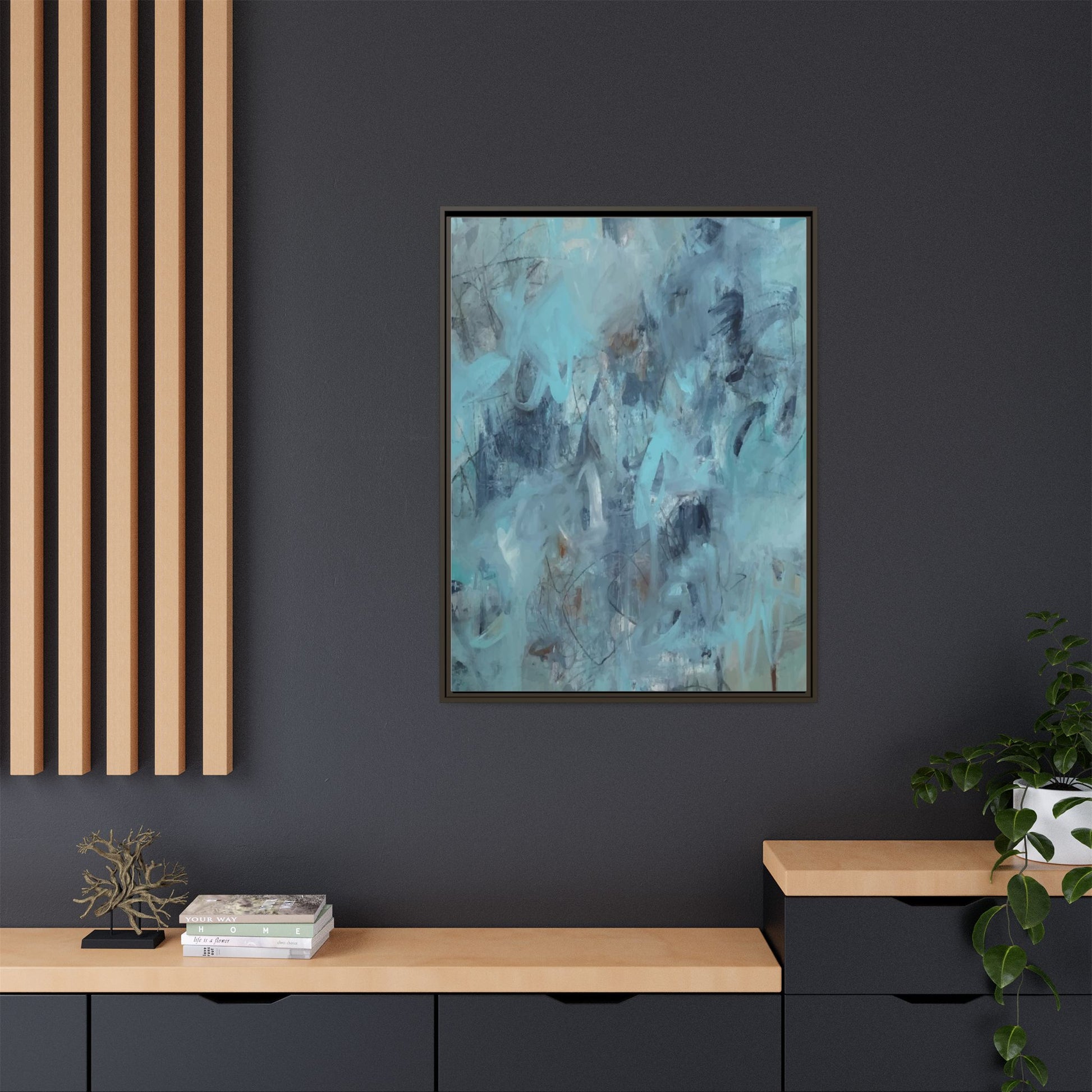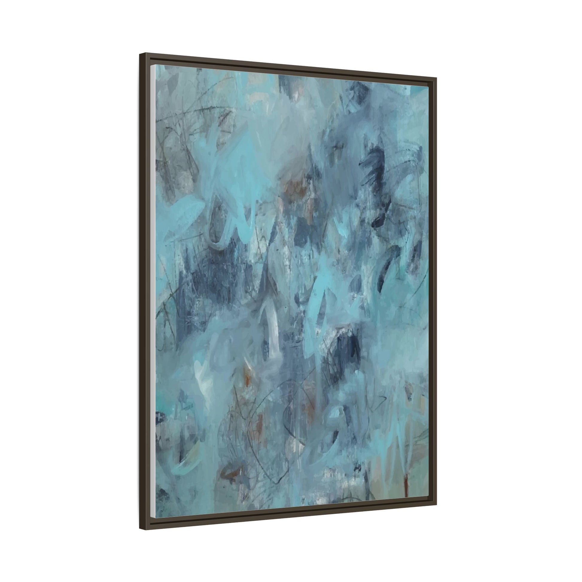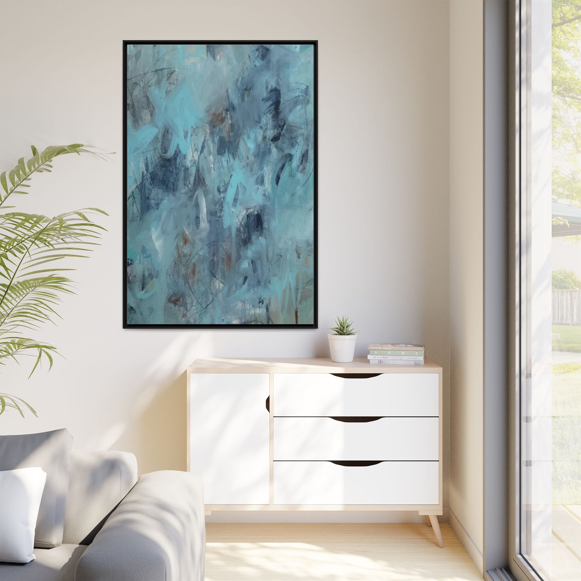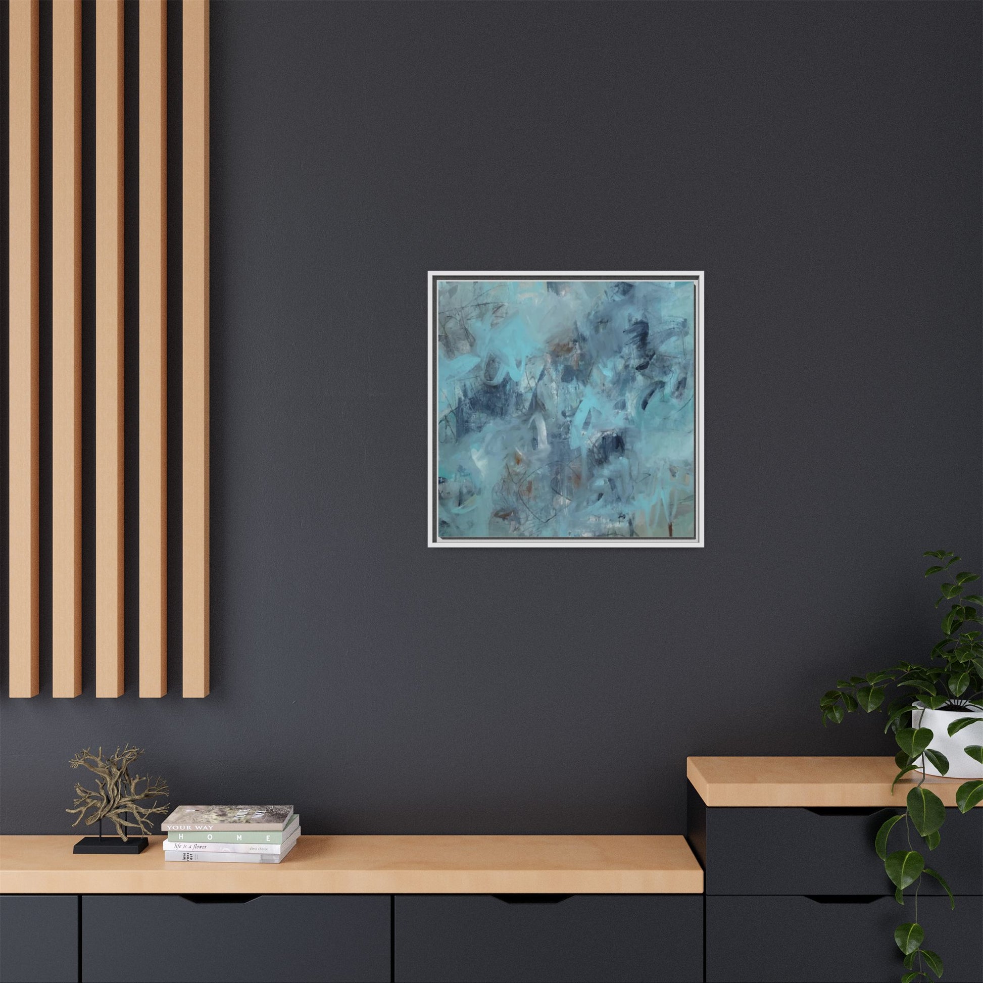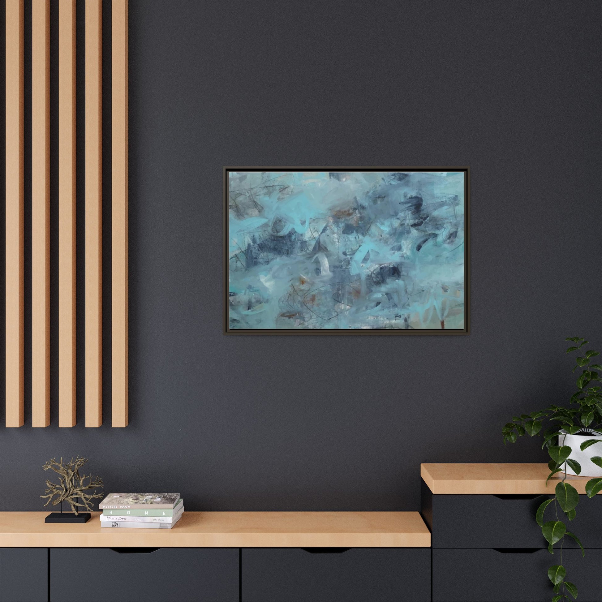 This abstract art piece is a mesmerizing composition in shades of blue, teal, and gray, creating a dreamlike and ethereal landscape. The painting features fluid, organic shapes and textured brushstrokes that overlap and intertwine, generating a sense of movement and depth. Soft, translucent layers of paint create a sense of atmosphere, with darker navy and slate blue tones contrasting against lighter aquamarine and white highlights. Gestural marks and linear elements weave through the composition, adding dynamic energy and visual complexity to the artwork. The overall effect is contemplative and reminiscent of a misty seascape or an abstract interpretation of natural phenomena like clouds, water, or geological formations.