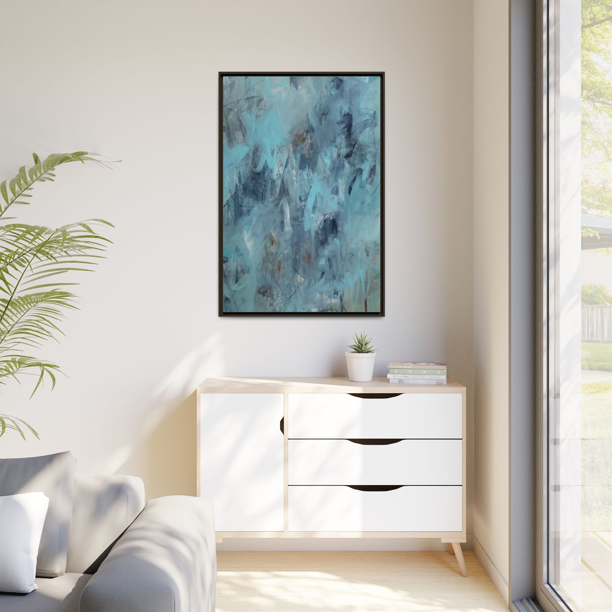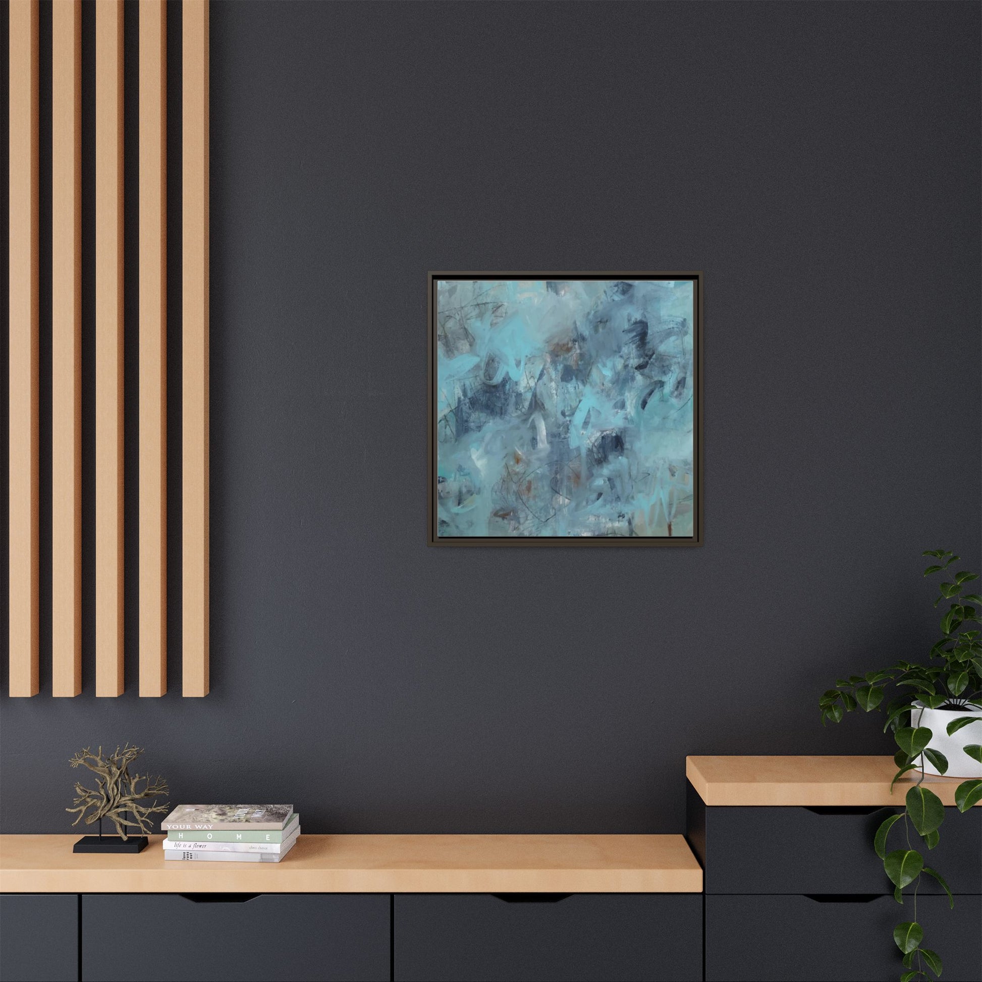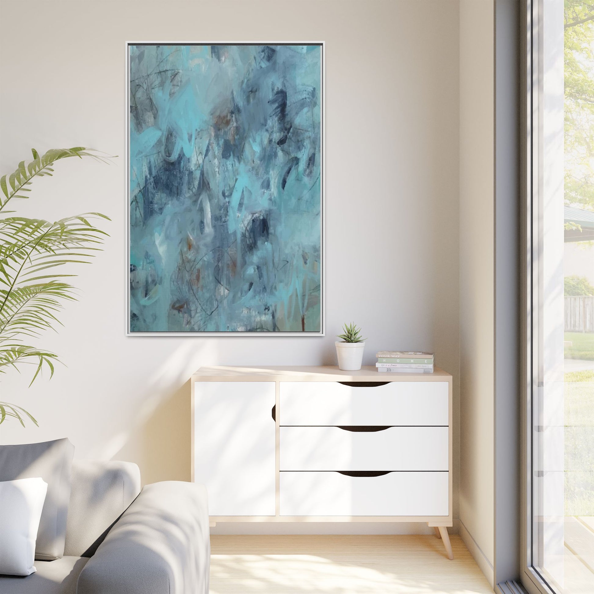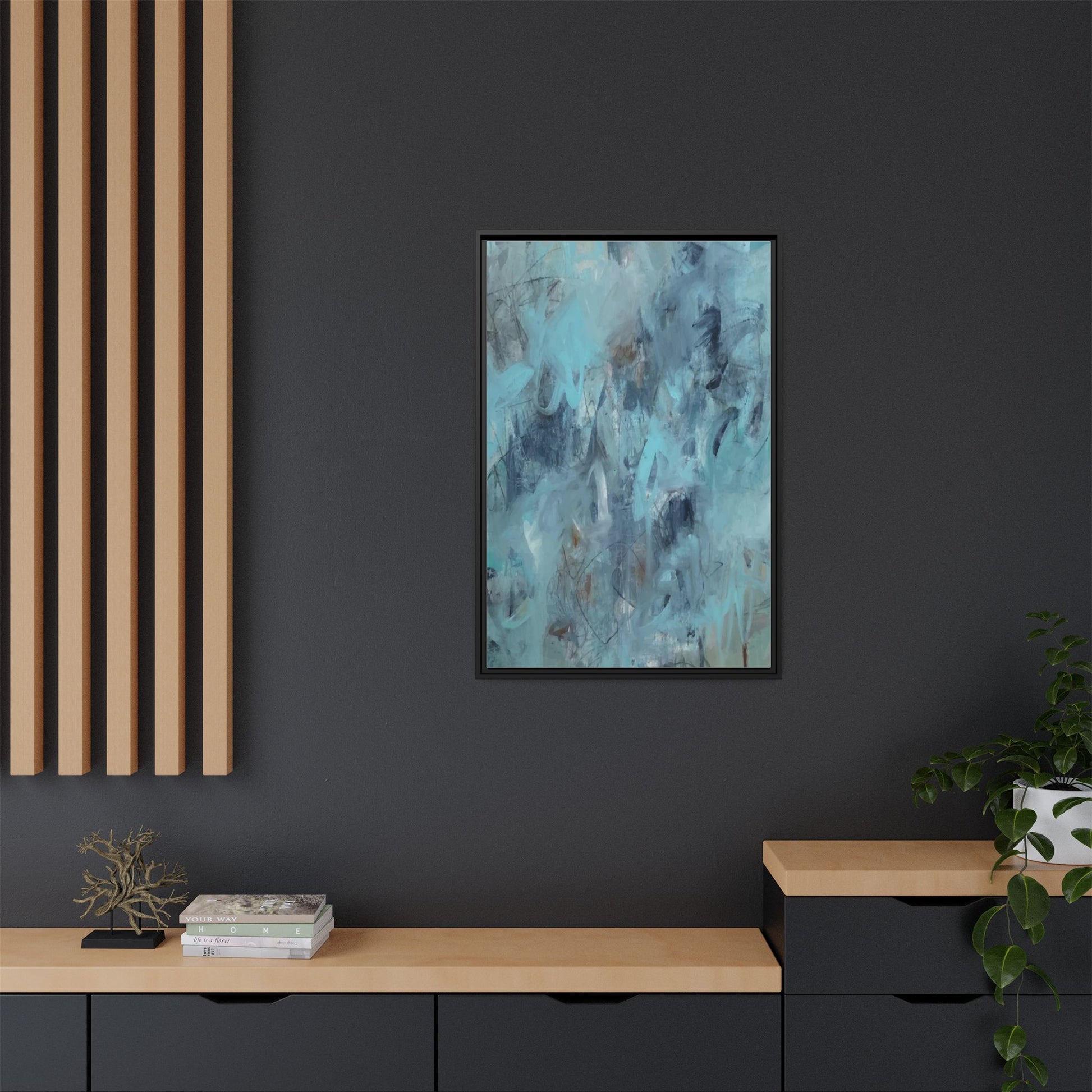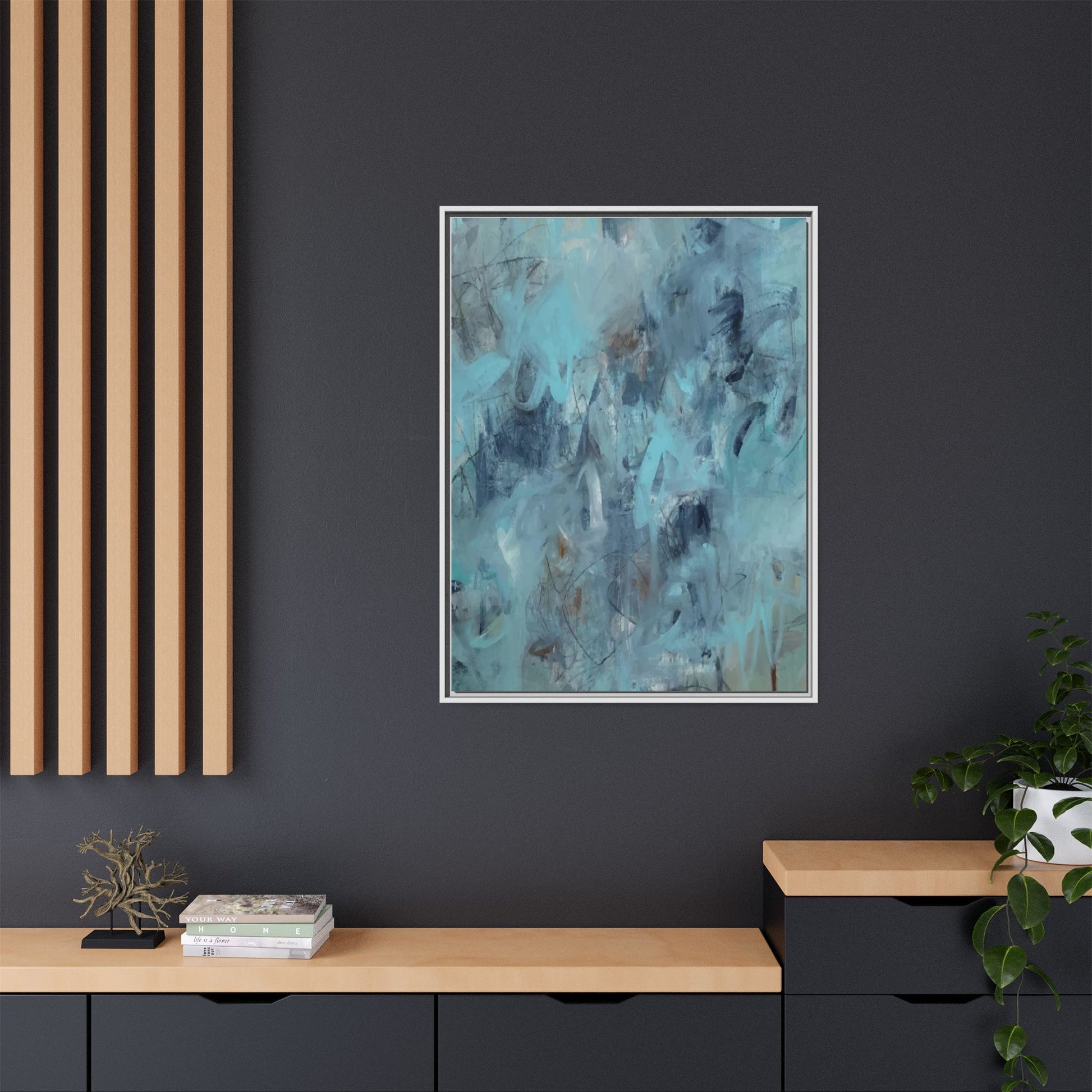 This abstract art piece is a mesmerizing composition in shades of blue, teal, and gray, creating a dreamlike and ethereal landscape. The painting features fluid, organic shapes and textured brushstrokes that overlap and intertwine, generating a sense of movement and depth. Soft, translucent layers of paint create a sense of atmosphere, with darker navy and slate blue tones contrasting against lighter aquamarine and white highlights. Gestural marks and linear elements weave through the composition, adding dynamic energy and visual complexity to the artwork. The overall effect is contemplative and reminiscent of a misty seascape or an abstract interpretation of natural phenomena like clouds, water, or geological formations.