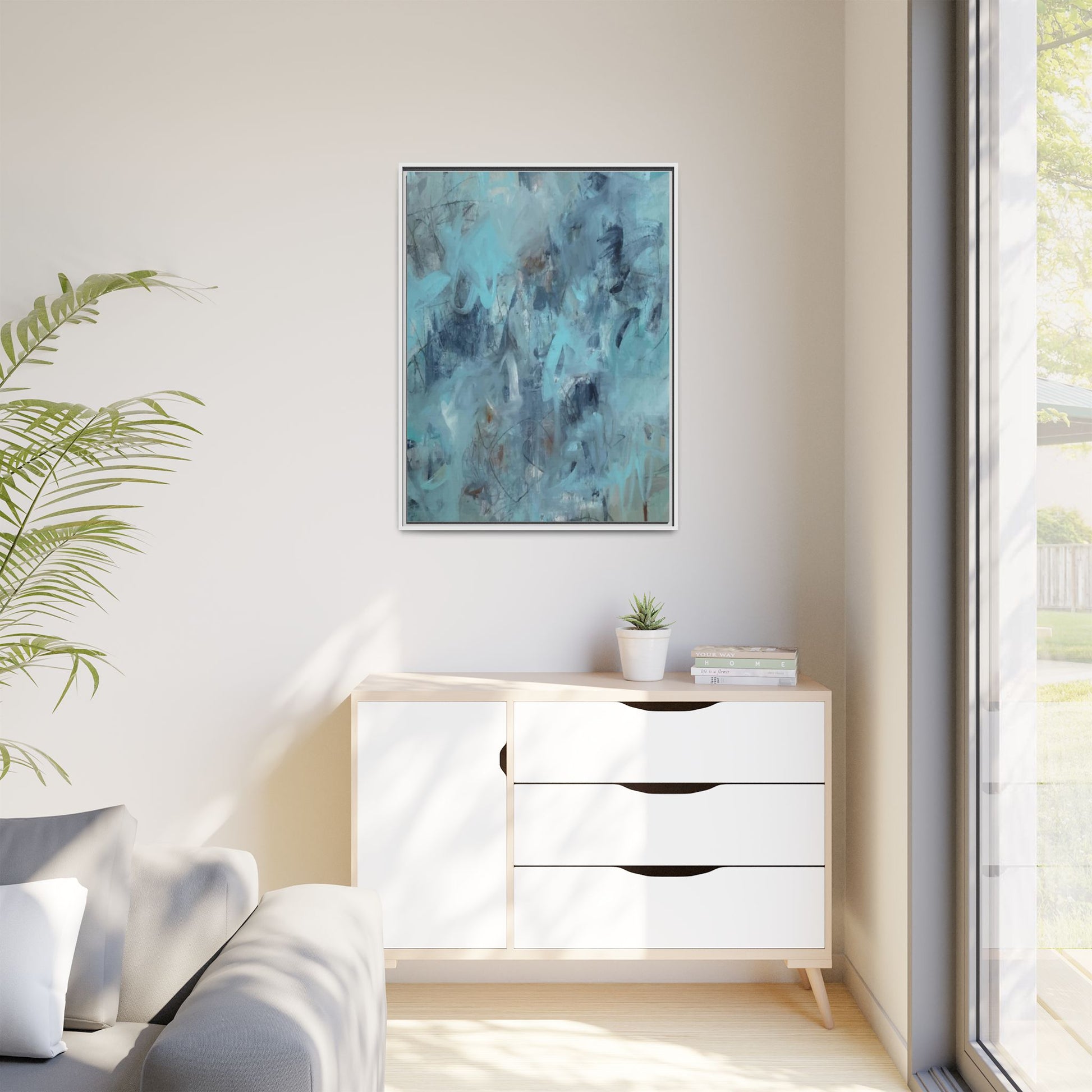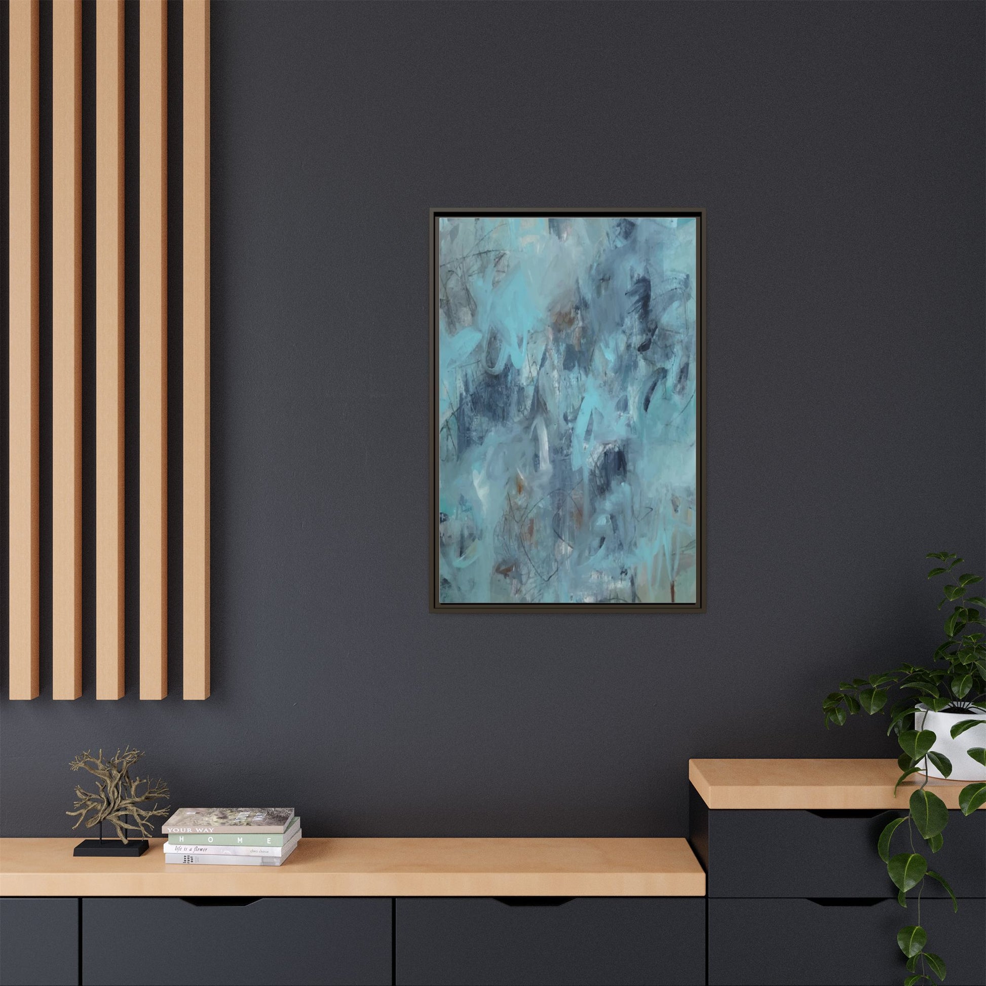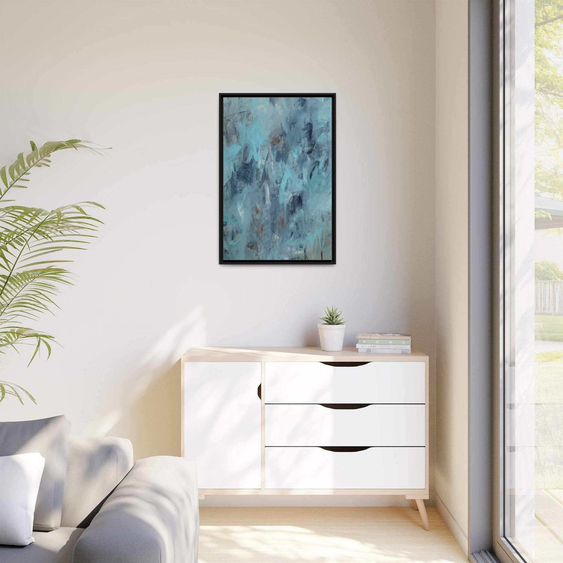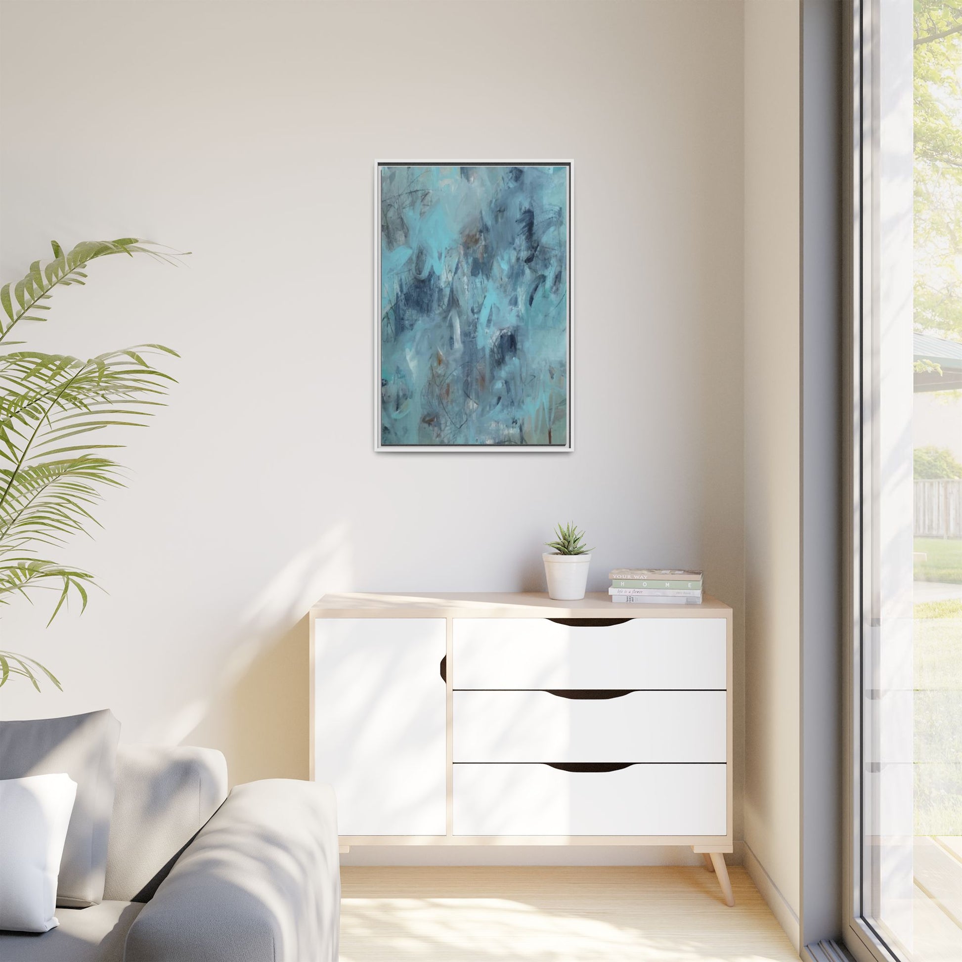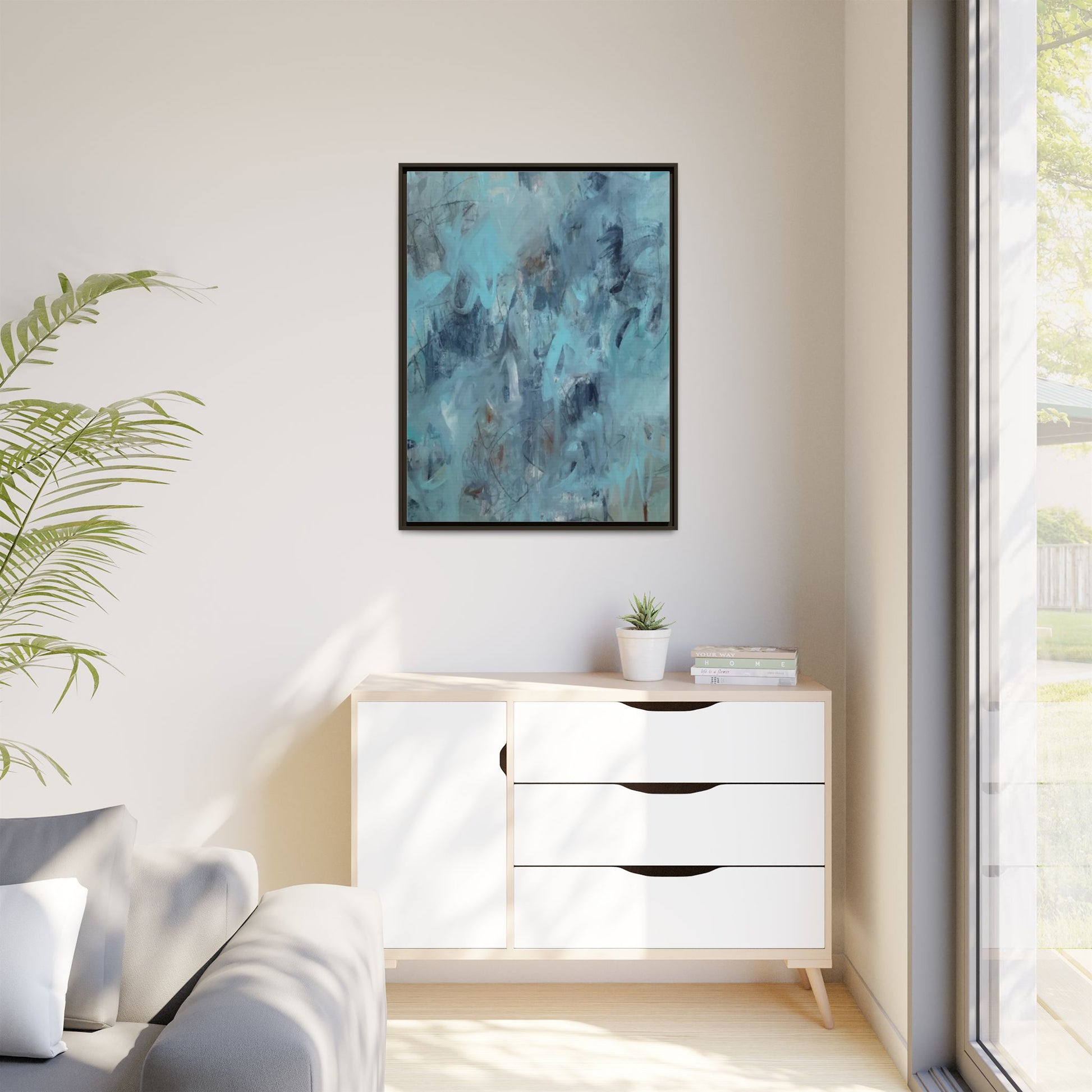 This abstract art piece is a mesmerizing composition in shades of blue, teal, and gray, creating a dreamlike and ethereal landscape. The painting features fluid, organic shapes and textured brushstrokes that overlap and intertwine, generating a sense of movement and depth. Soft, translucent layers of paint create a sense of atmosphere, with darker navy and slate blue tones contrasting against lighter aquamarine and white highlights. Gestural marks and linear elements weave through the composition, adding dynamic energy and visual complexity to the artwork. The overall effect is contemplative and reminiscent of a misty seascape or an abstract interpretation of natural phenomena like clouds, water, or geological formations.
