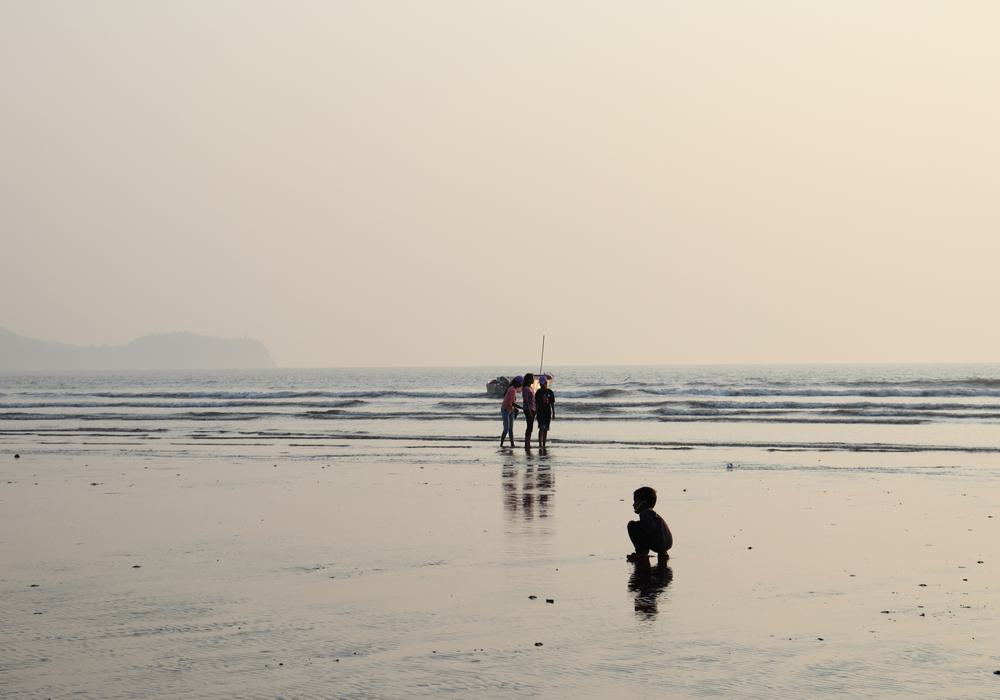 A tranquil beach scene unfolds in a pastel dawn, where the horizon whispers secrets to the gathering waves. Figures stand absorbed in the vastness, their reflections mingling with sea and sky in a meditative dance.