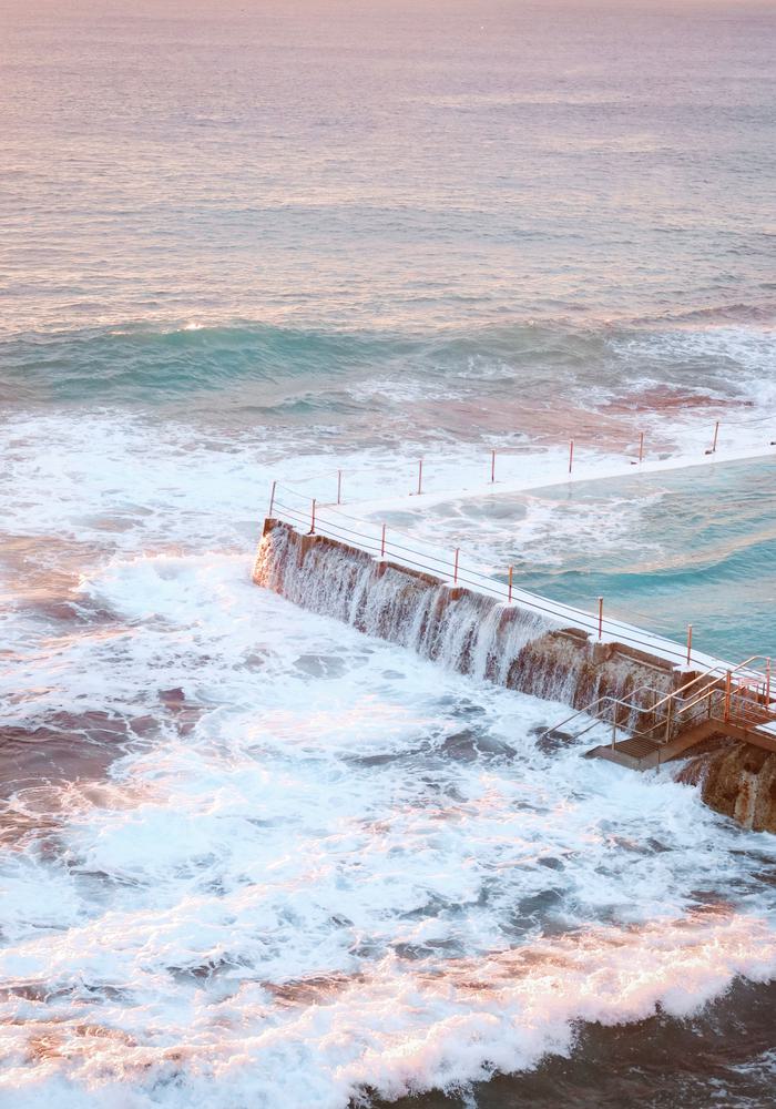 A serene ocean pool merges with the sea as the waves cascade over the edge, bathed in the soft glow of the setting sun.