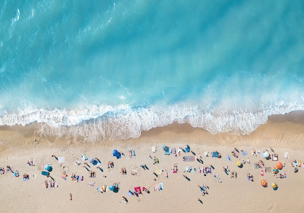 A bird's-eye view of a sunlit beach where azure waves softly kiss the sand, dotted with colorful umbrellas and vacationers basking in the warmth.