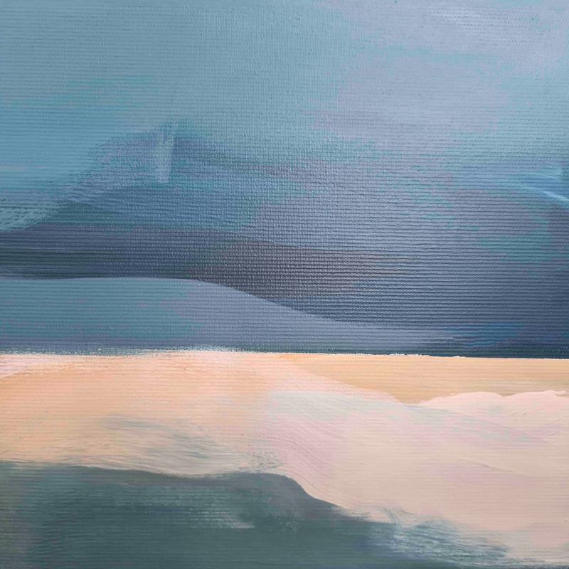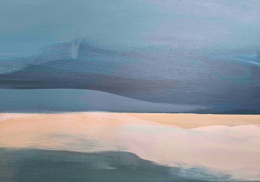 A serene blend of muted blues and soft pastels, suggesting the gentle transition between sky and sea, where horizons blur and tranquility reigns.