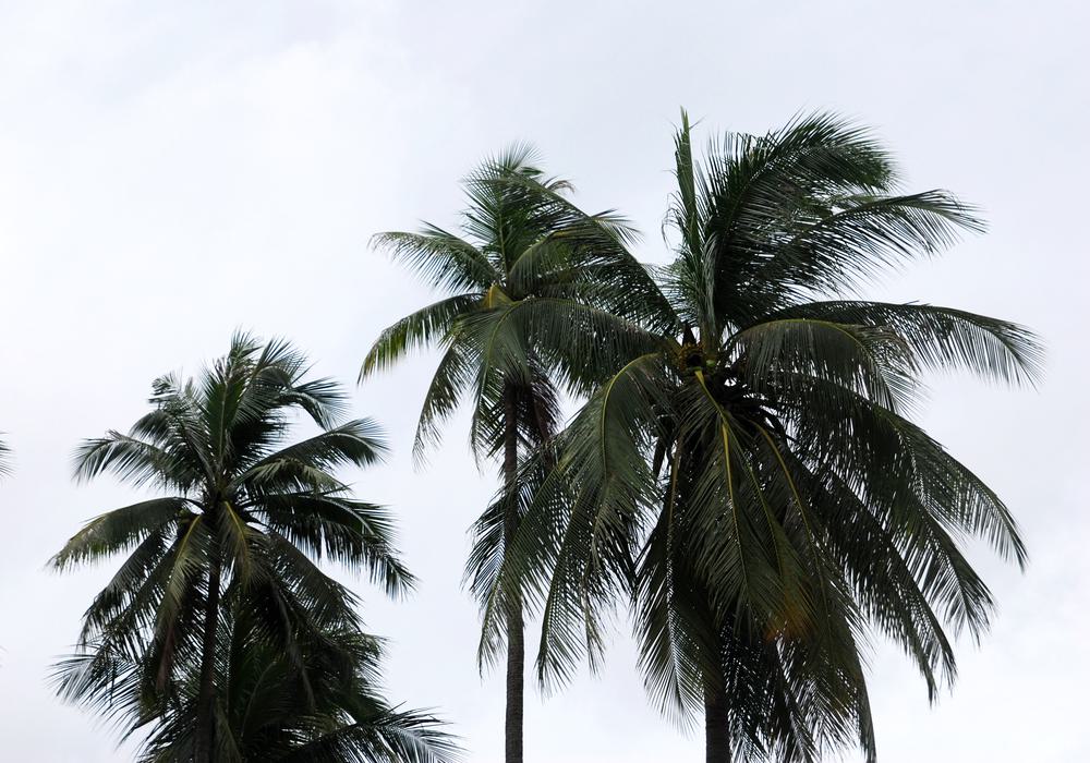 ** In a tranquil dance with the breeze, towering palms stretch skyward, their silhouettes etching poetic lines against a pale sky.