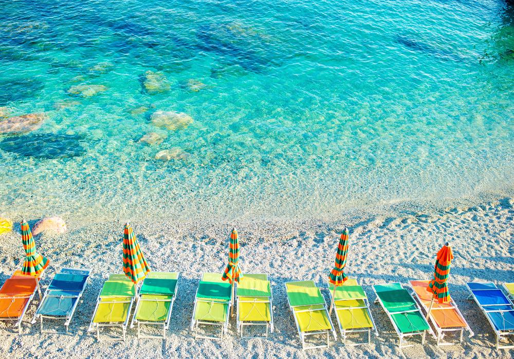 ** Vibrant symphony of color contrasts against the azure whispers of the sea, where sunlit chairs line a tranquil shore.