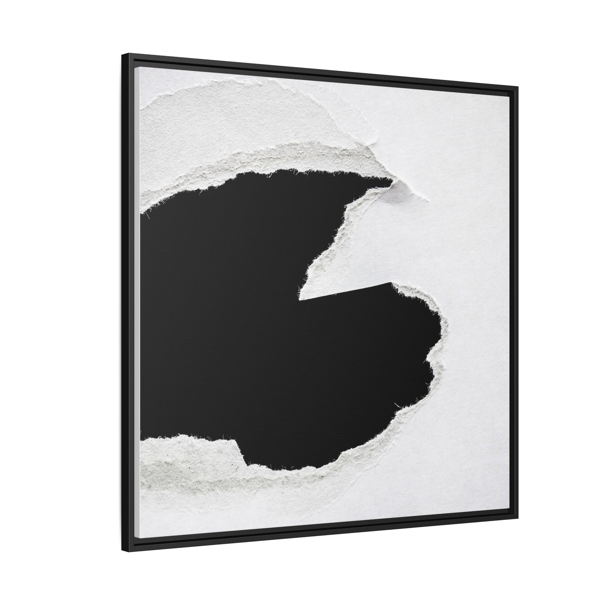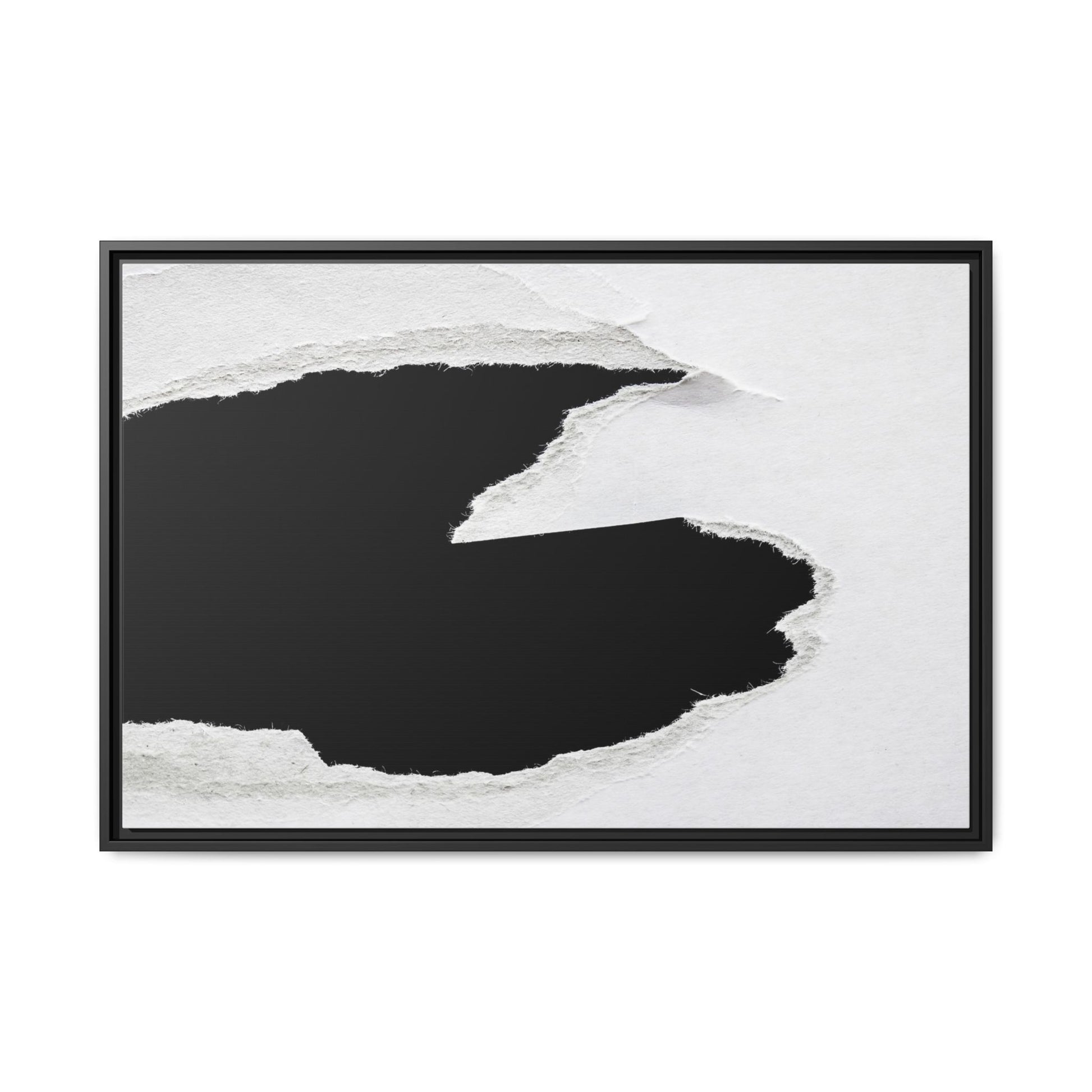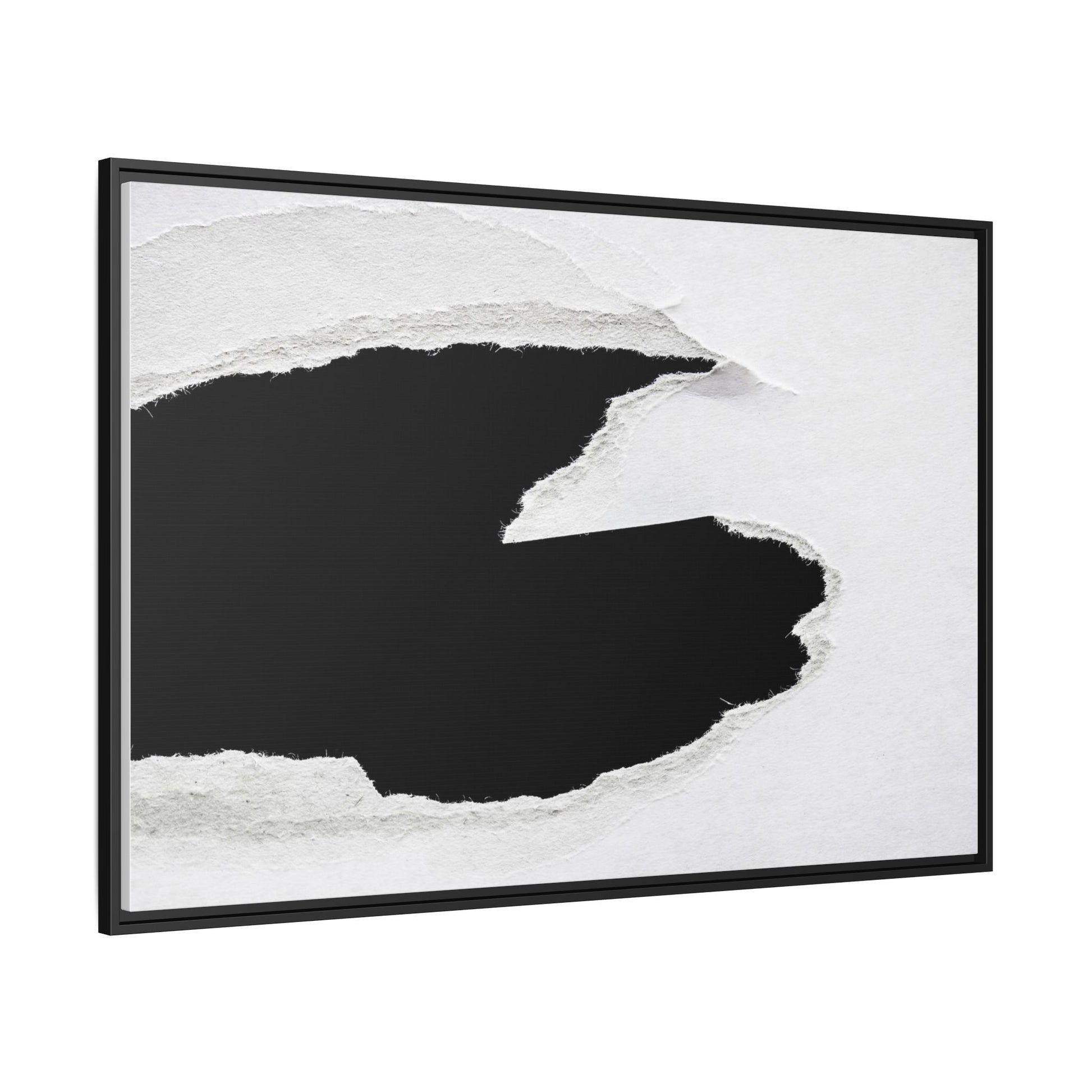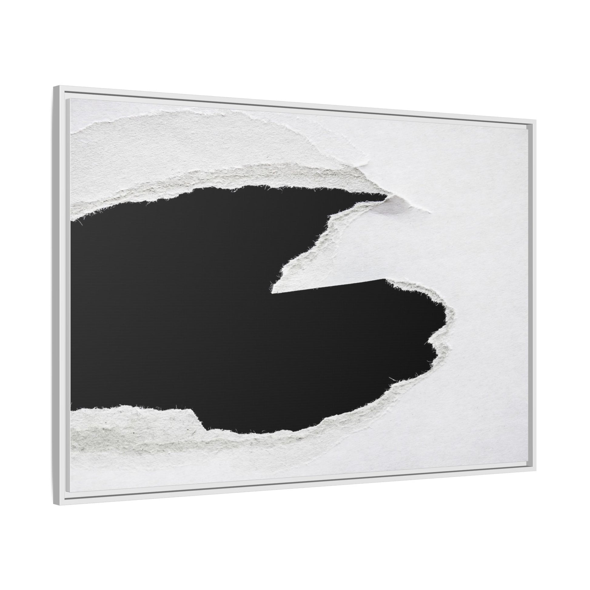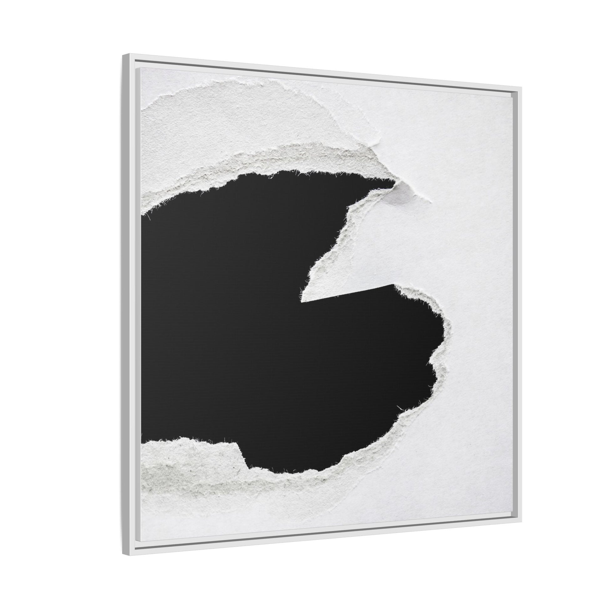 This striking black and white image depicts a torn piece of paper with a dramatic, textured edge revealing a stark contrast between white and black regions. The torn paper creates an abstract, dynamic shape with rough, fibrous edges that add depth and visual interest to the composition. The white background provides a clean, minimalist canvas that emphasizes the sharp division between the light and dark areas. The texture of the paper appears rough and uneven, with visible fiber strands creating a tactile, almost three-dimensional effect. The image's high-contrast aesthetic creates a powerful visual statement, drawing the viewer's eye to the intricate details of the torn paper's edge.