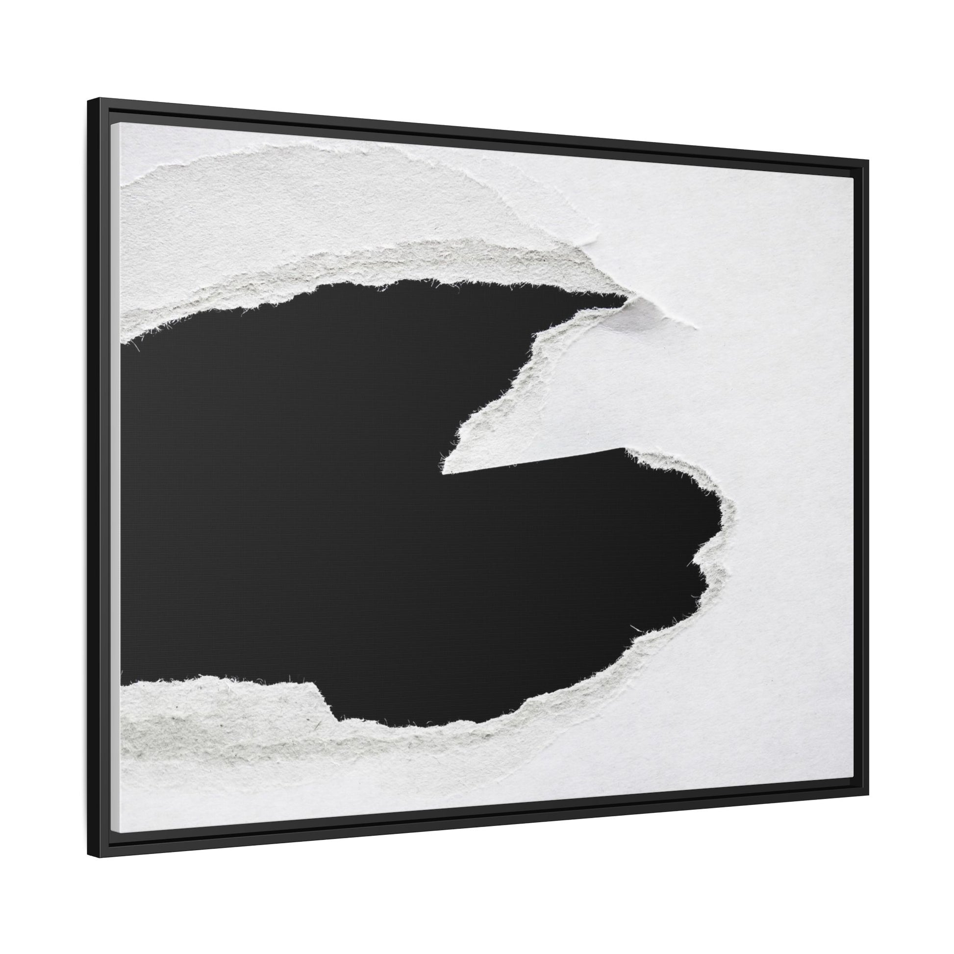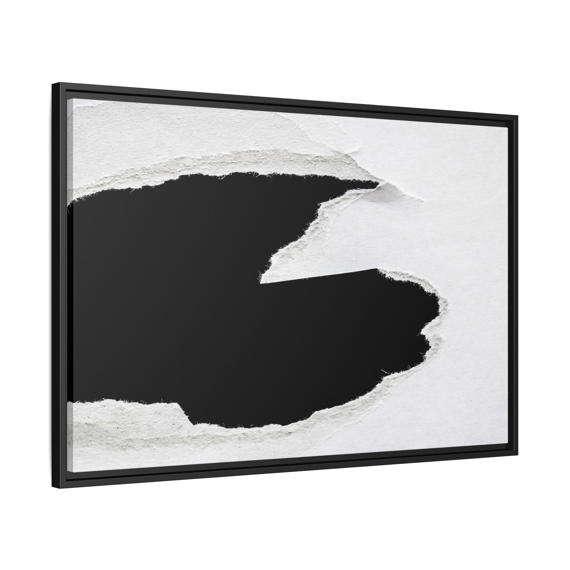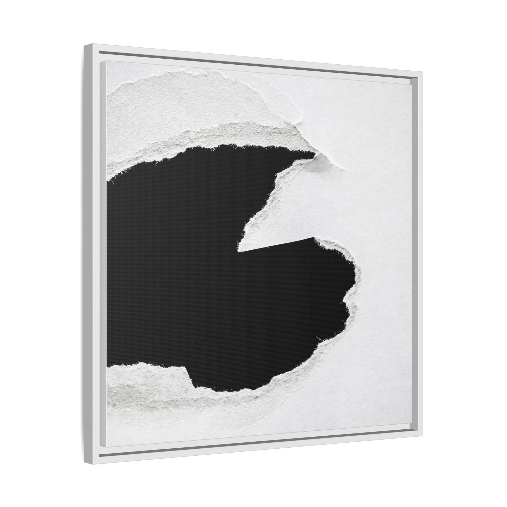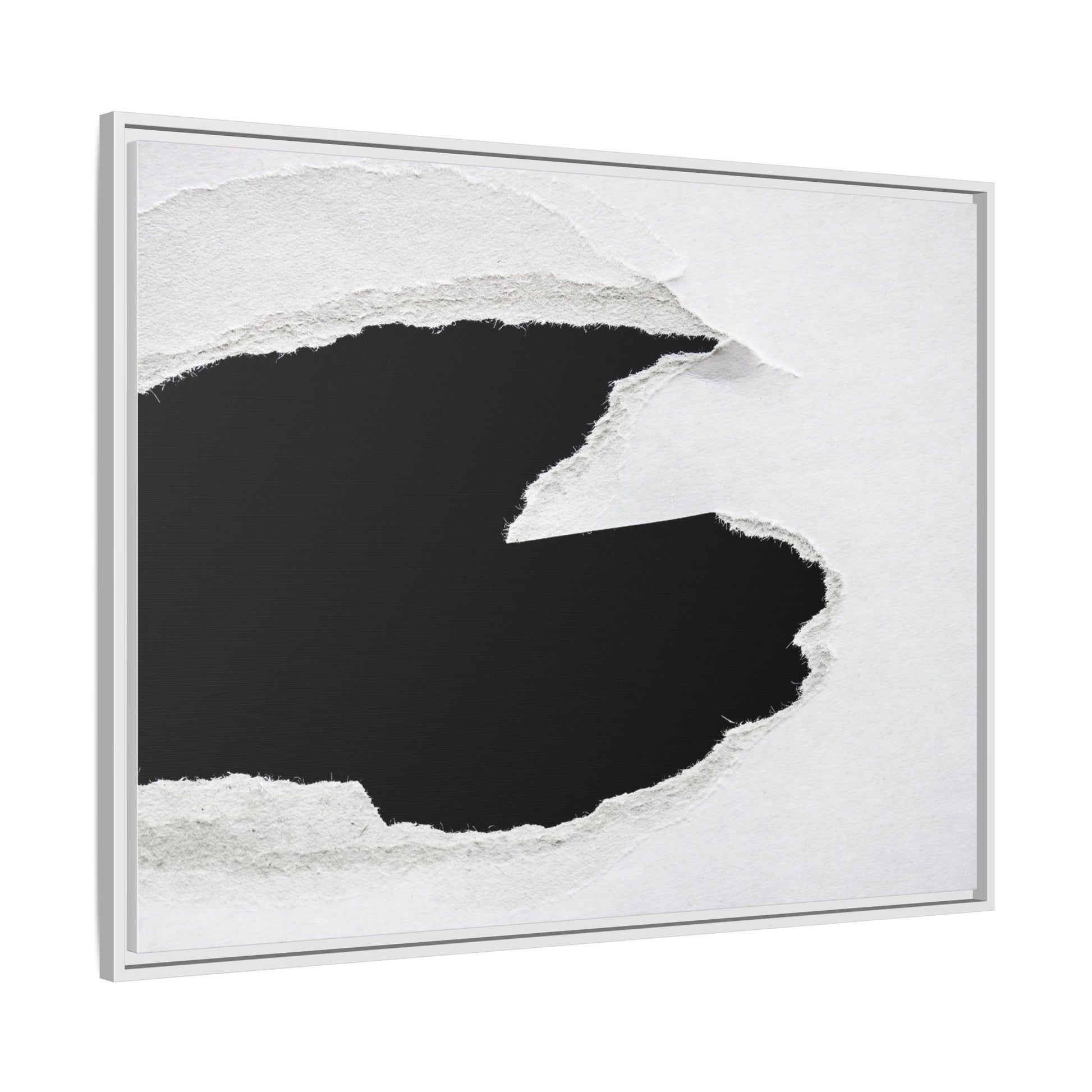 This striking black and white image depicts a torn piece of paper with a dramatic, textured edge revealing a stark contrast between white and black regions. The torn paper creates an abstract, dynamic shape with rough, fibrous edges that add depth and visual interest to the composition. The white background provides a clean, minimalist canvas that emphasizes the sharp division between the light and dark areas. The texture of the paper appears rough and uneven, with visible fiber strands creating a tactile, almost three-dimensional effect. The image's high-contrast aesthetic creates a powerful visual statement, drawing the viewer's eye to the intricate details of the torn paper's edge.