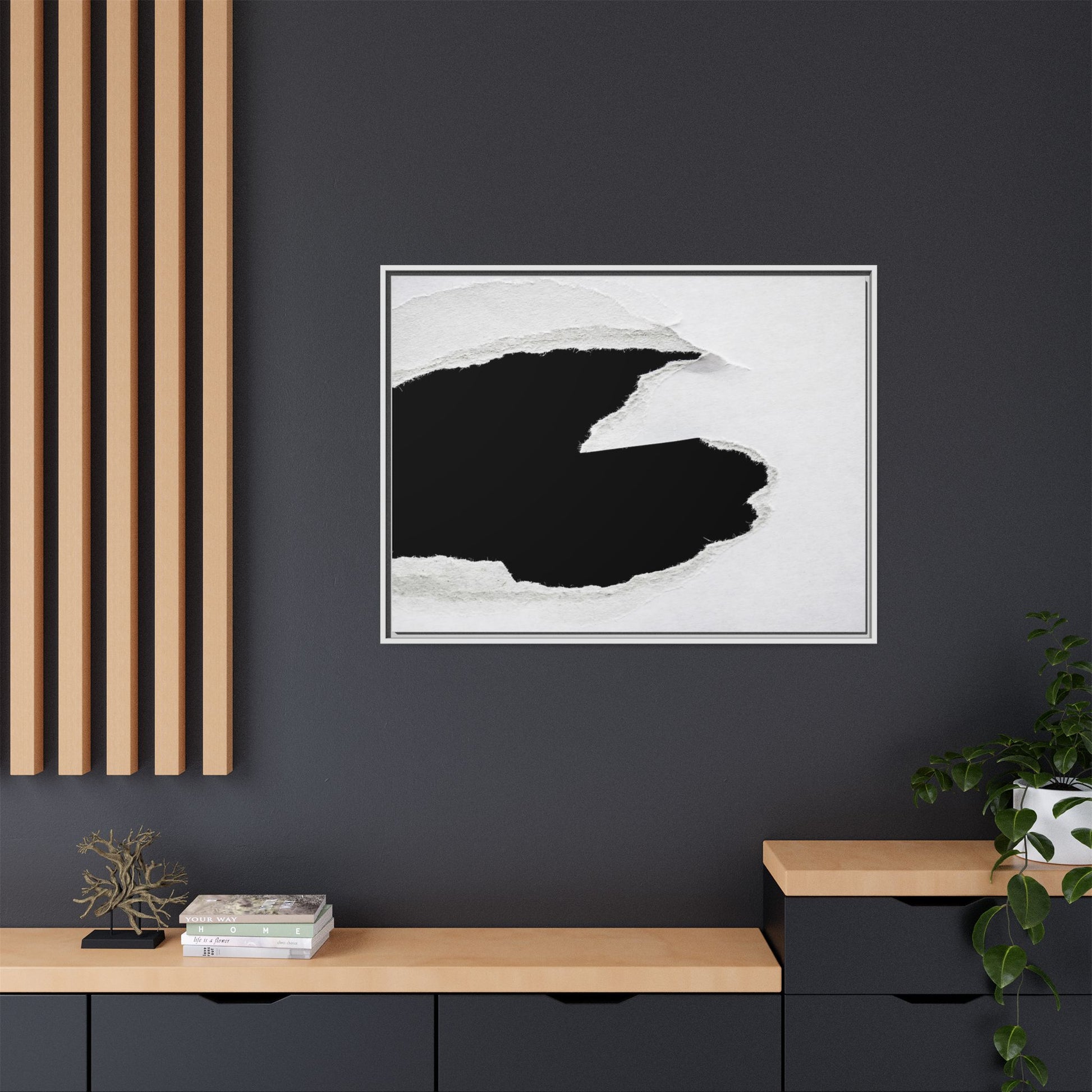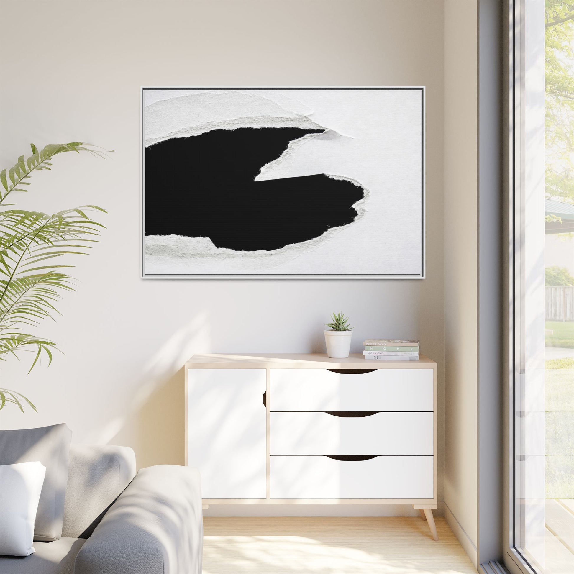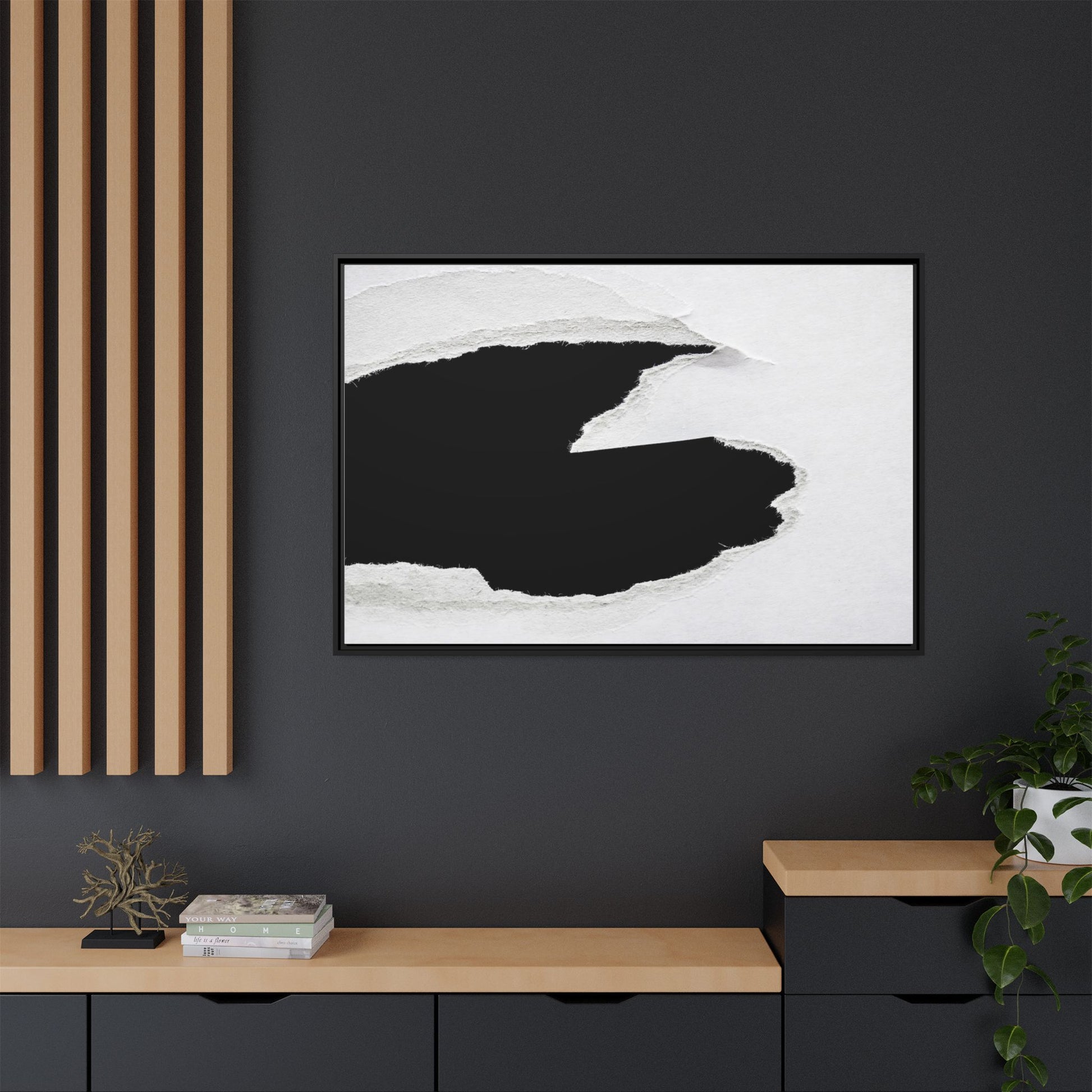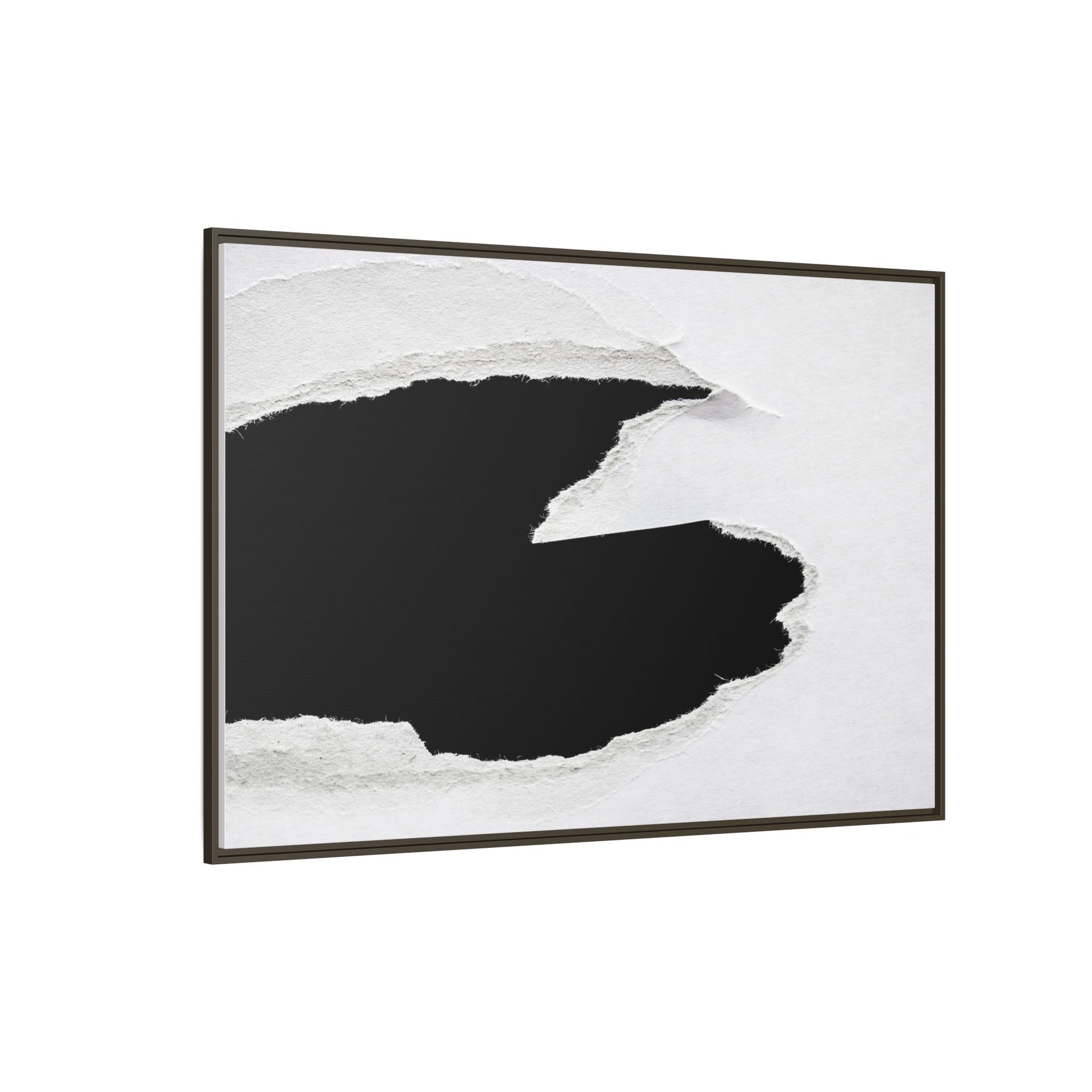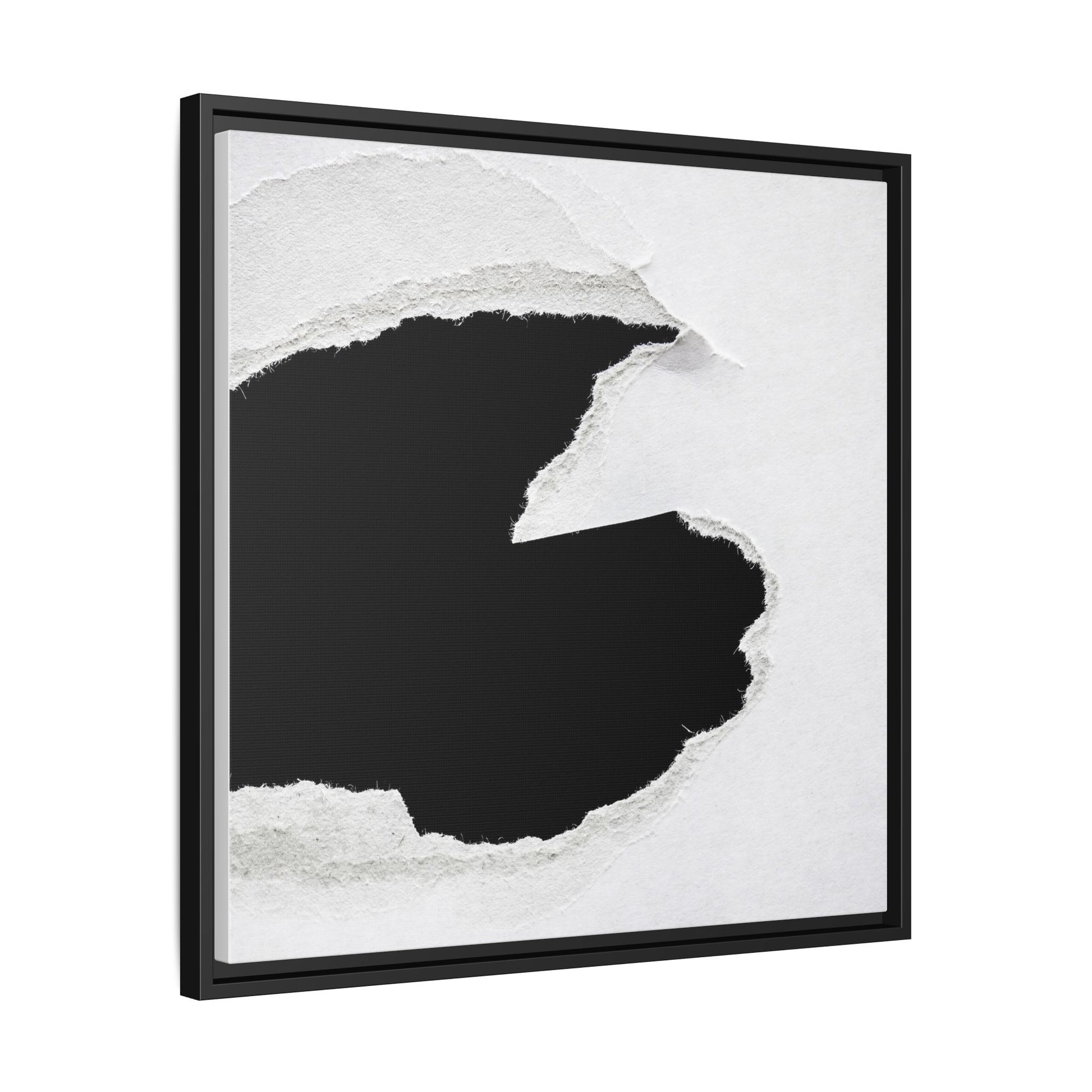 This striking black and white image depicts a torn piece of paper with a dramatic, textured edge revealing a stark contrast between white and black regions. The torn paper creates an abstract, dynamic shape with rough, fibrous edges that add depth and visual interest to the composition. The white background provides a clean, minimalist canvas that emphasizes the sharp division between the light and dark areas. The texture of the paper appears rough and uneven, with visible fiber strands creating a tactile, almost three-dimensional effect. The image's high-contrast aesthetic creates a powerful visual statement, drawing the viewer's eye to the intricate details of the torn paper's edge.