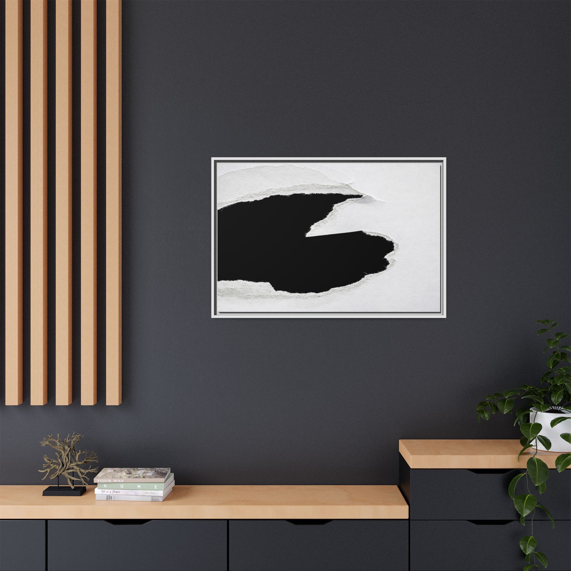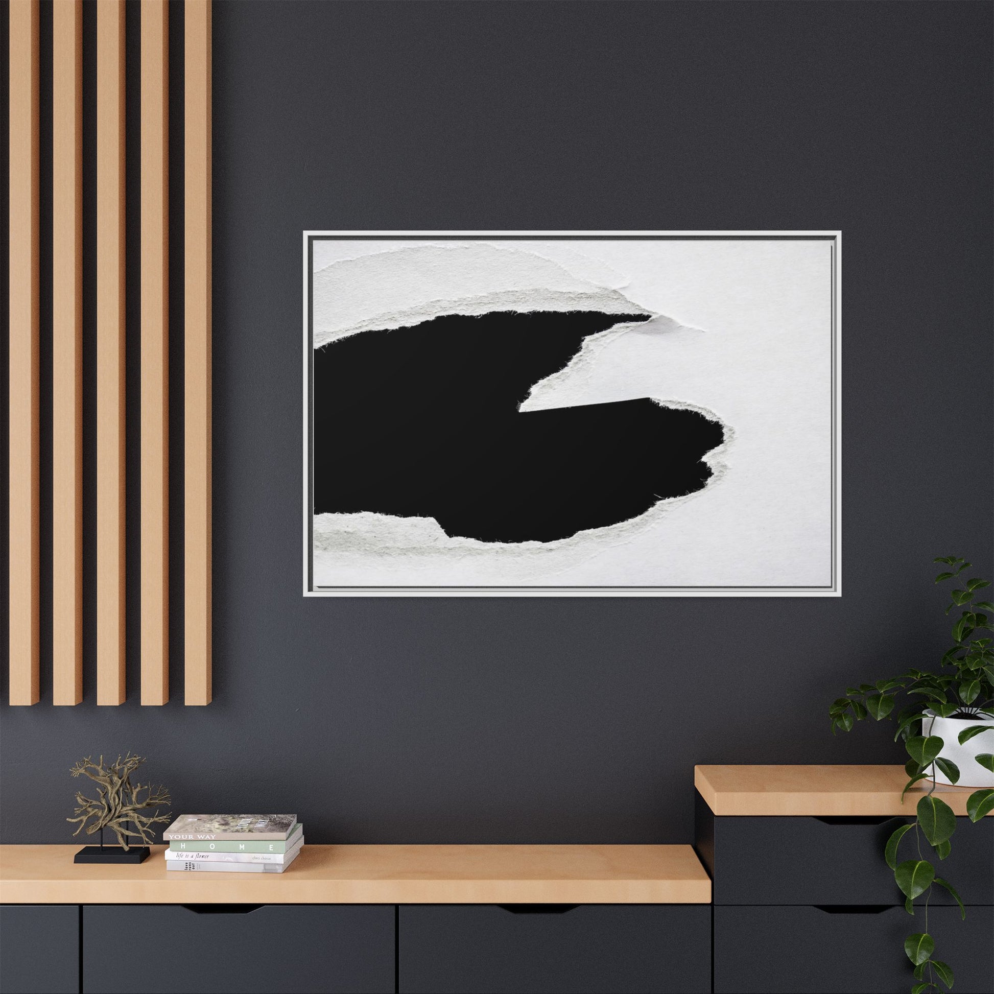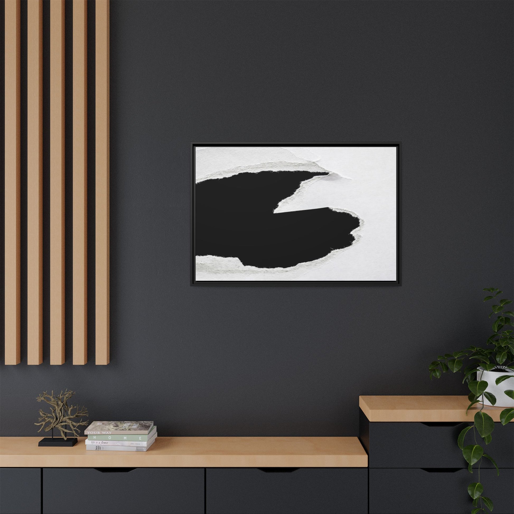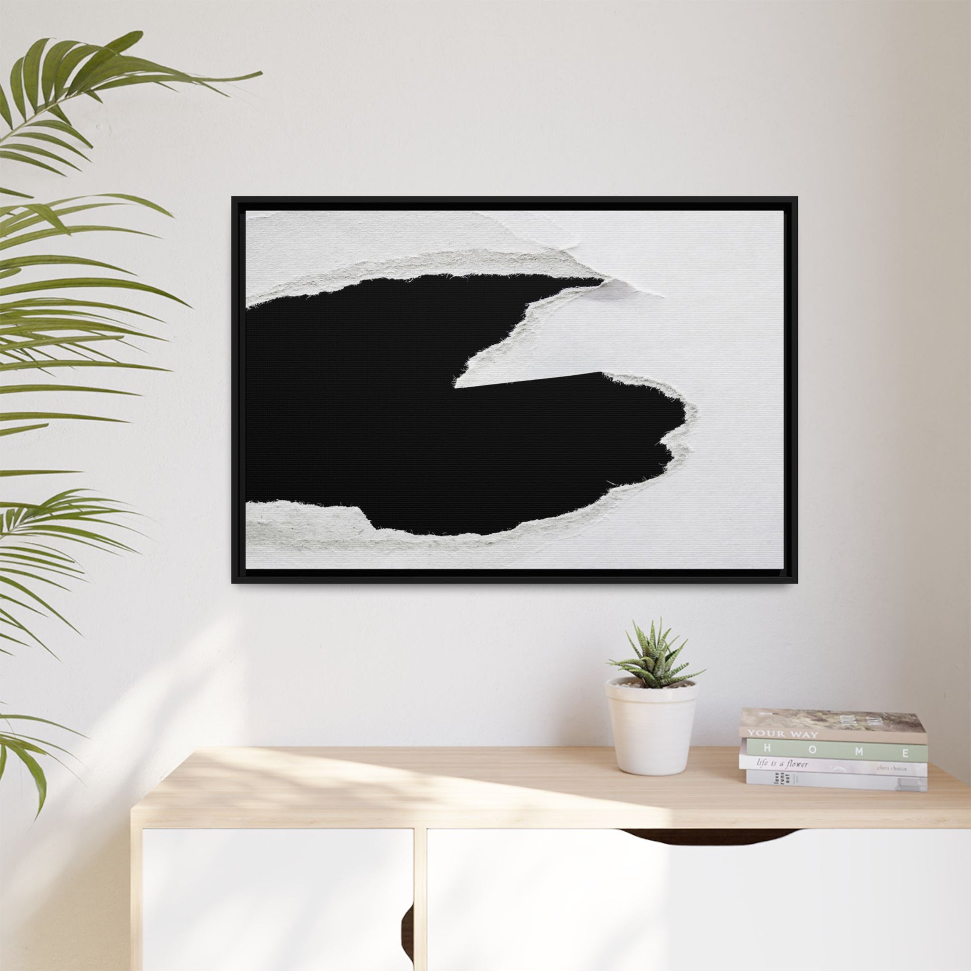 This striking black and white image depicts a torn piece of paper with a dramatic, textured edge revealing a stark contrast between white and black regions. The torn paper creates an abstract, dynamic shape with rough, fibrous edges that add depth and visual interest to the composition. The white background provides a clean, minimalist canvas that emphasizes the sharp division between the light and dark areas. The texture of the paper appears rough and uneven, with visible fiber strands creating a tactile, almost three-dimensional effect. The image's high-contrast aesthetic creates a powerful visual statement, drawing the viewer's eye to the intricate details of the torn paper's edge.