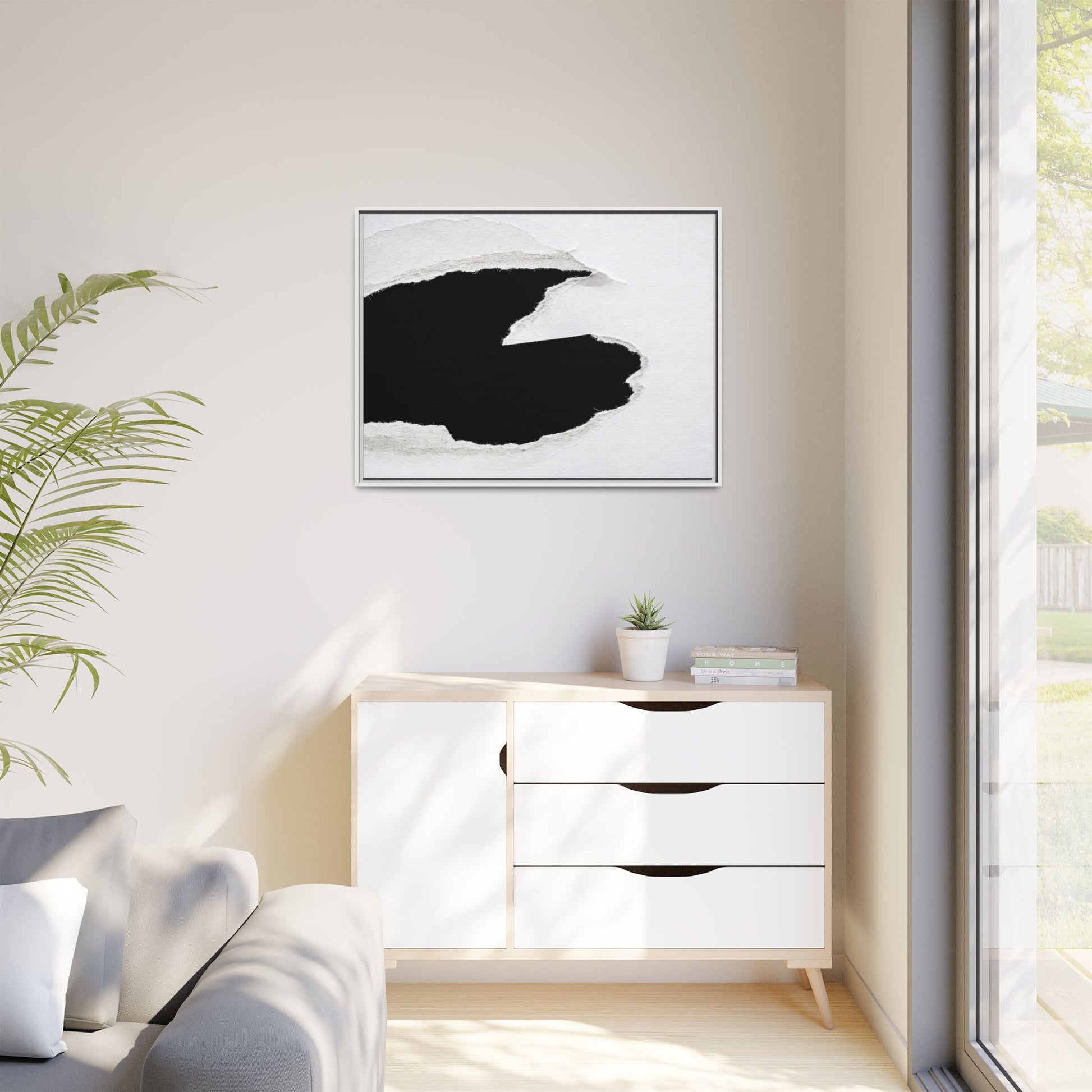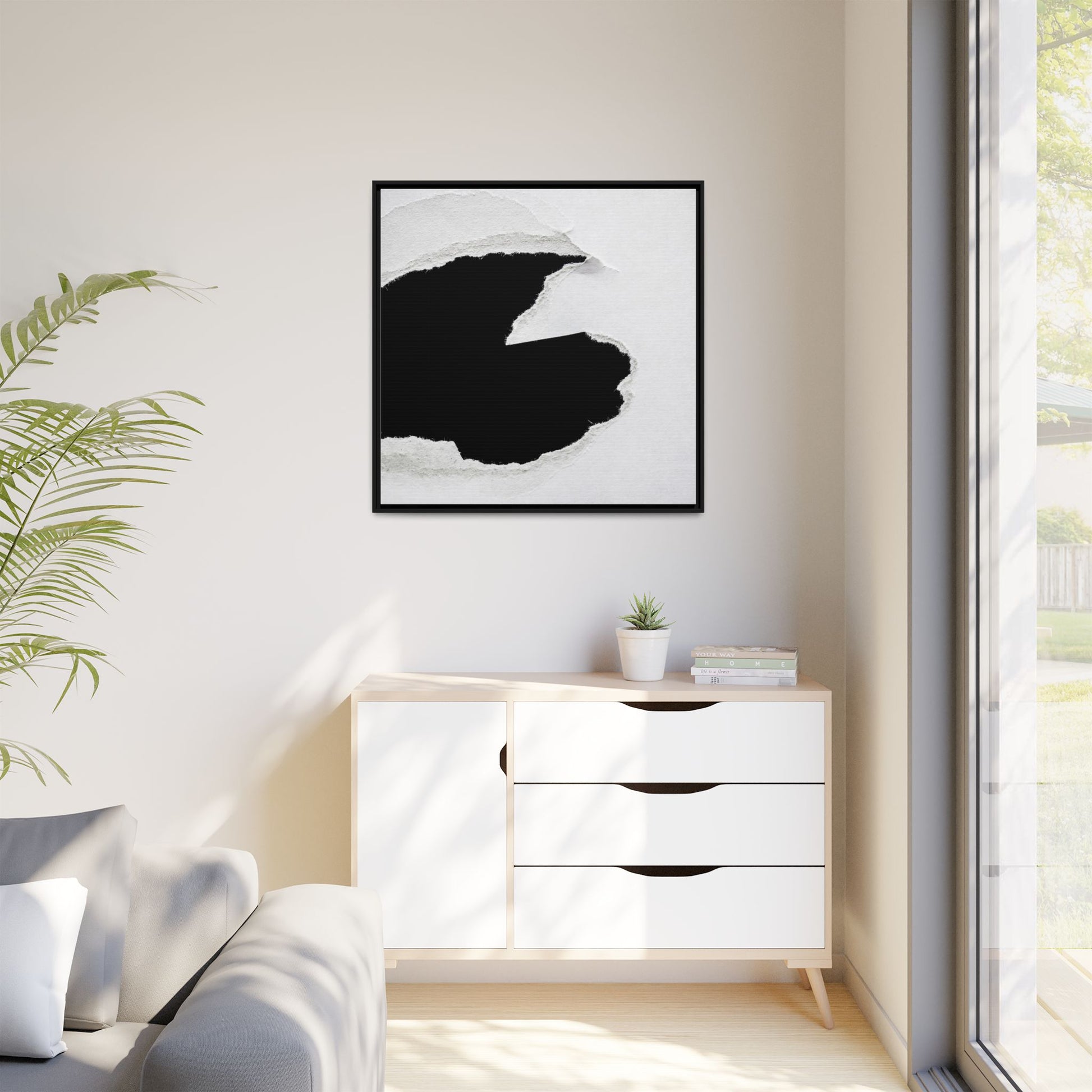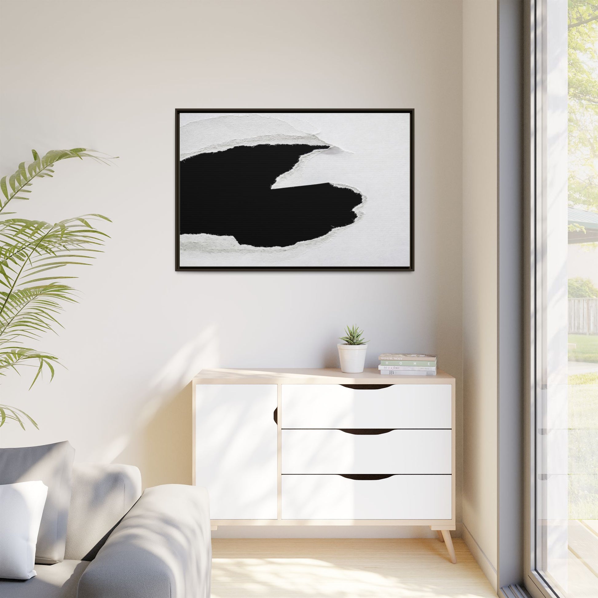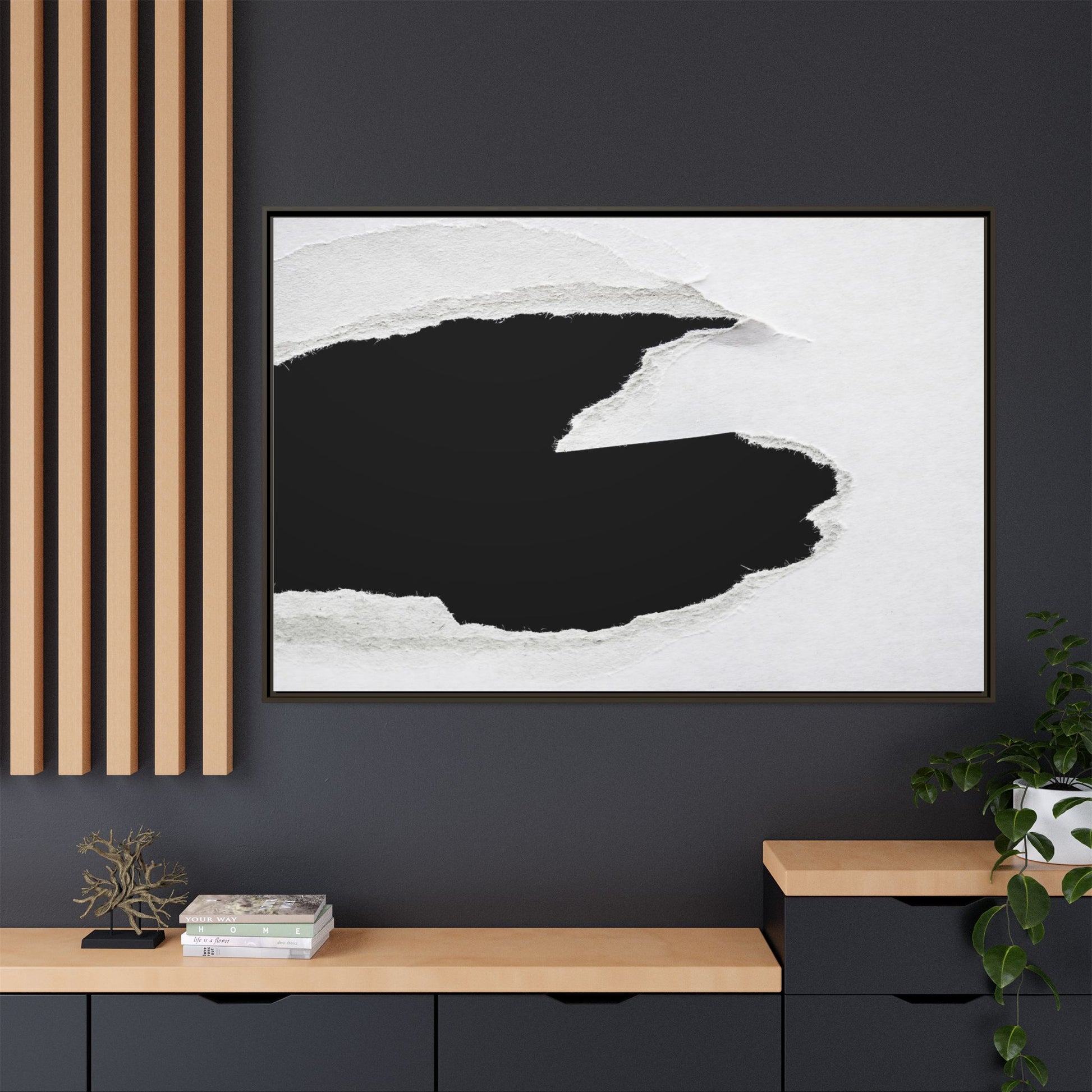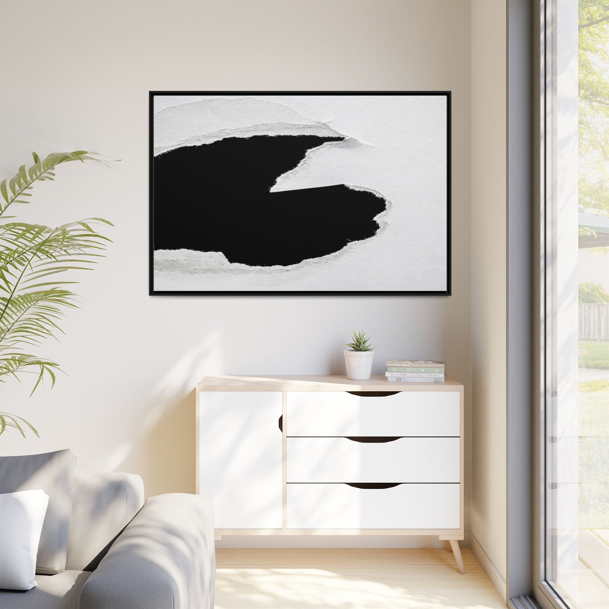 This striking black and white image depicts a torn piece of paper with a dramatic, textured edge revealing a stark contrast between white and black regions. The torn paper creates an abstract, dynamic shape with rough, fibrous edges that add depth and visual interest to the composition. The white background provides a clean, minimalist canvas that emphasizes the sharp division between the light and dark areas. The texture of the paper appears rough and uneven, with visible fiber strands creating a tactile, almost three-dimensional effect. The image's high-contrast aesthetic creates a powerful visual statement, drawing the viewer's eye to the intricate details of the torn paper's edge.