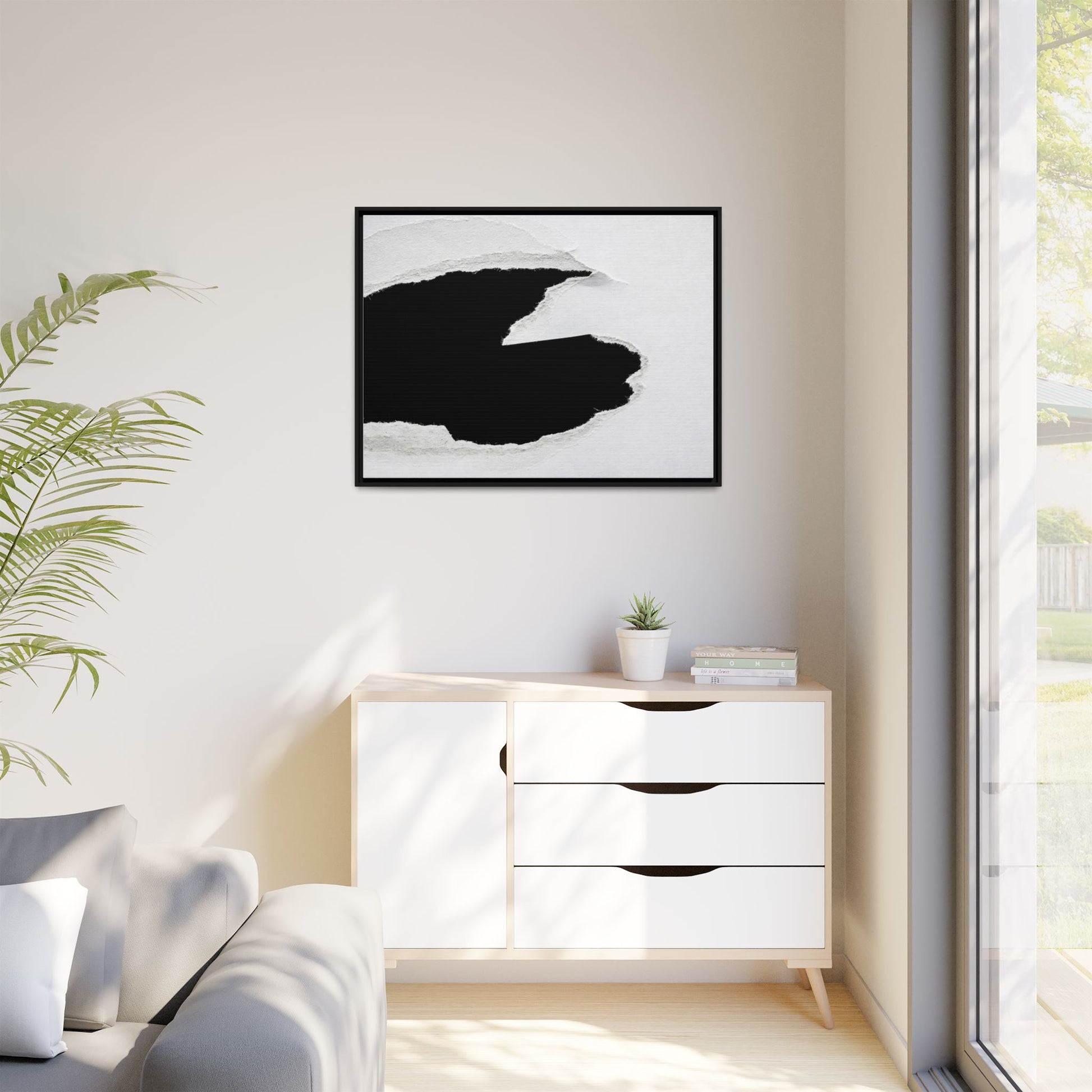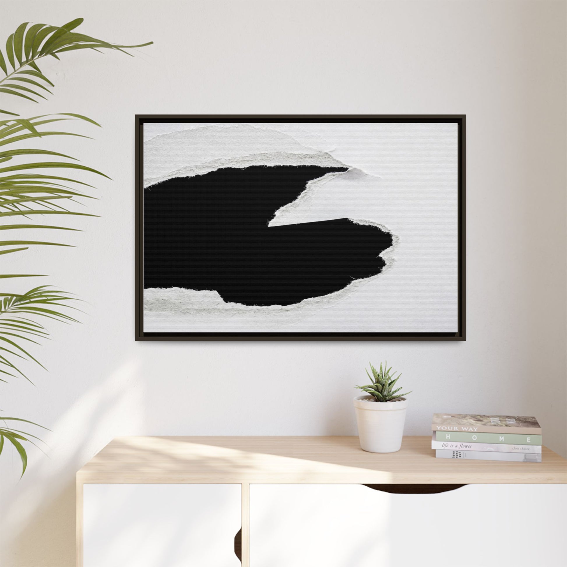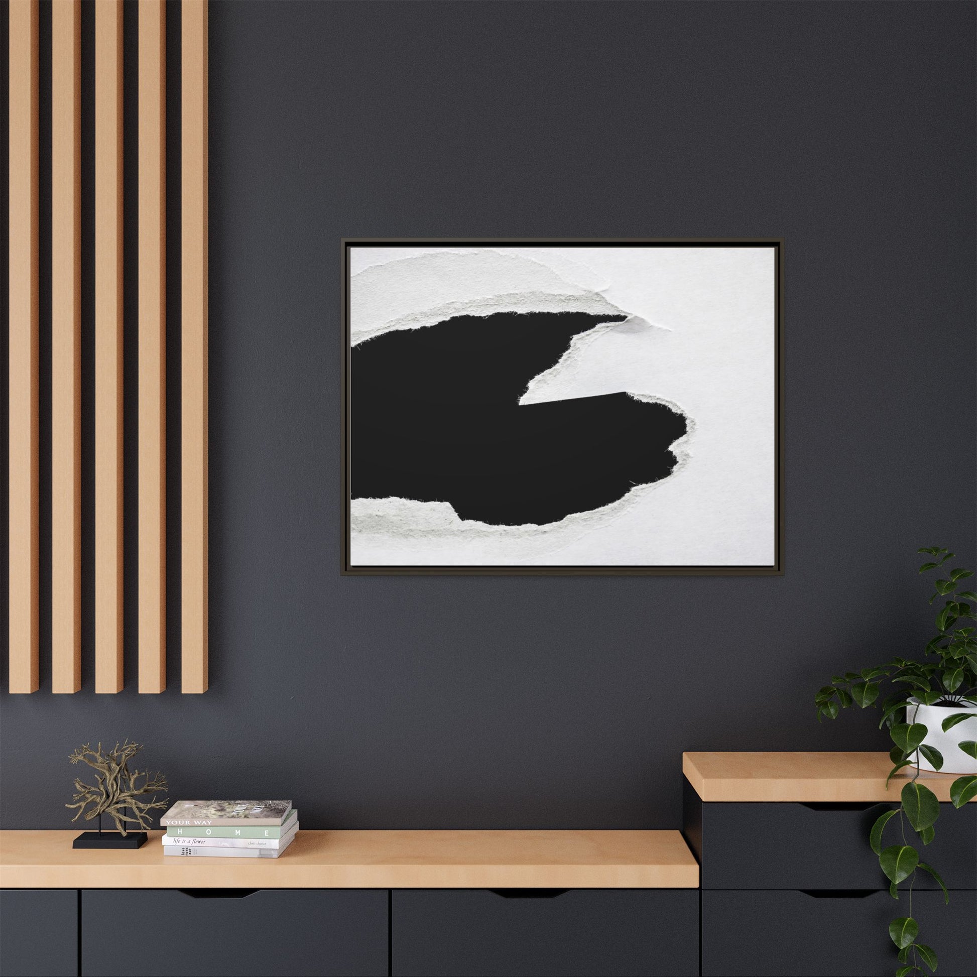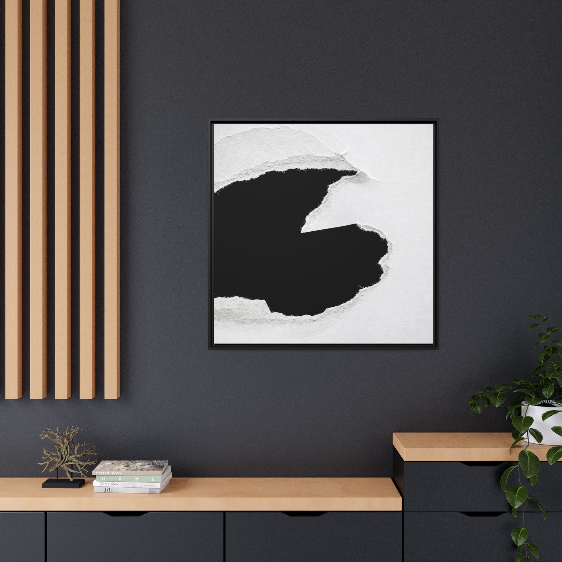 This striking black and white image depicts a torn piece of paper with a dramatic, textured edge revealing a stark contrast between white and black regions. The torn paper creates an abstract, dynamic shape with rough, fibrous edges that add depth and visual interest to the composition. The white background provides a clean, minimalist canvas that emphasizes the sharp division between the light and dark areas. The texture of the paper appears rough and uneven, with visible fiber strands creating a tactile, almost three-dimensional effect. The image's high-contrast aesthetic creates a powerful visual statement, drawing the viewer's eye to the intricate details of the torn paper's edge.