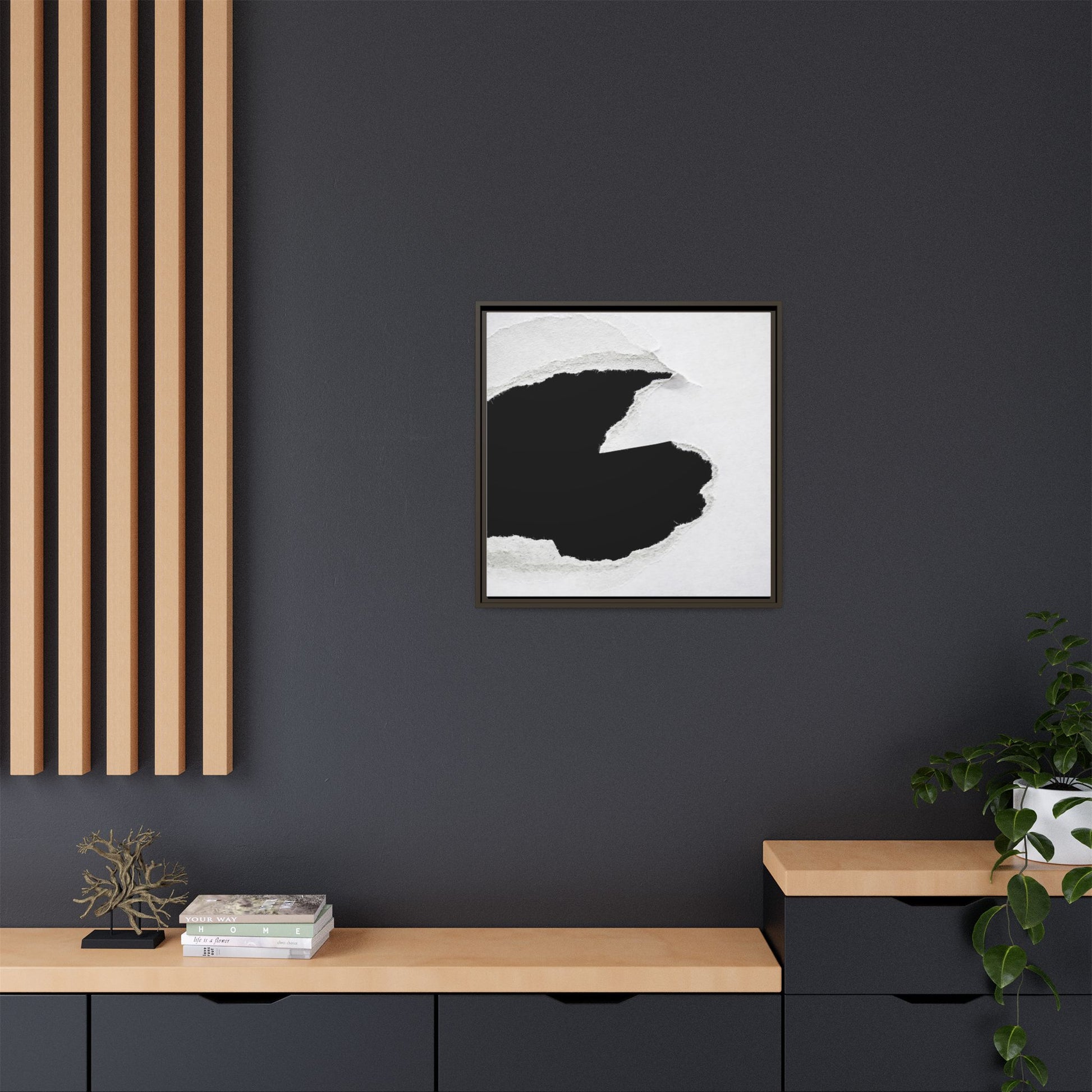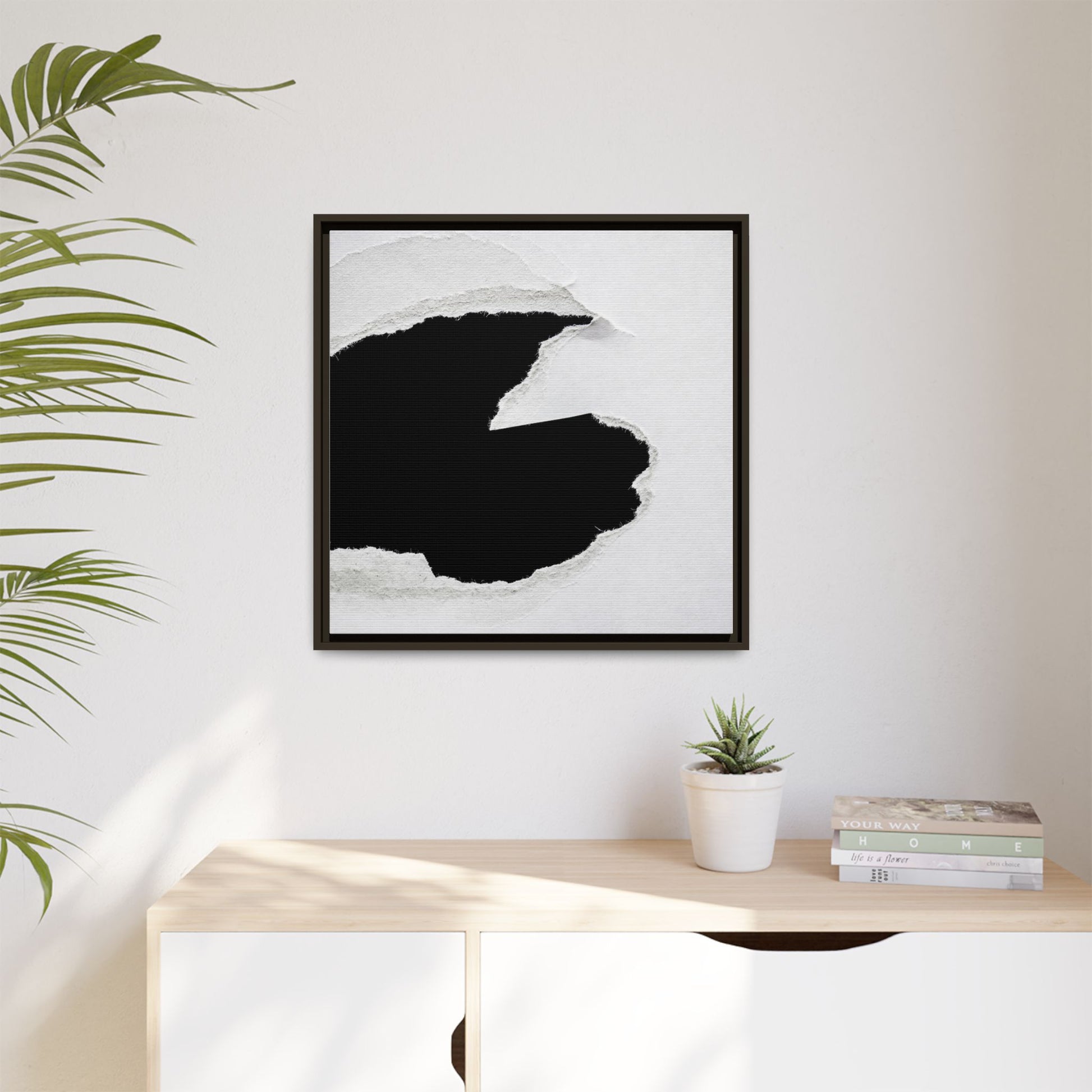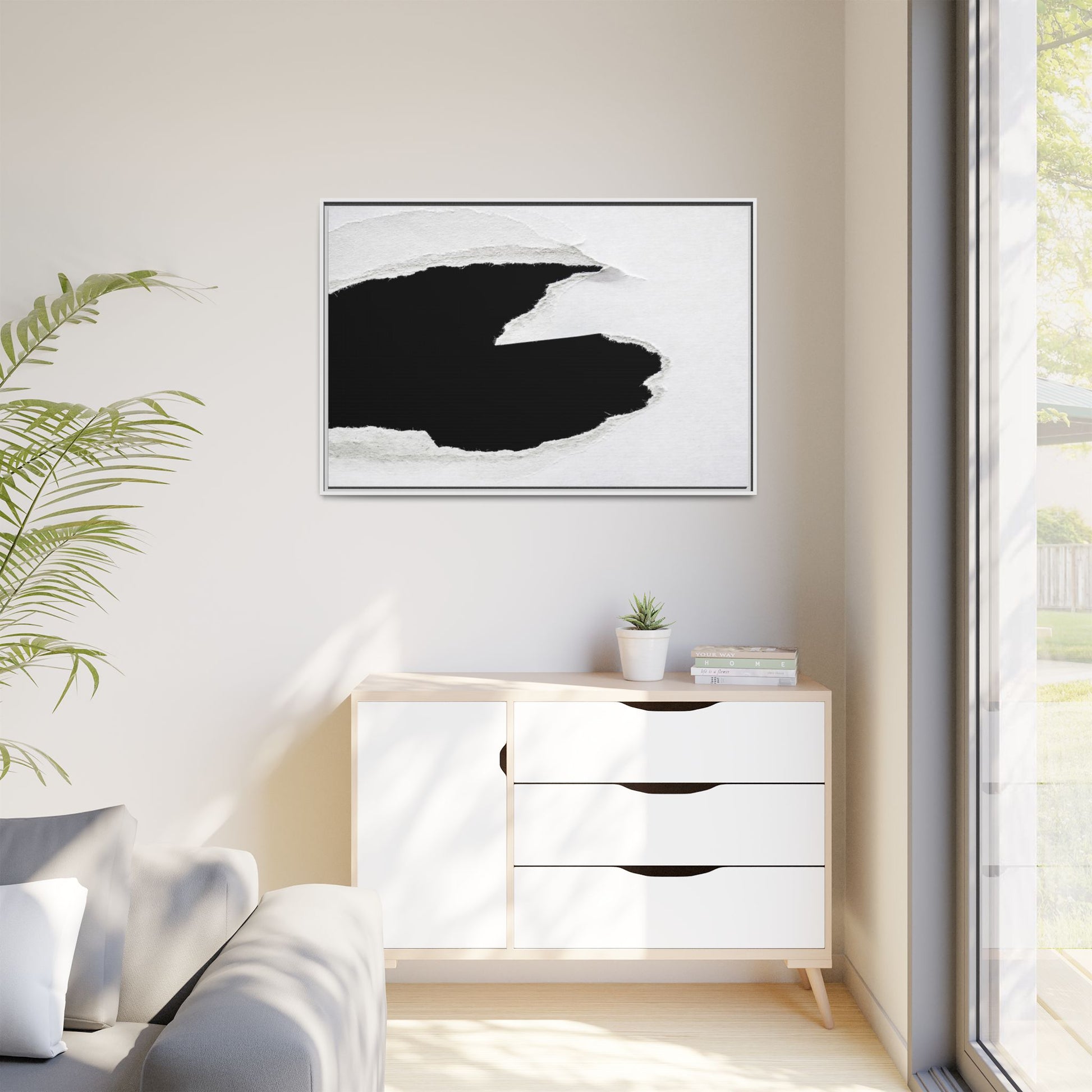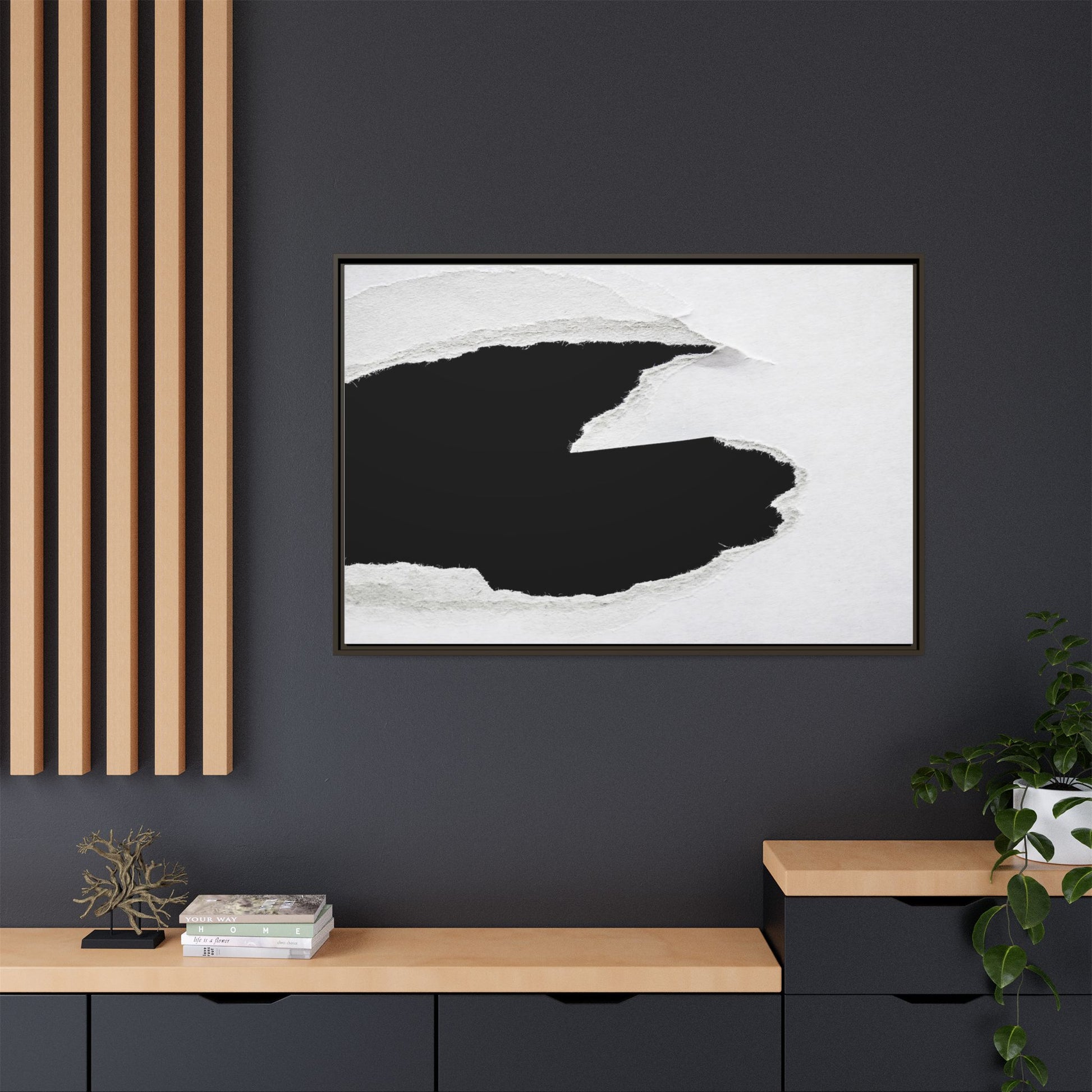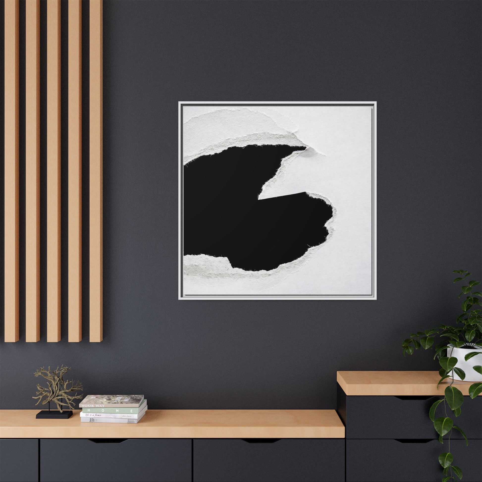 This striking black and white image depicts a torn piece of paper with a dramatic, textured edge revealing a stark contrast between white and black regions. The torn paper creates an abstract, dynamic shape with rough, fibrous edges that add depth and visual interest to the composition. The white background provides a clean, minimalist canvas that emphasizes the sharp division between the light and dark areas. The texture of the paper appears rough and uneven, with visible fiber strands creating a tactile, almost three-dimensional effect. The image's high-contrast aesthetic creates a powerful visual statement, drawing the viewer's eye to the intricate details of the torn paper's edge.