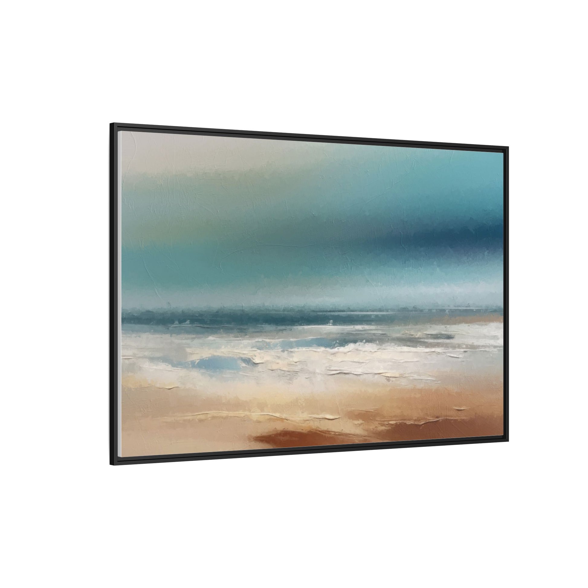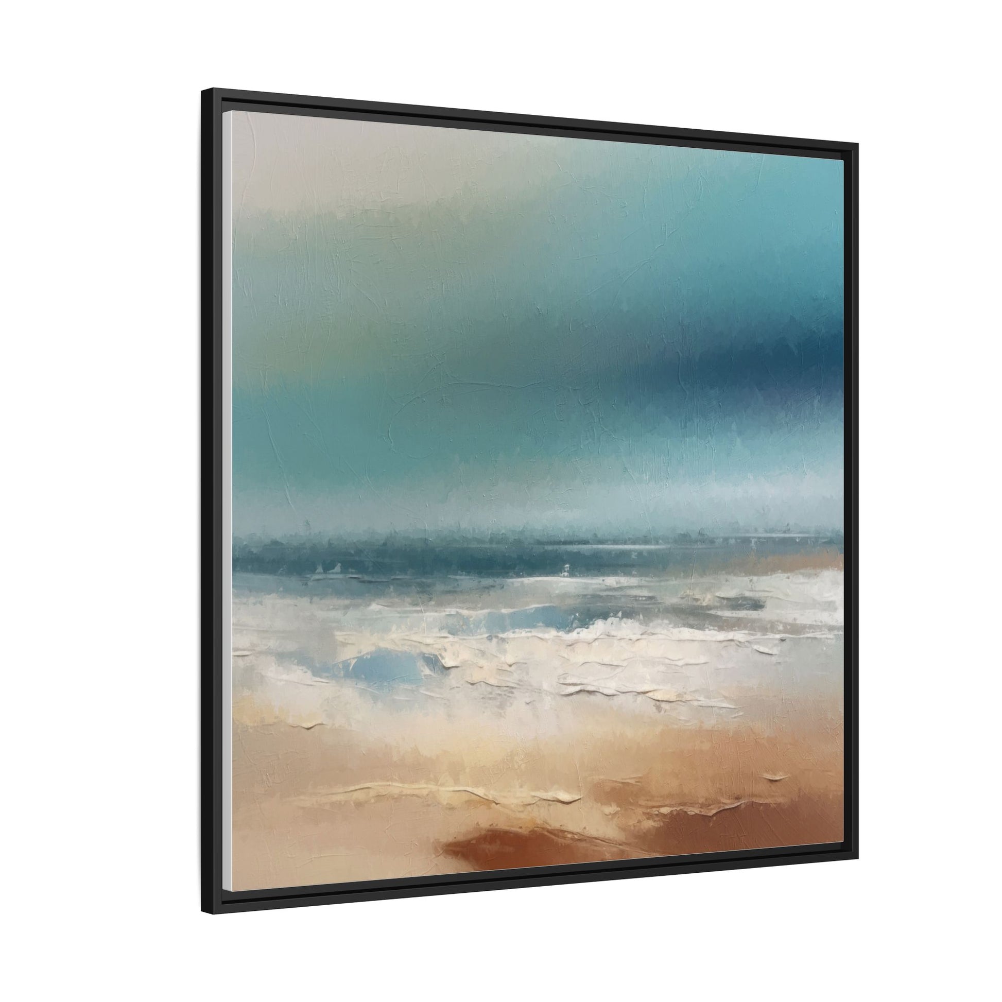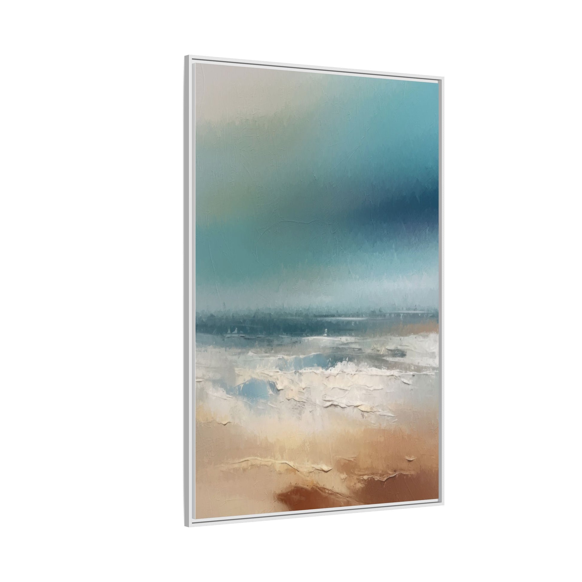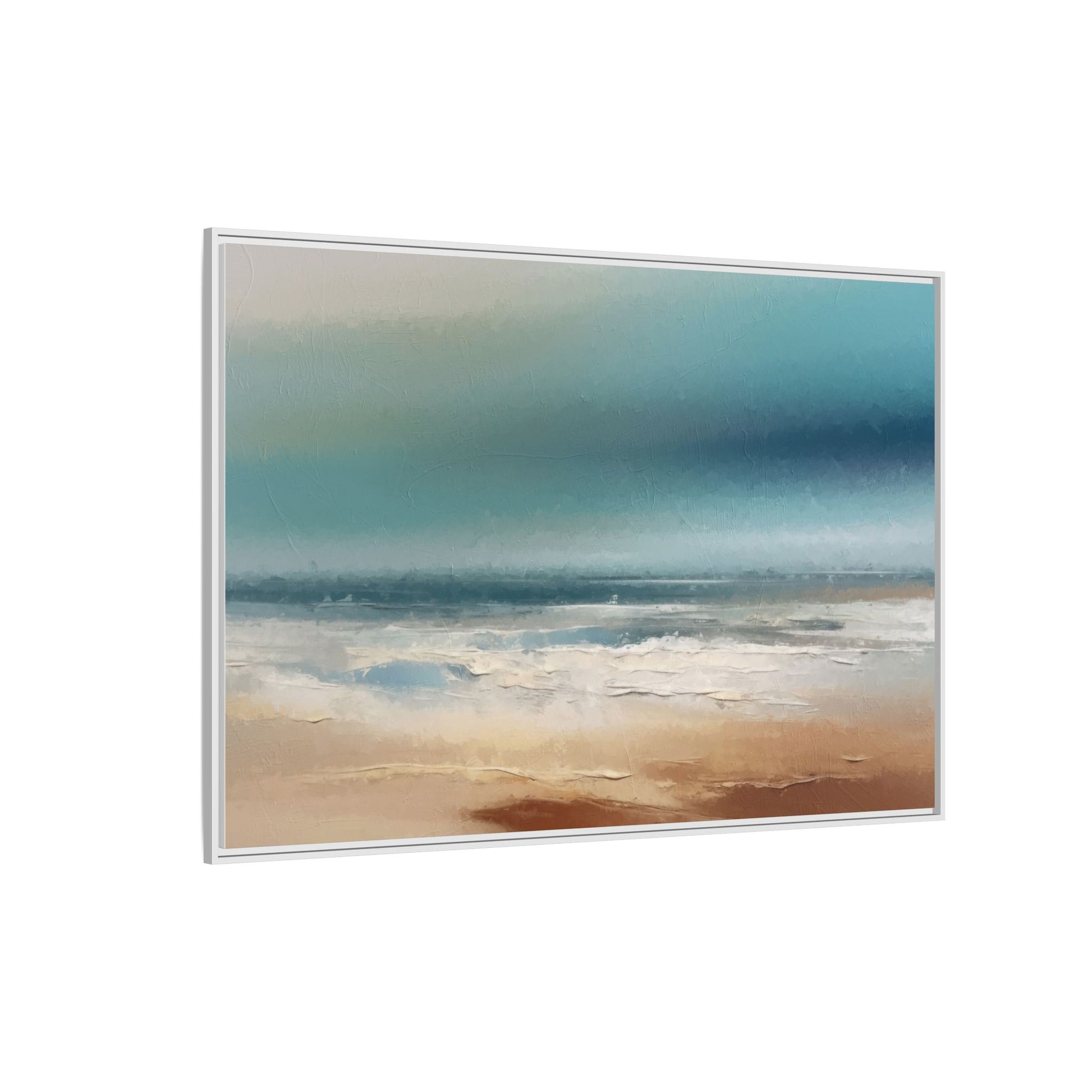 This evocative seascape painting captures a serene coastal scene with a minimalist, impressionistic style. The artwork features a soft, blended palette of muted blues, teals, and sandy browns, creating a tranquil atmosphere. Textured brushstrokes and a misty, ethereal quality give the image a sense of depth and movement, particularly in the rendering of the ocean waves and shoreline. The horizon line is subtly defined, with the sky and sea merging in a dreamy, atmospheric blend of colors. The painting's composition emphasizes the expansive, open nature of the seascape, inviting viewers to feel a sense of calm and contemplation.