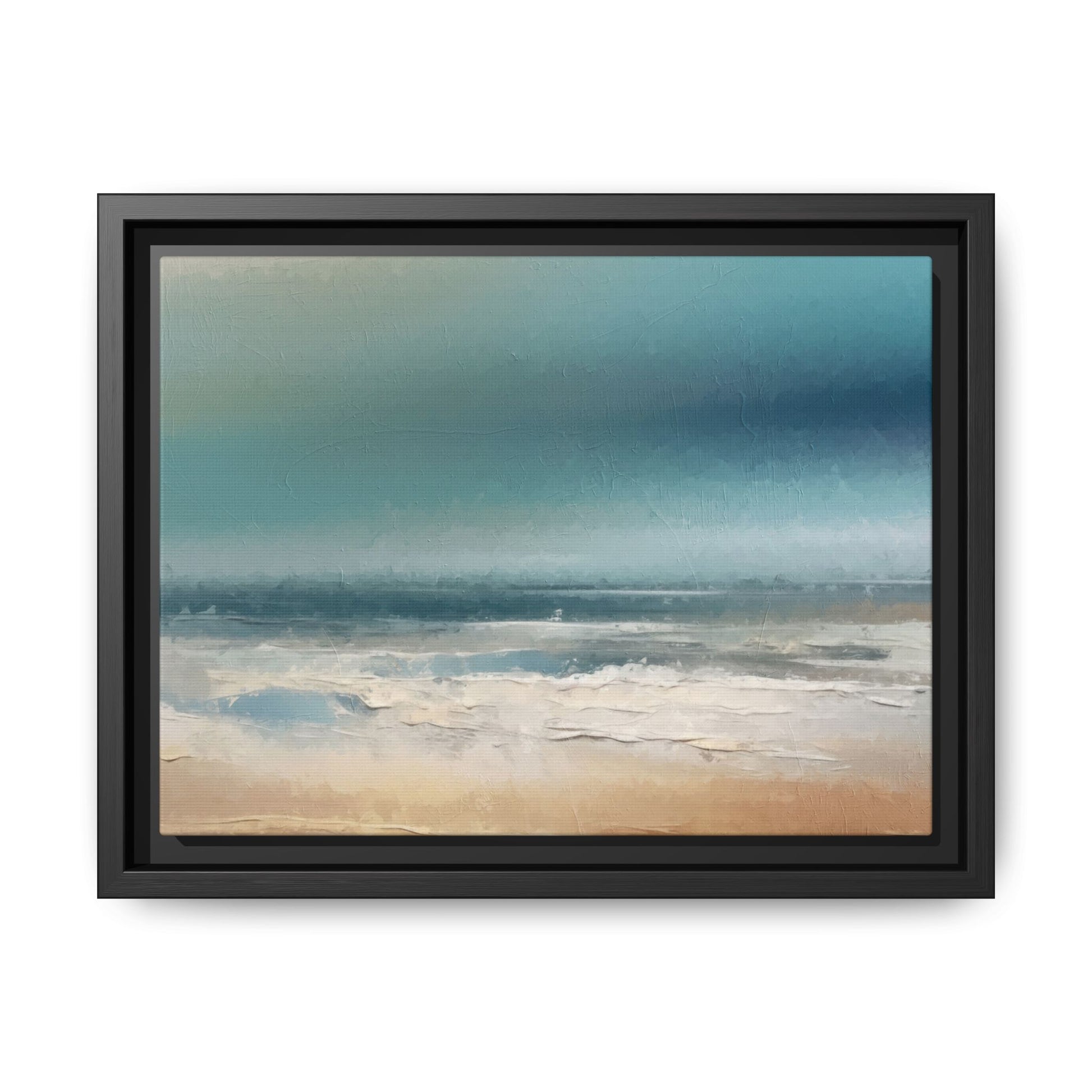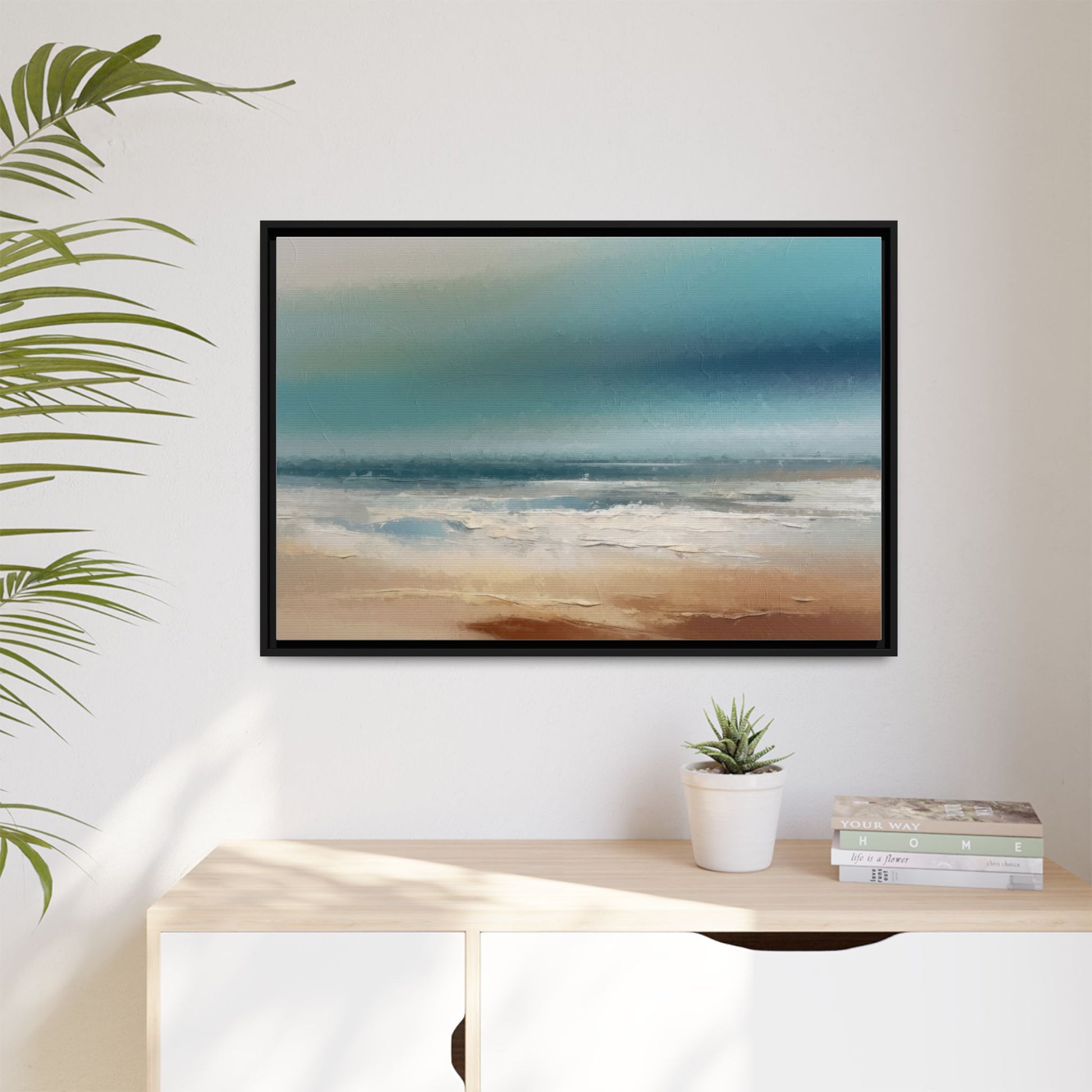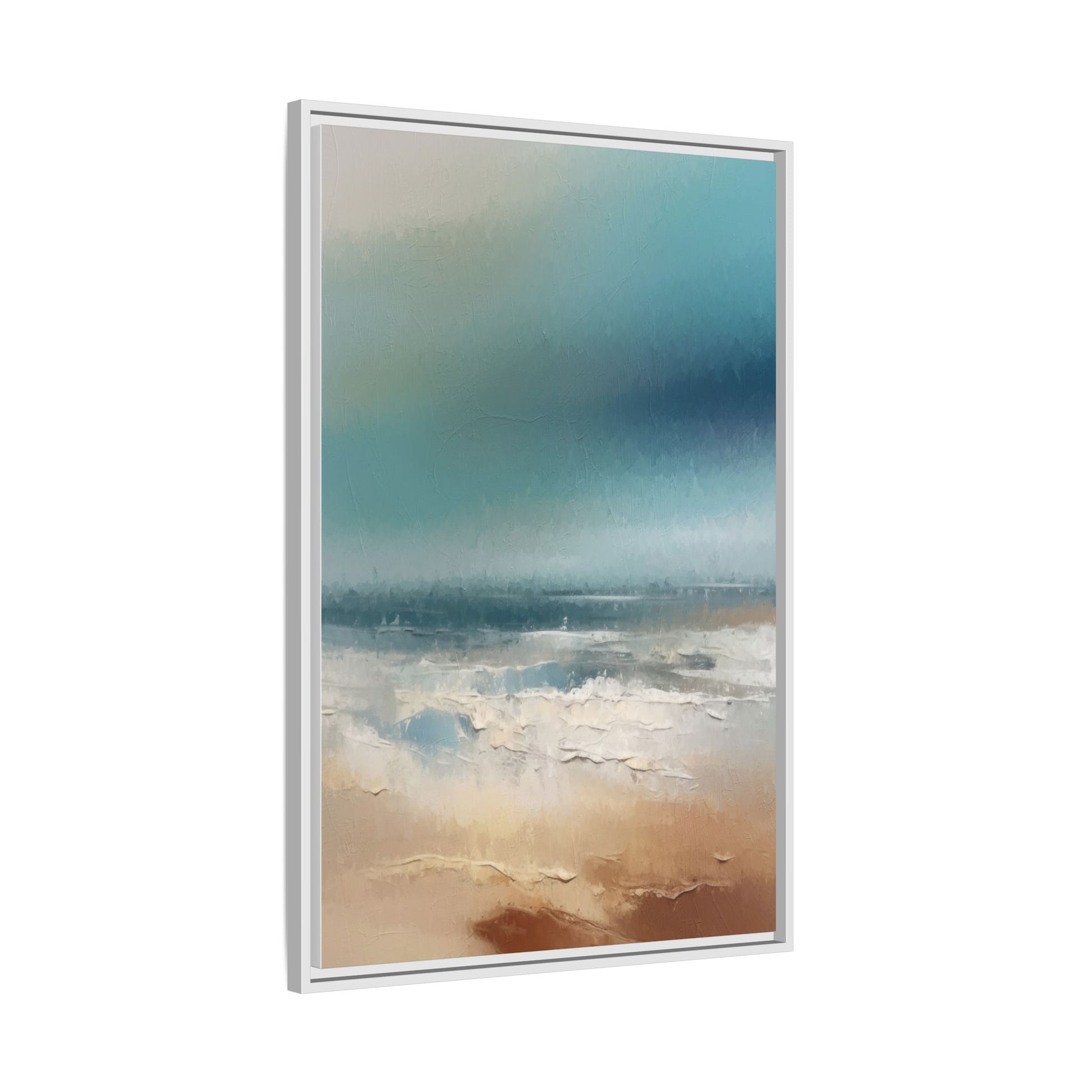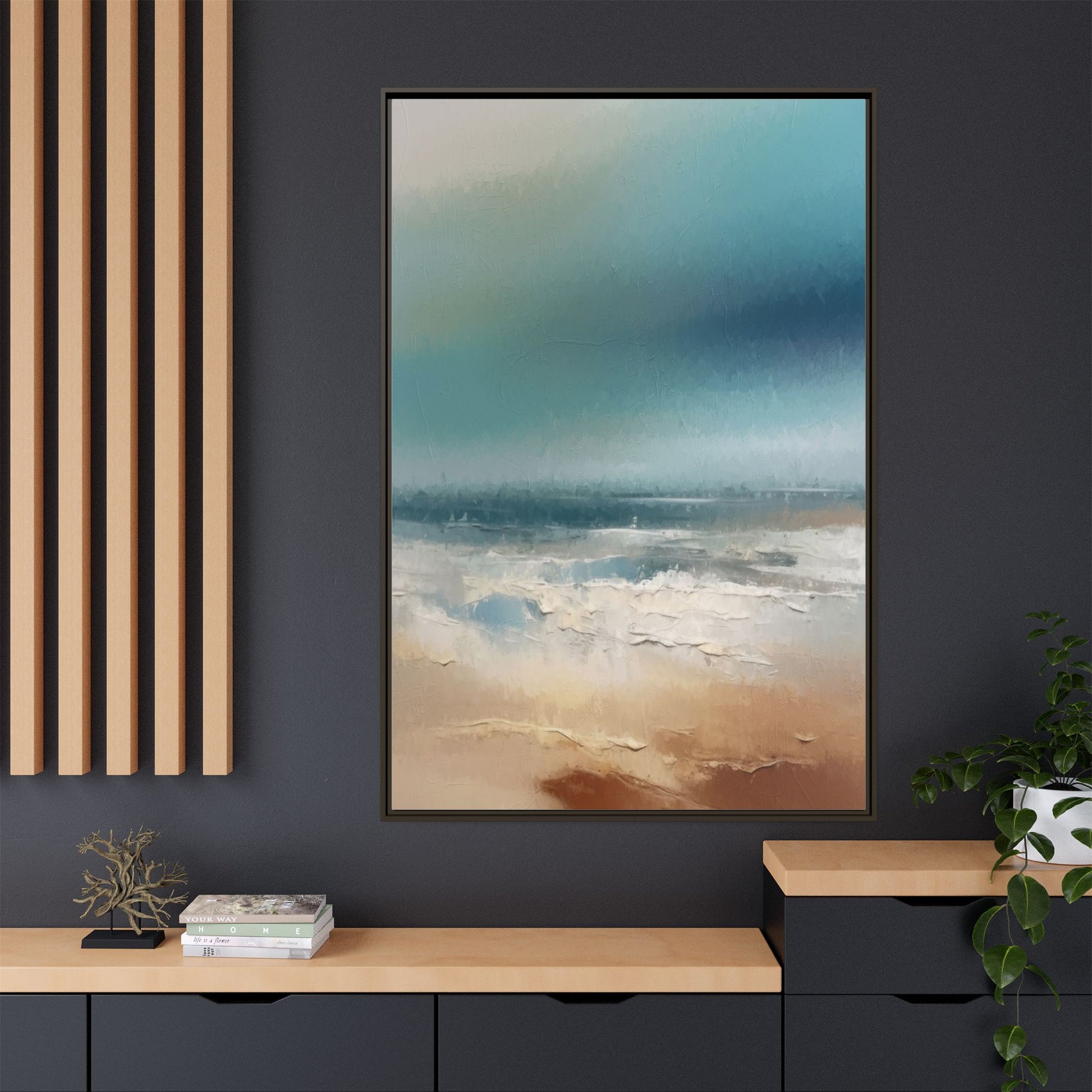 This evocative seascape painting captures a serene coastal scene with a minimalist, impressionistic style. The artwork features a soft, blended palette of muted blues, teals, and sandy browns, creating a tranquil atmosphere. Textured brushstrokes and a misty, ethereal quality give the image a sense of depth and movement, particularly in the rendering of the ocean waves and shoreline. The horizon line is subtly defined, with the sky and sea merging in a dreamy, atmospheric blend of colors. The painting's composition emphasizes the expansive, open nature of the seascape, inviting viewers to feel a sense of calm and contemplation.