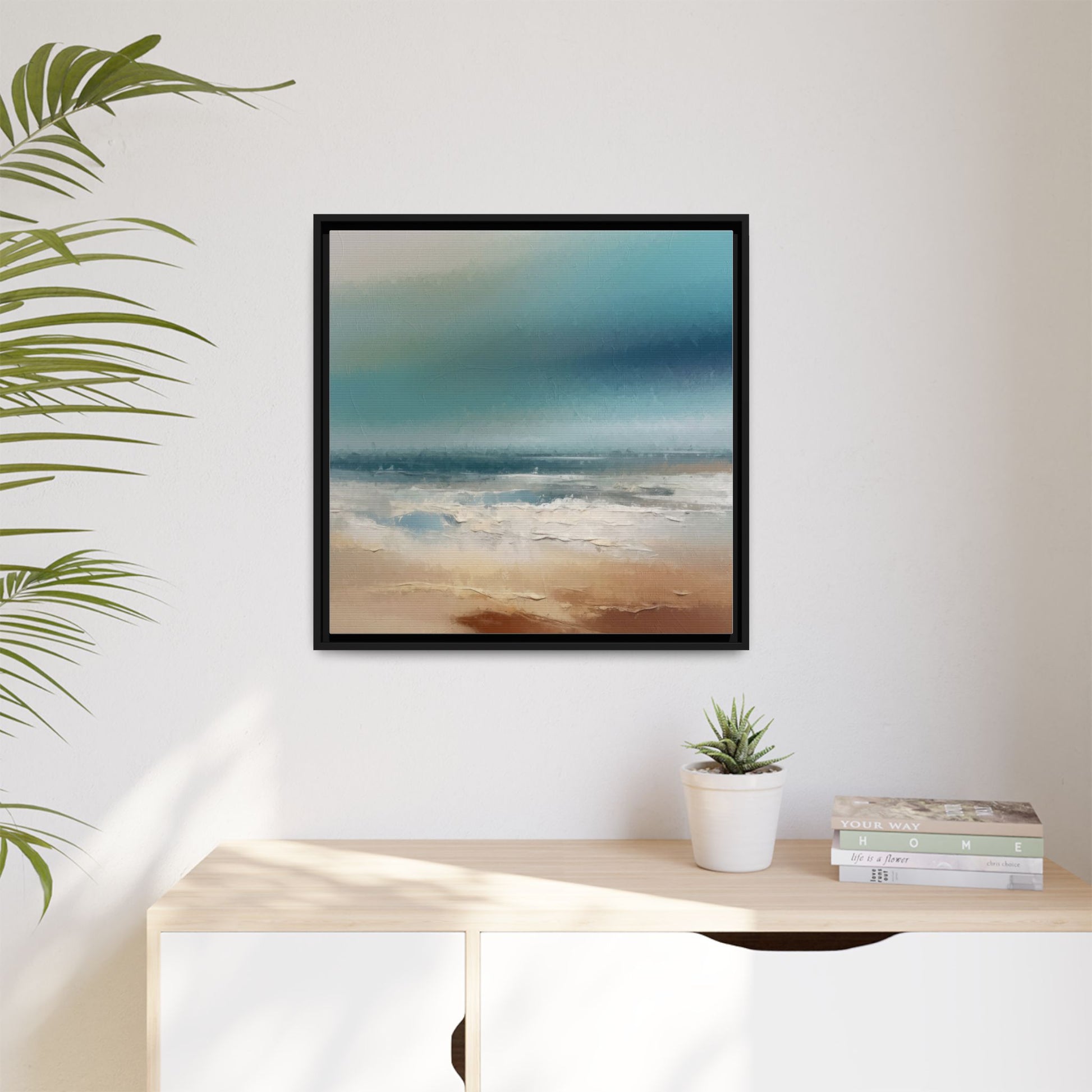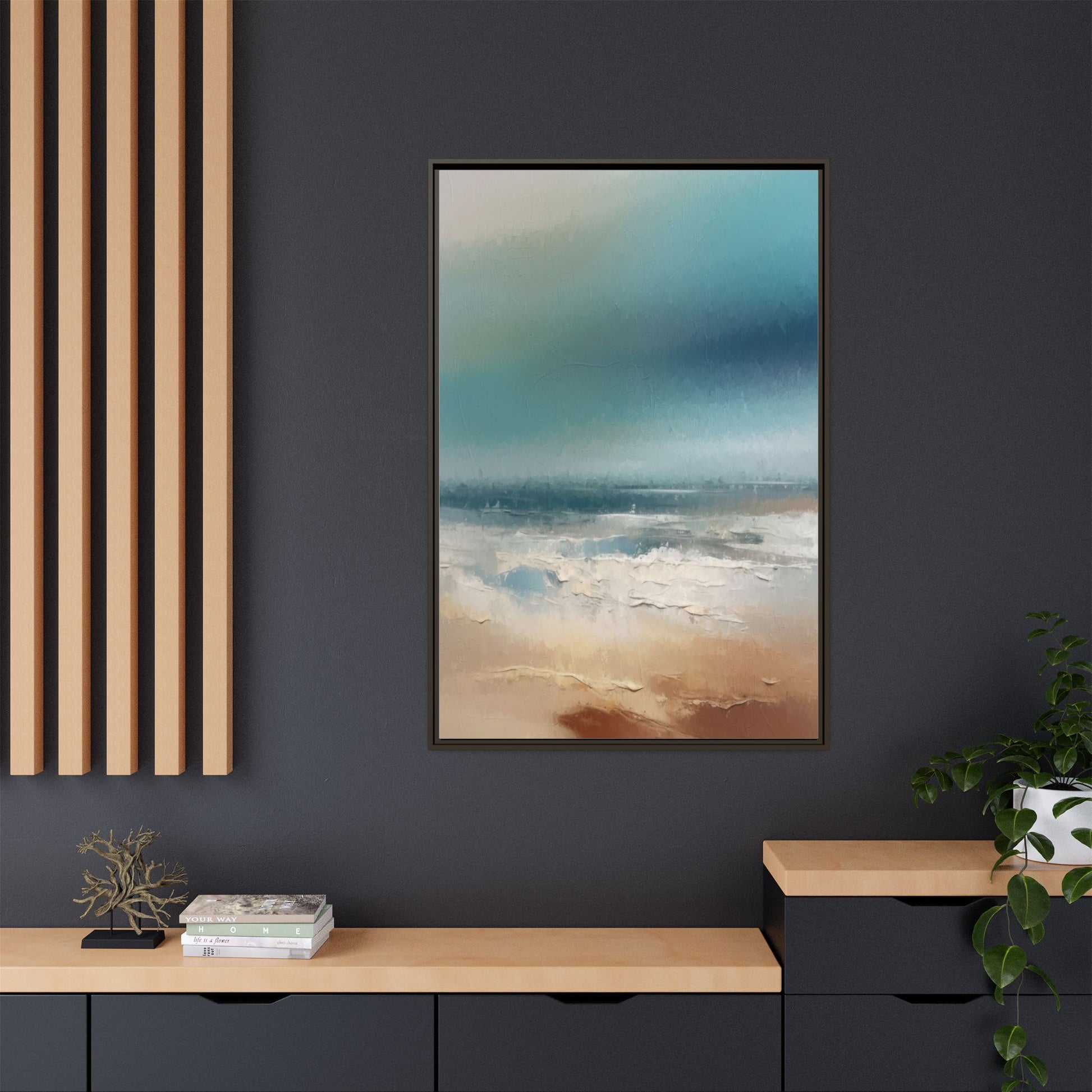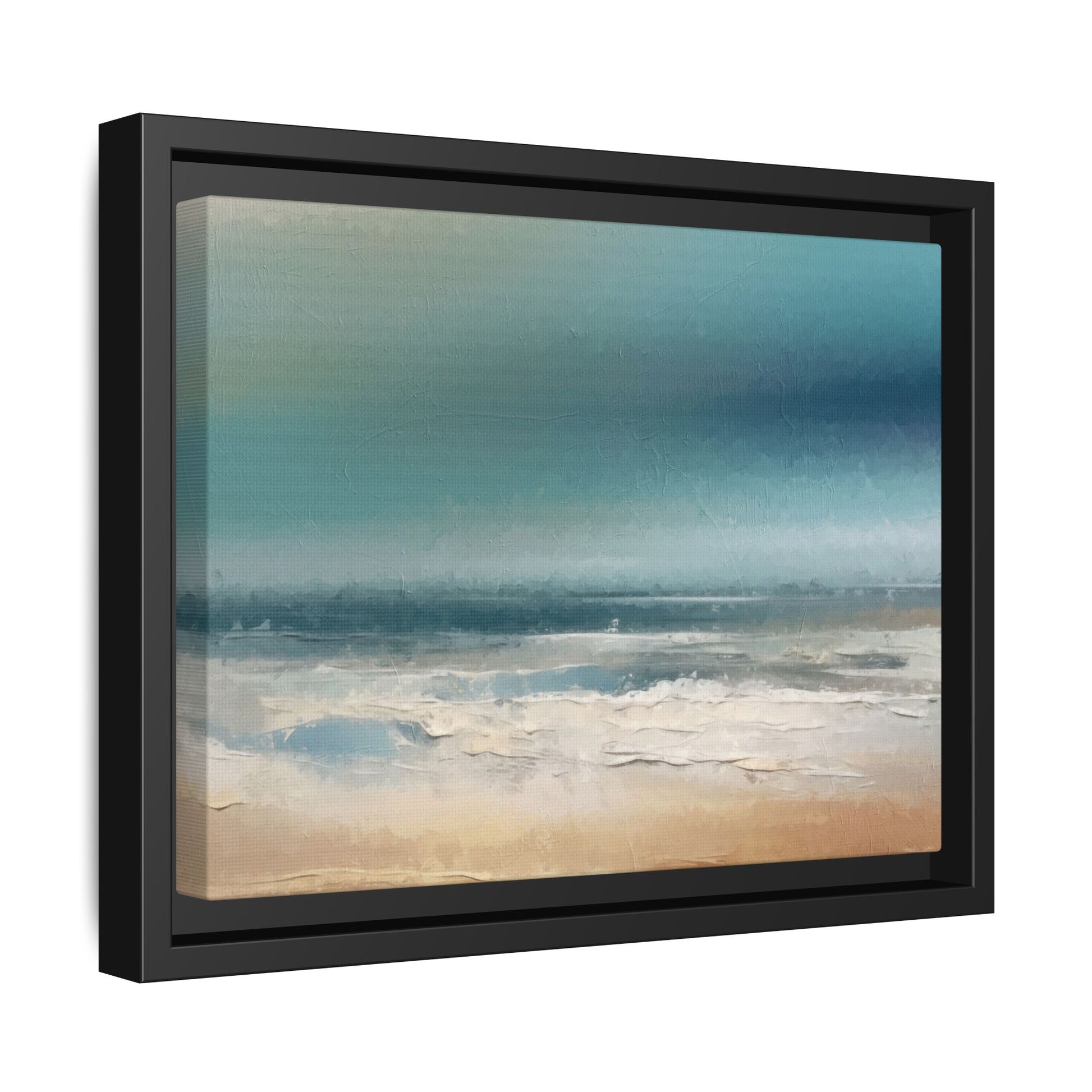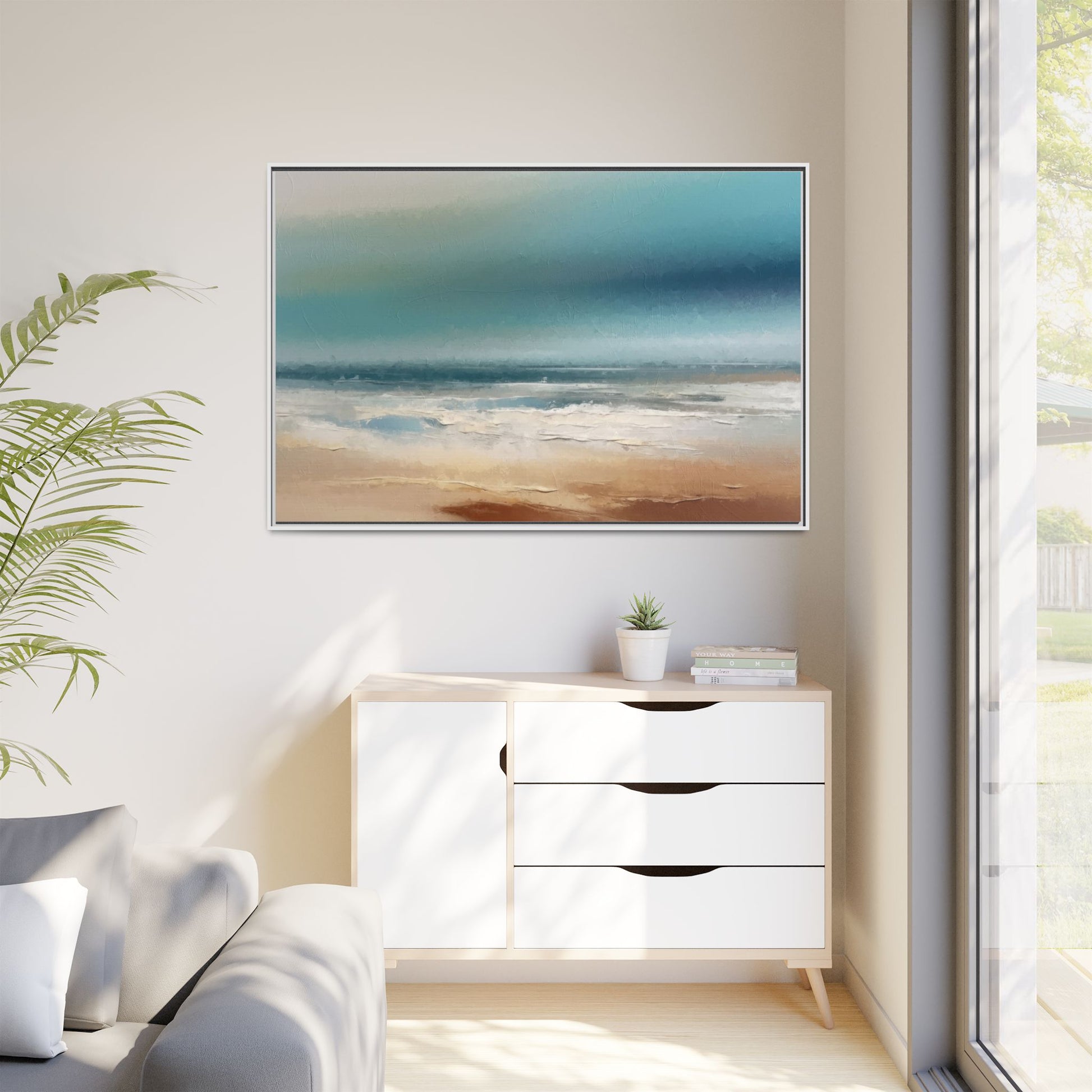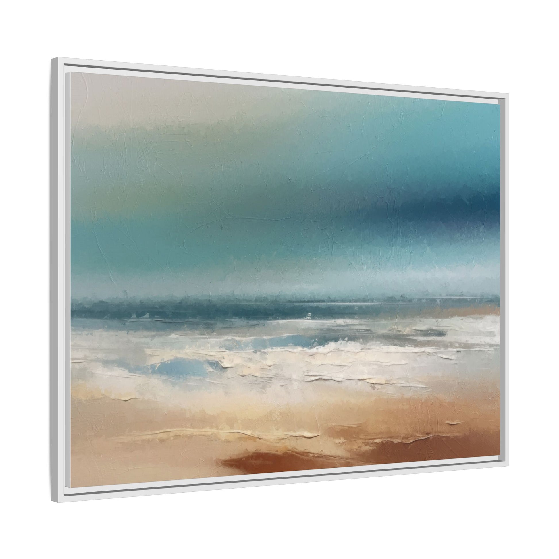 This evocative seascape painting captures a serene coastal scene with a minimalist, impressionistic style. The artwork features a soft, blended palette of muted blues, teals, and sandy browns, creating a tranquil atmosphere. Textured brushstrokes and a misty, ethereal quality give the image a sense of depth and movement, particularly in the rendering of the ocean waves and shoreline. The horizon line is subtly defined, with the sky and sea merging in a dreamy, atmospheric blend of colors. The painting's composition emphasizes the expansive, open nature of the seascape, inviting viewers to feel a sense of calm and contemplation.