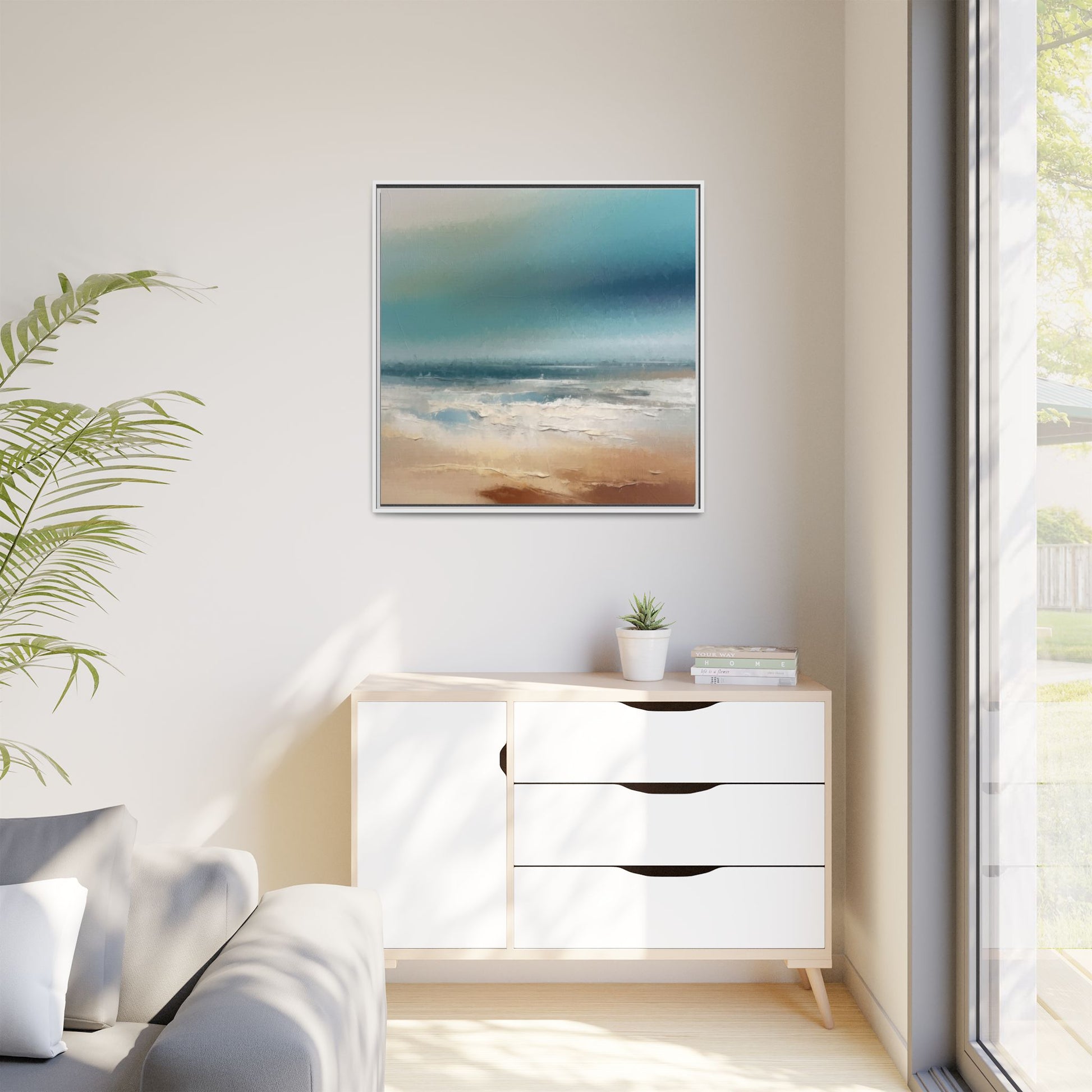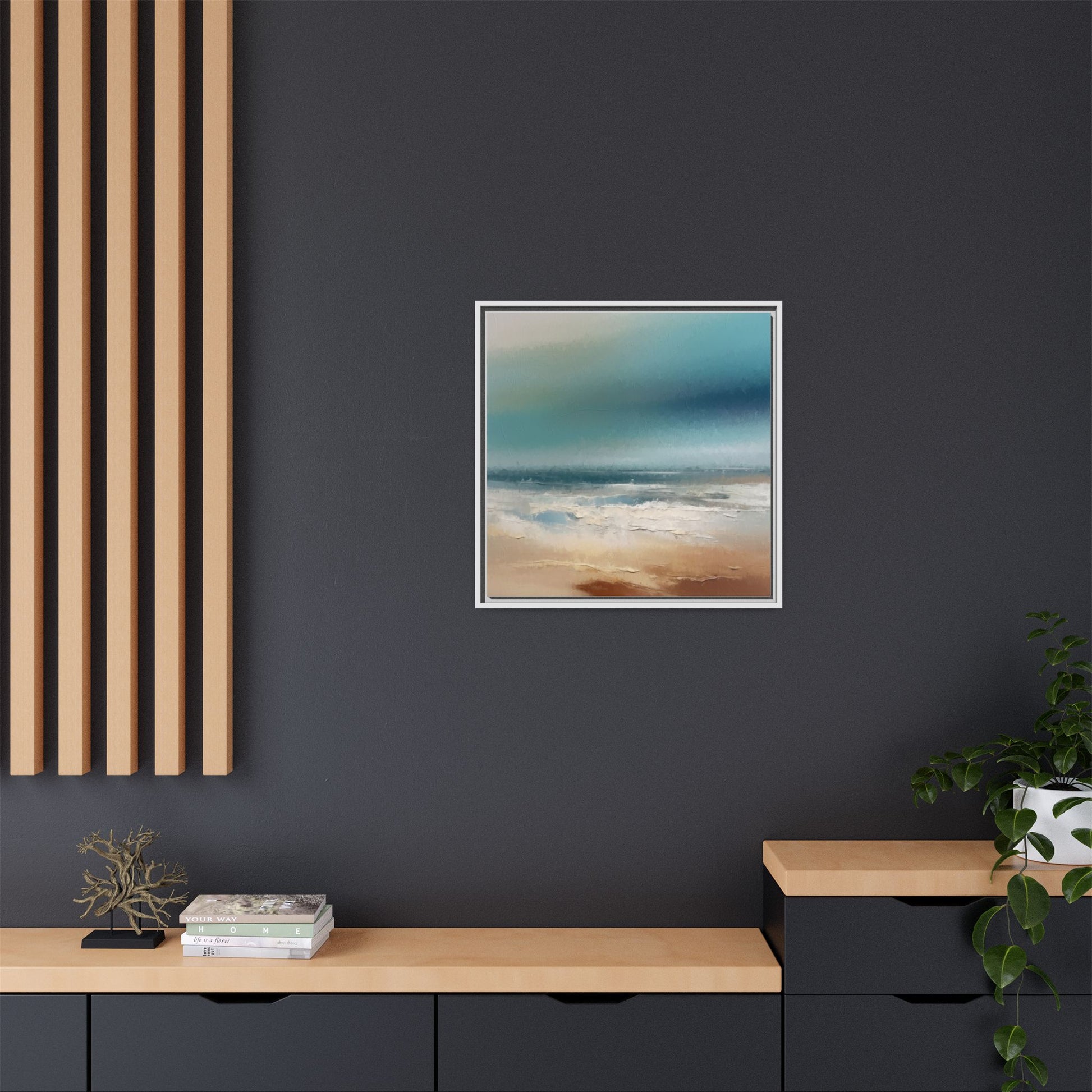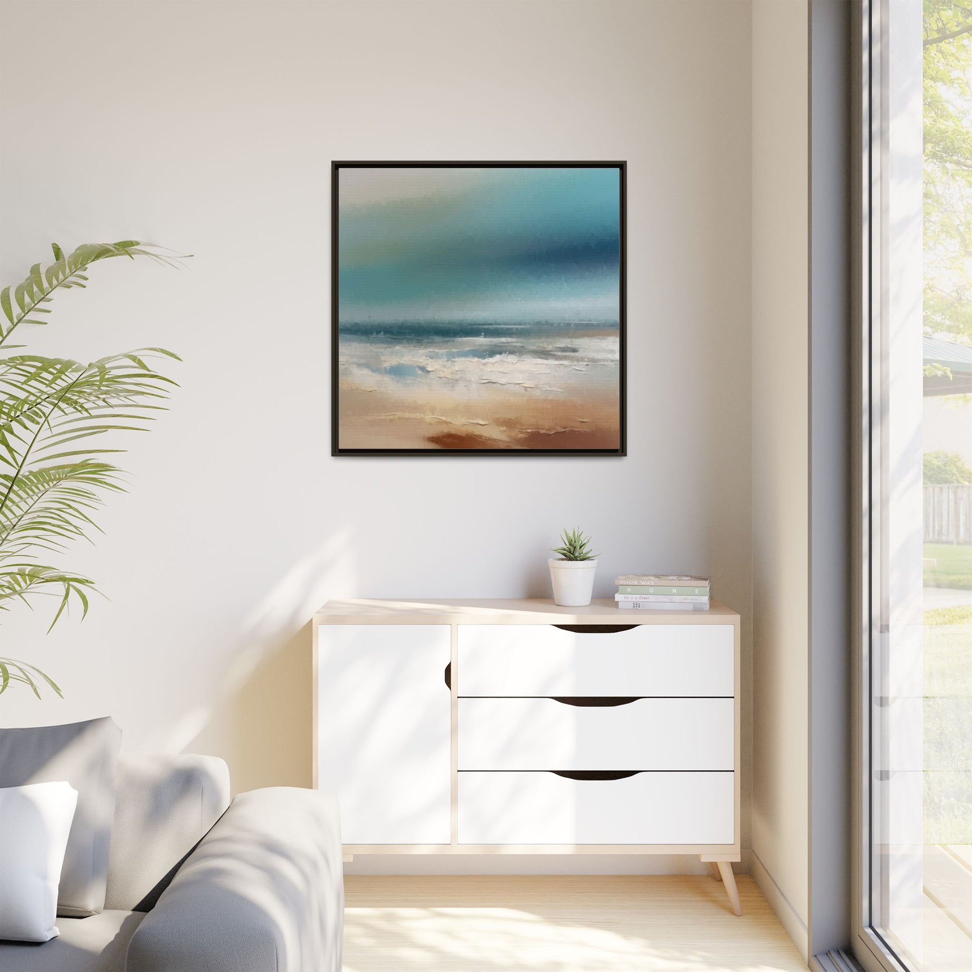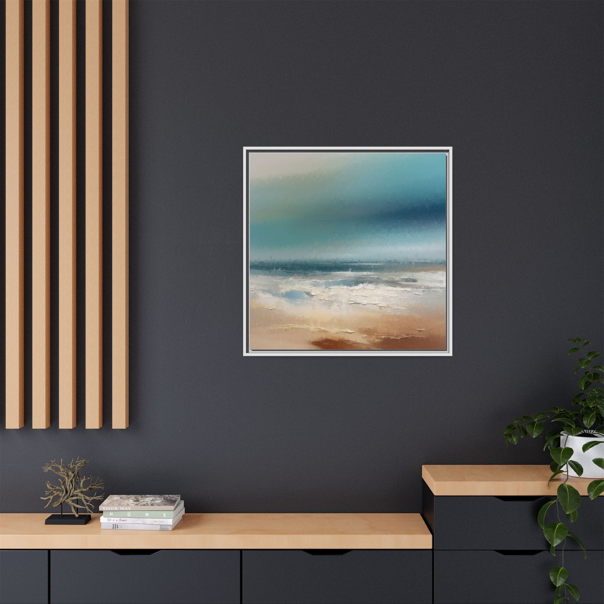This evocative seascape painting captures a serene coastal scene with a minimalist, impressionistic style. The artwork features a soft, blended palette of muted blues, teals, and sandy browns, creating a tranquil atmosphere. Textured brushstrokes and a misty, ethereal quality give the image a sense of depth and movement, particularly in the rendering of the ocean waves and shoreline. The horizon line is subtly defined, with the sky and sea merging in a dreamy, atmospheric blend of colors. The painting's composition emphasizes the expansive, open nature of the seascape, inviting viewers to feel a sense of calm and contemplation.