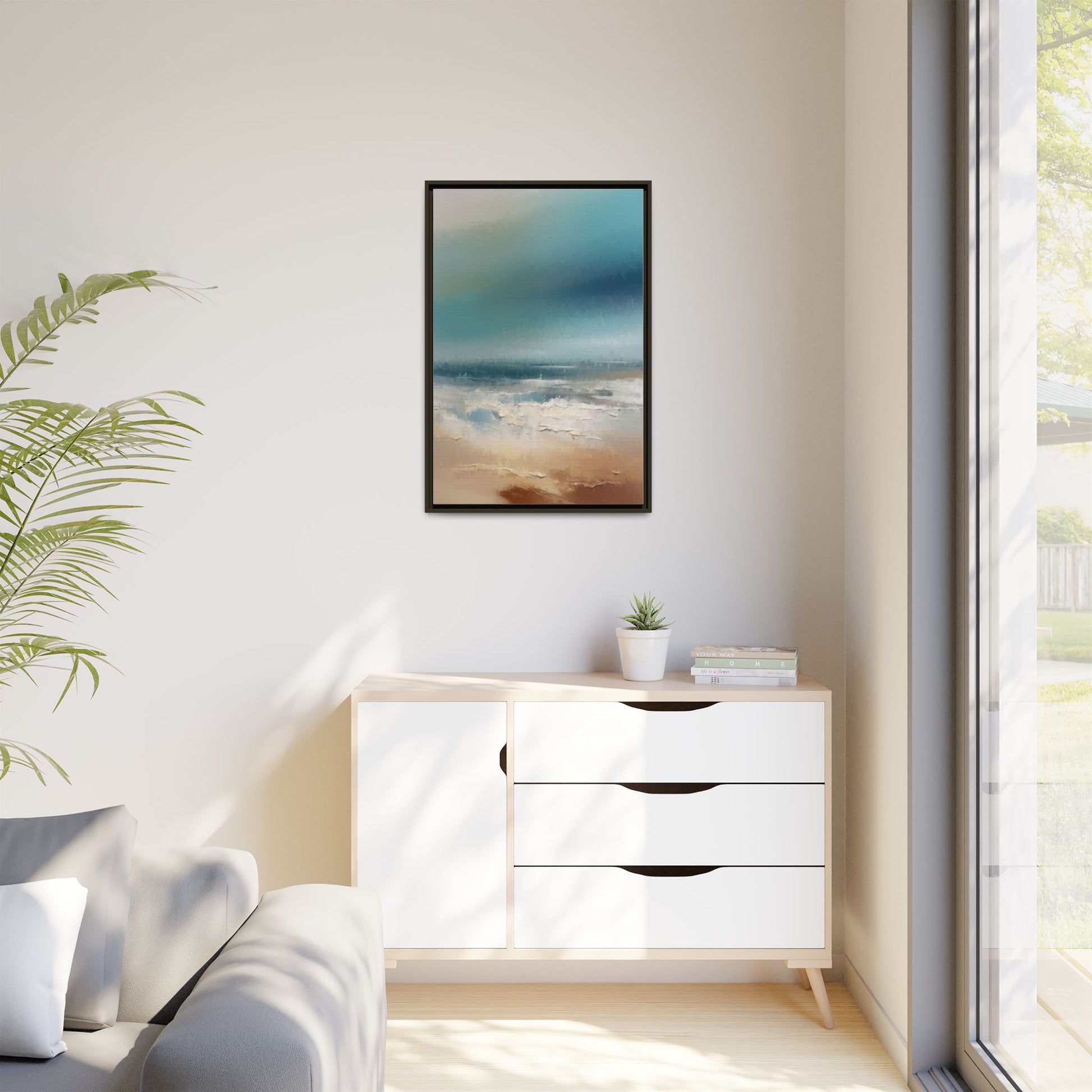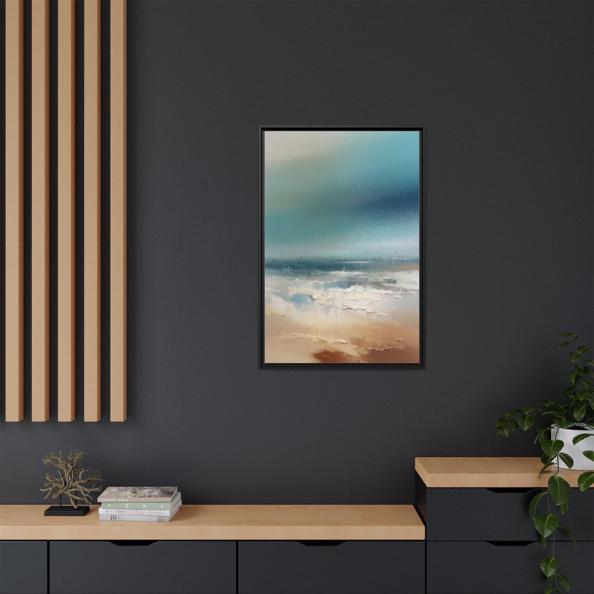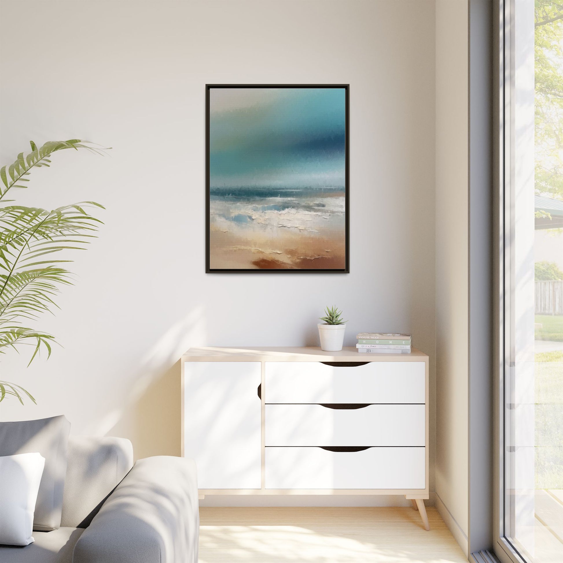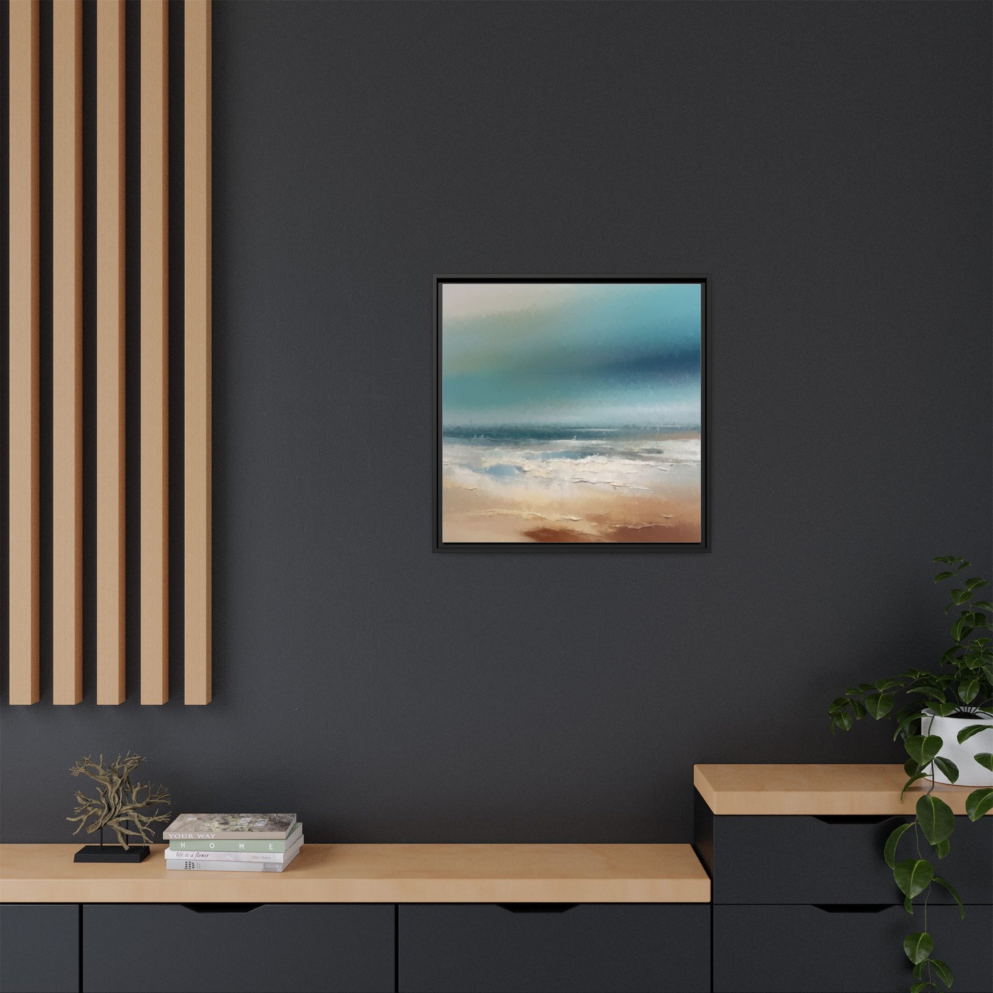 This evocative seascape painting captures a serene coastal scene with a minimalist, impressionistic style. The artwork features a soft, blended palette of muted blues, teals, and sandy browns, creating a tranquil atmosphere. Textured brushstrokes and a misty, ethereal quality give the image a sense of depth and movement, particularly in the rendering of the ocean waves and shoreline. The horizon line is subtly defined, with the sky and sea merging in a dreamy, atmospheric blend of colors. The painting's composition emphasizes the expansive, open nature of the seascape, inviting viewers to feel a sense of calm and contemplation.