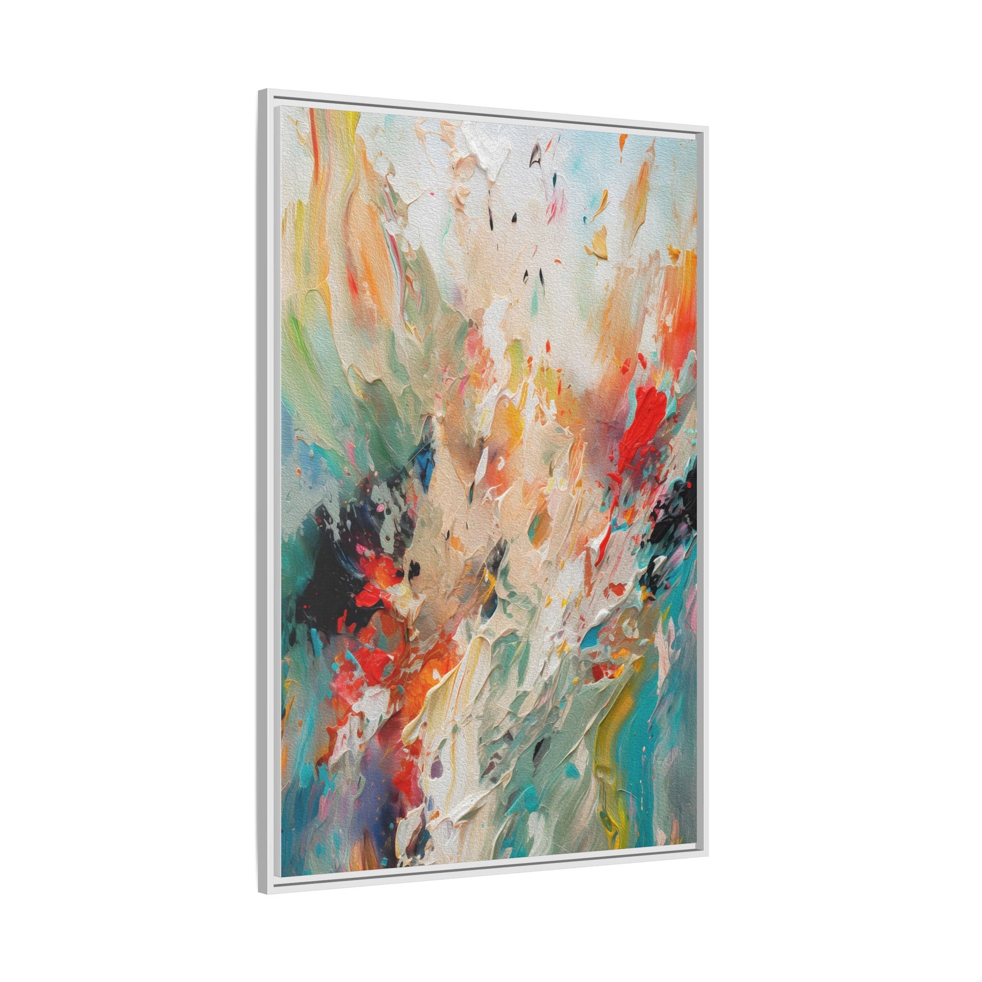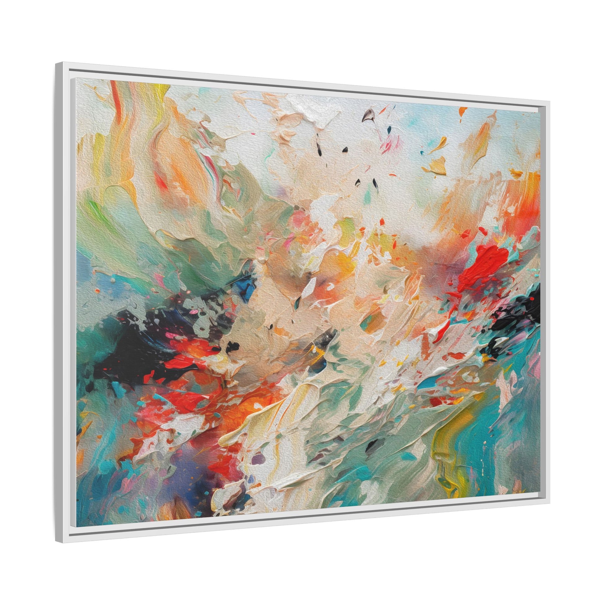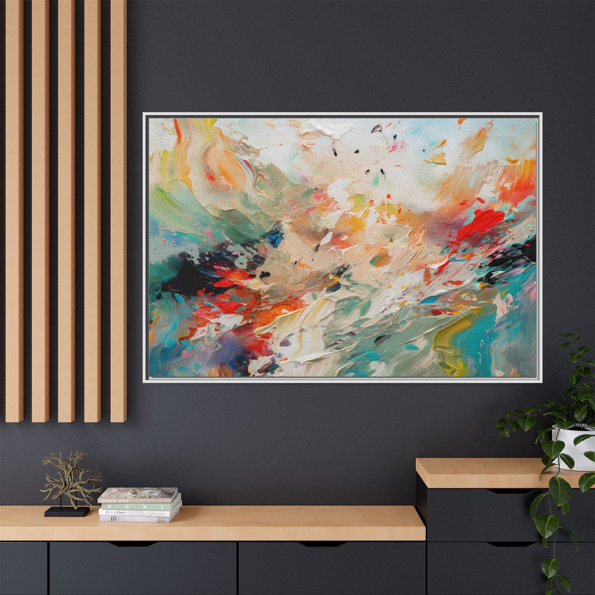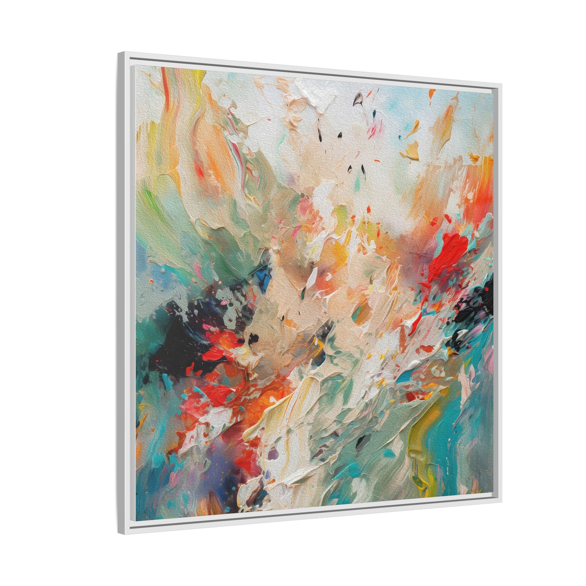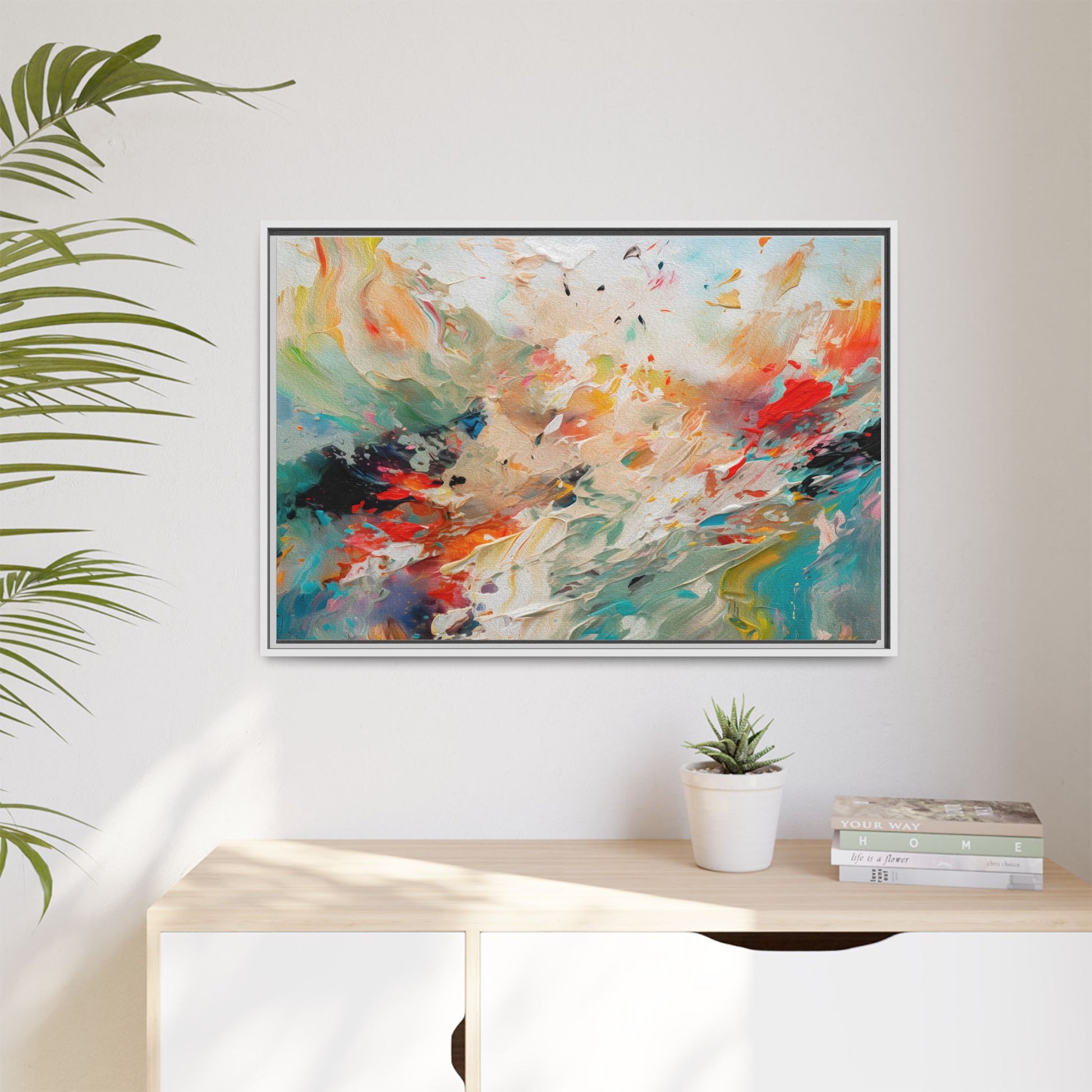 This vibrant abstract painting is a dynamic explosion of color and movement, featuring a sweeping composition of blended hues and textured brushstrokes. The artwork incorporates a rich palette of turquoise, red, orange, yellow, green, and white, creating a sense of energy and spontaneity. Layers of paint appear to be dynamically splashed and swirled across the canvas, giving the piece a sense of fluid motion and emotional intensity. Thick, impasto-like paint applications create depth and texture, with colors seemingly melting and interacting with each other in organic, unpredictable patterns. The painting evokes a sense of controlled chaos, with sharp and soft edges blending together to create a visually compelling and emotionally evocative abstract landscape.
