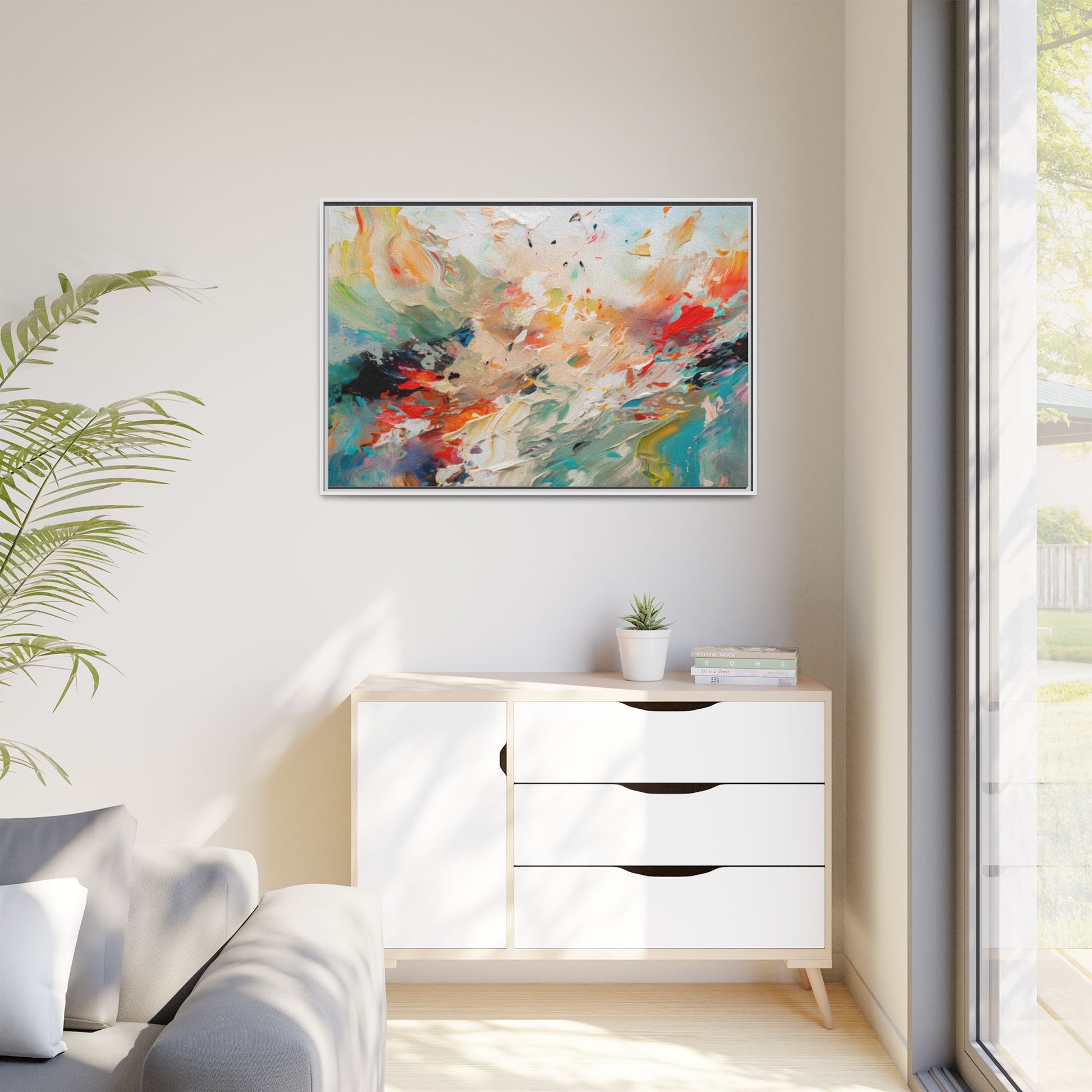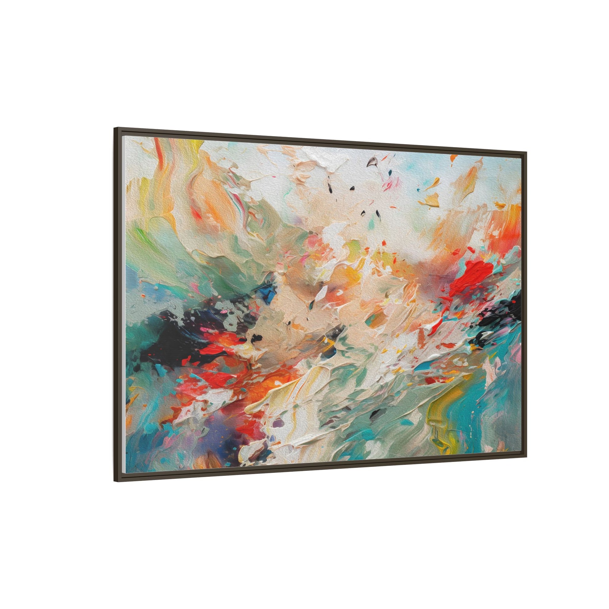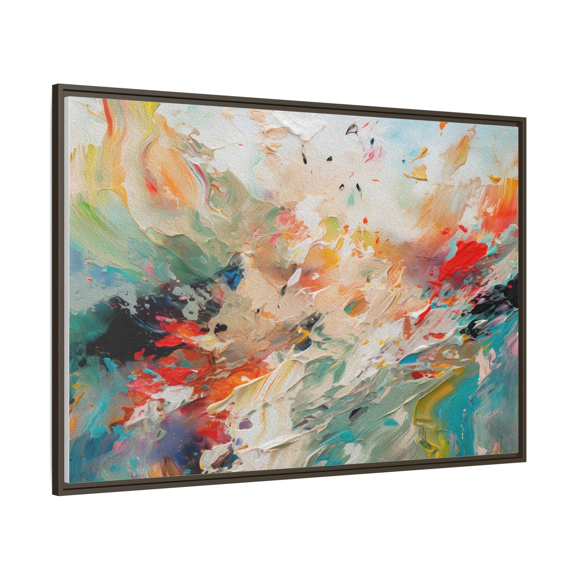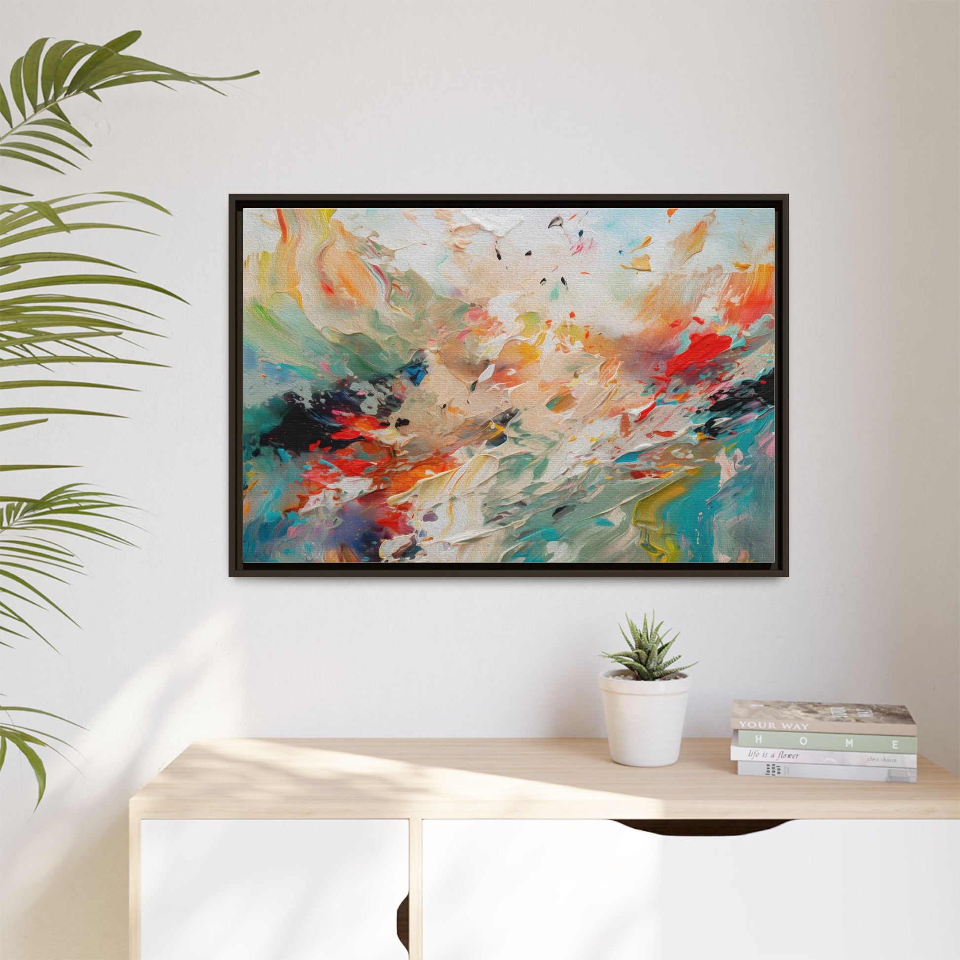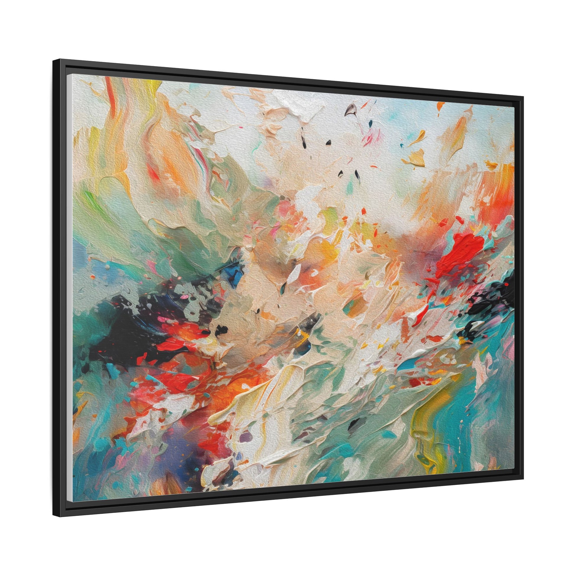 This vibrant abstract painting is a dynamic explosion of color and movement, featuring a sweeping composition of blended hues and textured brushstrokes. The artwork incorporates a rich palette of turquoise, red, orange, yellow, green, and white, creating a sense of energy and spontaneity. Layers of paint appear to be dynamically splashed and swirled across the canvas, giving the piece a sense of fluid motion and emotional intensity. Thick, impasto-like paint applications create depth and texture, with colors seemingly melting and interacting with each other in organic, unpredictable patterns. The painting evokes a sense of controlled chaos, with sharp and soft edges blending together to create a visually compelling and emotionally evocative abstract landscape.