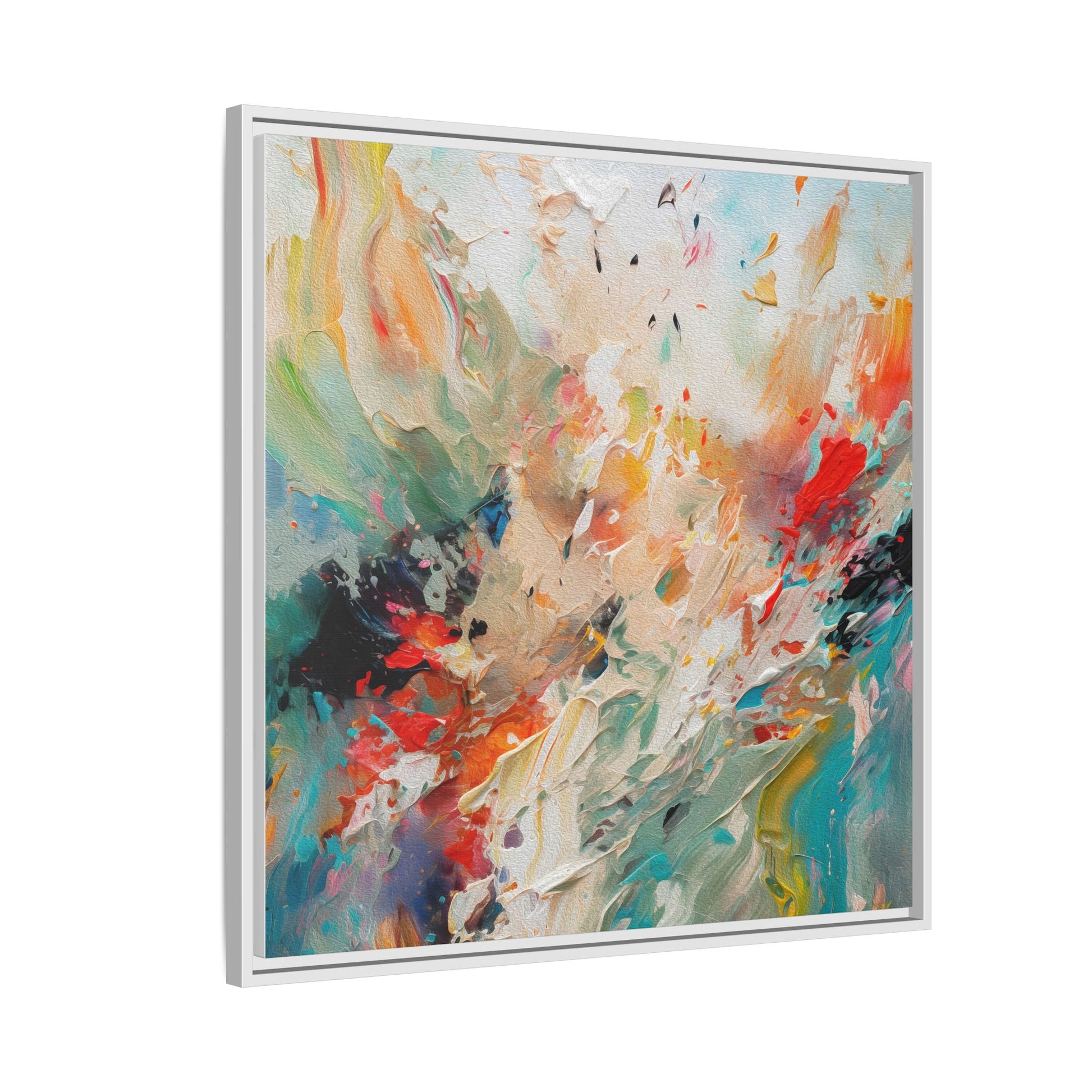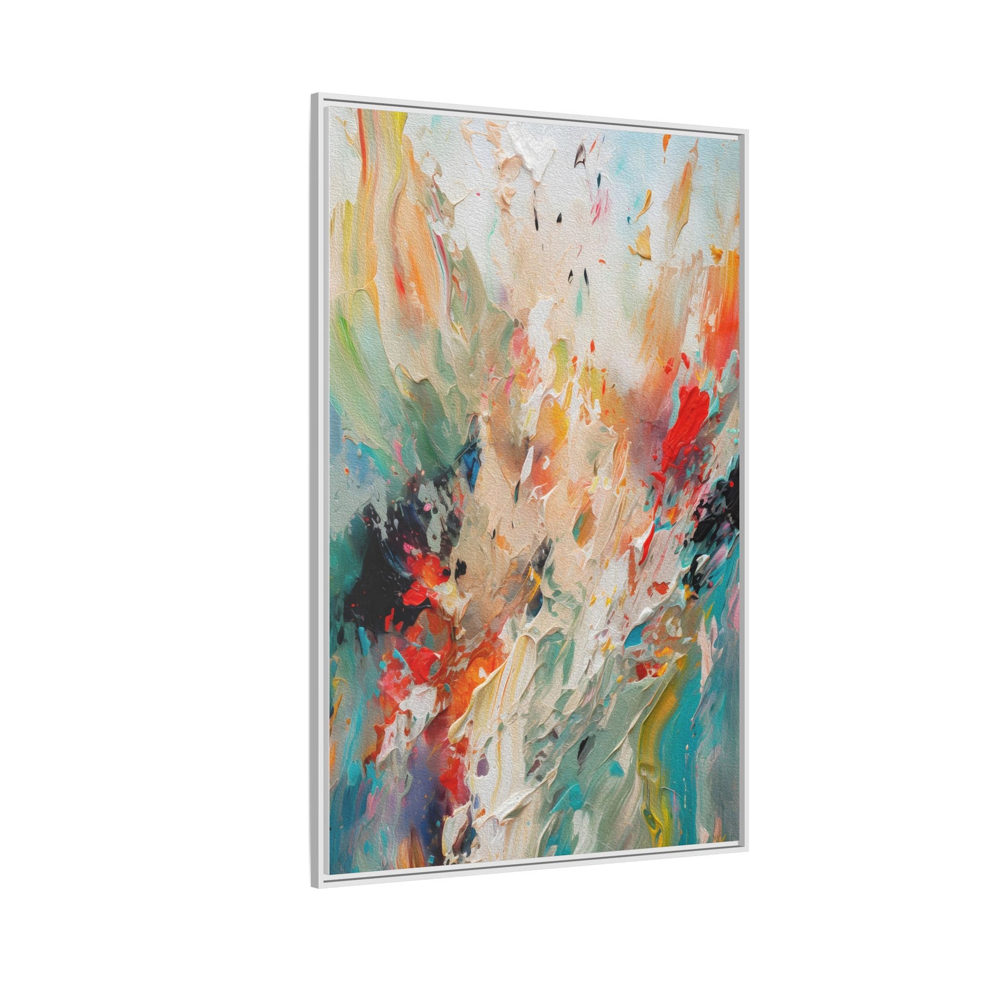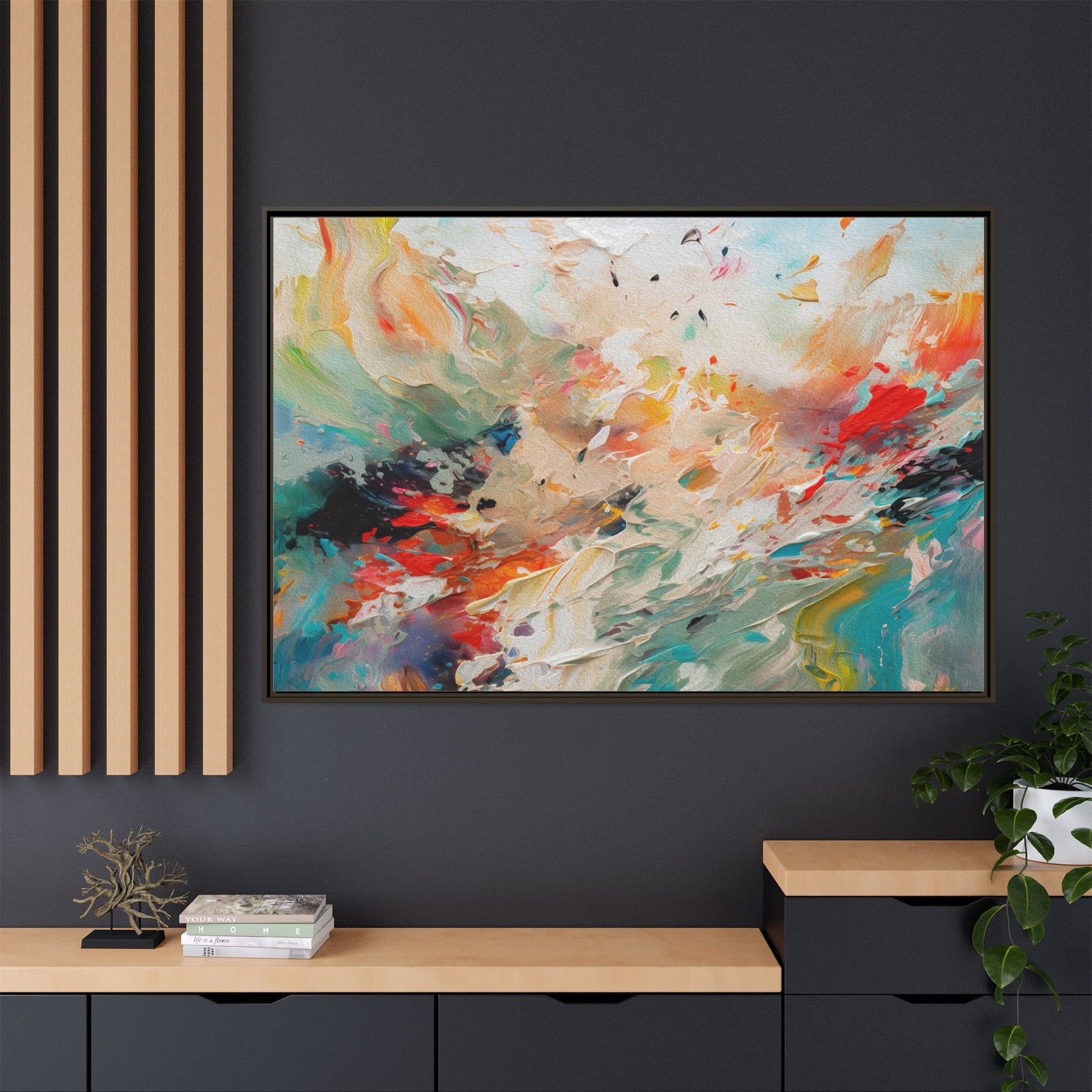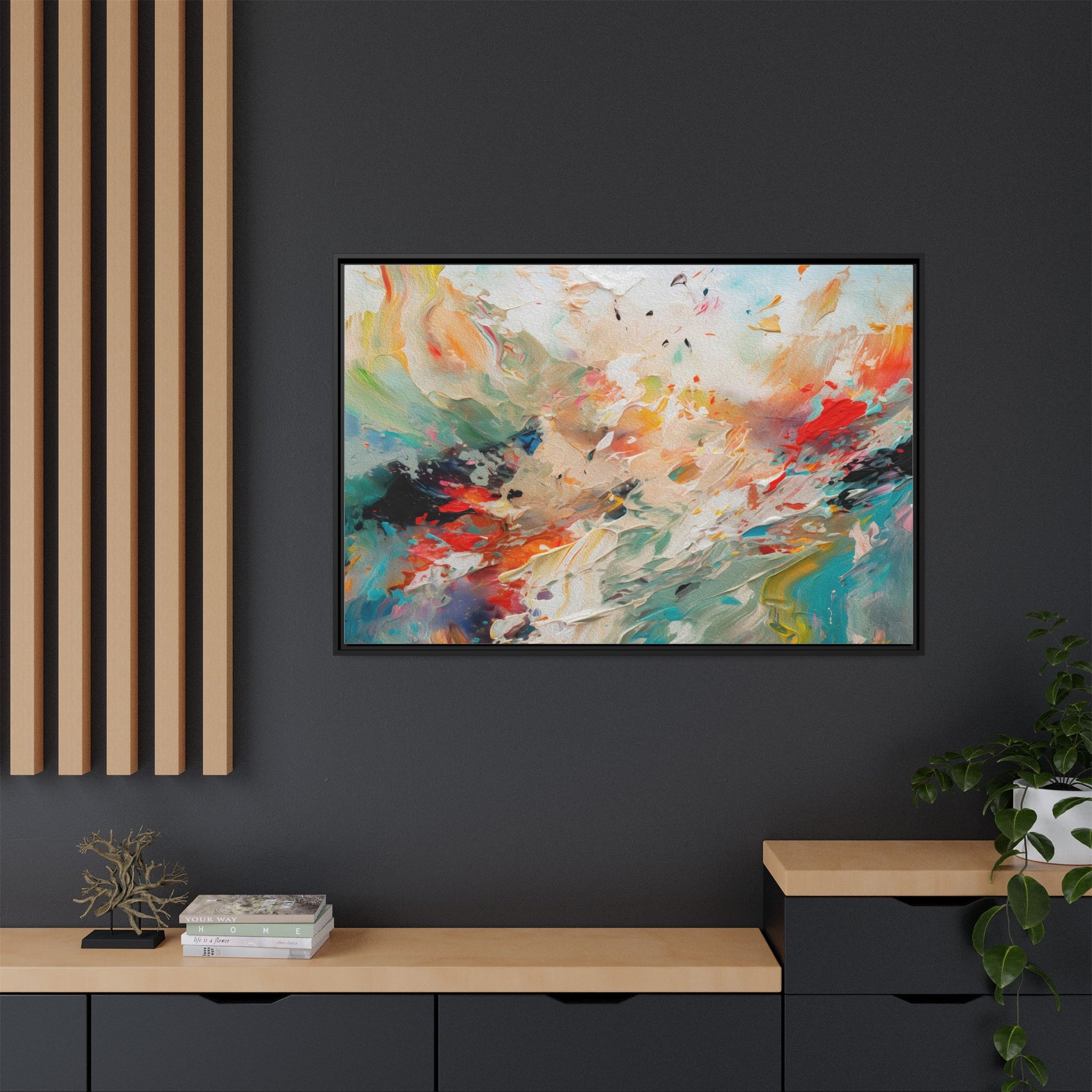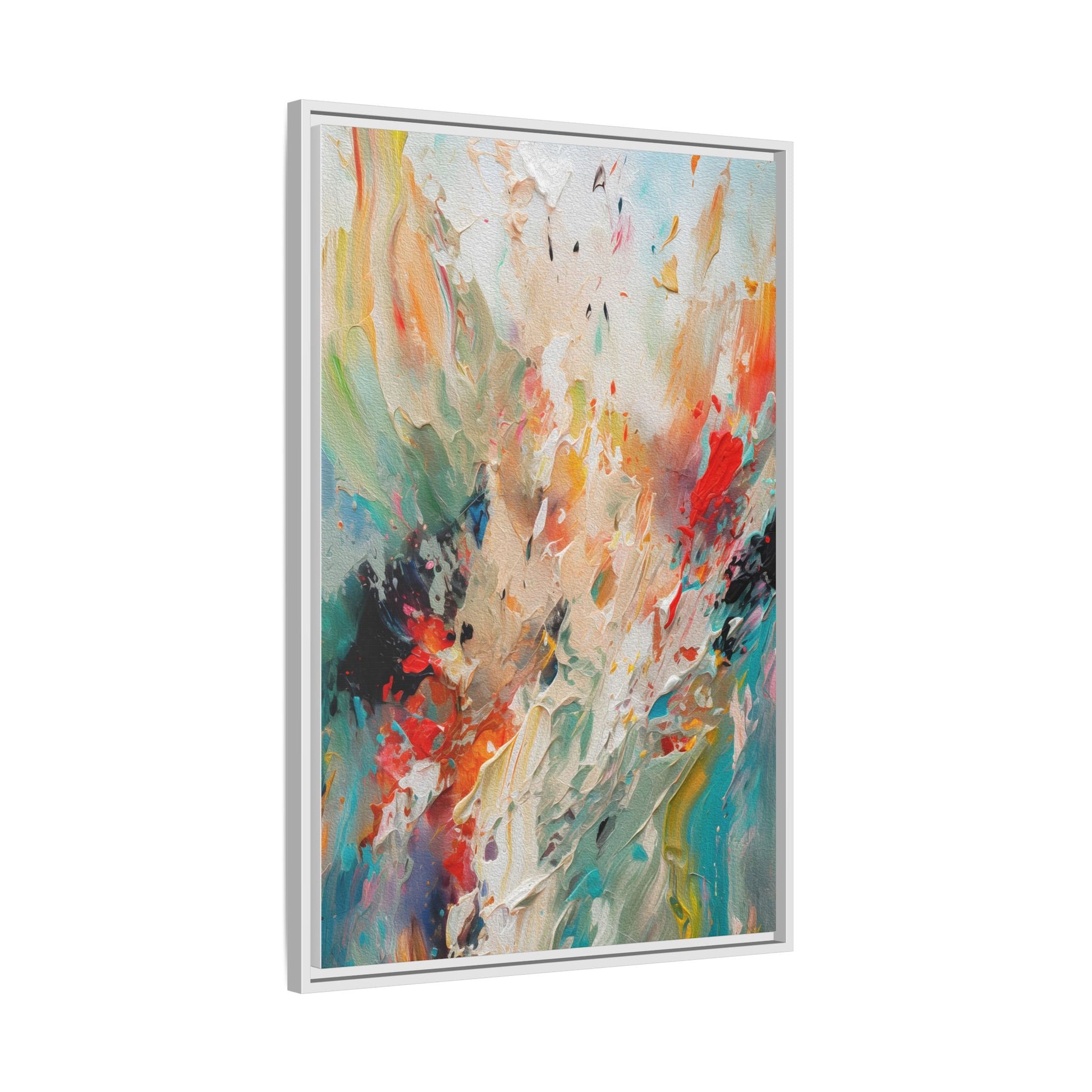 This vibrant abstract painting is a dynamic explosion of color and movement, featuring a sweeping composition of blended hues and textured brushstrokes. The artwork incorporates a rich palette of turquoise, red, orange, yellow, green, and white, creating a sense of energy and spontaneity. Layers of paint appear to be dynamically splashed and swirled across the canvas, giving the piece a sense of fluid motion and emotional intensity. Thick, impasto-like paint applications create depth and texture, with colors seemingly melting and interacting with each other in organic, unpredictable patterns. The painting evokes a sense of controlled chaos, with sharp and soft edges blending together to create a visually compelling and emotionally evocative abstract landscape.