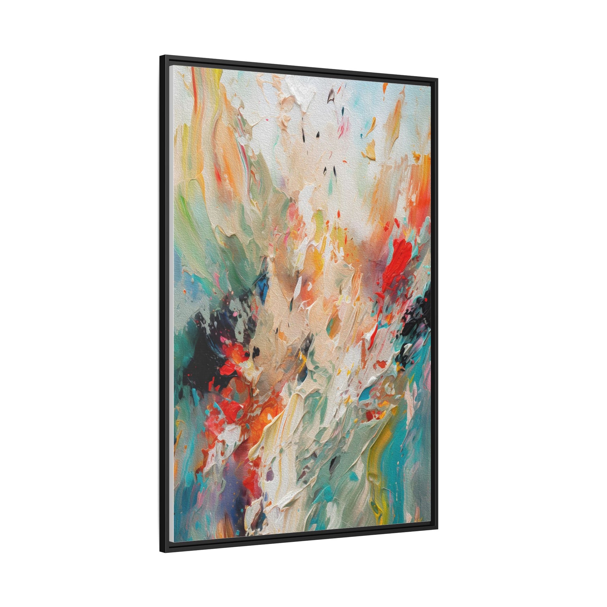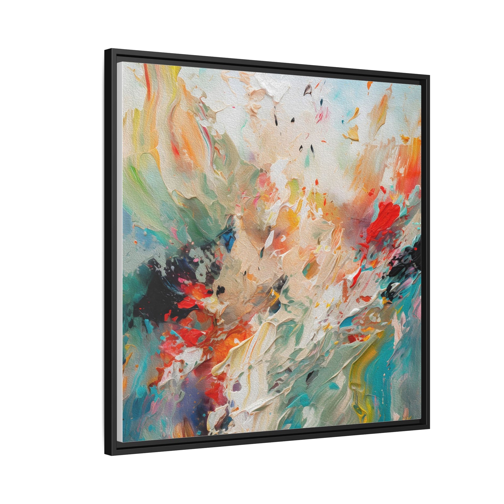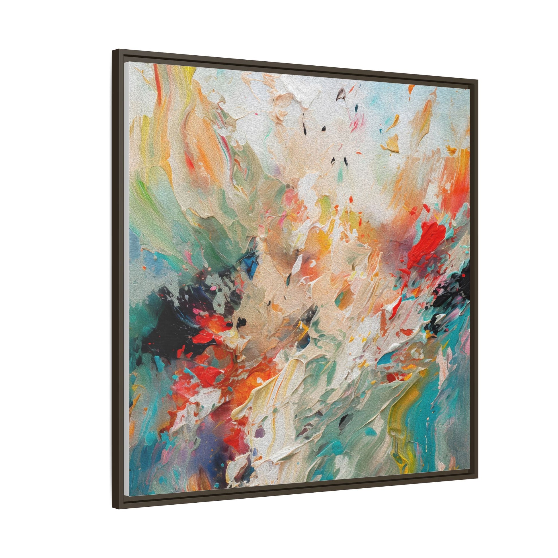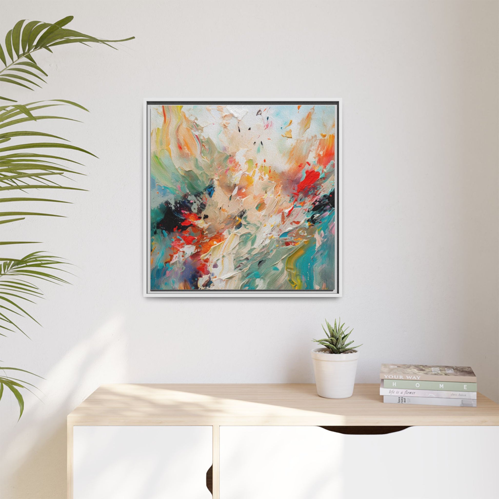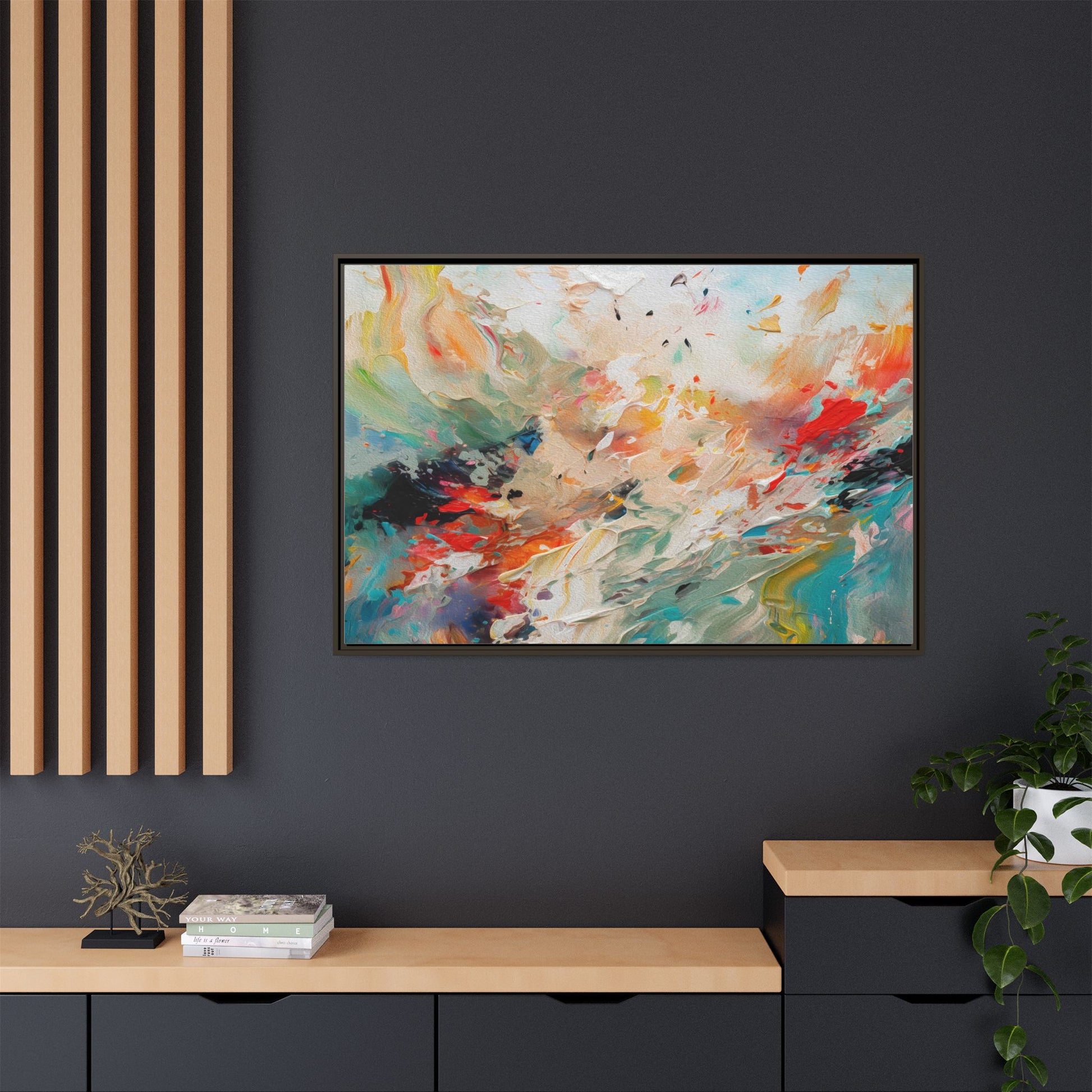 This vibrant abstract painting is a dynamic explosion of color and movement, featuring a sweeping composition of blended hues and textured brushstrokes. The artwork incorporates a rich palette of turquoise, red, orange, yellow, green, and white, creating a sense of energy and spontaneity. Layers of paint appear to be dynamically splashed and swirled across the canvas, giving the piece a sense of fluid motion and emotional intensity. Thick, impasto-like paint applications create depth and texture, with colors seemingly melting and interacting with each other in organic, unpredictable patterns. The painting evokes a sense of controlled chaos, with sharp and soft edges blending together to create a visually compelling and emotionally evocative abstract landscape.