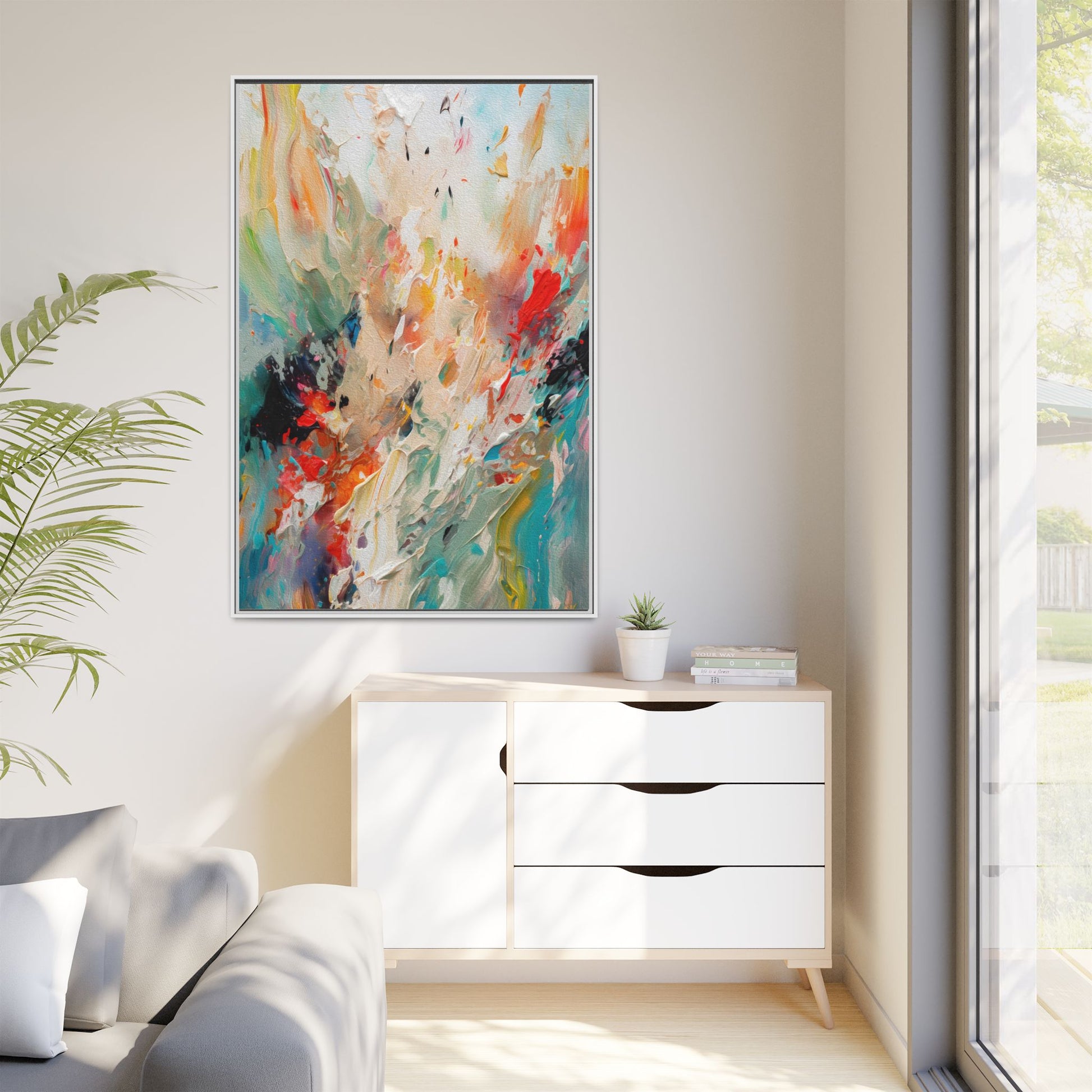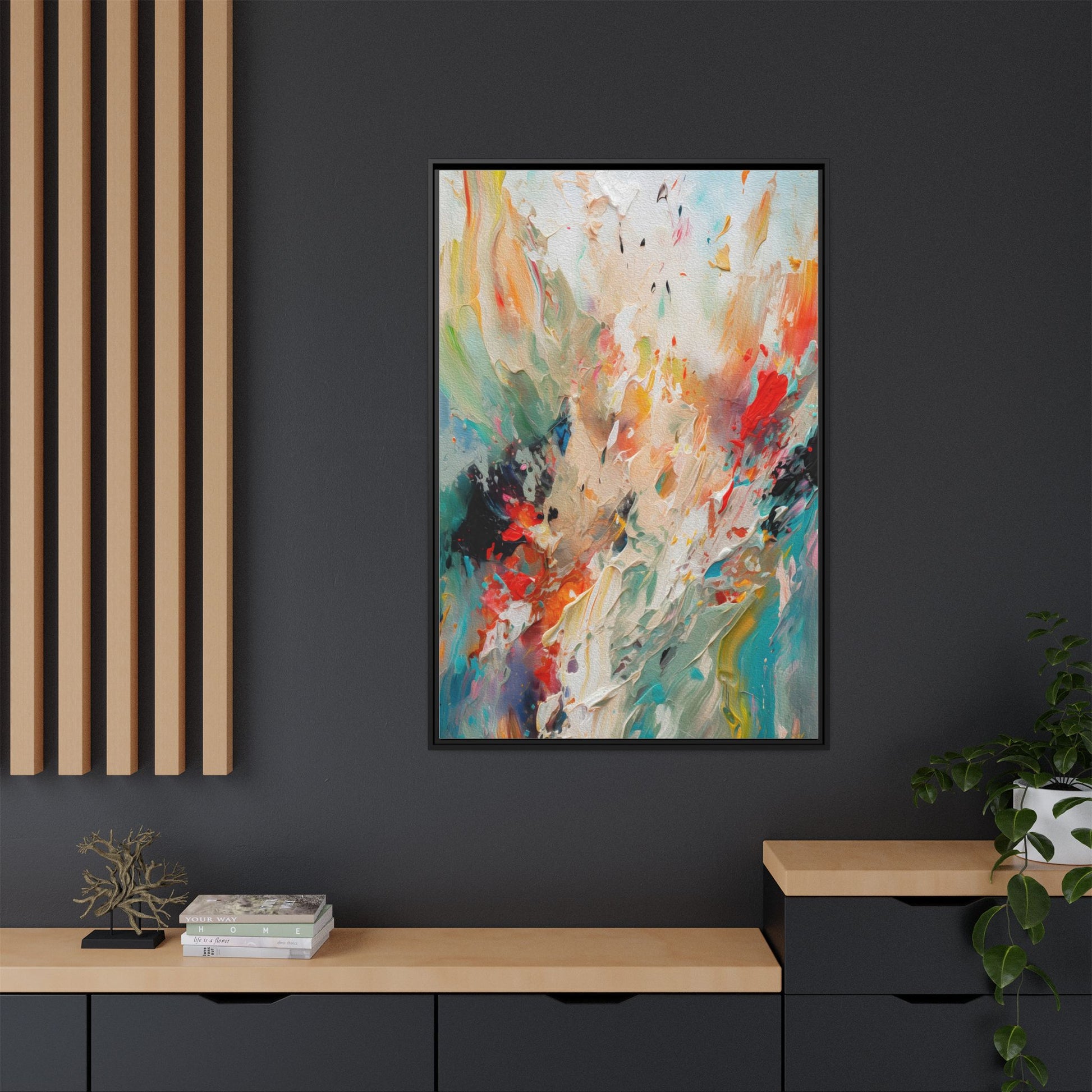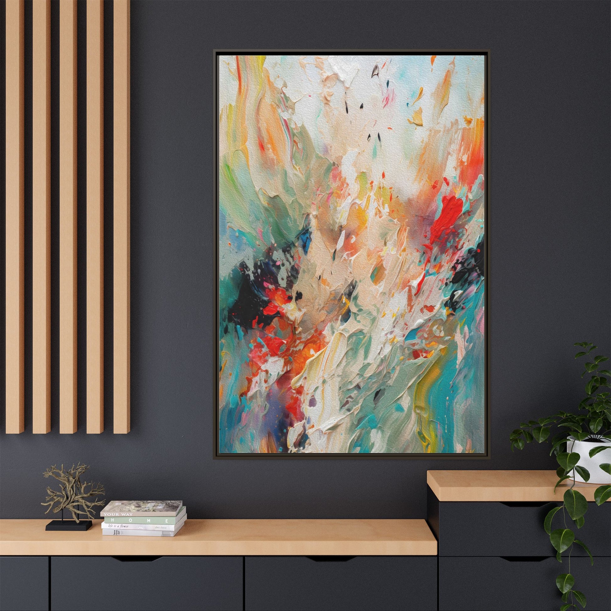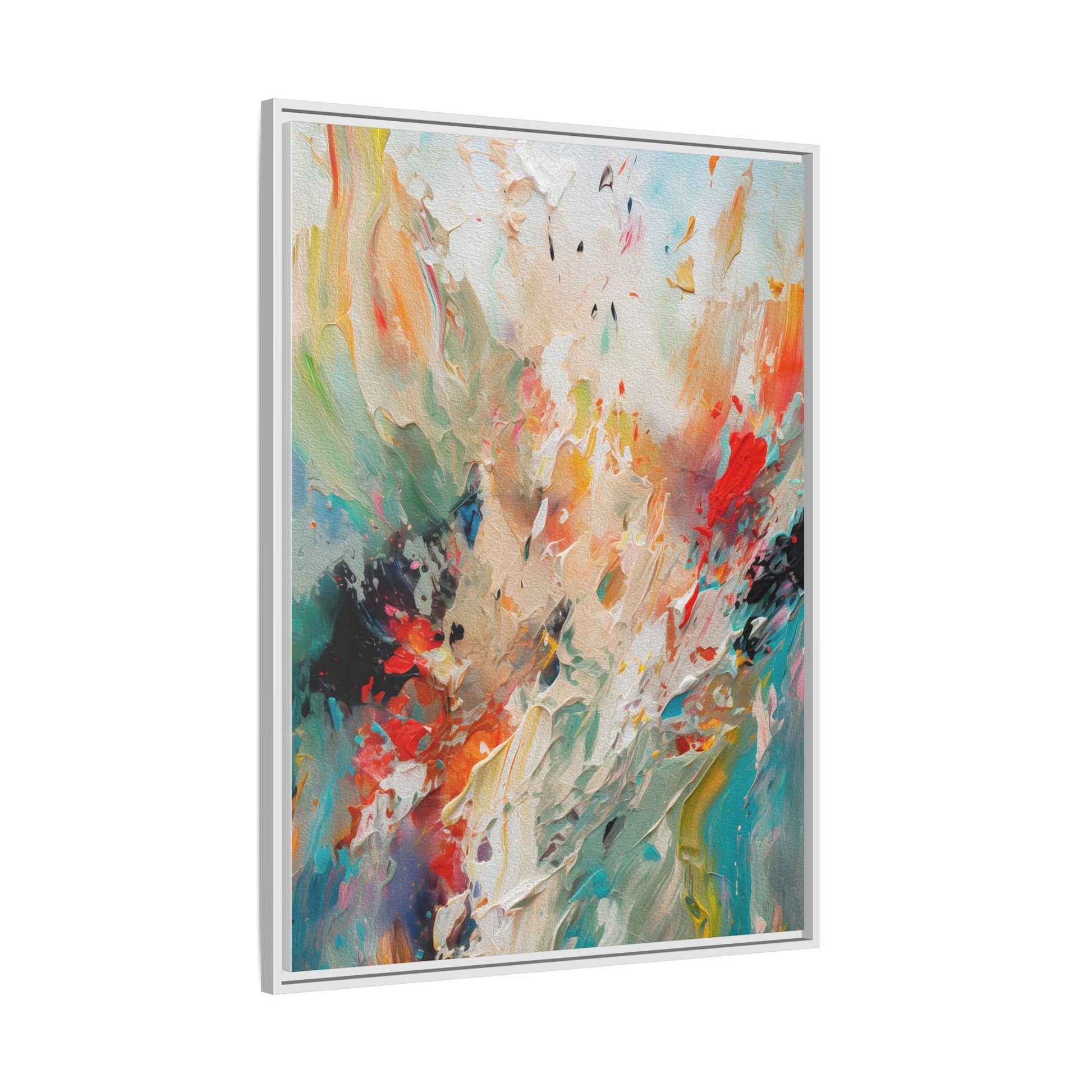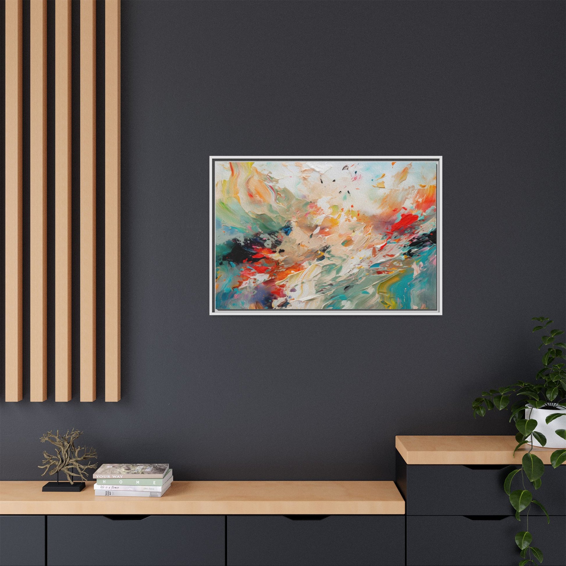 This vibrant abstract painting is a dynamic explosion of color and movement, featuring a sweeping composition of blended hues and textured brushstrokes. The artwork incorporates a rich palette of turquoise, red, orange, yellow, green, and white, creating a sense of energy and spontaneity. Layers of paint appear to be dynamically splashed and swirled across the canvas, giving the piece a sense of fluid motion and emotional intensity. Thick, impasto-like paint applications create depth and texture, with colors seemingly melting and interacting with each other in organic, unpredictable patterns. The painting evokes a sense of controlled chaos, with sharp and soft edges blending together to create a visually compelling and emotionally evocative abstract landscape.