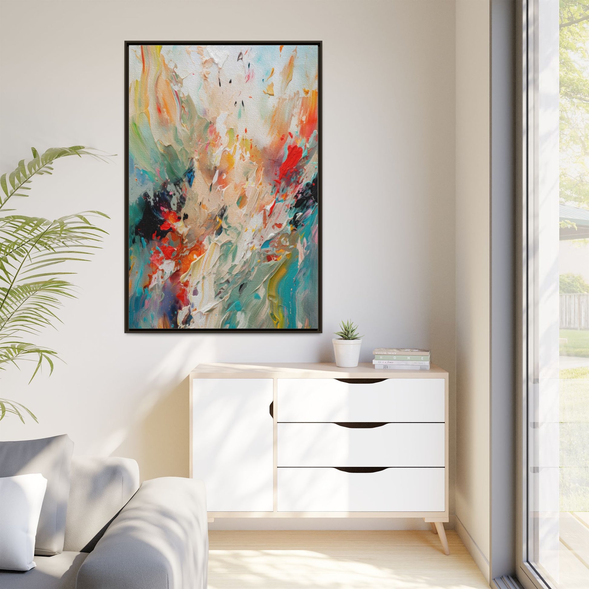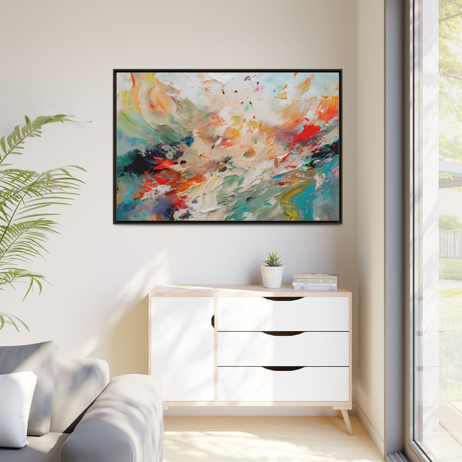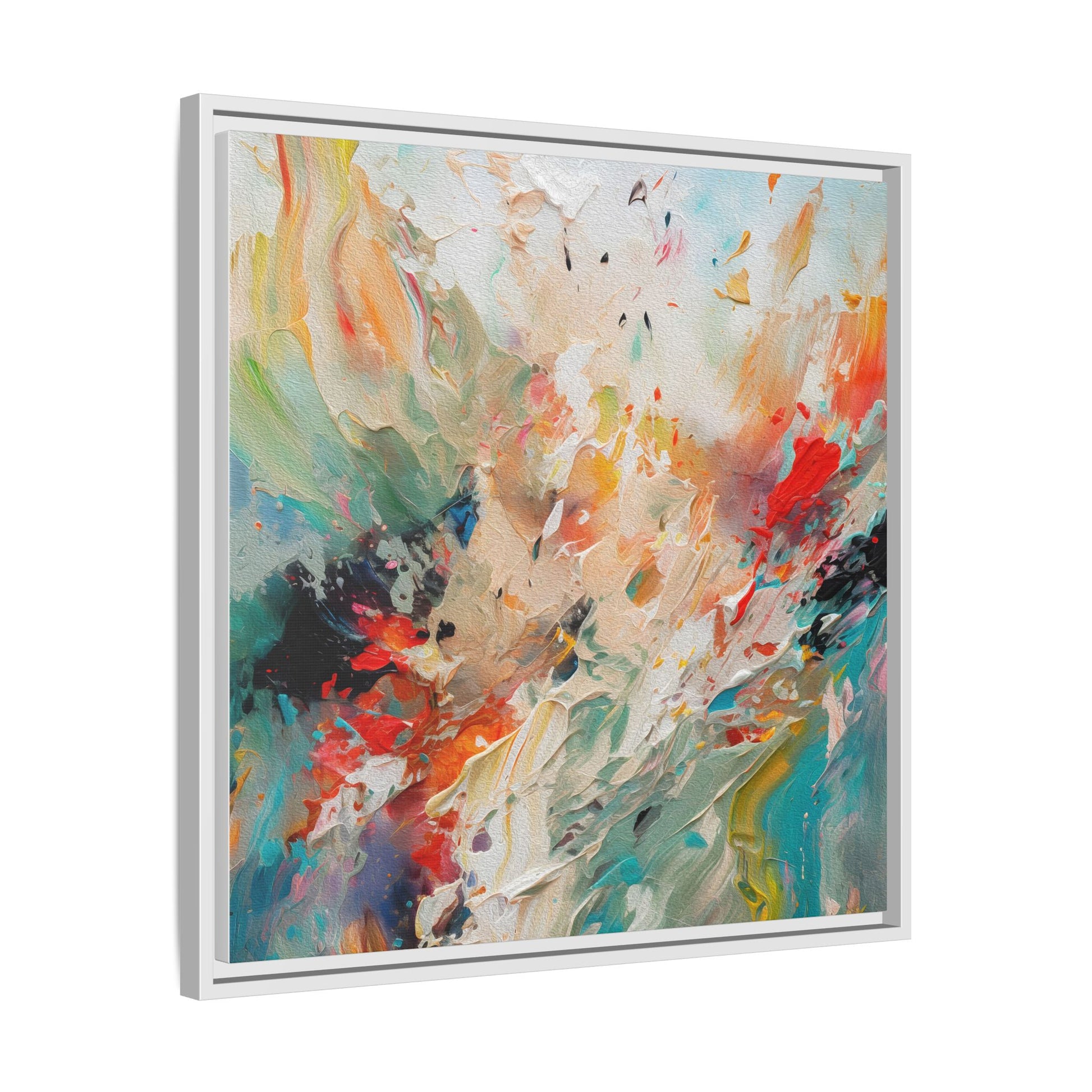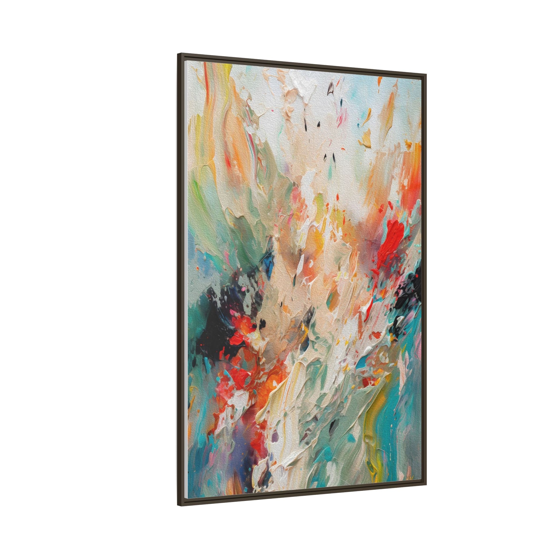 This vibrant abstract painting is a dynamic explosion of color and movement, featuring a sweeping composition of blended hues and textured brushstrokes. The artwork incorporates a rich palette of turquoise, red, orange, yellow, green, and white, creating a sense of energy and spontaneity. Layers of paint appear to be dynamically splashed and swirled across the canvas, giving the piece a sense of fluid motion and emotional intensity. Thick, impasto-like paint applications create depth and texture, with colors seemingly melting and interacting with each other in organic, unpredictable patterns. The painting evokes a sense of controlled chaos, with sharp and soft edges blending together to create a visually compelling and emotionally evocative abstract landscape.