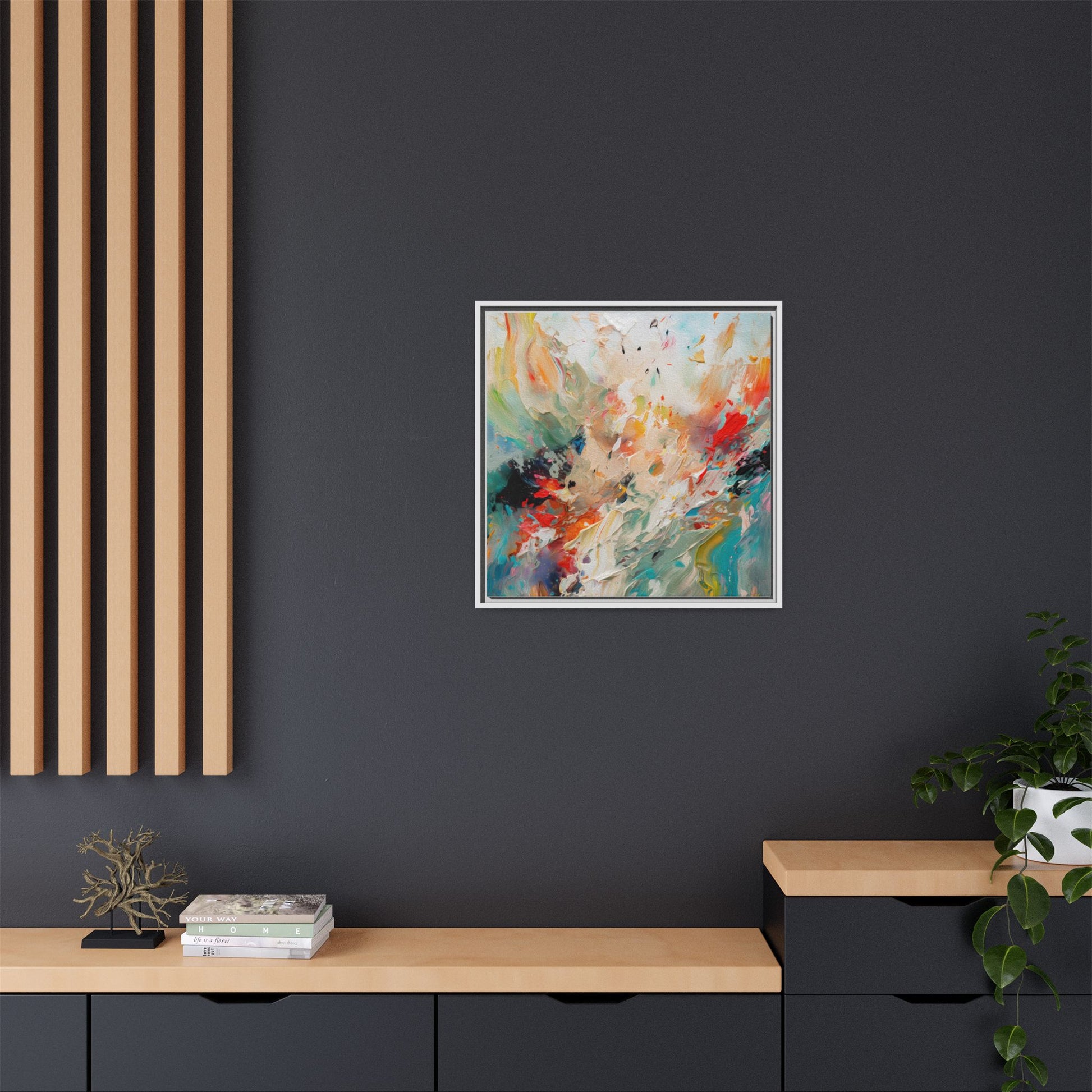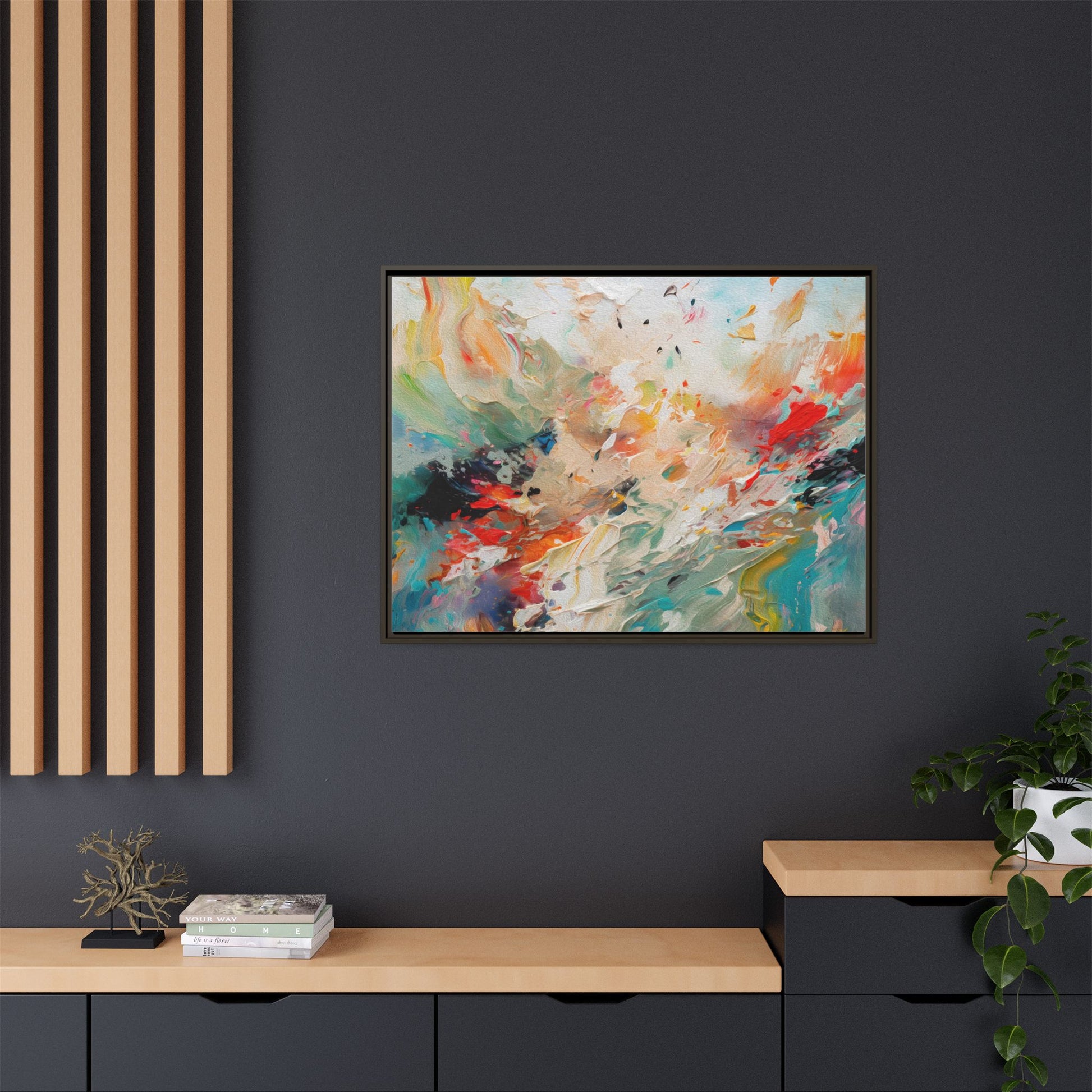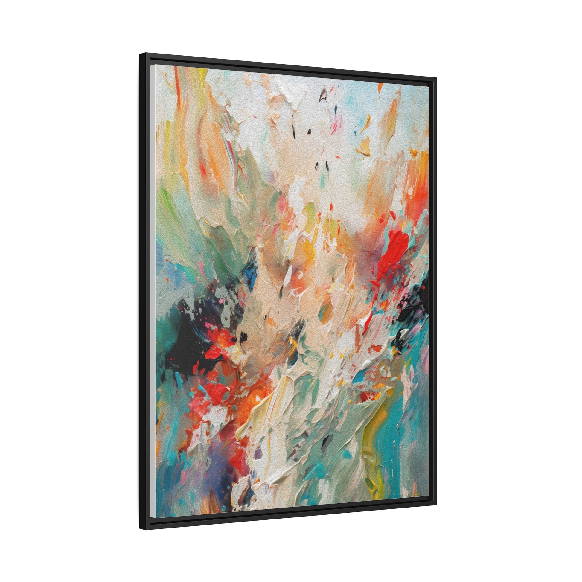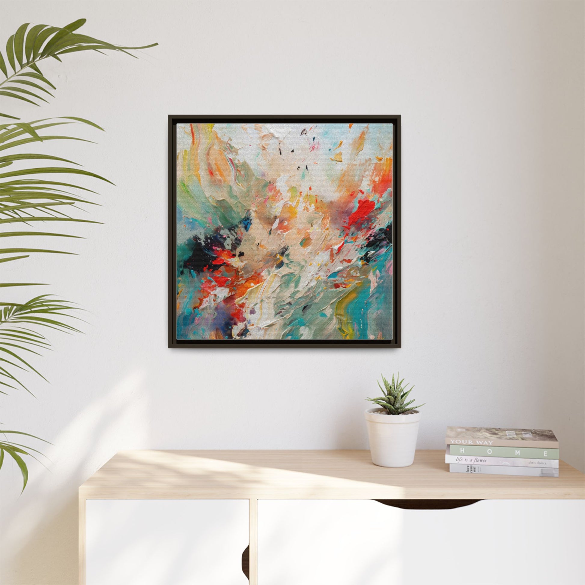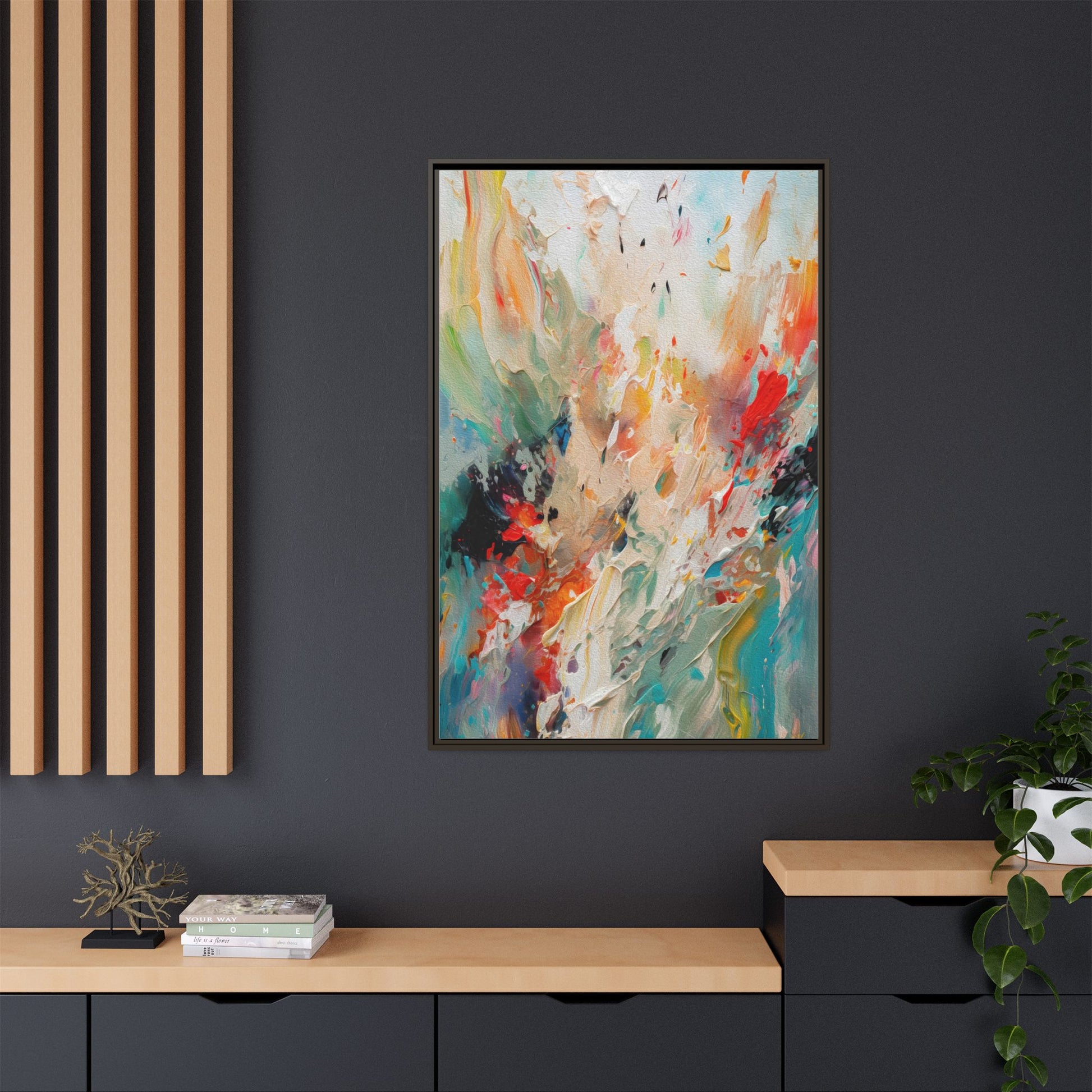 This vibrant abstract painting is a dynamic explosion of color and movement, featuring a sweeping composition of blended hues and textured brushstrokes. The artwork incorporates a rich palette of turquoise, red, orange, yellow, green, and white, creating a sense of energy and spontaneity. Layers of paint appear to be dynamically splashed and swirled across the canvas, giving the piece a sense of fluid motion and emotional intensity. Thick, impasto-like paint applications create depth and texture, with colors seemingly melting and interacting with each other in organic, unpredictable patterns. The painting evokes a sense of controlled chaos, with sharp and soft edges blending together to create a visually compelling and emotionally evocative abstract landscape.