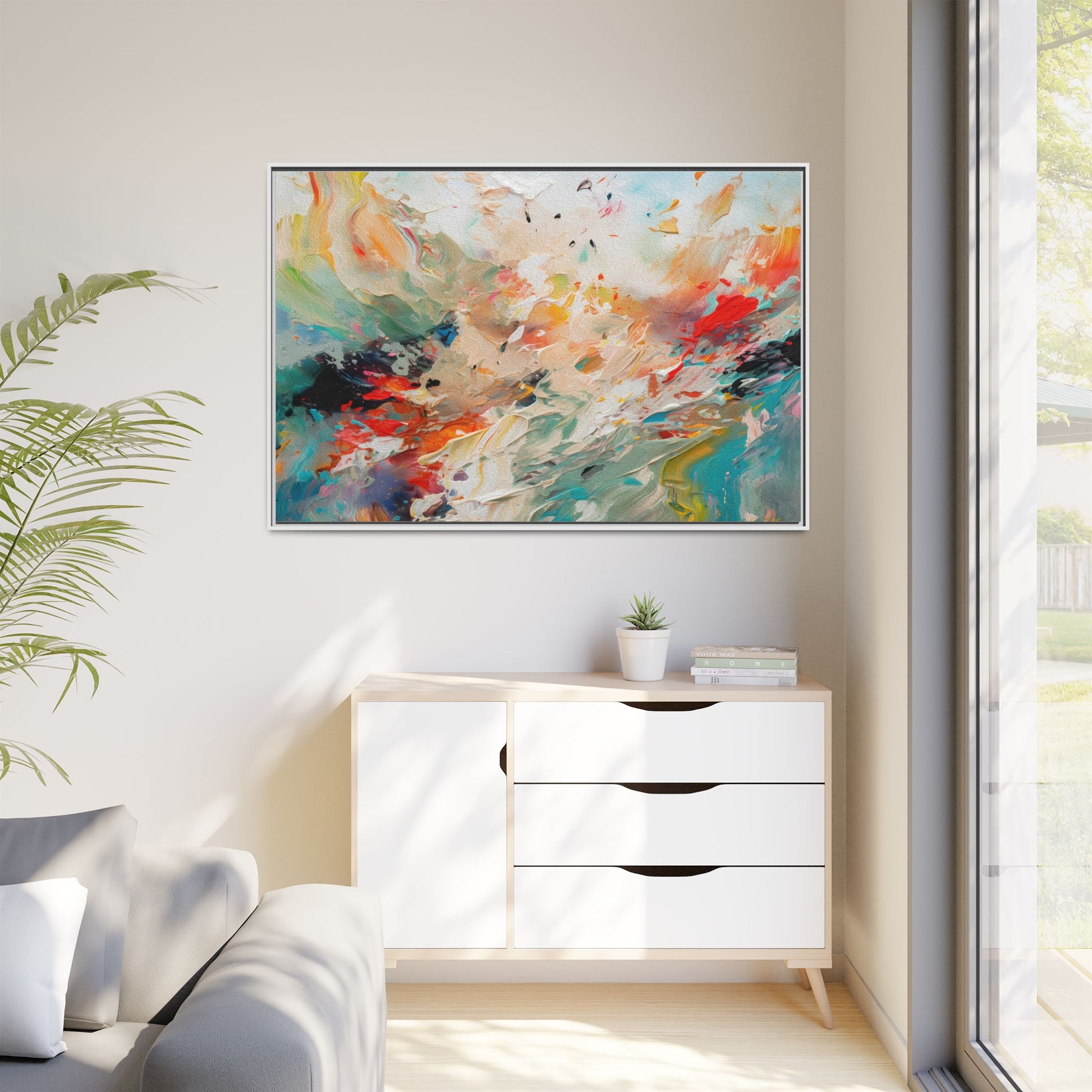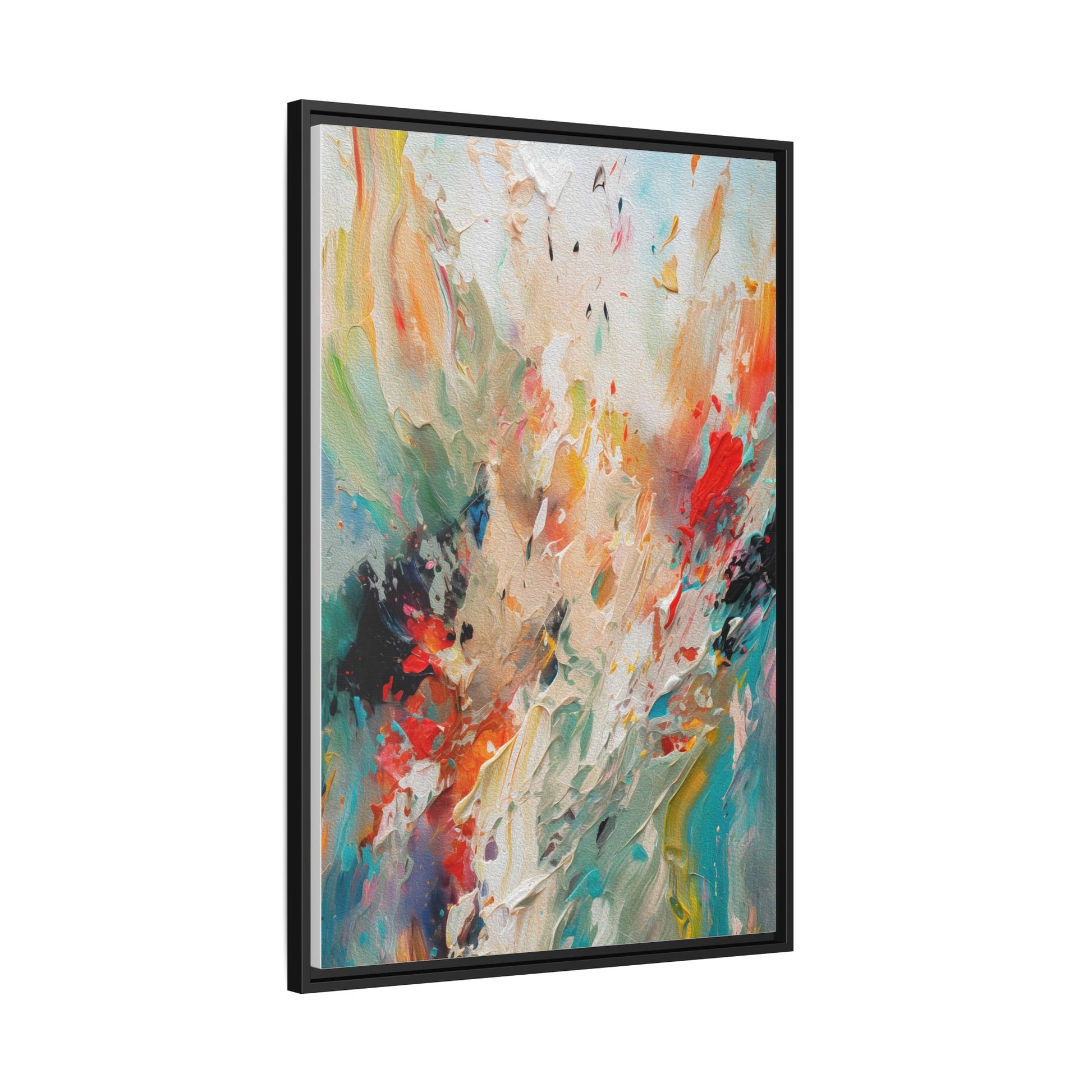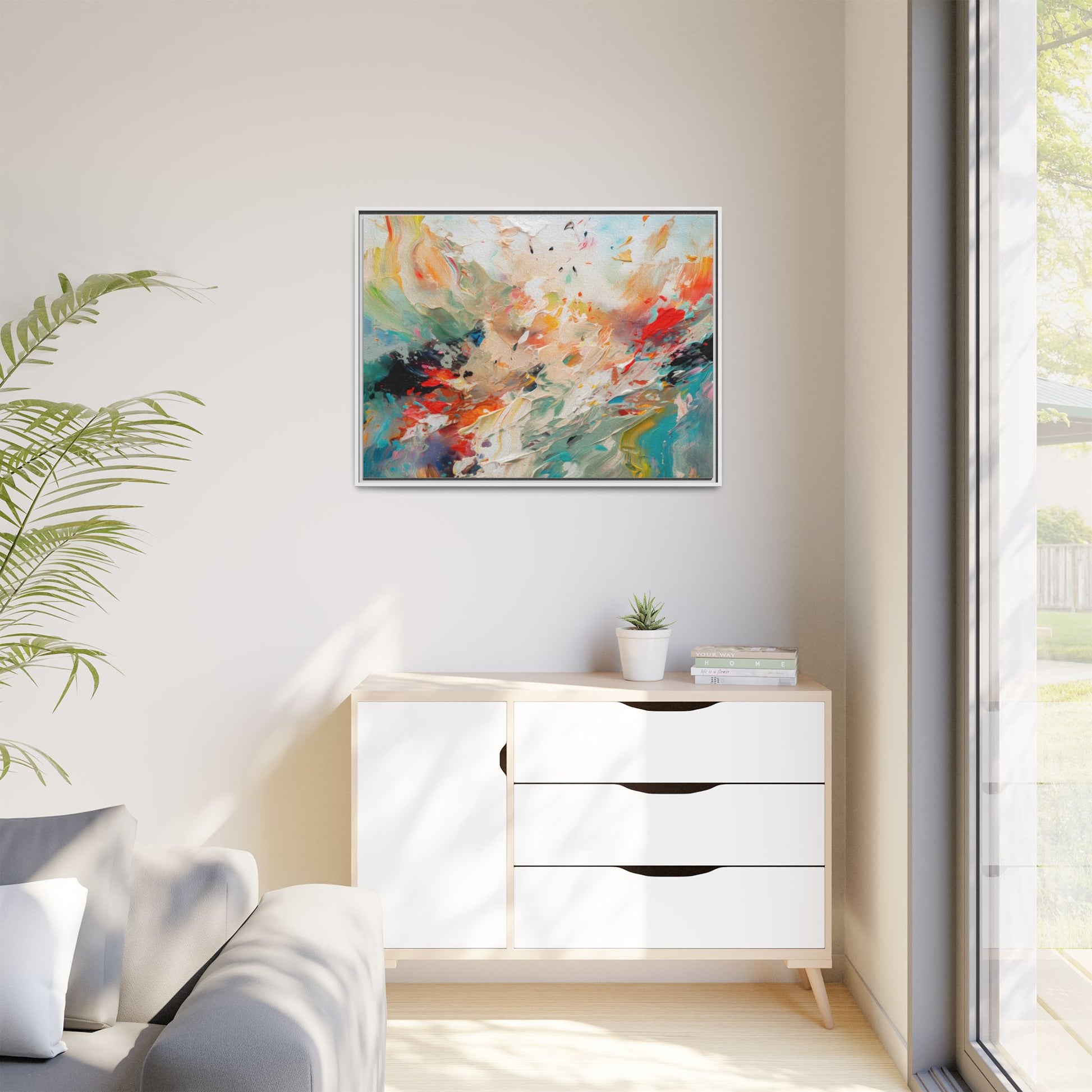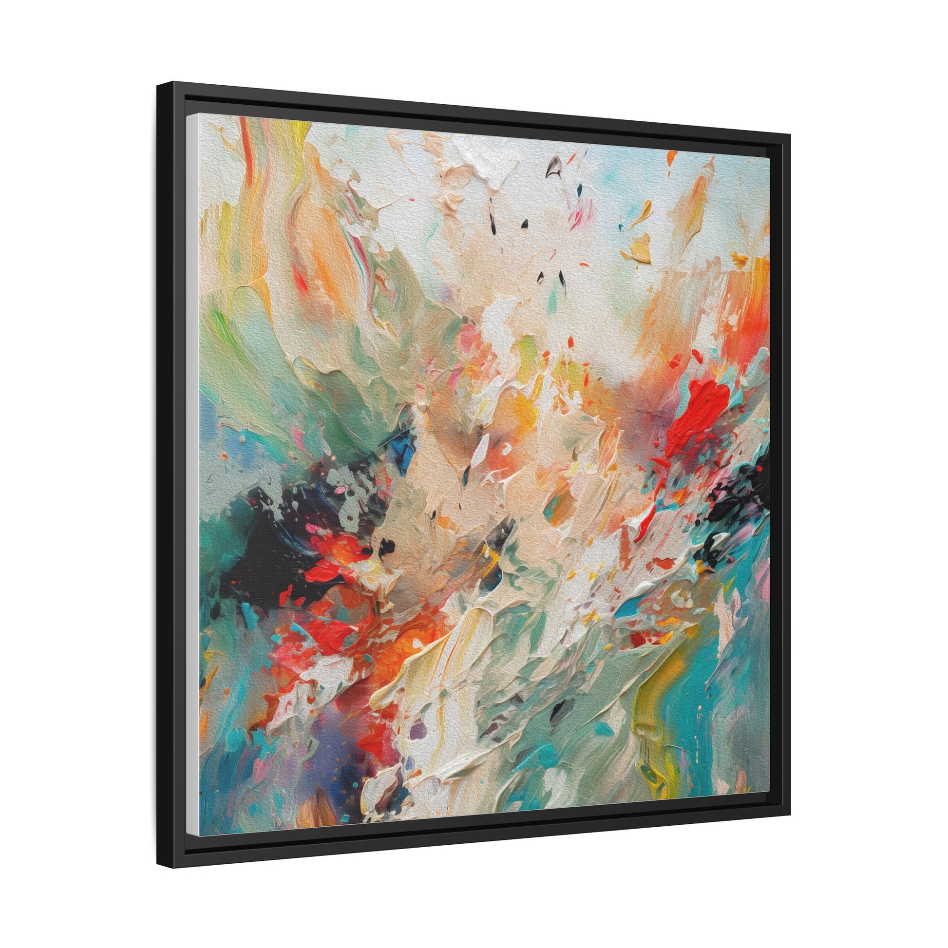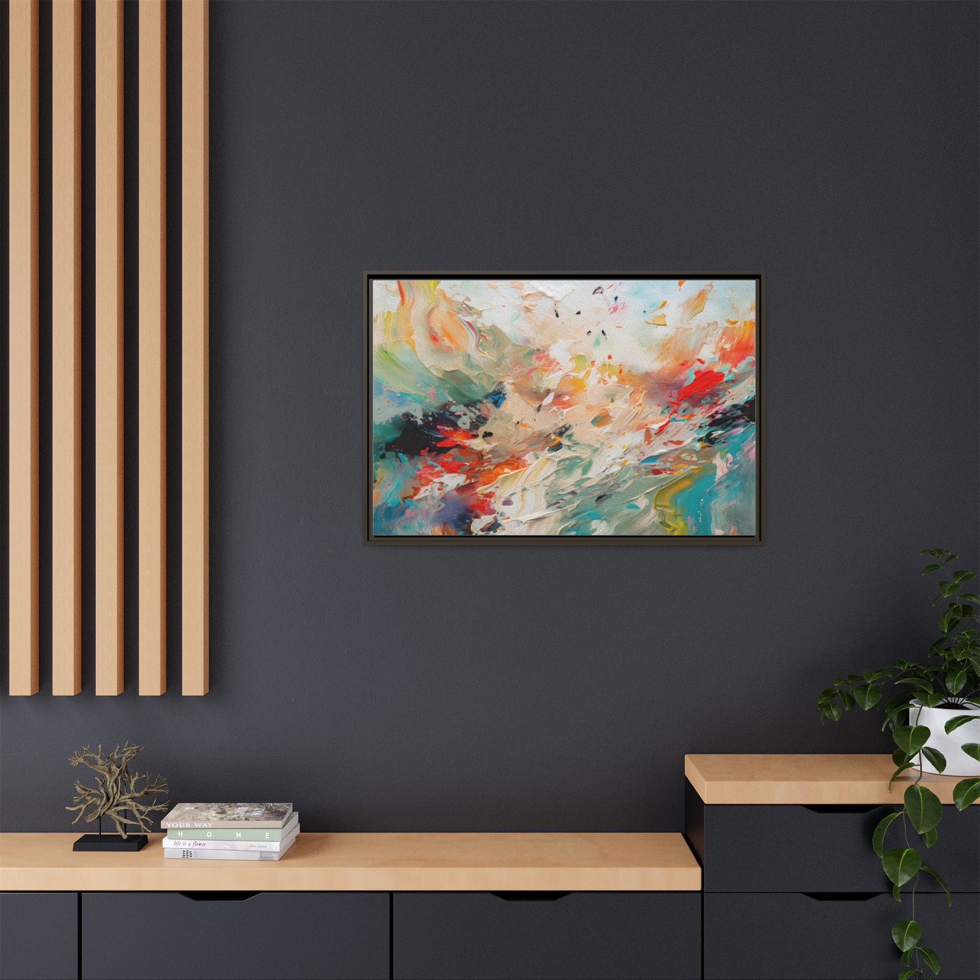 This vibrant abstract painting is a dynamic explosion of color and movement, featuring a sweeping composition of blended hues and textured brushstrokes. The artwork incorporates a rich palette of turquoise, red, orange, yellow, green, and white, creating a sense of energy and spontaneity. Layers of paint appear to be dynamically splashed and swirled across the canvas, giving the piece a sense of fluid motion and emotional intensity. Thick, impasto-like paint applications create depth and texture, with colors seemingly melting and interacting with each other in organic, unpredictable patterns. The painting evokes a sense of controlled chaos, with sharp and soft edges blending together to create a visually compelling and emotionally evocative abstract landscape.