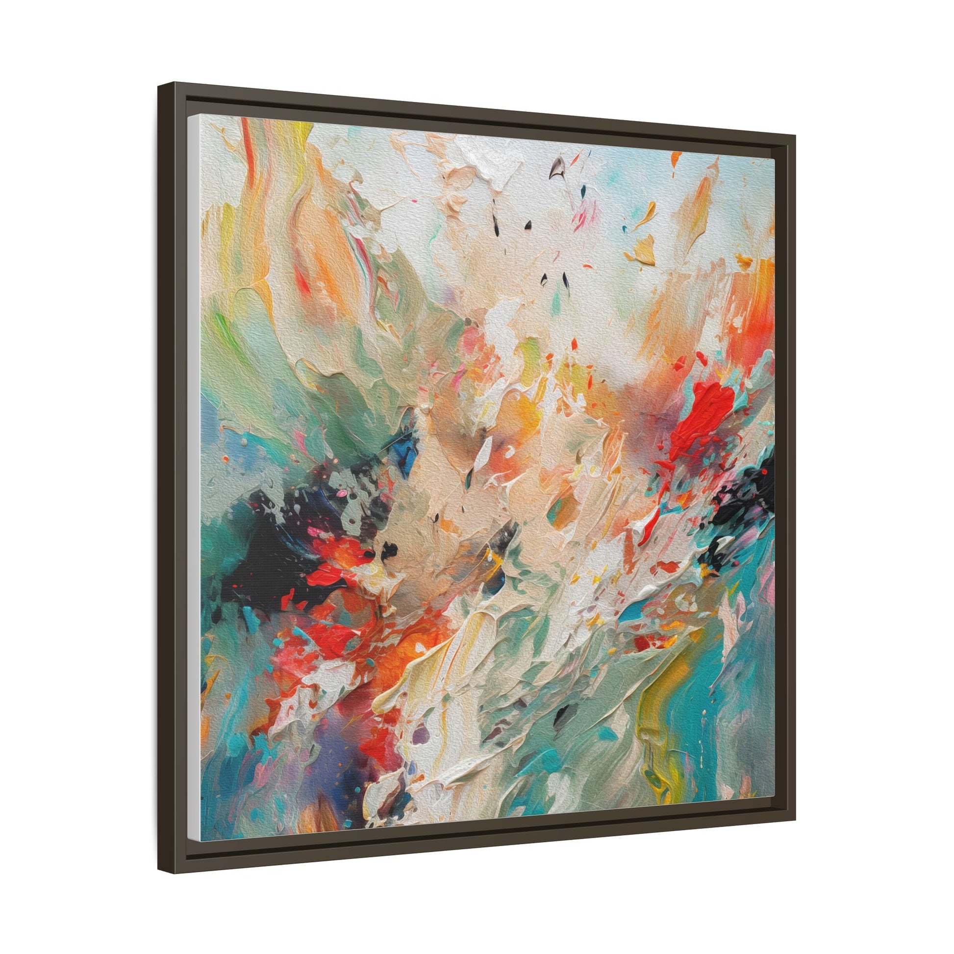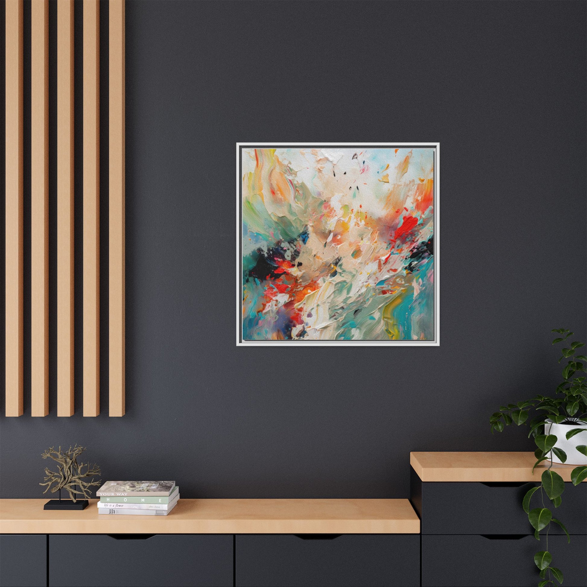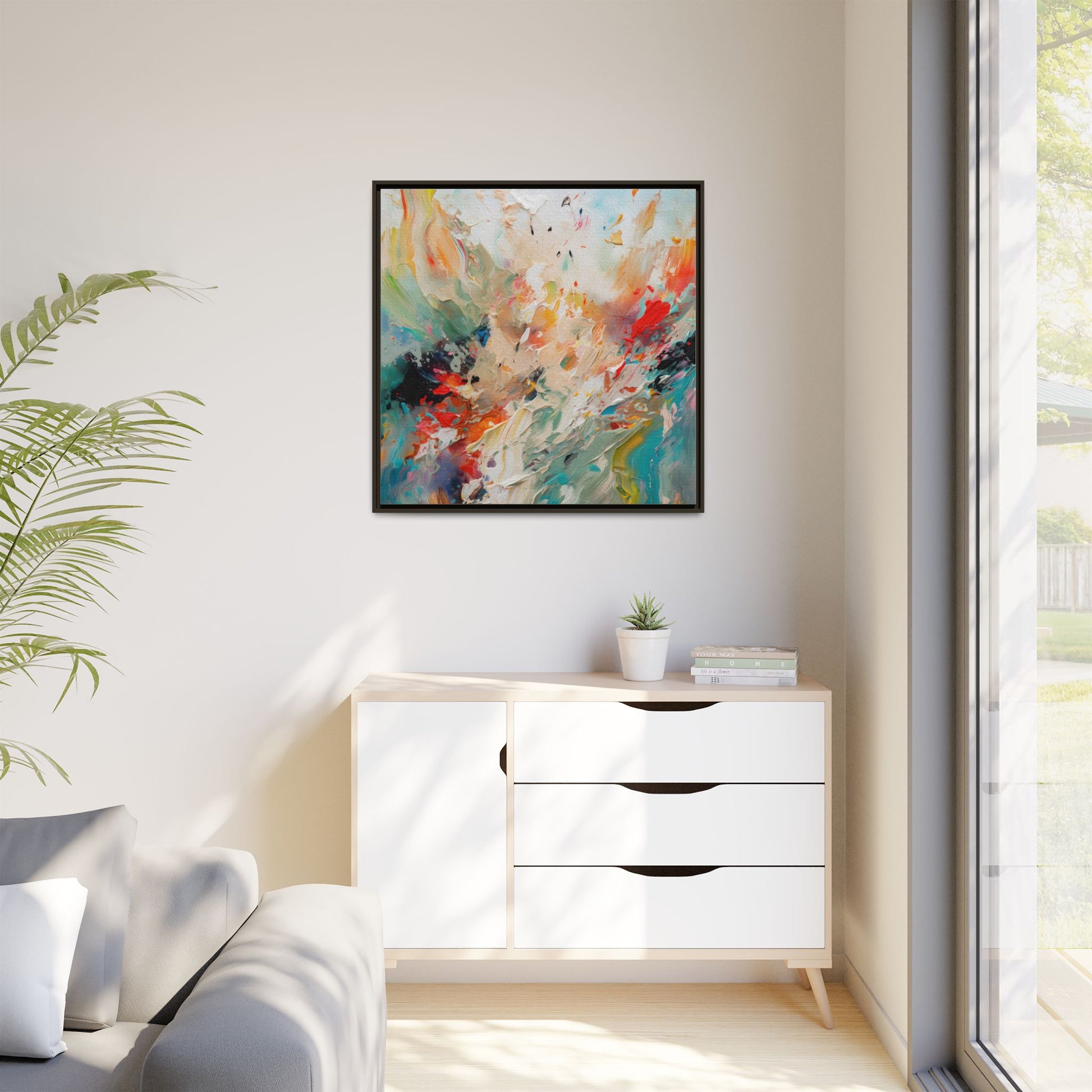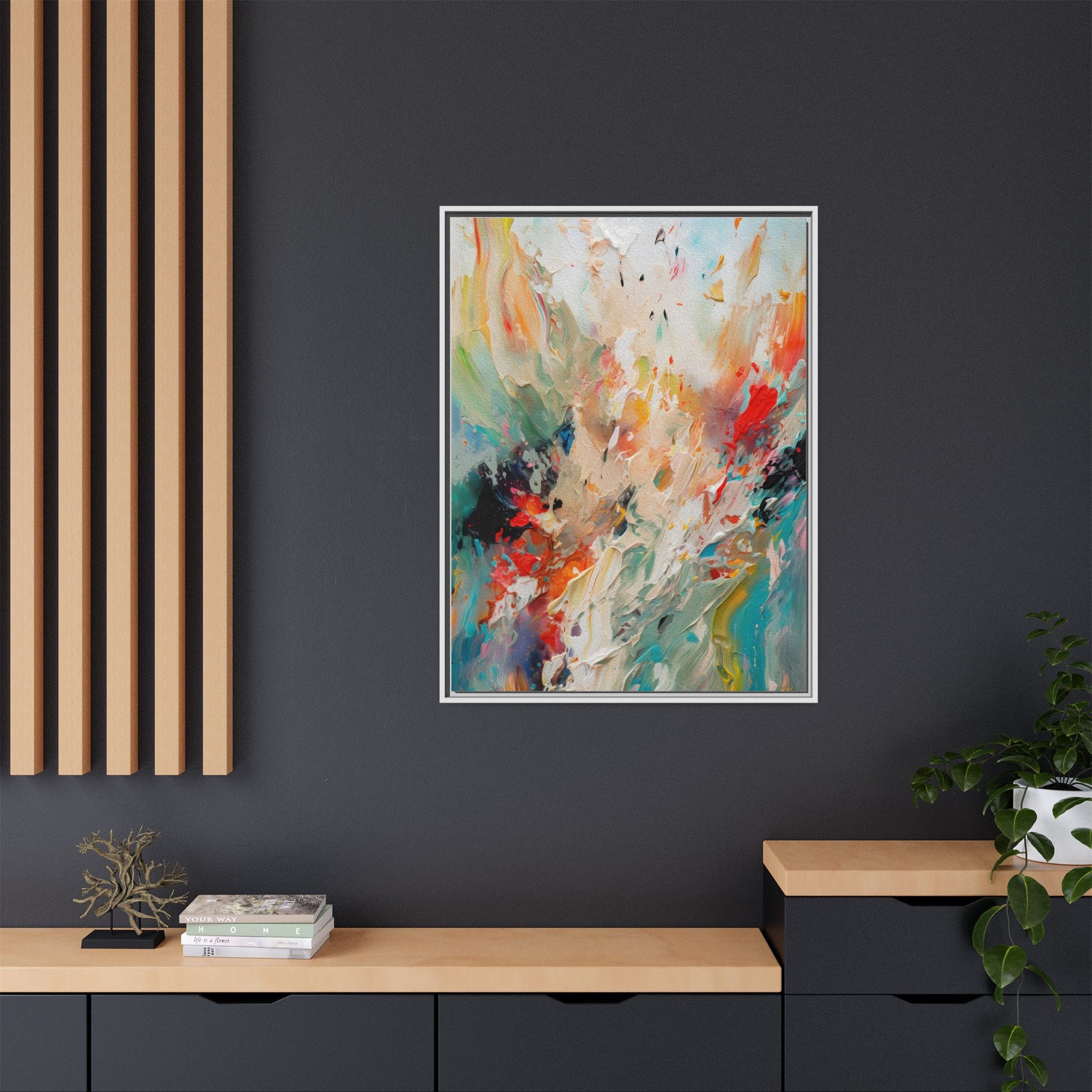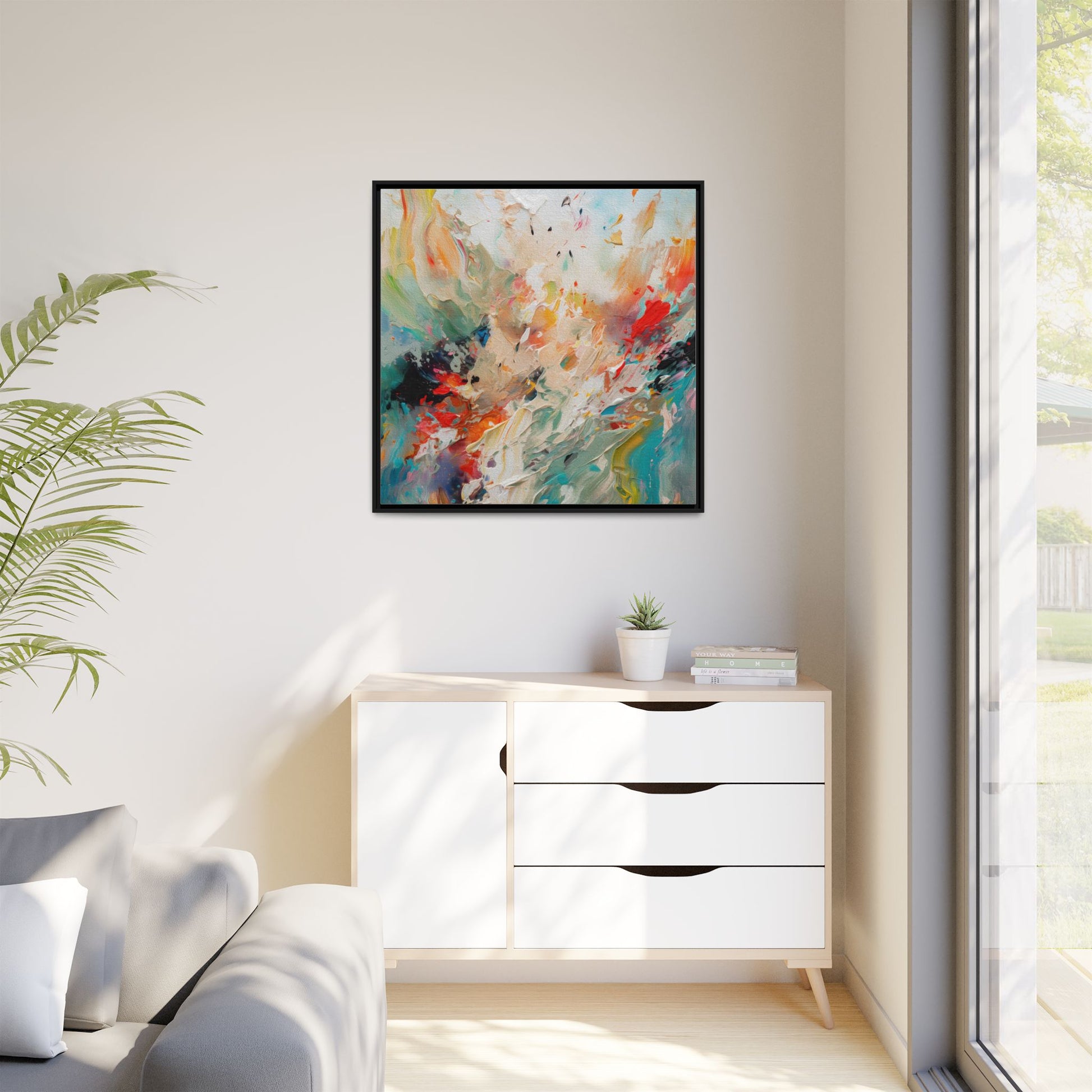 This vibrant abstract painting is a dynamic explosion of color and movement, featuring a sweeping composition of blended hues and textured brushstrokes. The artwork incorporates a rich palette of turquoise, red, orange, yellow, green, and white, creating a sense of energy and spontaneity. Layers of paint appear to be dynamically splashed and swirled across the canvas, giving the piece a sense of fluid motion and emotional intensity. Thick, impasto-like paint applications create depth and texture, with colors seemingly melting and interacting with each other in organic, unpredictable patterns. The painting evokes a sense of controlled chaos, with sharp and soft edges blending together to create a visually compelling and emotionally evocative abstract landscape.