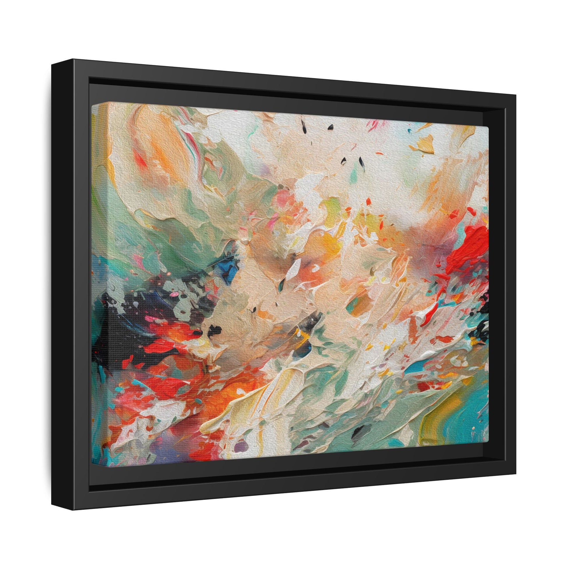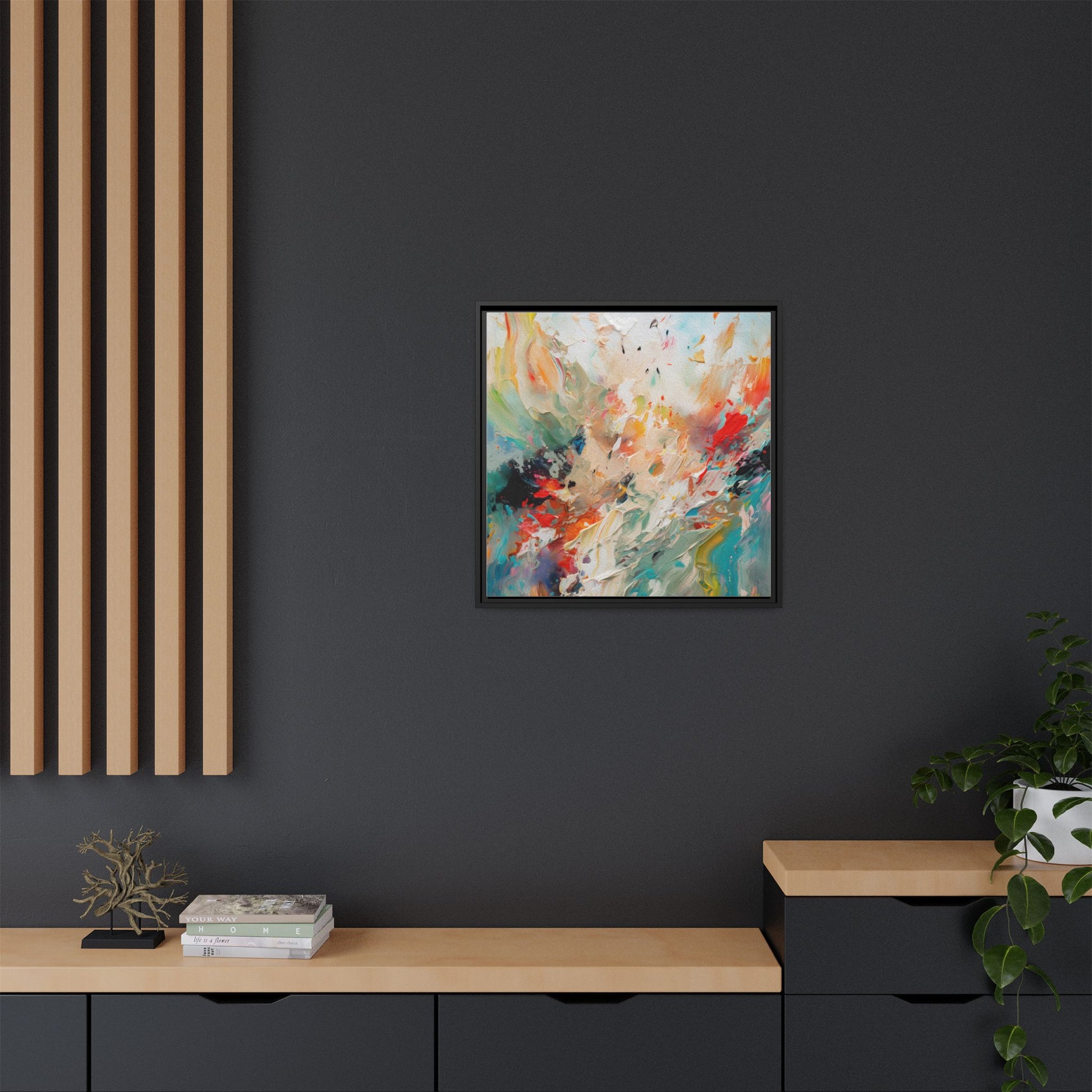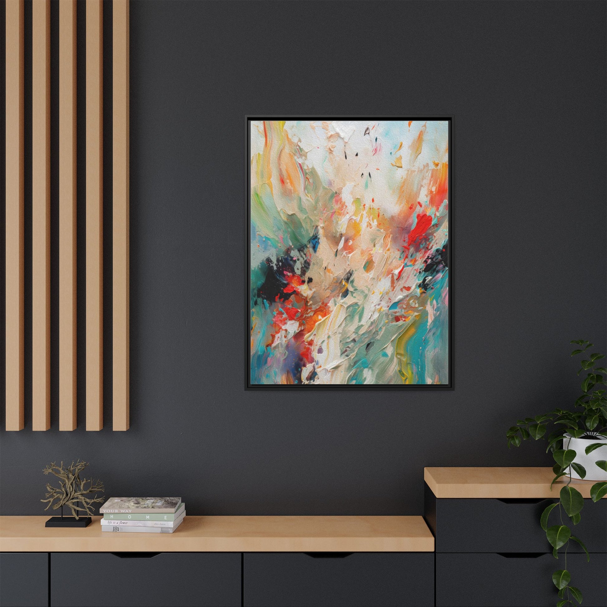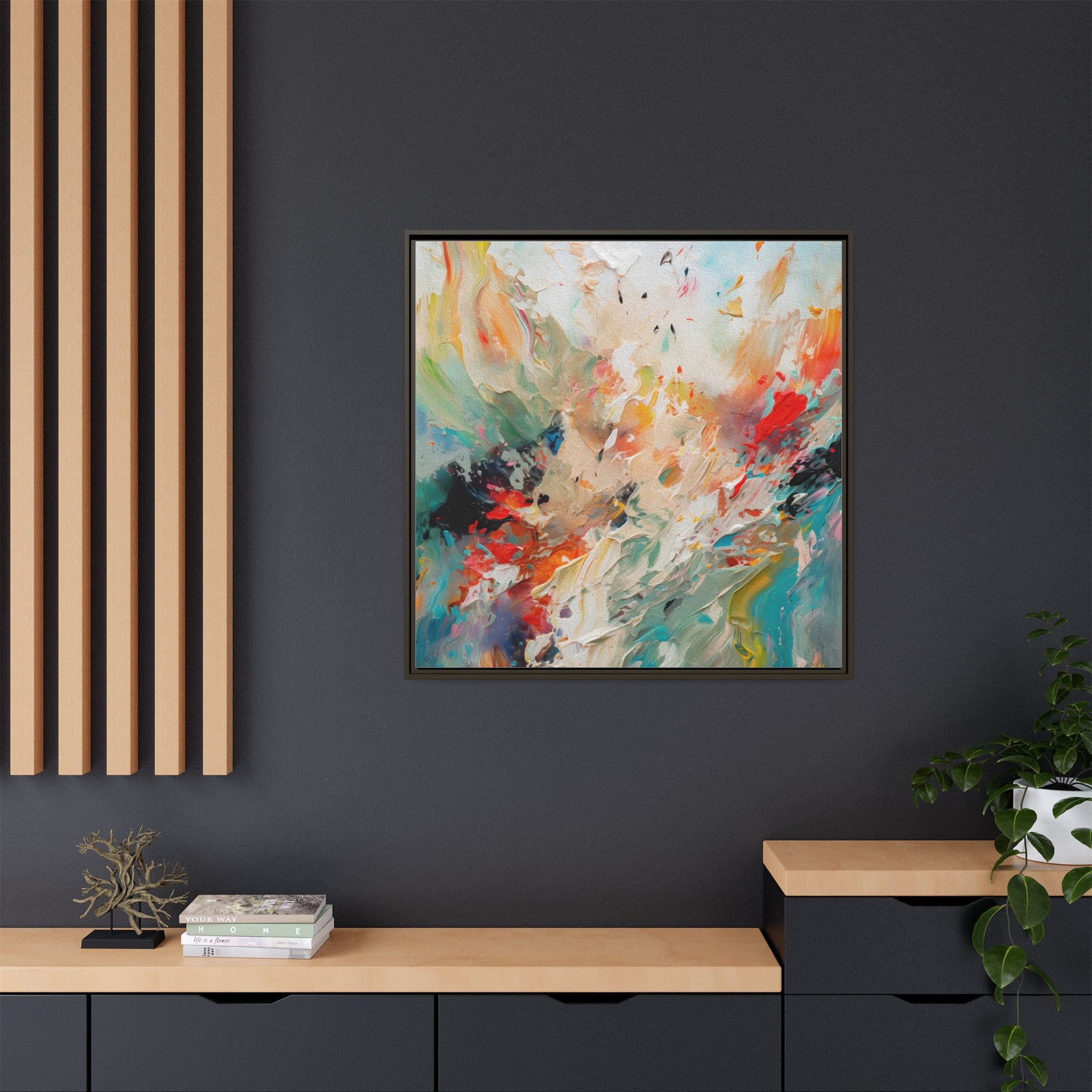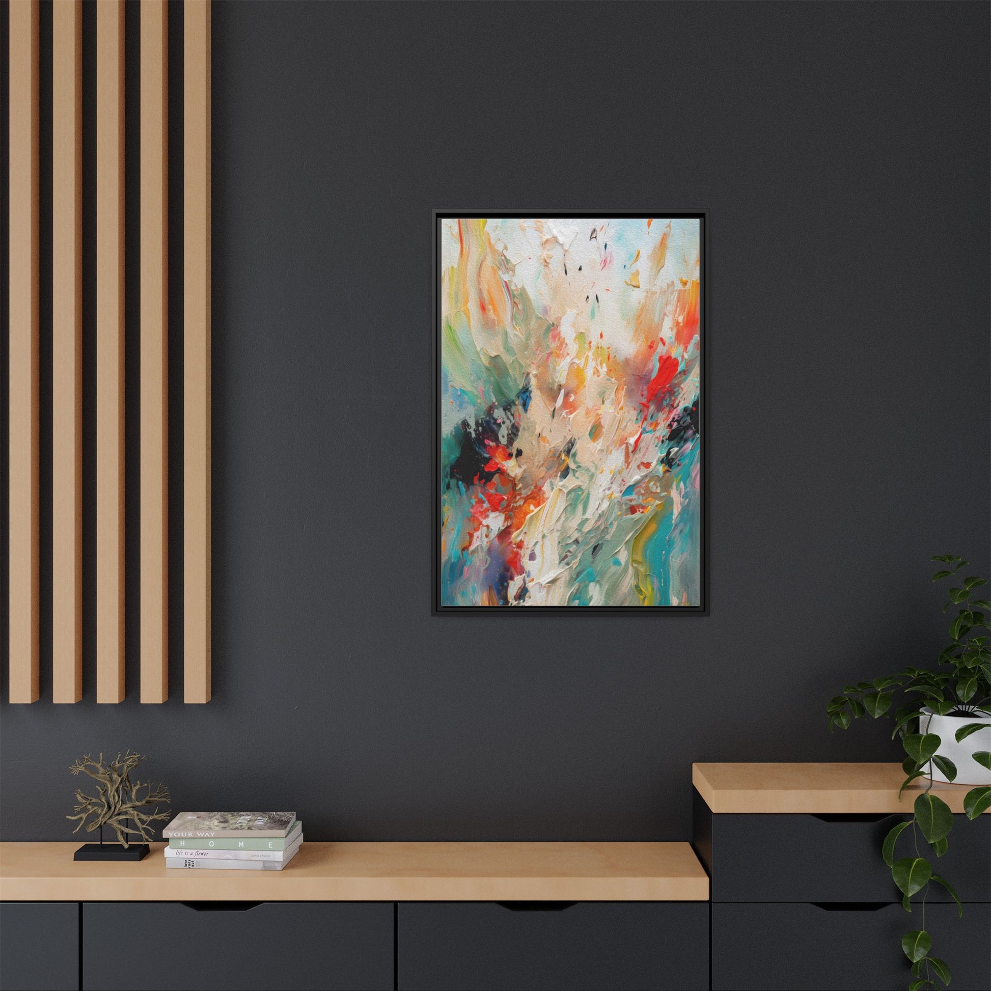 This vibrant abstract painting is a dynamic explosion of color and movement, featuring a sweeping composition of blended hues and textured brushstrokes. The artwork incorporates a rich palette of turquoise, red, orange, yellow, green, and white, creating a sense of energy and spontaneity. Layers of paint appear to be dynamically splashed and swirled across the canvas, giving the piece a sense of fluid motion and emotional intensity. Thick, impasto-like paint applications create depth and texture, with colors seemingly melting and interacting with each other in organic, unpredictable patterns. The painting evokes a sense of controlled chaos, with sharp and soft edges blending together to create a visually compelling and emotionally evocative abstract landscape.