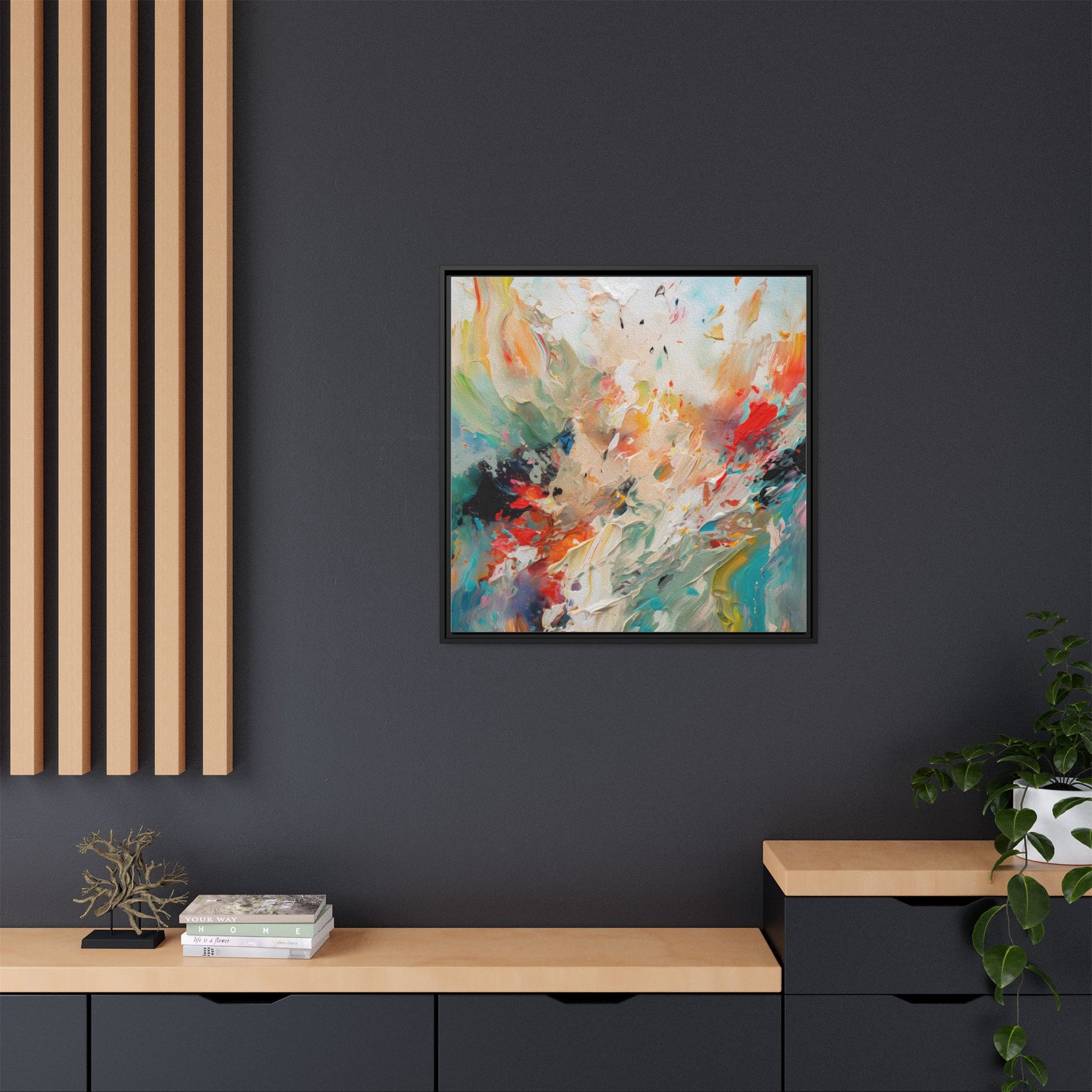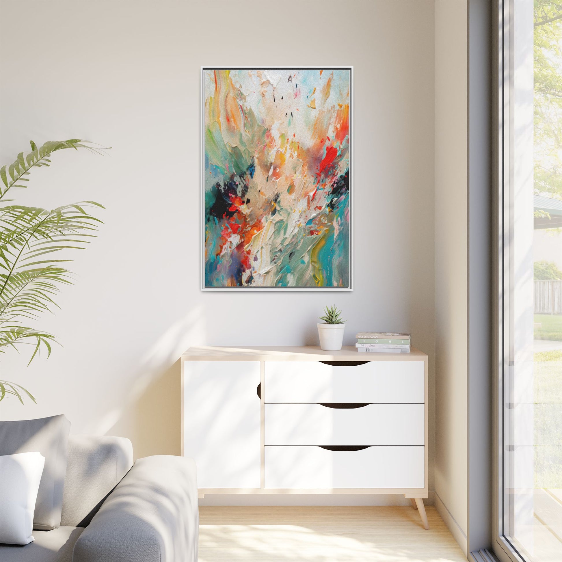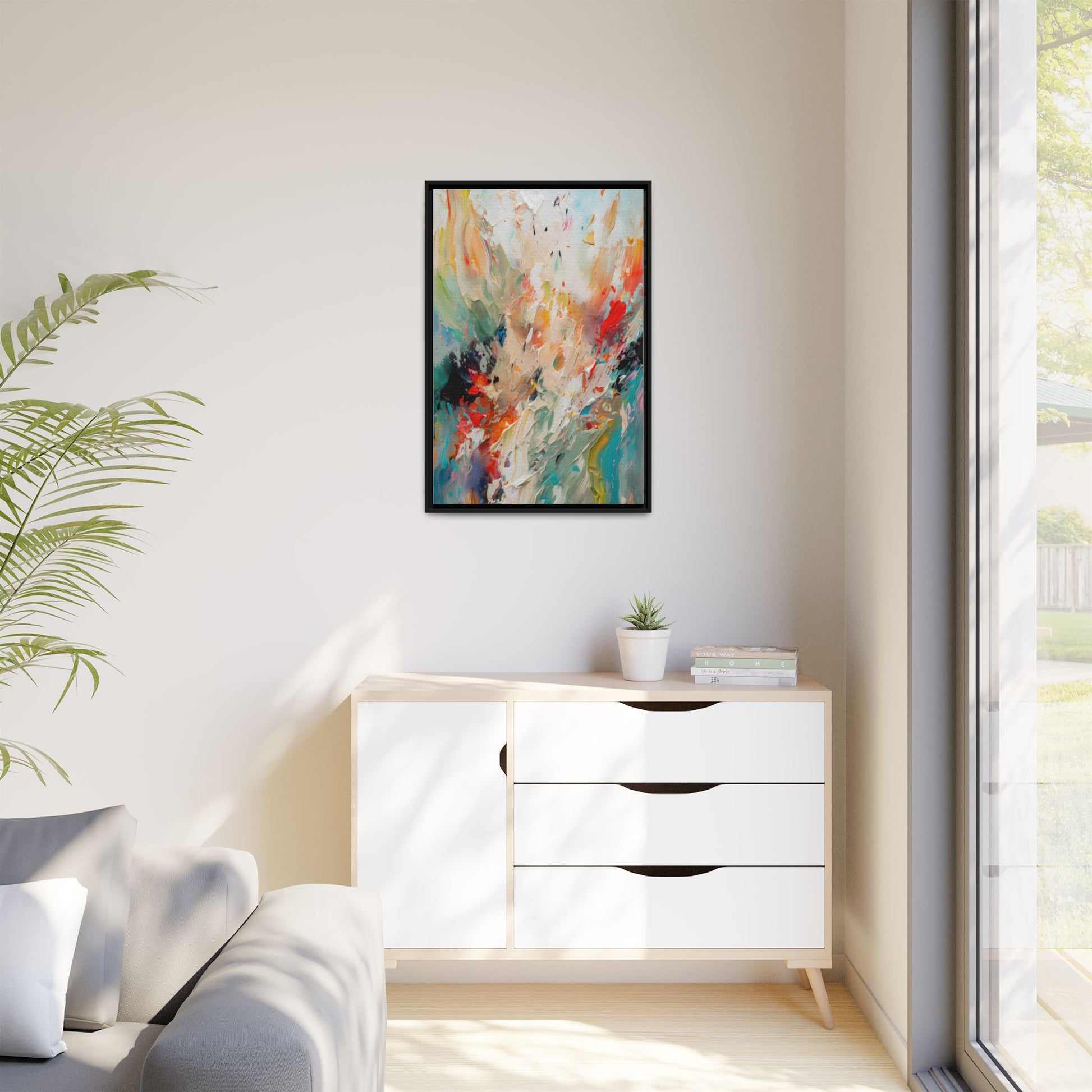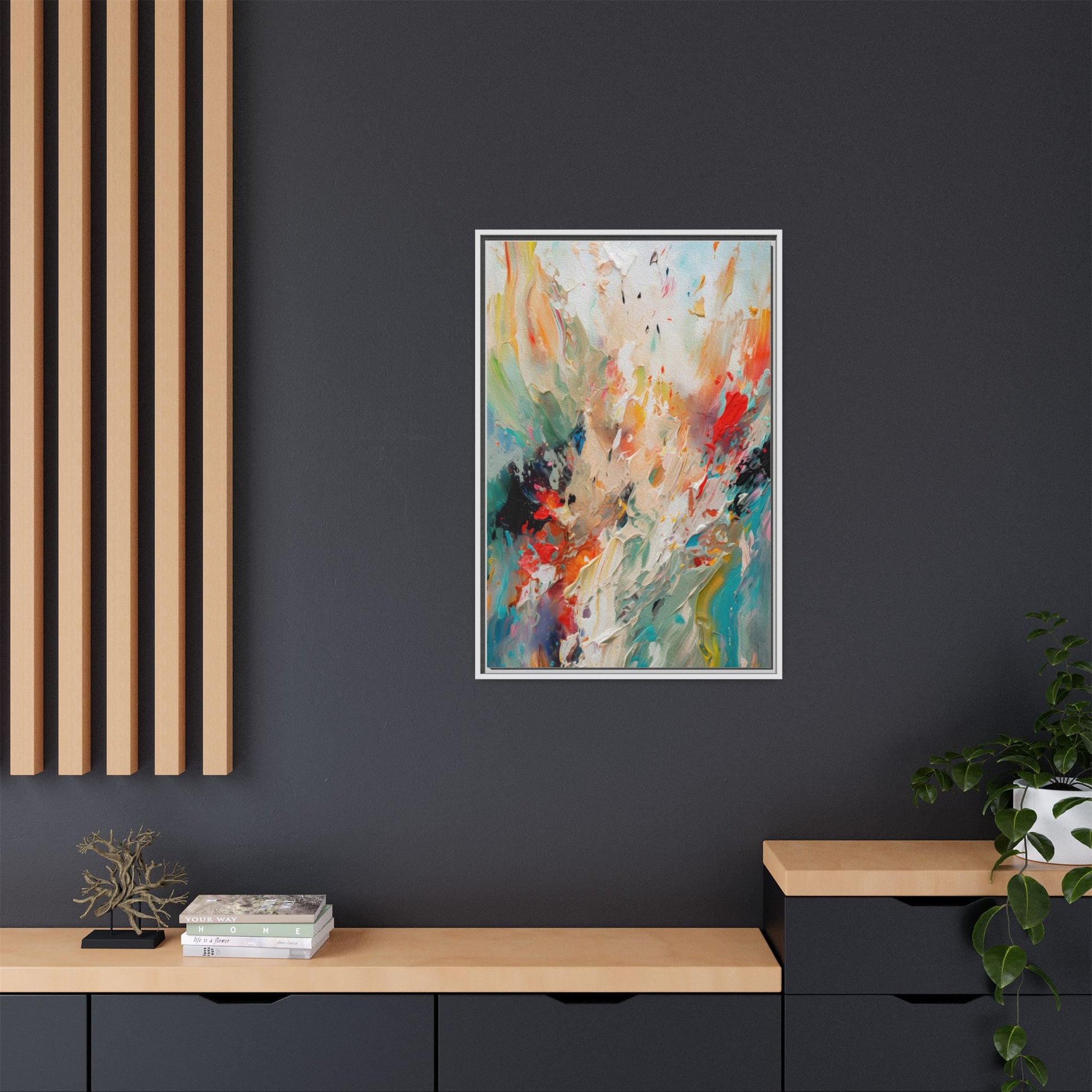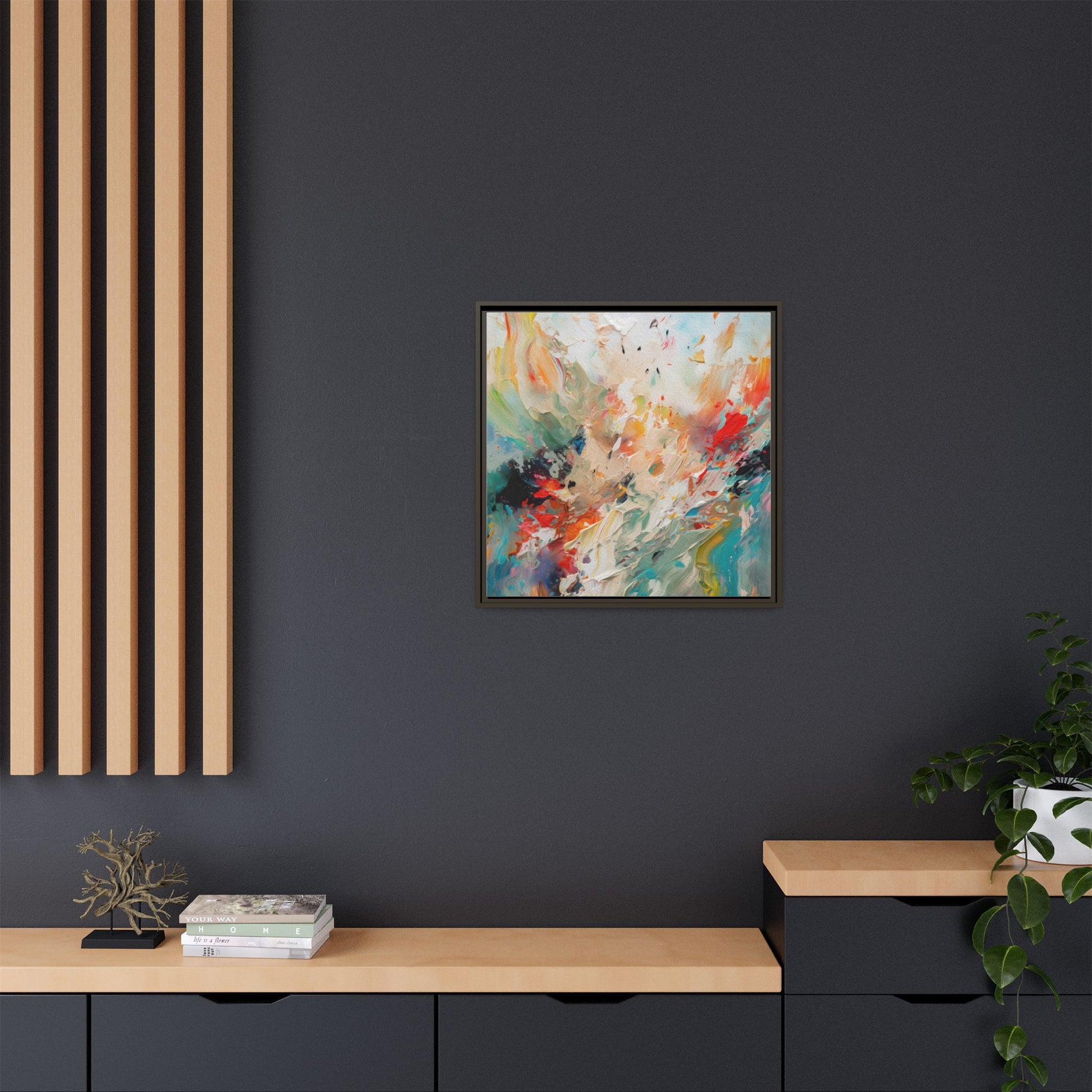 This vibrant abstract painting is a dynamic explosion of color and movement, featuring a sweeping composition of blended hues and textured brushstrokes. The artwork incorporates a rich palette of turquoise, red, orange, yellow, green, and white, creating a sense of energy and spontaneity. Layers of paint appear to be dynamically splashed and swirled across the canvas, giving the piece a sense of fluid motion and emotional intensity. Thick, impasto-like paint applications create depth and texture, with colors seemingly melting and interacting with each other in organic, unpredictable patterns. The painting evokes a sense of controlled chaos, with sharp and soft edges blending together to create a visually compelling and emotionally evocative abstract landscape.