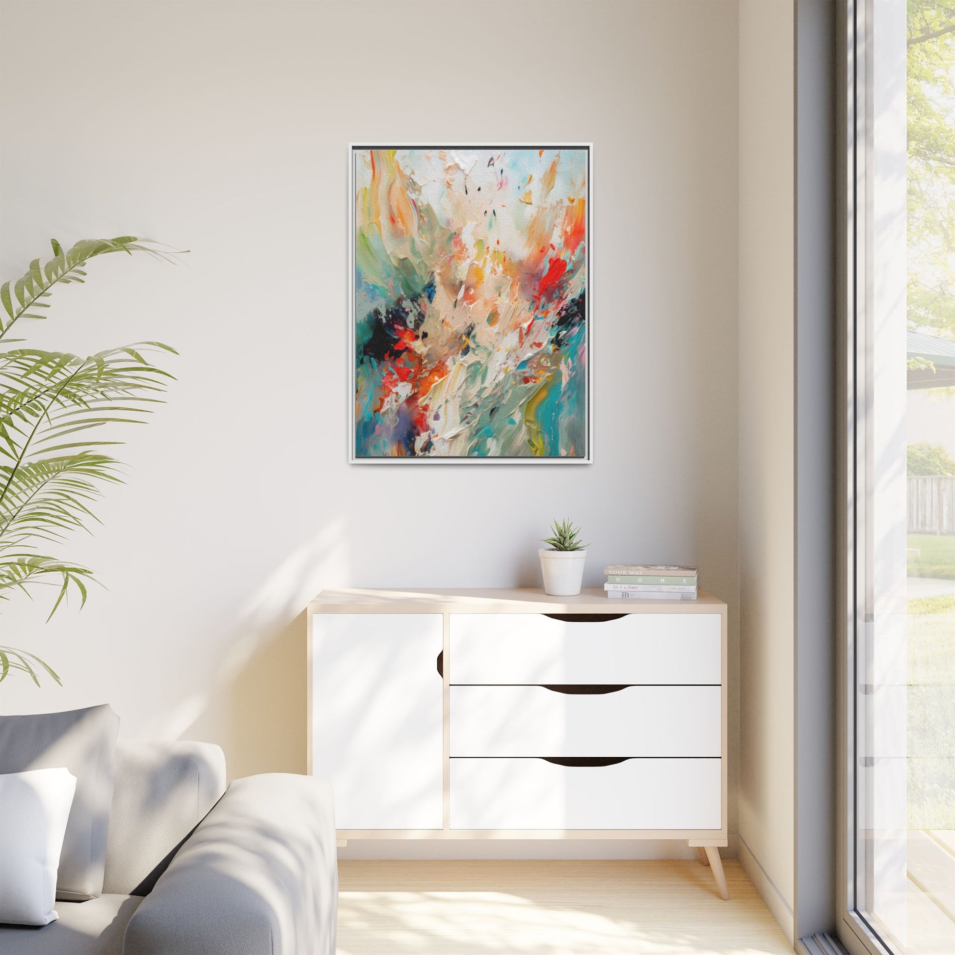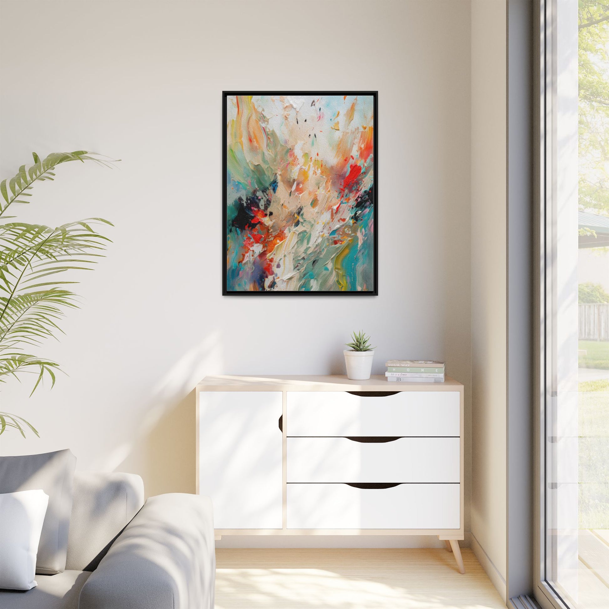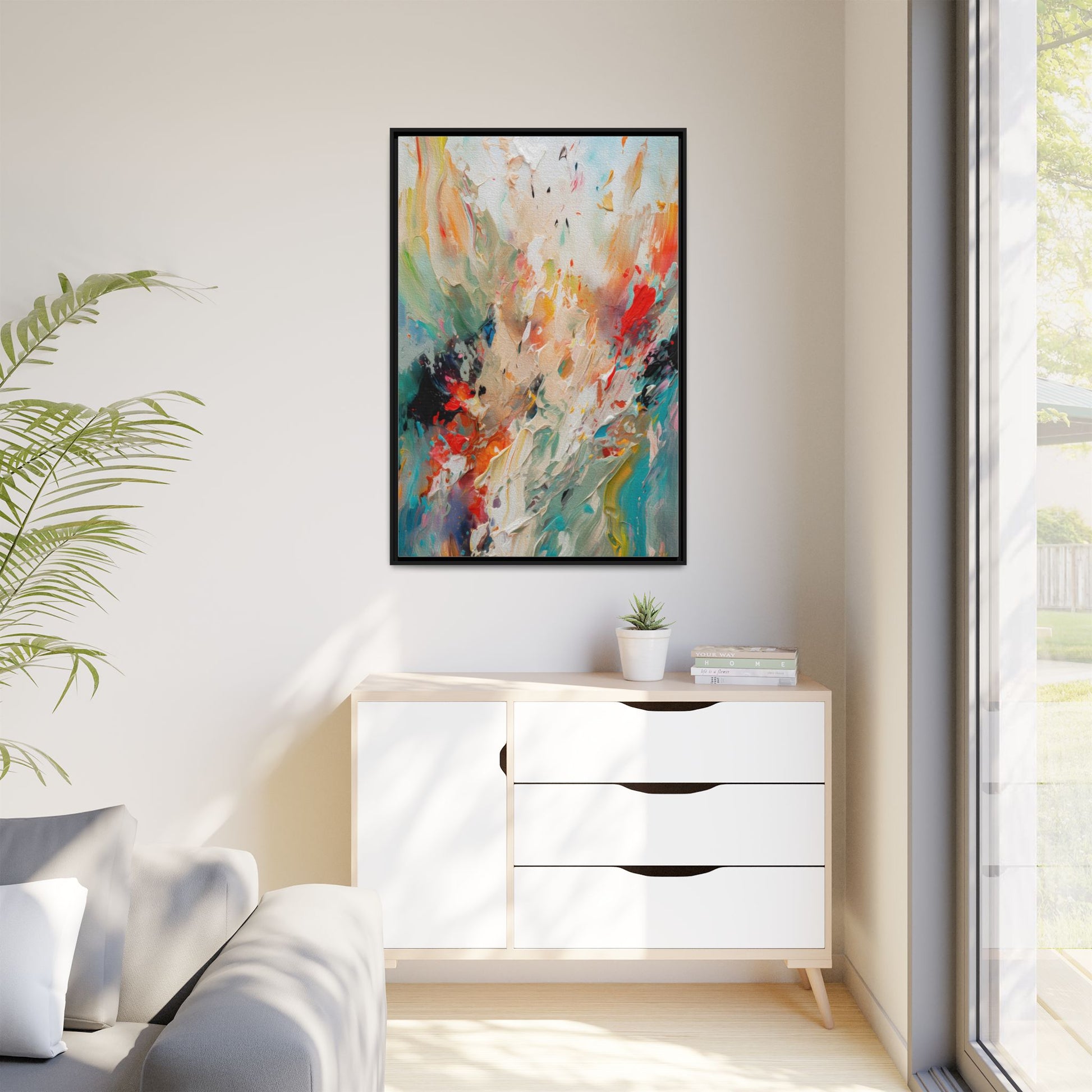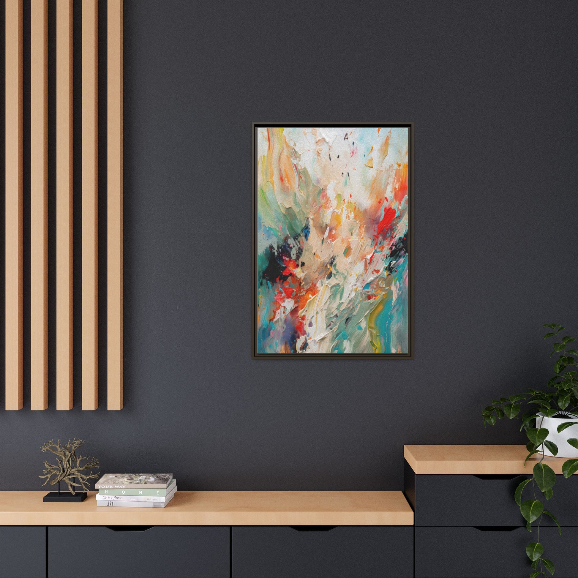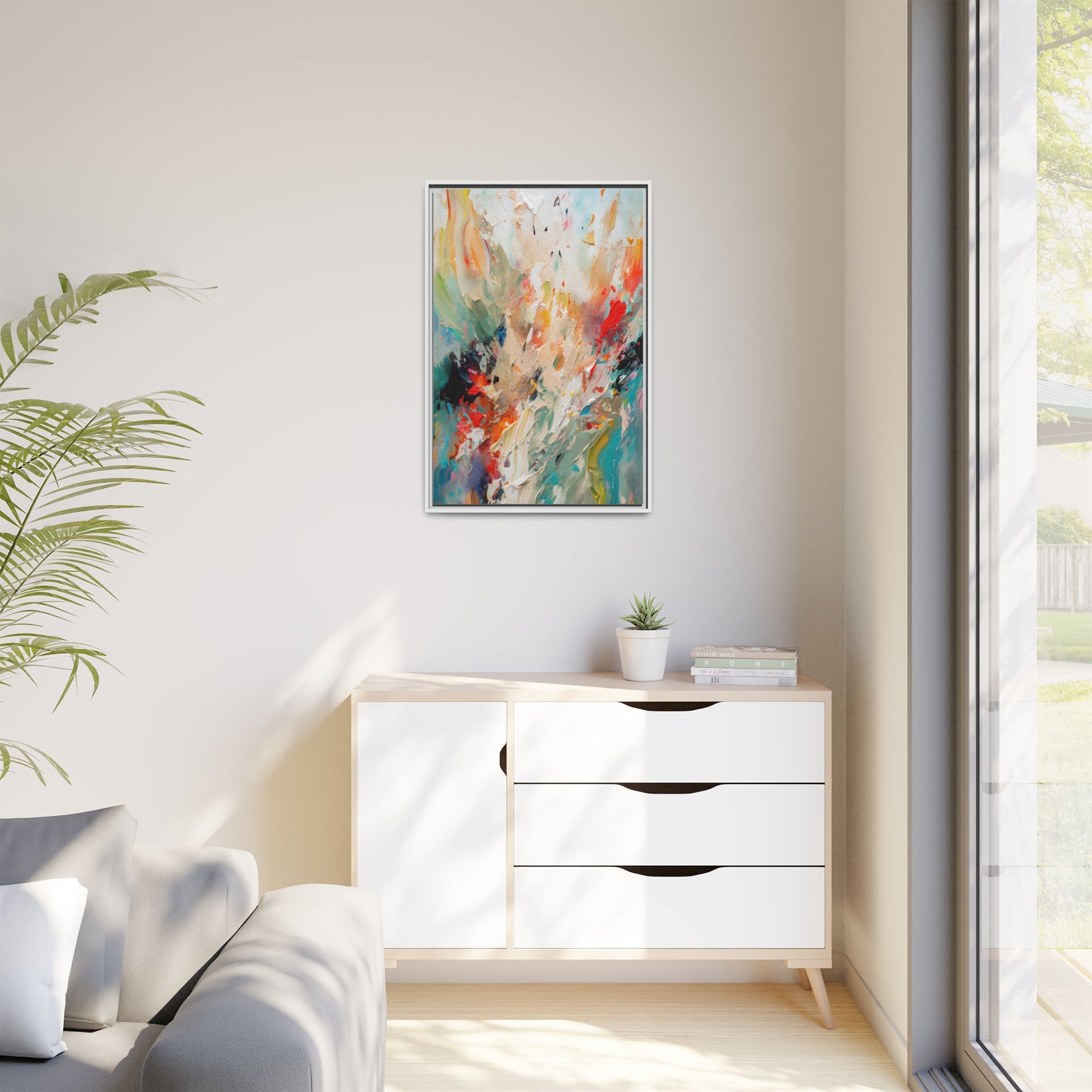 This vibrant abstract painting is a dynamic explosion of color and movement, featuring a sweeping composition of blended hues and textured brushstrokes. The artwork incorporates a rich palette of turquoise, red, orange, yellow, green, and white, creating a sense of energy and spontaneity. Layers of paint appear to be dynamically splashed and swirled across the canvas, giving the piece a sense of fluid motion and emotional intensity. Thick, impasto-like paint applications create depth and texture, with colors seemingly melting and interacting with each other in organic, unpredictable patterns. The painting evokes a sense of controlled chaos, with sharp and soft edges blending together to create a visually compelling and emotionally evocative abstract landscape.