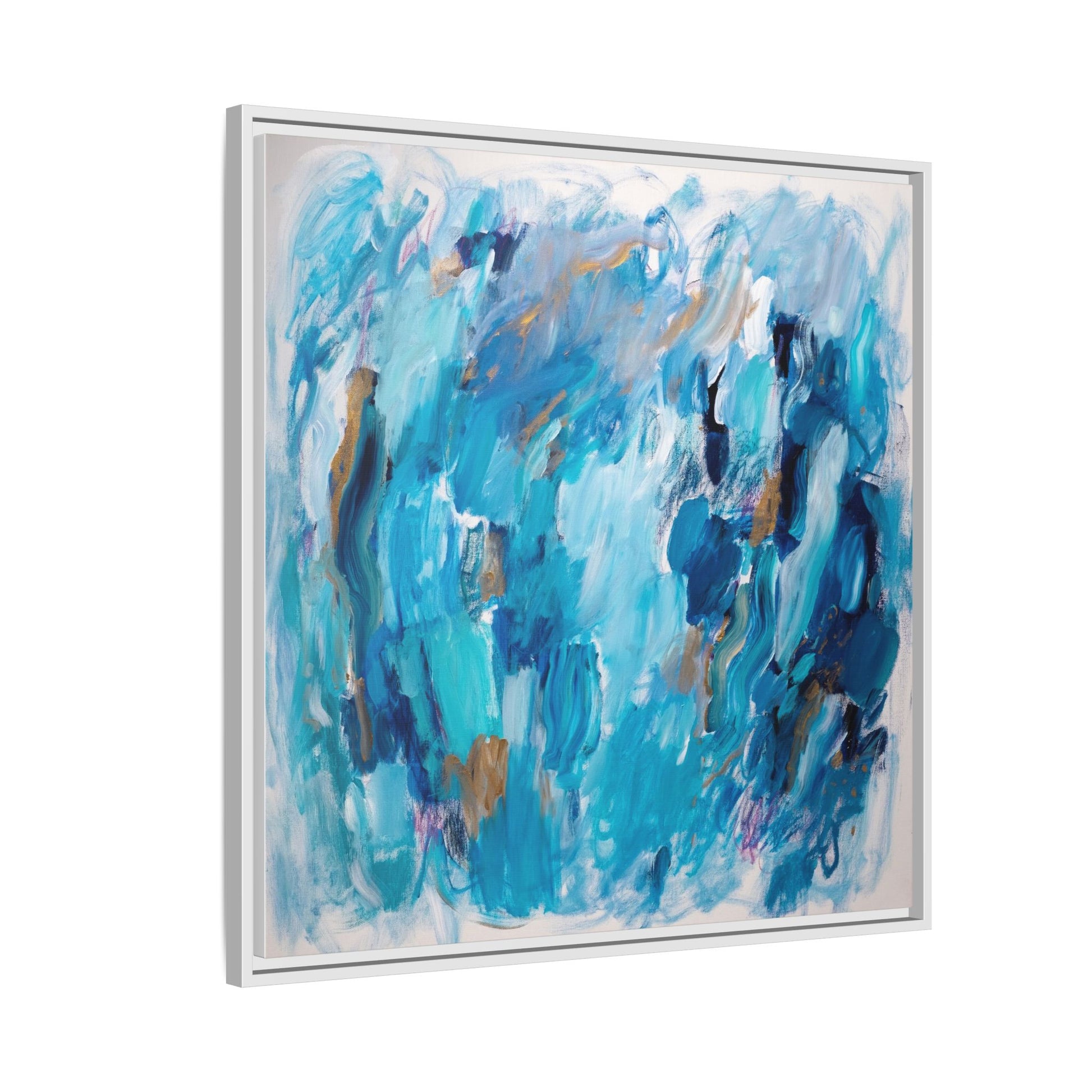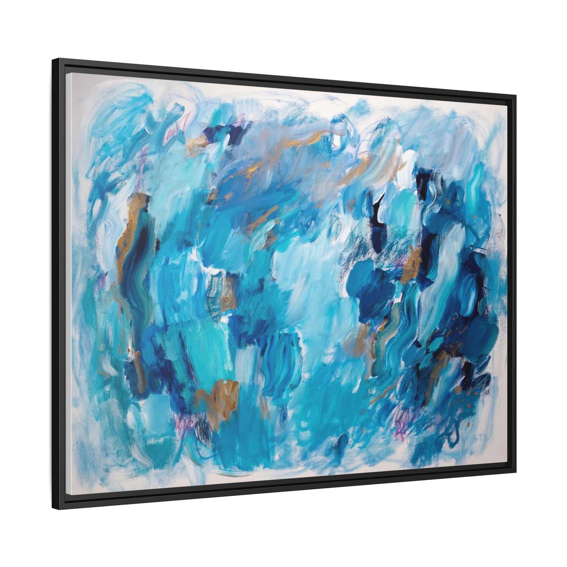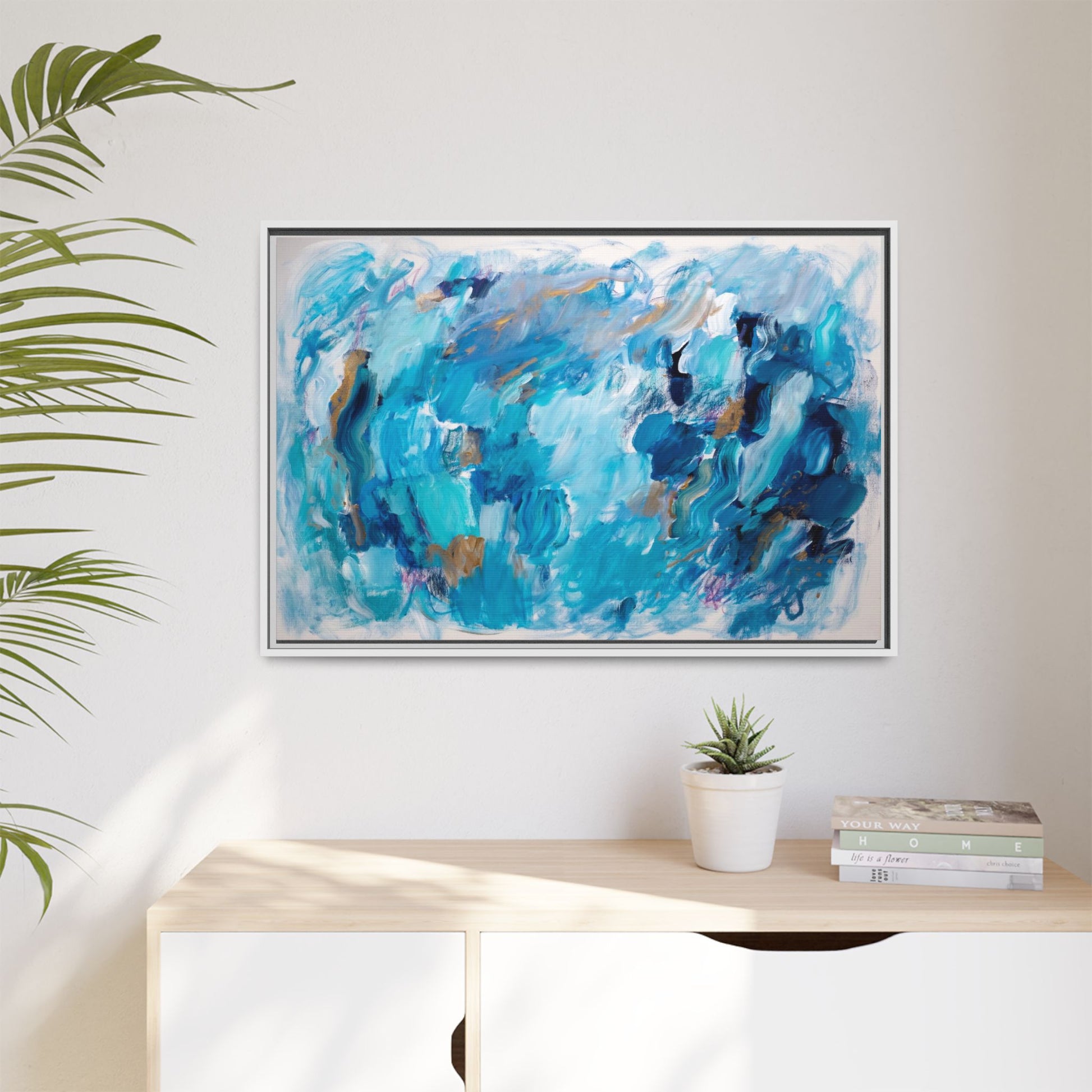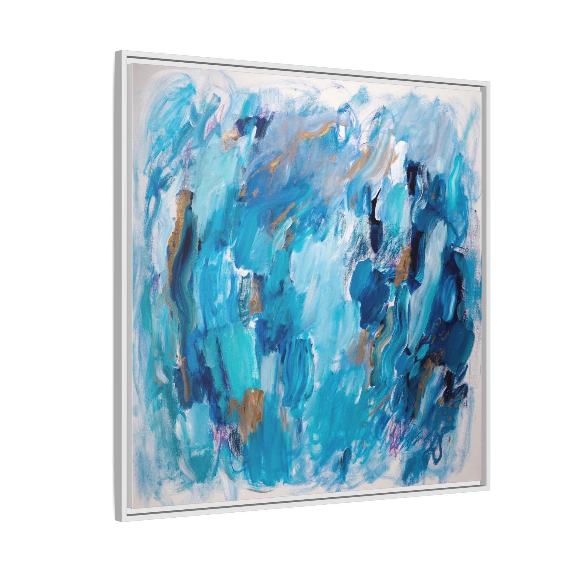 This vibrant abstract painting is a mesmerizing composition dominated by shades of blue, turquoise, and white. The artwork features fluid, dynamic brushstrokes that create a sense of movement and energy across the canvas. Splashes of golden and bronze tones peek through the predominantly cool-toned palette, adding depth and contrast to the piece. The painting's style appears to be gestural and spontaneous, with sweeping, organic shapes that seem to flow and blend into one another. The texture is rich and layered, with visible brush and palette knife marks that create a sense of dimensionality and emotional intensity.