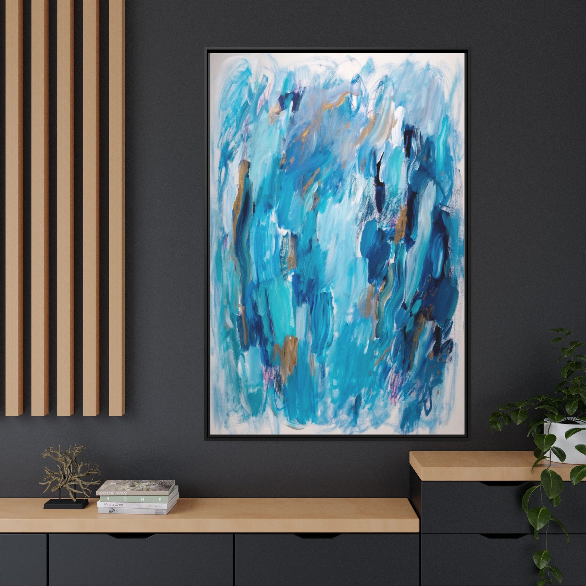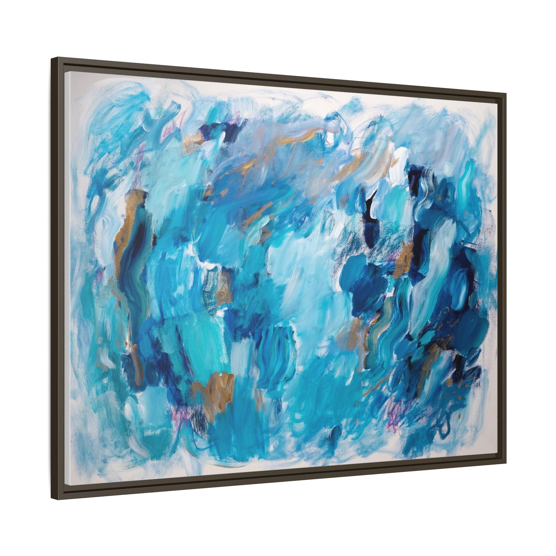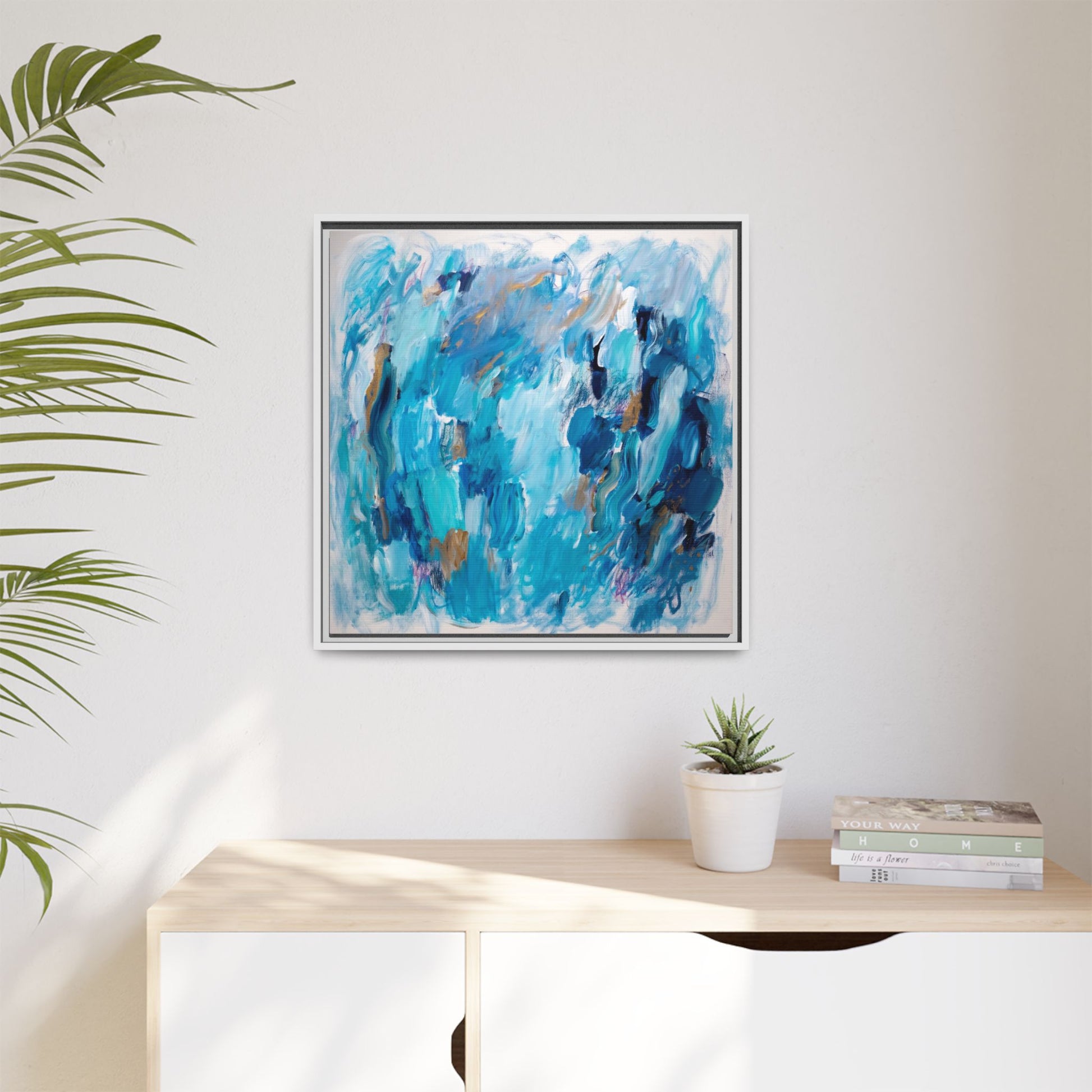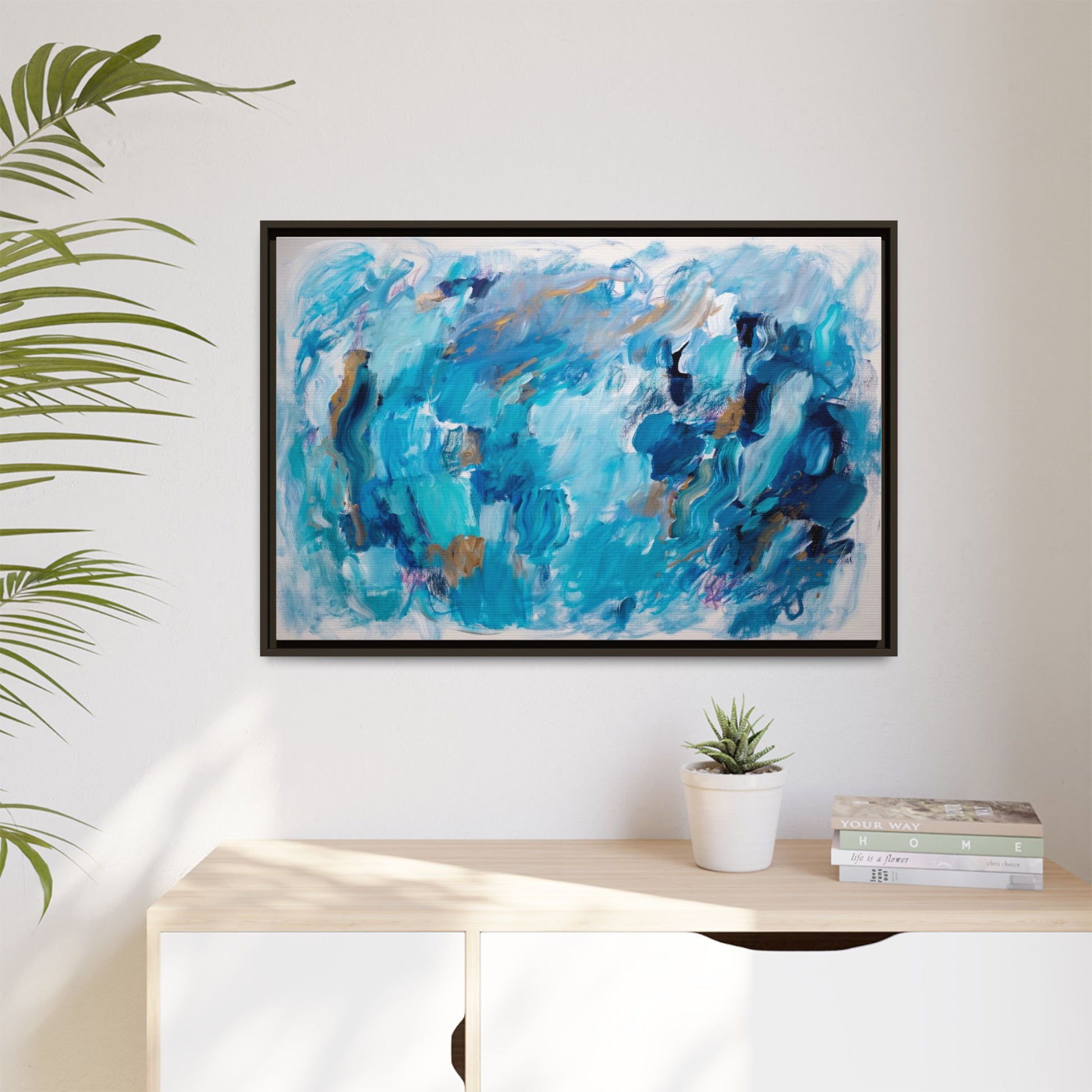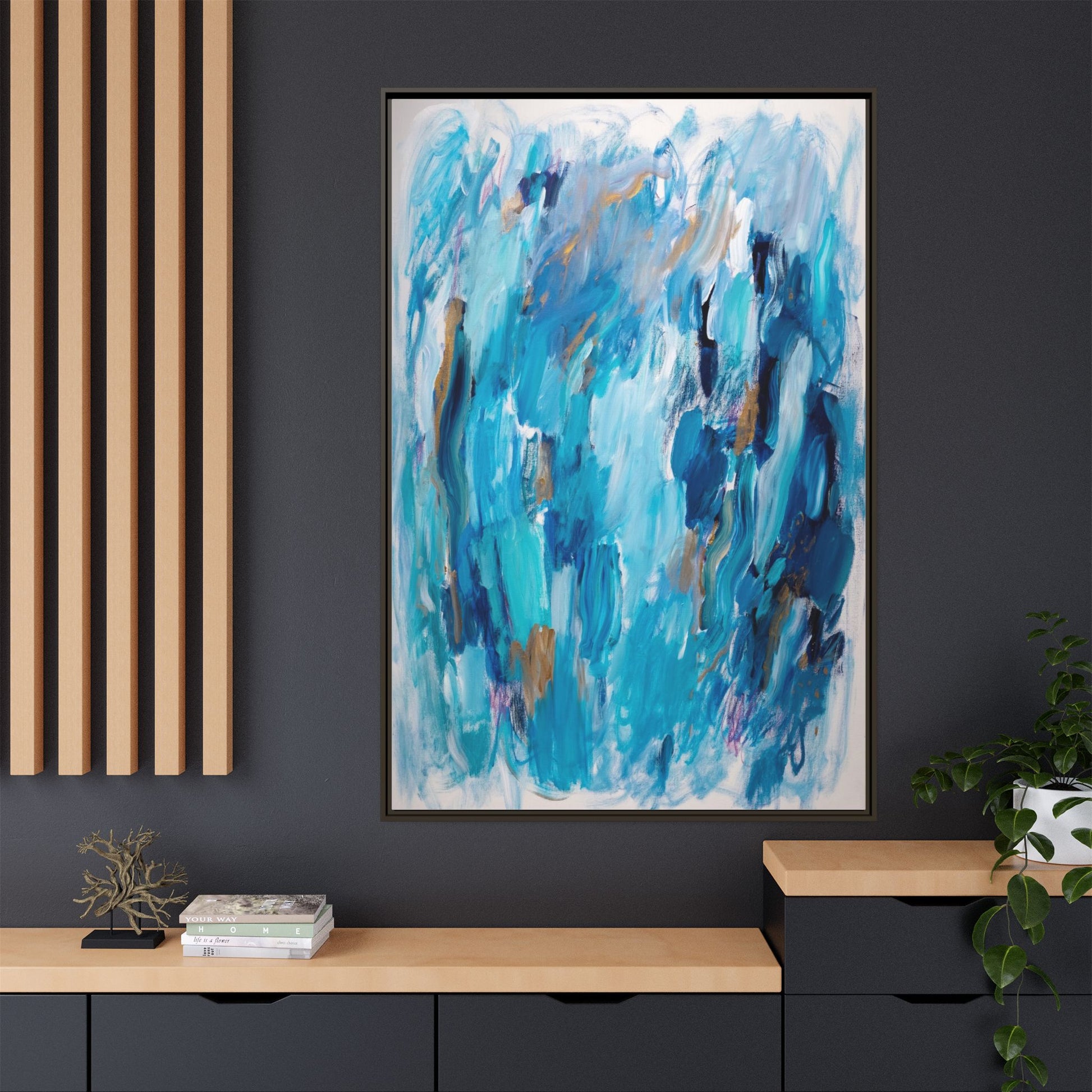 This vibrant abstract painting is a mesmerizing composition dominated by shades of blue, turquoise, and white. The artwork features fluid, dynamic brushstrokes that create a sense of movement and energy across the canvas. Splashes of golden and bronze tones peek through the predominantly cool-toned palette, adding depth and contrast to the piece. The painting's style appears to be gestural and spontaneous, with sweeping, organic shapes that seem to flow and blend into one another. The texture is rich and layered, with visible brush and palette knife marks that create a sense of dimensionality and emotional intensity.