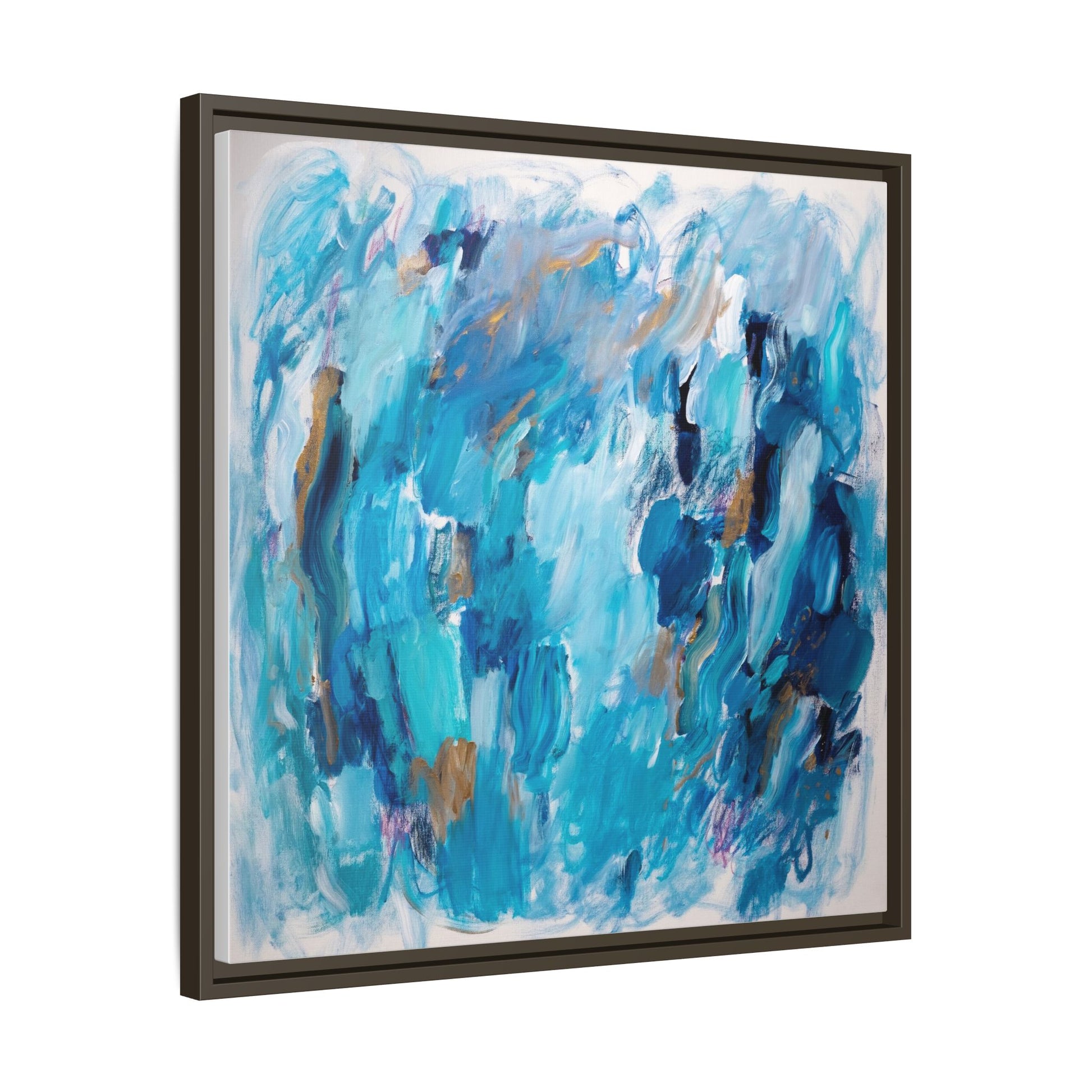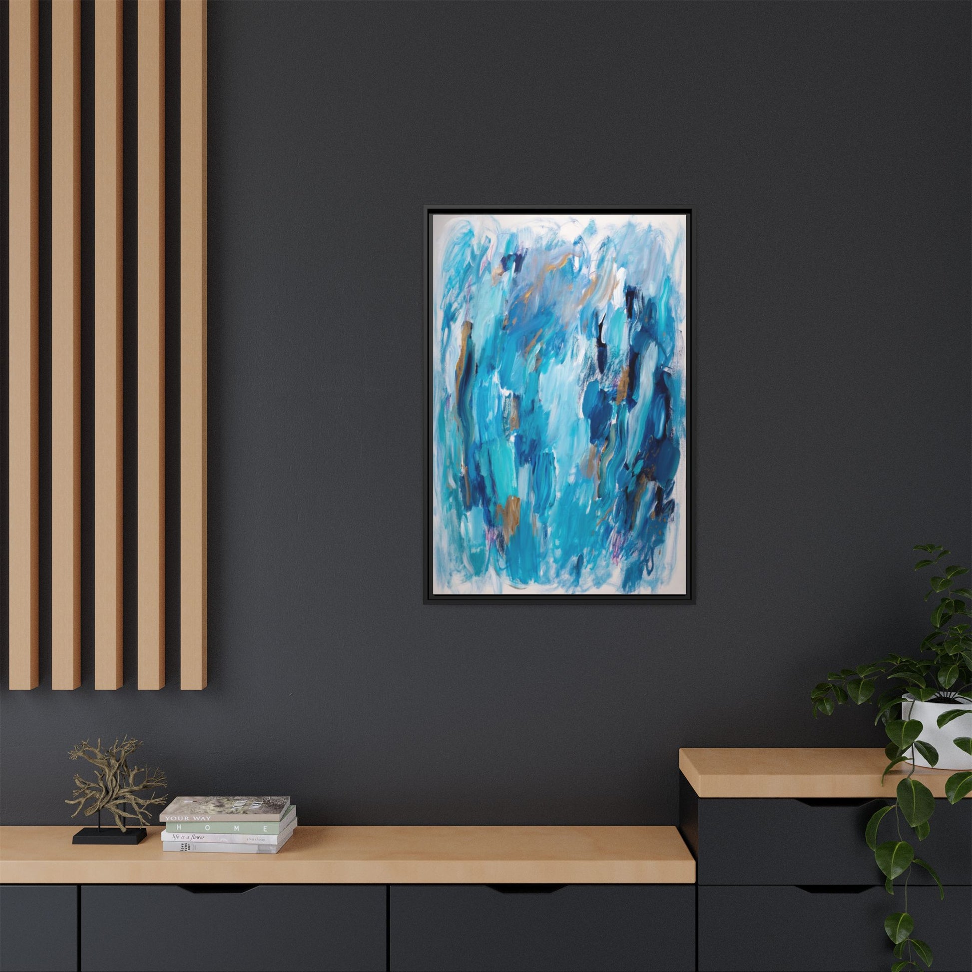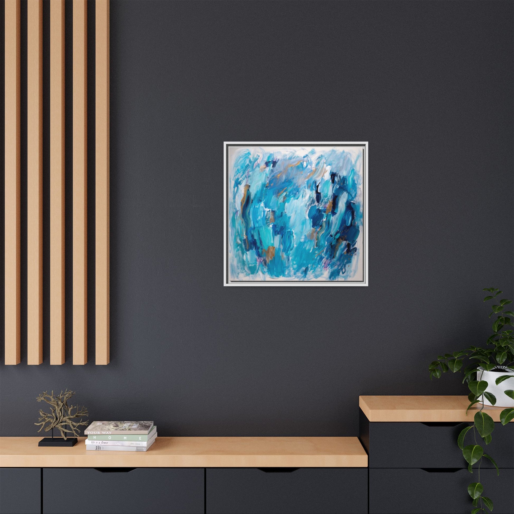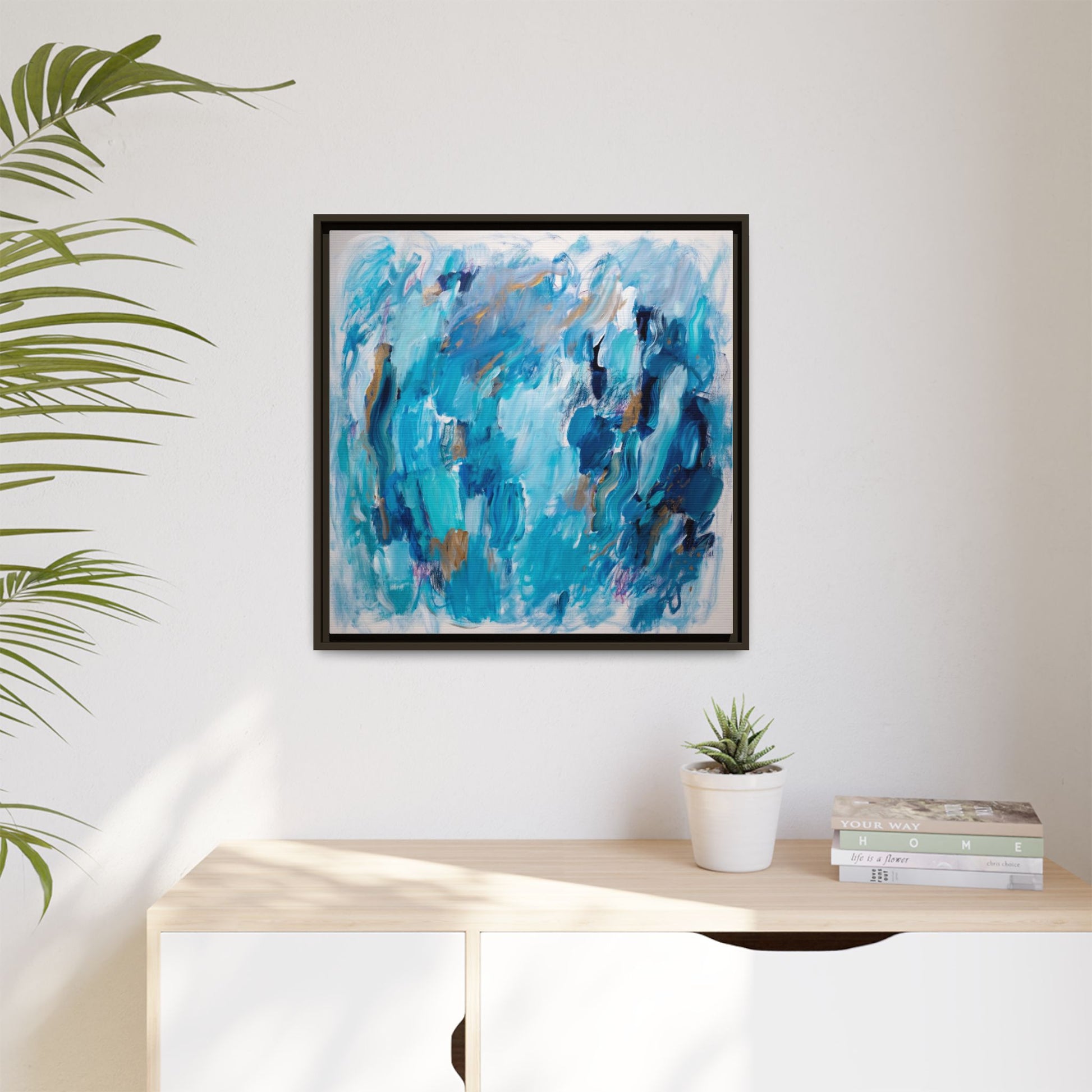 This vibrant abstract painting is a mesmerizing composition dominated by shades of blue, turquoise, and white. The artwork features fluid, dynamic brushstrokes that create a sense of movement and energy across the canvas. Splashes of golden and bronze tones peek through the predominantly cool-toned palette, adding depth and contrast to the piece. The painting's style appears to be gestural and spontaneous, with sweeping, organic shapes that seem to flow and blend into one another. The texture is rich and layered, with visible brush and palette knife marks that create a sense of dimensionality and emotional intensity.